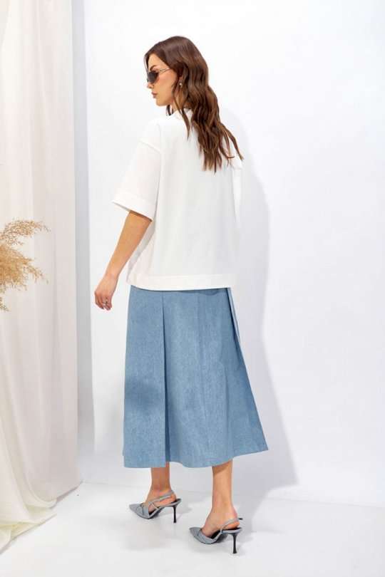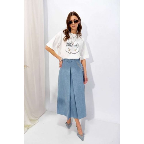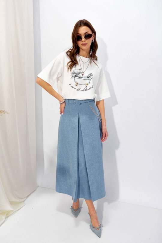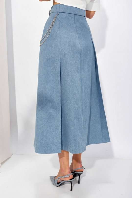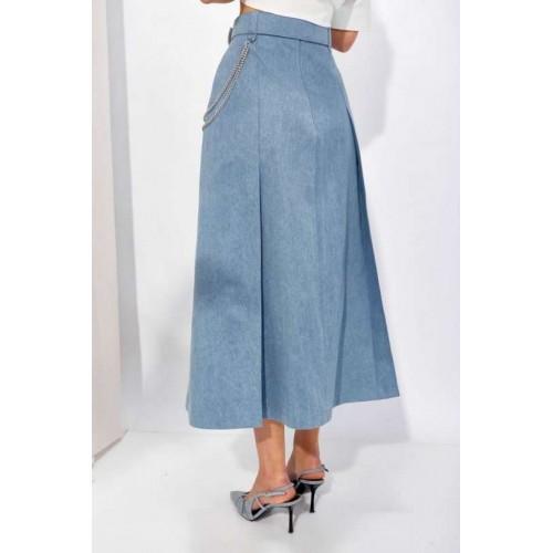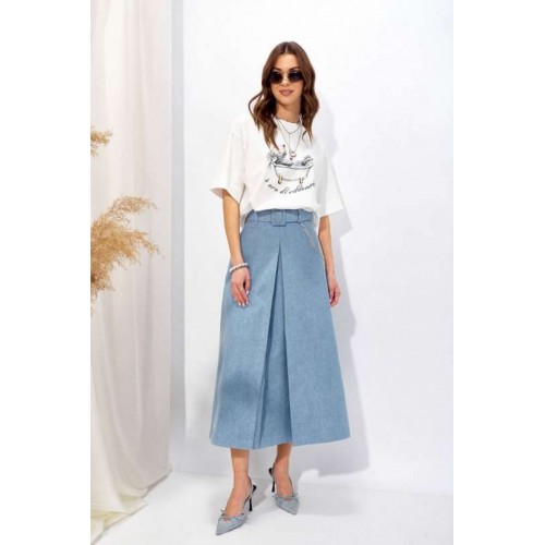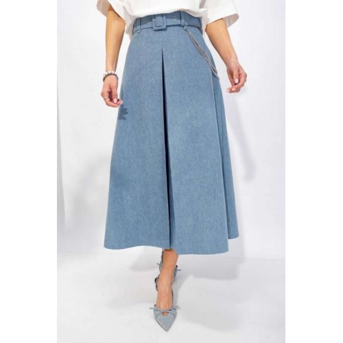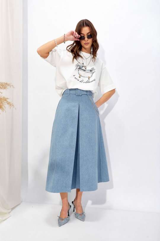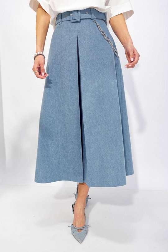 Юбка расширенная книзу из джинсовой ткани. По верху юбки притачной пояс со шлевками для ремня, на спинке застежка на потайную молнию. По переду и спинке складки. В боковых швах карманы. На спинке в среднем шве потайная молния. В комплект входит съемный ремень. Обращаем ваше внимание, что фурнитура может отличаться от фото. Длина юбки 85 см +4,5 см пояс.