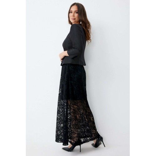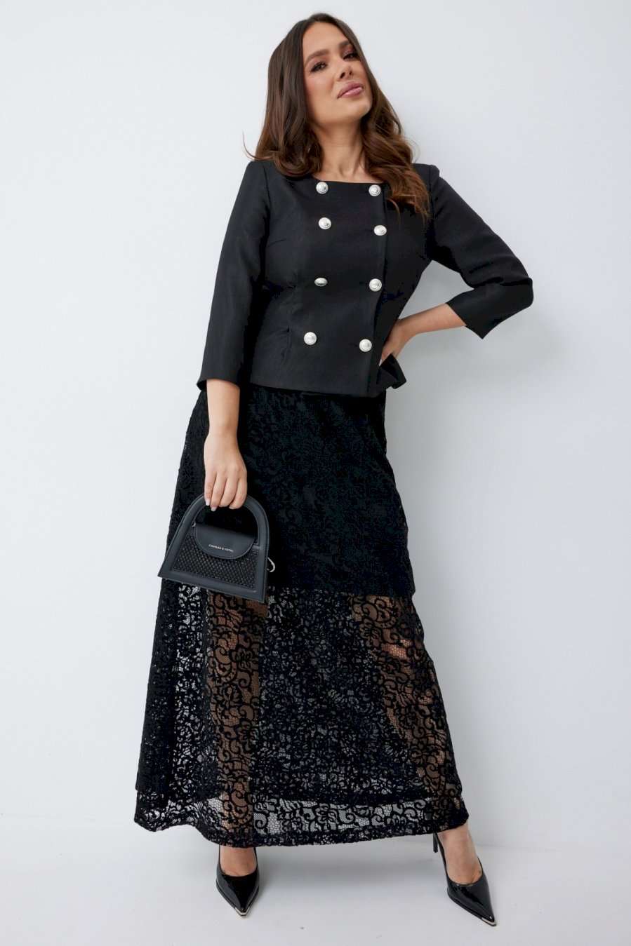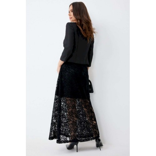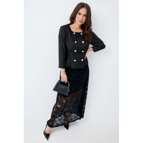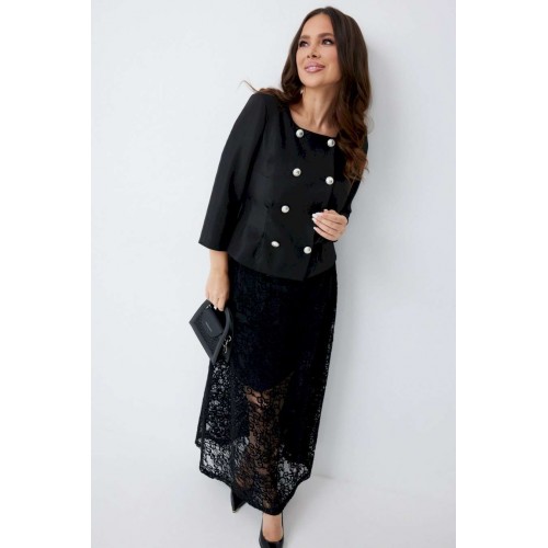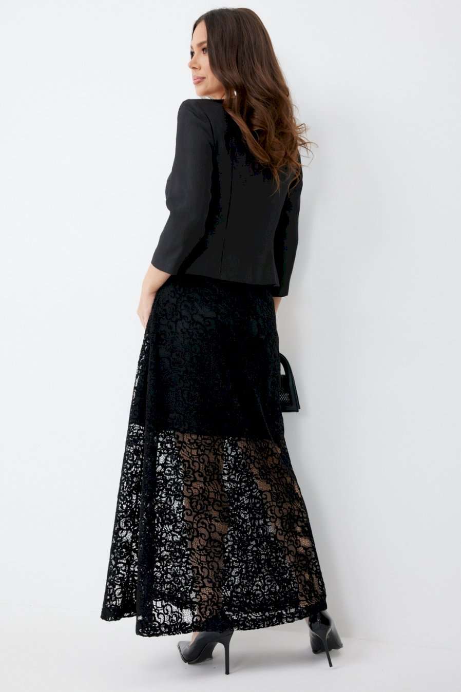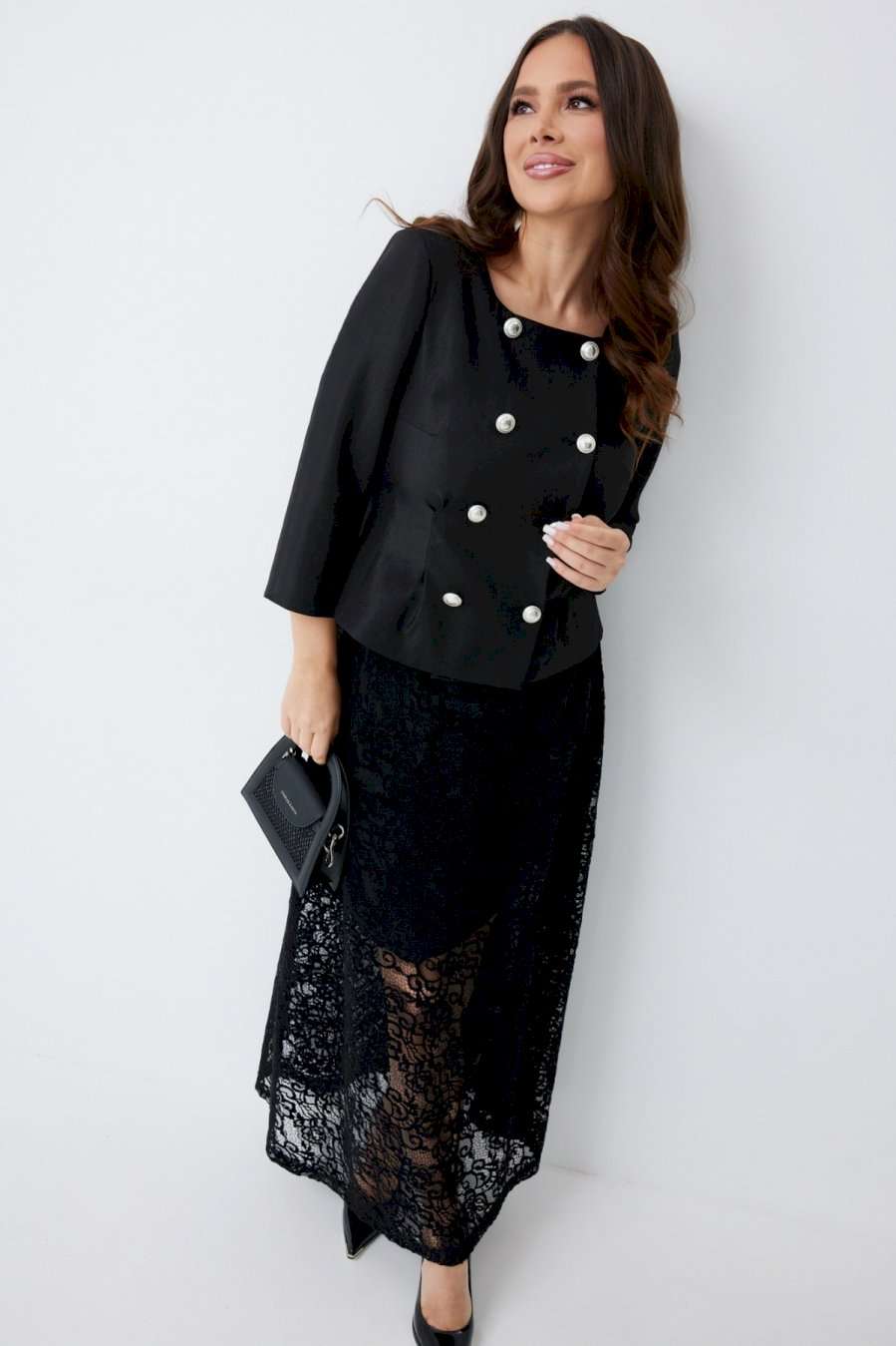 Нарядный комплект из жакета и кружевной юбки. Двубортный жакет полуприлегающего силуэта, на подкладке. Рукав длинный, втачной. Центральная застежка на красивые пришивные пуговицы. Юбка А-образного силуэта. Выполнена из красивого бархатного кружева на комфортной к телу подкладке. Юбка с притачным поясом, дополненным эластичной тесьмой. Застежка на потайную молнию и пуговицу. Длина жакета от плечевого шва 53см. Длина рукава 54см. Длина юбки 94см.