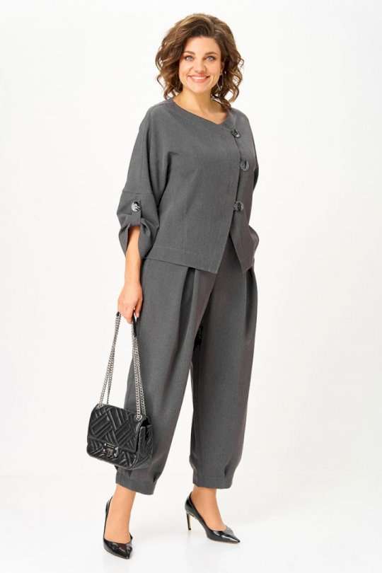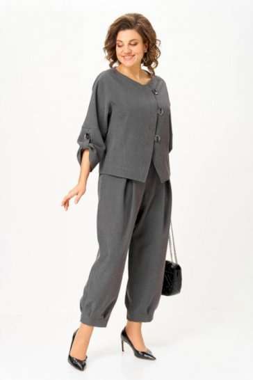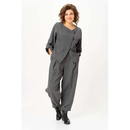 Стильный костюм «Современная классика» Универсальный костюм, который выглядит дорого и современно, но при этом дарит комфорт и лёгкость. Его можно носить как комплект или по отдельности: жакет с асимметричной застёжкой и акцентными пуговицами легко сочетается с джинсами, а брюки свободного кроя идеально смотрятся с блузой или футболкой. Преимущества костюма * Жакет с модной асимметрией и декоративными пуговицами. * Брюки с комфортной посадкой и застроченными стрелками вытягивают силуэт. * Синтетическая ткань легко в уходе: не садится, не линяет, быстро гладится и сохраняет форму. * Универсальный оттенок, который подходит к любому гардеробу. Почему стоит взять: * Готовый образ «с утра и до вечера». * Совмещает деловой, casual и вечерний стили. * Экономит время и силы, а выглядит изысканно и дорого. Длина жакета по спинке 56 см+\\- 1 см, длина рукава 50 см +/- 1 см; длина брюк по боковому шву 98 см +\\- 1 см, по шаговому шву 66 см +\\- 1 см. Изделие подойдет на рост 170 см.