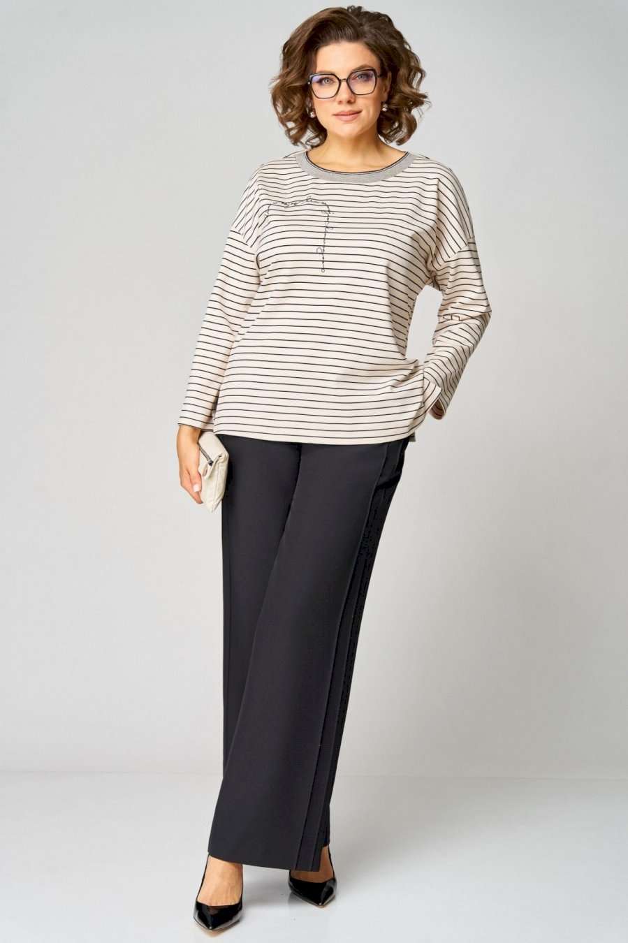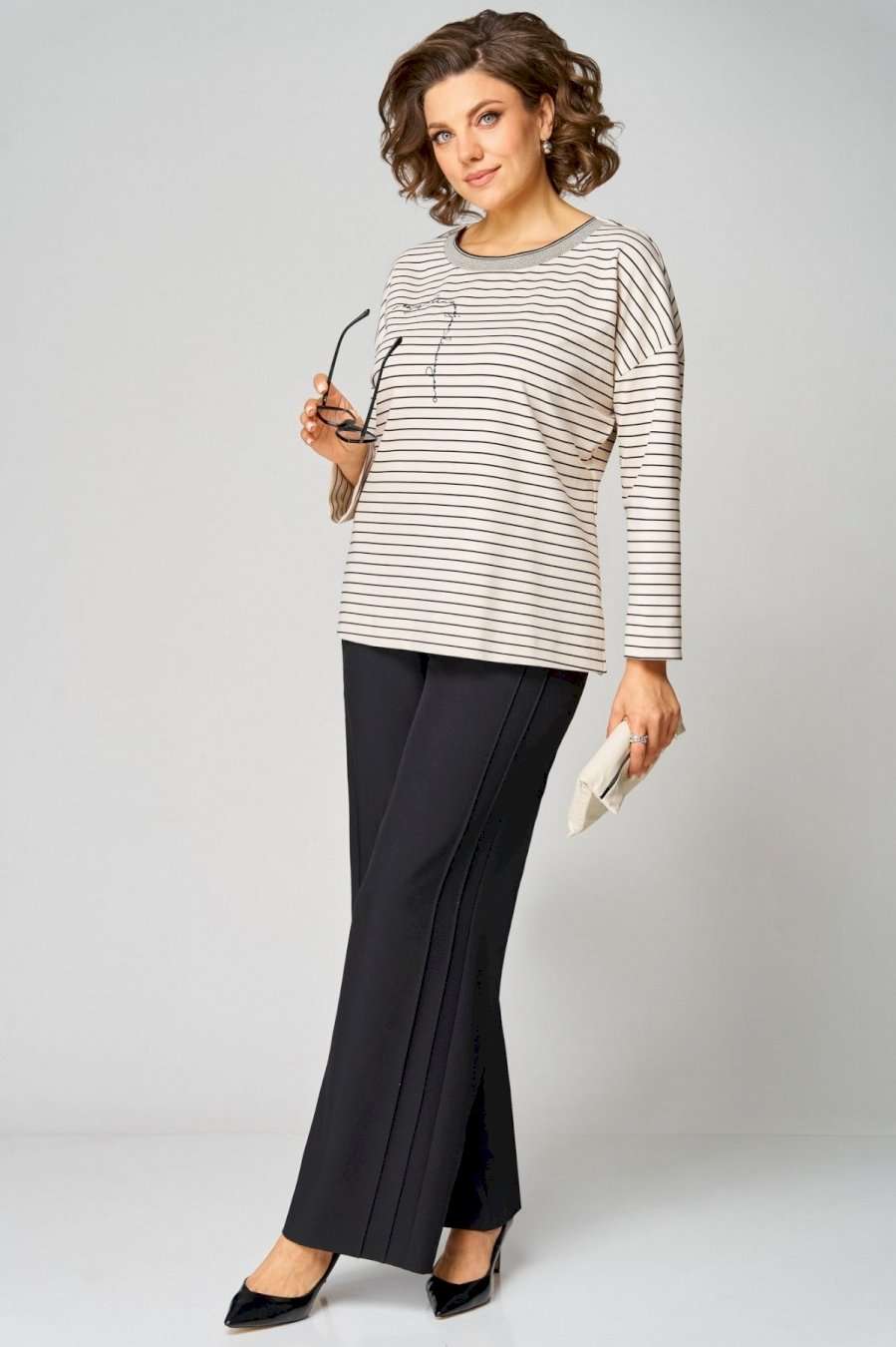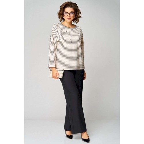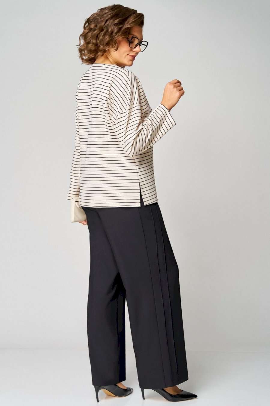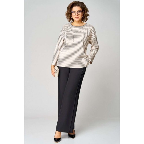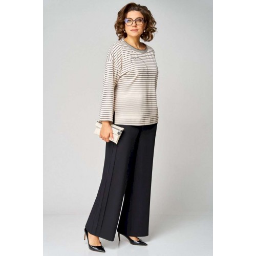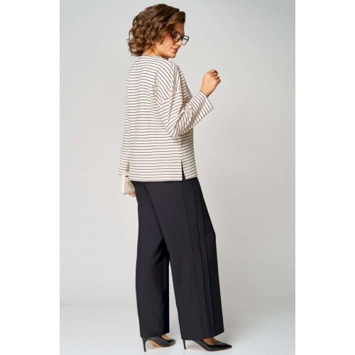 Комплект женский , двух предметный состоящий из туники и брюки. Туника прямого силуэта выполнена из трикотажного полотна « в полоску» . Горловина переда обработана довязом , горловина спинки обтачкой. Линия плеча спущена . По переду с правой стороны авторская печать. Рукав втачной, одношовный. Длина изделия по спинке- 65см, длина рукава от горловины – 66 см. По бокам имеются разрезы. Брюки палаццо прямого силуэта на притачном поясе, с застежкой на тесьму- молнию и 1 пуговицу и петлю, с боковыми наклонными карманами на передних половинках брюк . По передним половинкам брюк прострочены 2 канта. Для лучшего прилегания брюк в области талии в поясе со стороны спинки вставлена резинка. Длина брюк по боковому шву без пояса- 104 см.