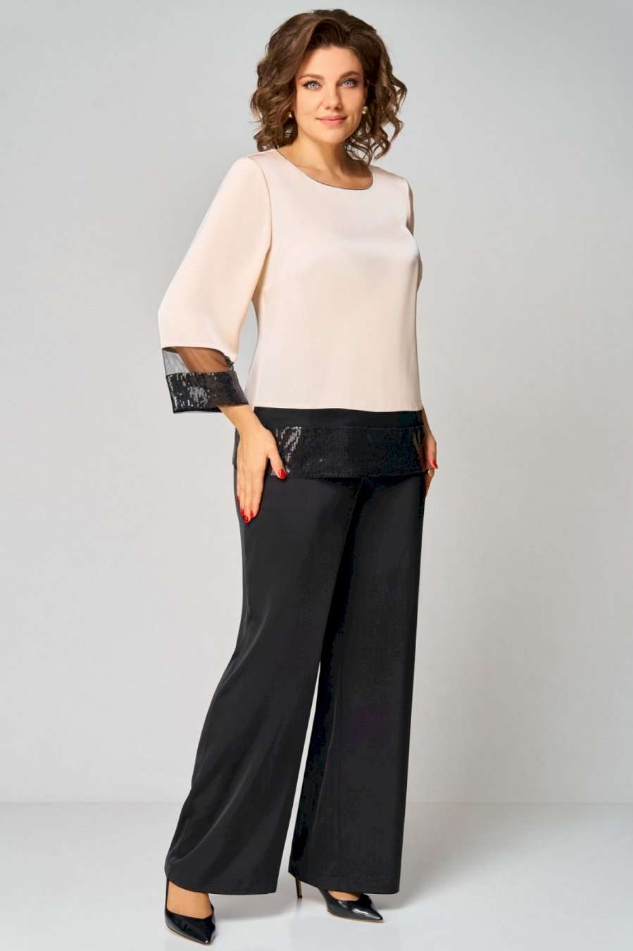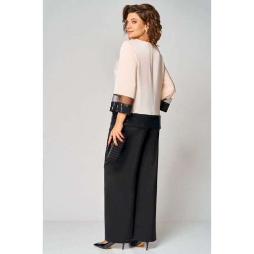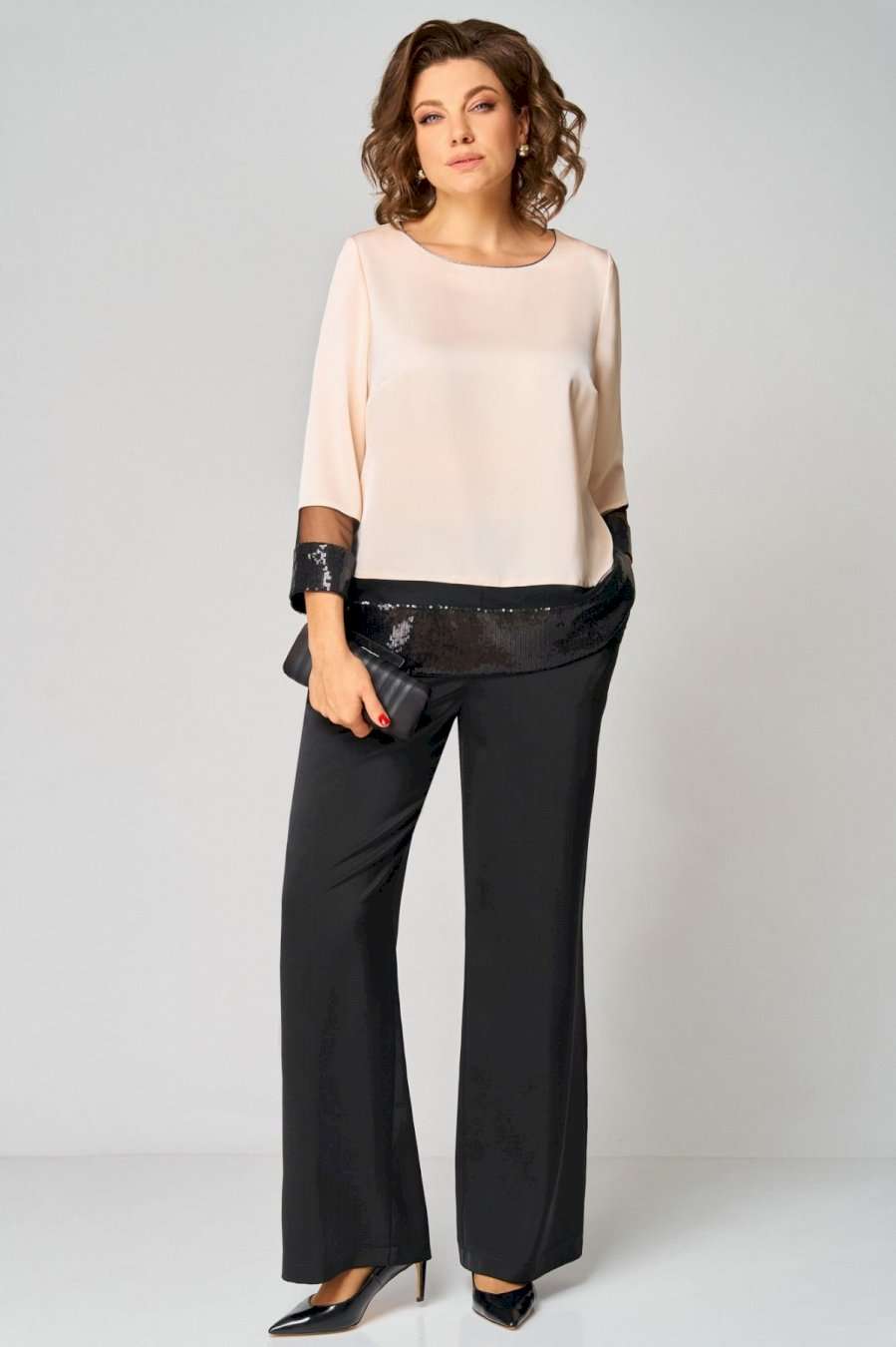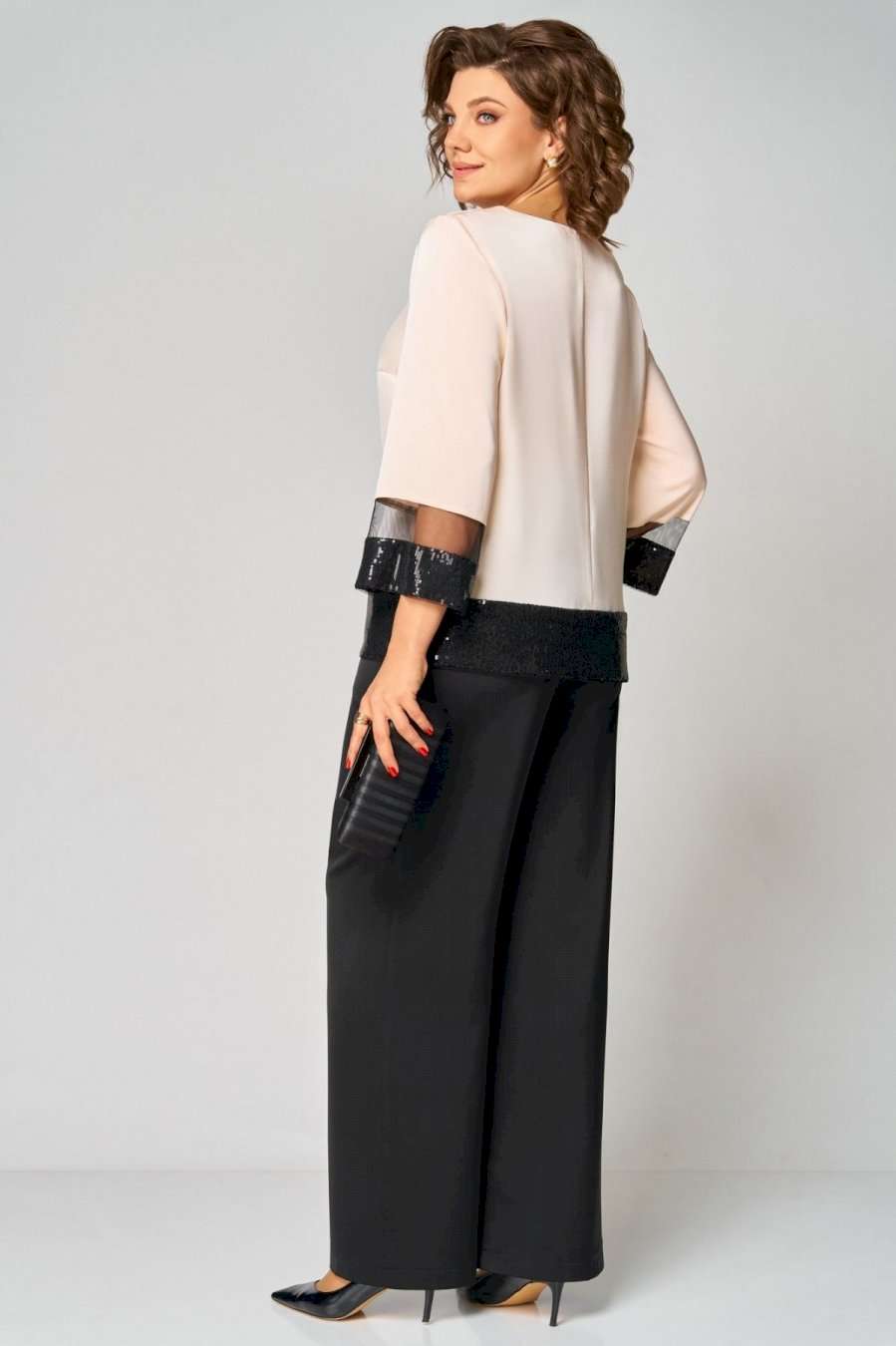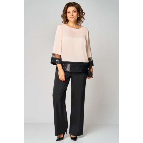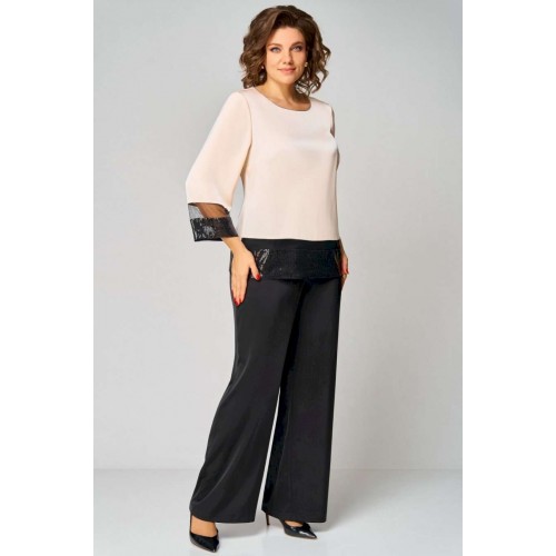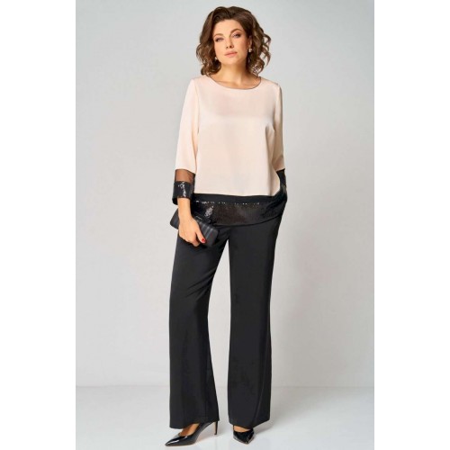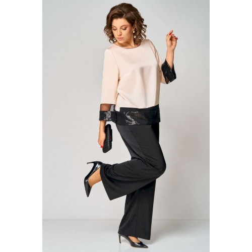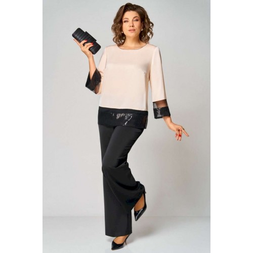Комплект женский , двухпредметный состоящий из: туники и брюки. Туника прямого силуэта по переду прострочены нагрудные вытачки. Округлый вырез горловины , по горловине прострочен декоративный кант. Спинка со средним швом. Рукав втачной, двухшовный. Длина рукава – 20см, длина по спинке -62см.Низ рукава и туники выполнен из сетки и пайеток. Брюки прямые. Длина брюк по внутреннему шву - 77см. Брюки на поясе, по бокам резинка и косые карманы. Застёжка на тесьму-молнию и 1 пуговицу.