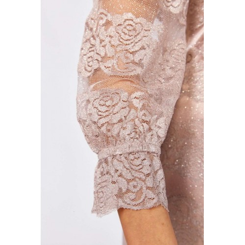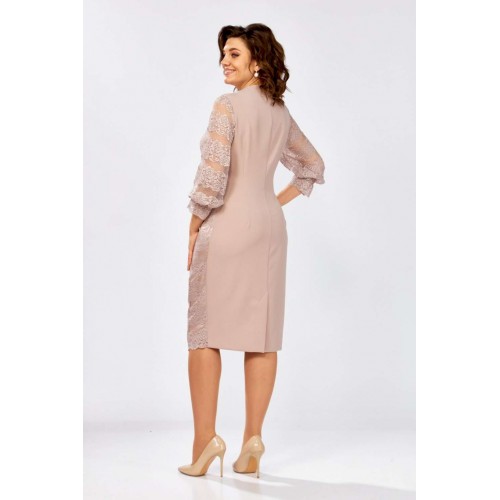 Нарядное женское платье полу-прилегающего силуэта, выполнено из гипюра с глитером и текстиля. Лиф платья отрезной по линии талии, с вытачками, на лифе обработана застежка на петли-пуговицы. Юбка платья прямого покроя, выполнена из гипюра с глитером. Спинка выполнена из однотона (текстиля), со средним швом и вытачками, в среднем шве по низу шлица. Рукав выполнен из гипюра с глитером, расклешенный к низу и присборен на манжет из гипюра. Элегантное платье отличный выбор для вашего образа на любое мероприятие!