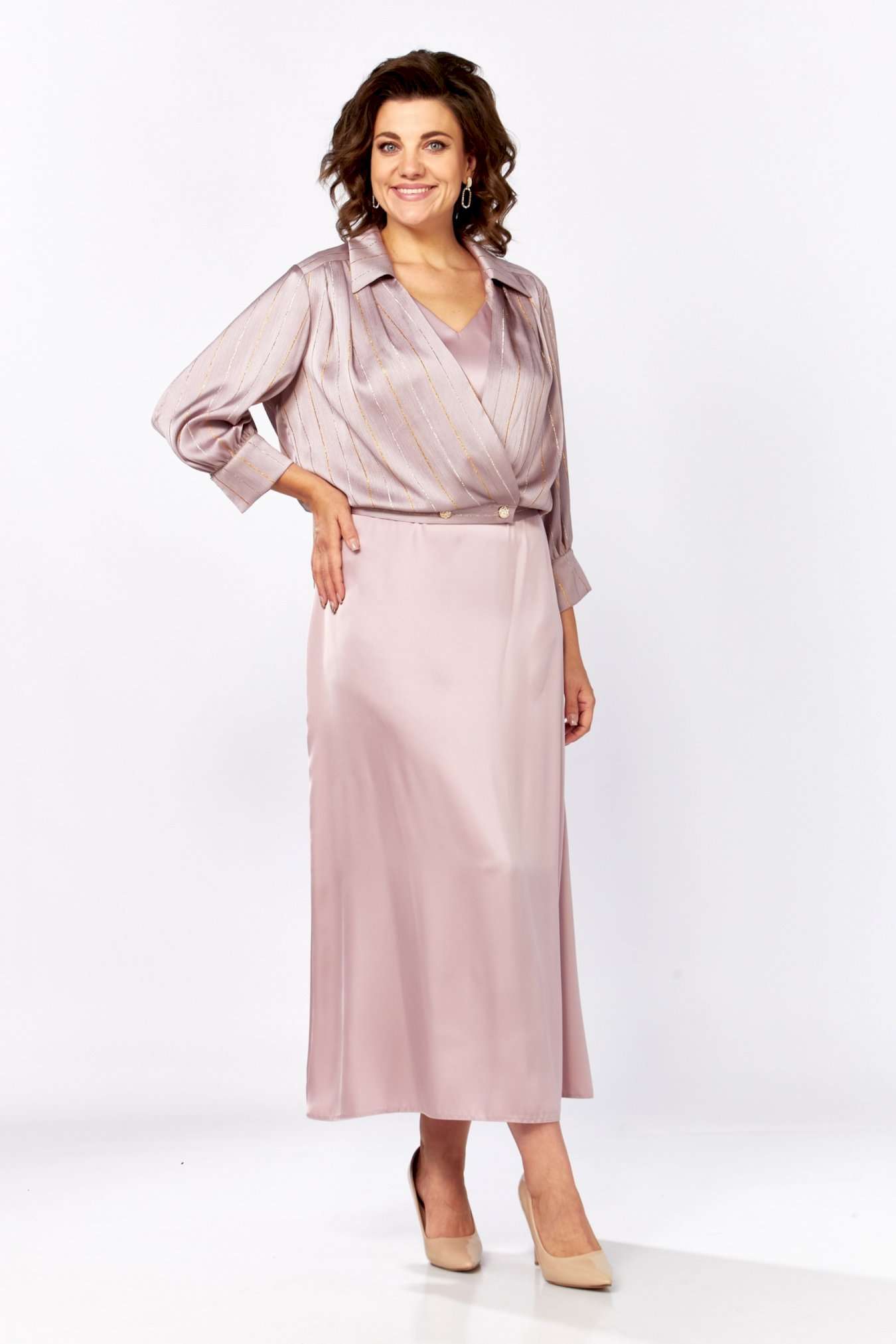 Женский комплект, состоит из платья и блузы, выполнен из однотонного атласа и атласа в полоску. Платье с V-образной горловиной, на обтачке, по переду обработаны нагрудные вытачки. Спинка со средним швом и вытачками, рукав цельнокроеный, немного спущенный по линии плеча. Блуза свободного покроя, из атласа в полоску, по линии талии с притачным поясом из атласа в полоску. По спинке в пояс вставлена резинка для удобства регулировки на любой тип фигуры, горловина на обтачке, обработана воротником. Лиф платья с кокеткой по линии плеча, от линии кокетки заложены складки, по низу лиф присборен на пос. Спинка также свободного покроя, присборена по низу на пояс. Рукав втачной, длиной 3/4, по низу присборен на широкий манжет, на манжете застежка на петлю-пуговицу. Эффектный и стильный комплект выполненный в трендовых расцветках сделает ваш образ элегантным на любом мероприятии! Длина платья от плеча 128 см, длина блузки 51 см. Платье в 52р. Ширина груди- 106см, Ширина талии -102см, Ширина бедер- 120см. Блузка: Ширина груди- 118см, Ширина талии 102см по поясу, длина рукава - 48см., ширина рукава 44см.