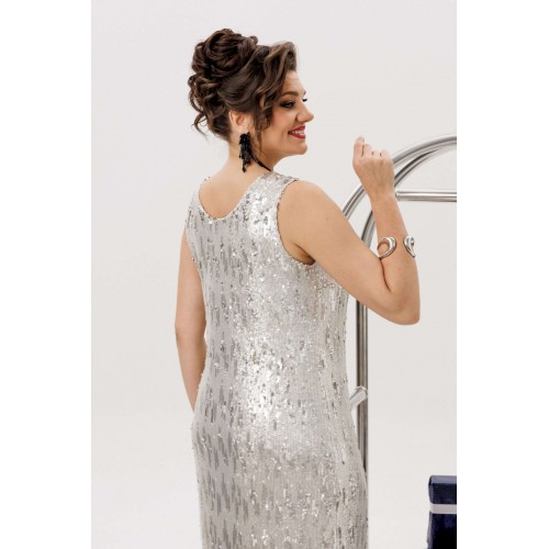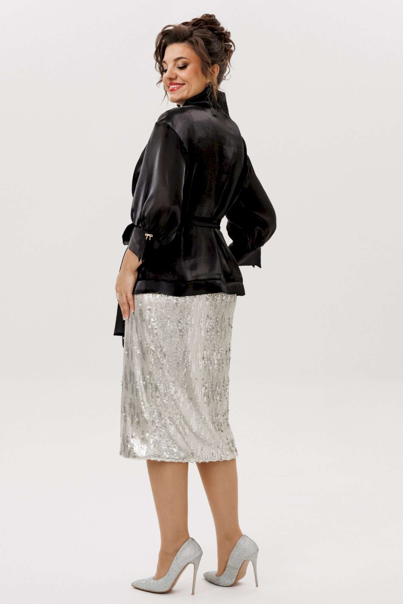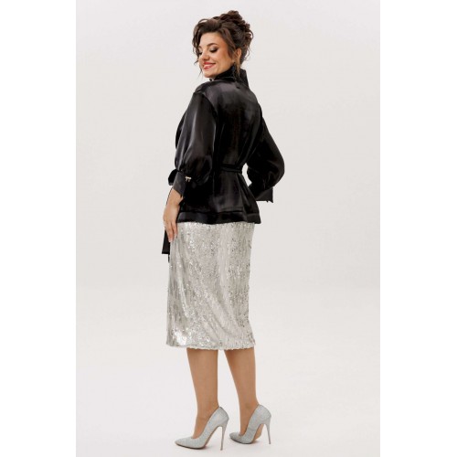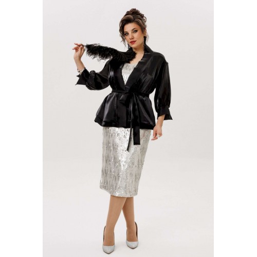 Элегантный комплект, состоит из платья и блузки. Платье выполнено из трикотажного полотна расшитого пайетками, на трикотажной подкладке. Горловина округлой формы, обтачена подкладкой, пройма также обтачена подкладкой, на полочке выполнены нагрудные вытачки. Спинка идентична полочке, выполнена из трикотажного полотна расшитого пайетками. Блуза из органзы, горловина обработана притачной планкой, низ обработан широкой подгибкой. Рукав на спущенной пройме, объемного покроя, по низу присборен на манжет с разрезами, декорированными пуговицами. Спинка блузы прямого покроя, из органзы, к лузе прилагается съемный пояс из органзы. Эффектный комплект для любительниц ярких образов! В 52р Блузка: Ширина груди- 62см, Ширина талии -63см, Ширина бедер- 66см, длина рукава 43см, ширина рукава 25см Платье: Ширина груди- 52см, Ширина талии -49см, Ширина бедер- 56см. Длина блузки 61см, Длина платья 116см