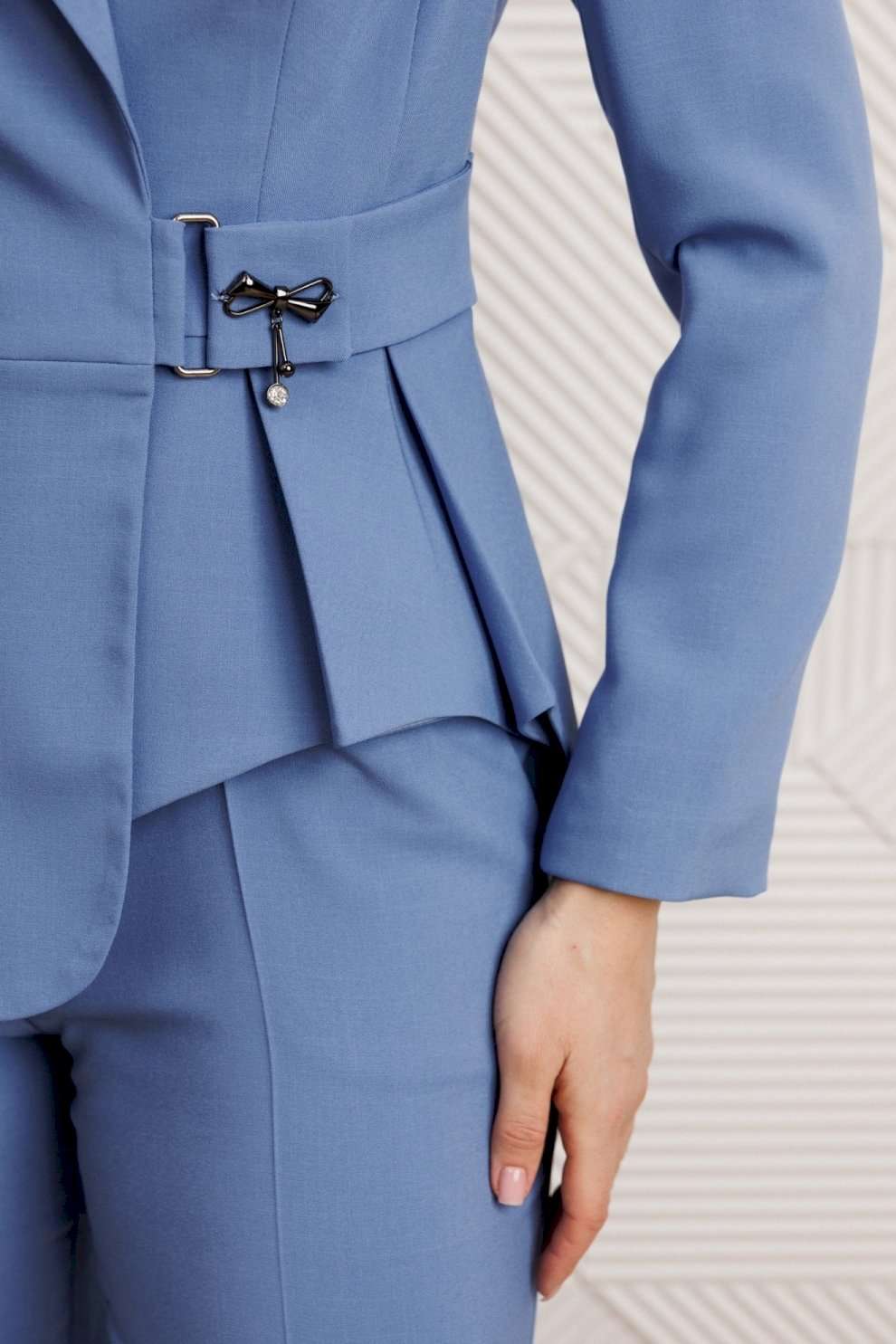 Костюм брючный 25-2926 голубой Мода-Юрс — это стильный и современный выбор для уверенной женщины. Коллекция бренда Мода-Юрс предлагает двухпредметный комплект, состоящий из жакета и брюк, выполненный из полиэстера, вискозы и спандекса. Жакет полуприлегающего силуэта с ассиметричной полочкой и карманом в рамку подчёркнут воротником пиджачной формы. Брюки прямого кроя с манжетами и притачным поясом-кокеткой обеспечивают комфорт и свободу движений. Застёжка на тесьму-молнию в среднем шве добавляет удобства. Костюм выполнен в голубом цвете, подходящем для офисного и делового стиля, идеален для весеннего и осеннего сезонов.