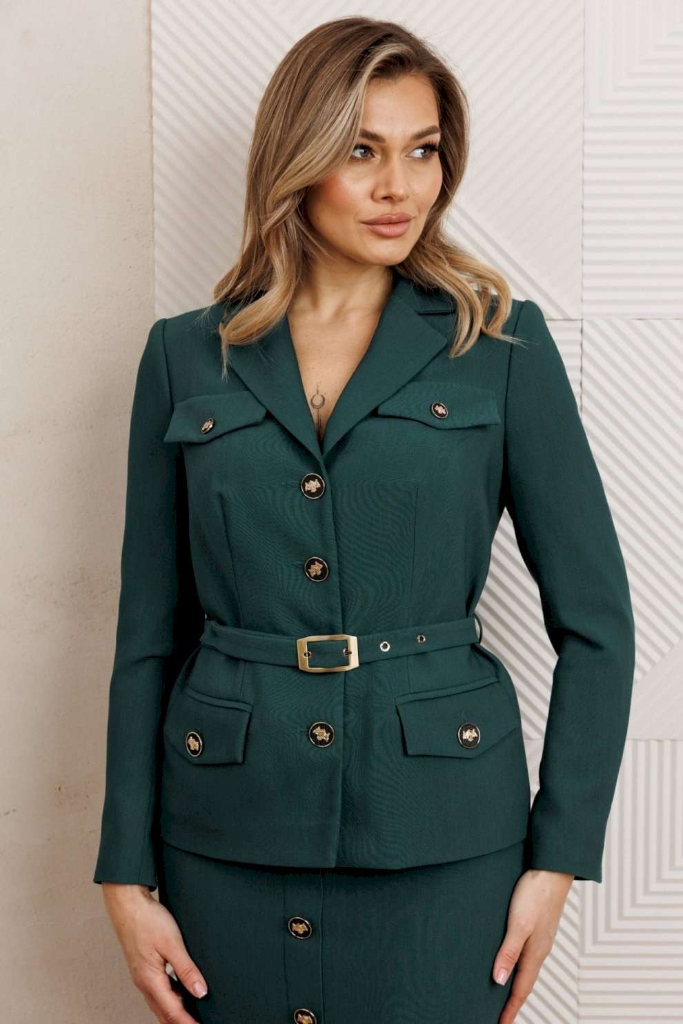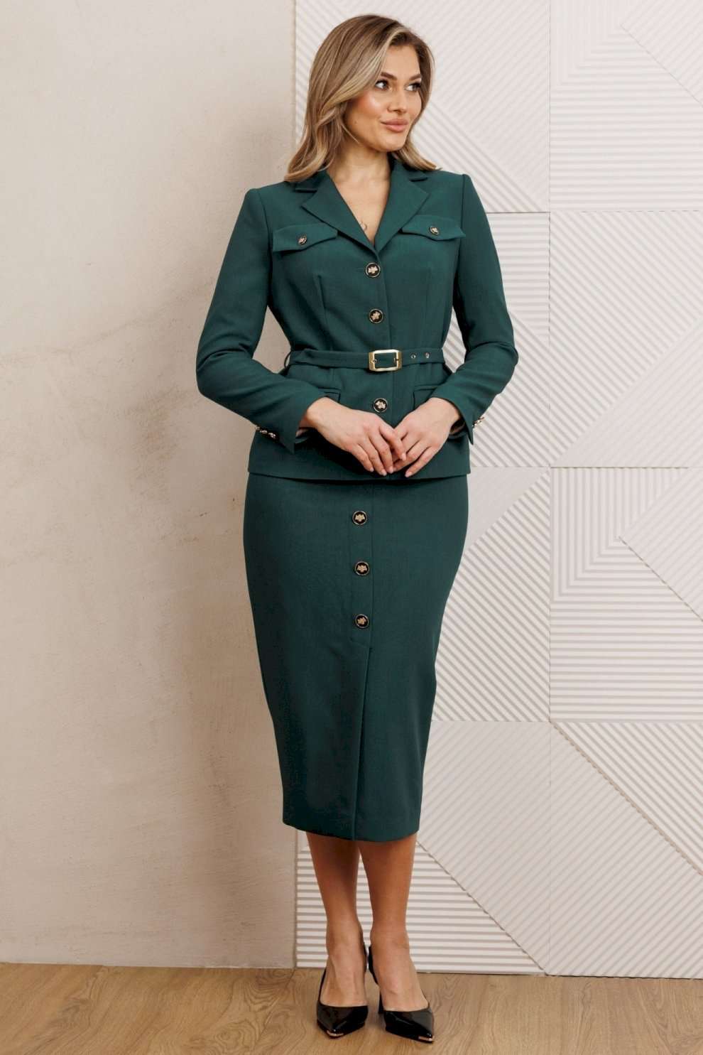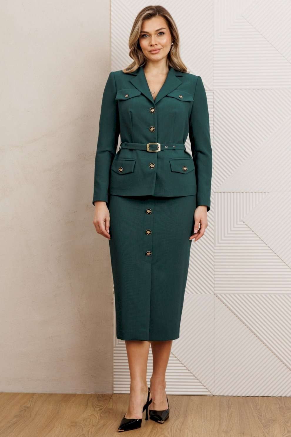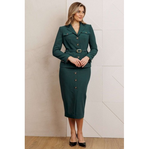 Костюм с юбкой 25-2935 малахит Мода-Юрс – изысканное сочетание классического стиля и современных элементов. Коллекция бренда Мода-Юрс выполнена из полиэстера, вискозы и спандекса, что обеспечивает комфорт и долговечность. Жакет полуприлегающего силуэта с центральной застежкой на пуговицы и декоративными клапанами на груди создает утонченный образ. Съёмный пояс с пряжкой подчеркивает талию. Юбка-карандаш с элегантной шлицей и боковой застежкой-молнией дополняет костюм, обеспечивая свободу движения. Малахитовый цвет идеально подходит для осенне-весенних сезонов, привнося яркий акцент в деловой гардероб. Костюм идеально подходит для офисных встреч и деловых мероприятий.