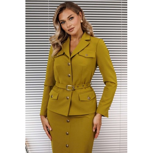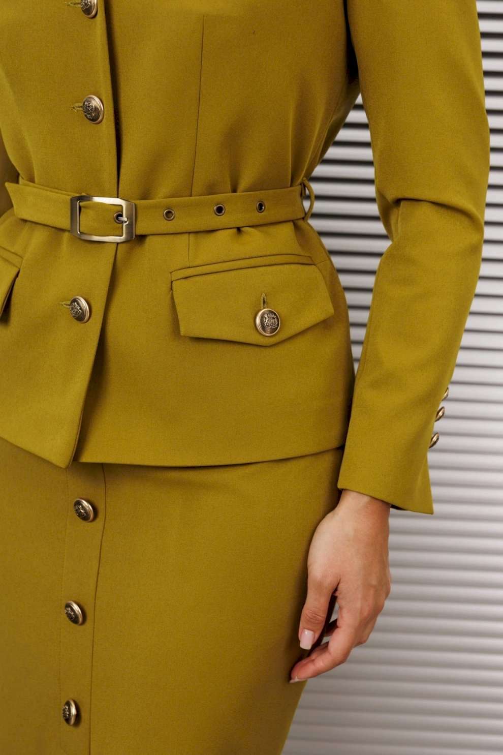 Костюм с юбкой 25-2935 малахит Мода-Юрс – изысканное сочетание классического стиля и современных элементов. Коллекция бренда Мода-Юрс выполнена из полиэстера, вискозы и спандекса, что обеспечивает комфорт и долговечность. Жакет полуприлегающего силуэта с центральной застежкой на пуговицы и декоративными клапанами на груди создает утонченный образ. Съёмный пояс с пряжкой подчеркивает талию. Юбка-карандаш с элегантной шлицей и боковой застежкой-молнией дополняет костюм, обеспечивая свободу движения. Малахитовый цвет идеально подходит для осенне-весенних сезонов, привнося яркий акцент в деловой гардероб. Костюм идеально подходит для офисных встреч и деловых мероприятий.