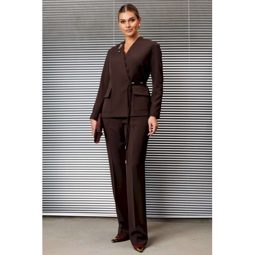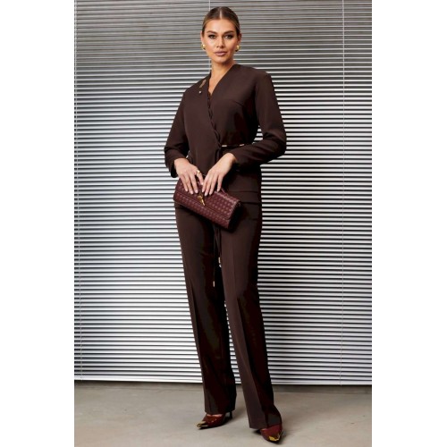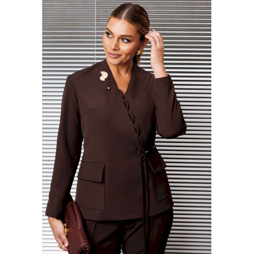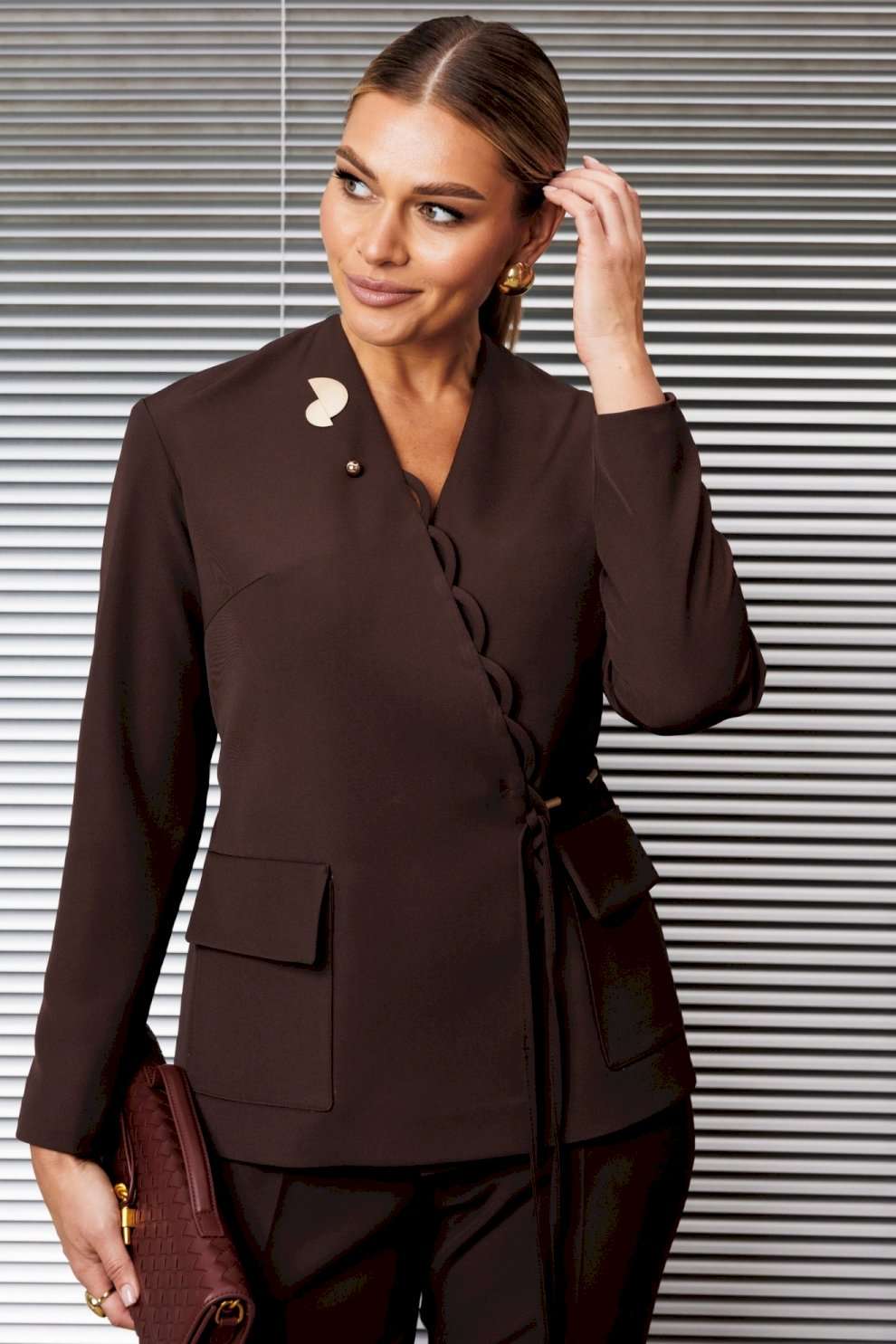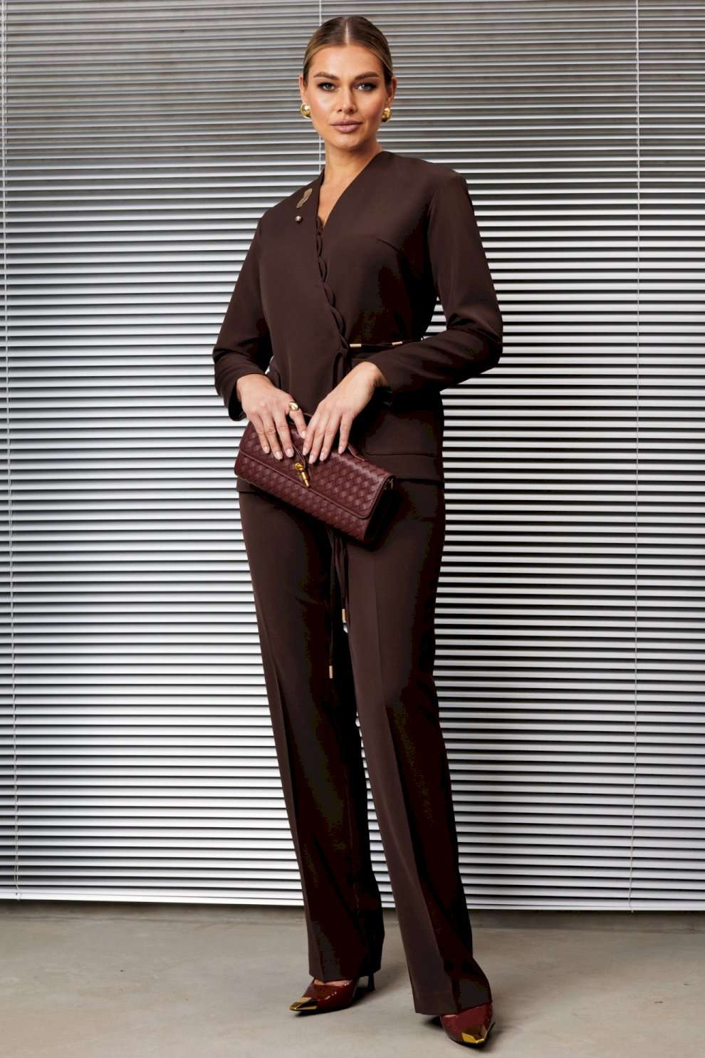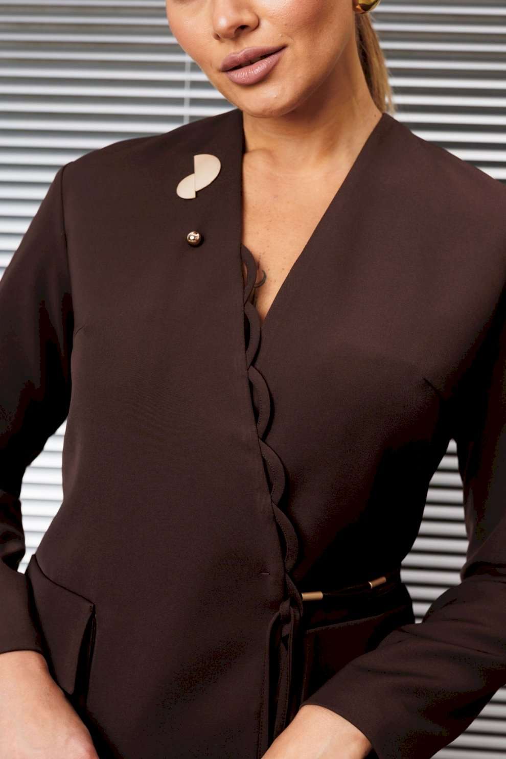 Костюм брючный 25-2939 олива Мода-Юрс — это стильный и современный ансамбль для уверенной женщины. Коллекция бренда Мода-Юрс сочетает в себе комфорт и элегантность, идеально подходя для офисных и деловых встреч. Материал костюма, состоящий из полиэстера, вискозы и спандекса, обеспечивает прочность и легкость в уходе. Жакет свободного кроя оснащен двубортной застежкой на потайную кнопку, а также имеет нагрудные вытачки и крупные накладные карманы с клапанами, добавляя образу практичности и современности. В-образный вырез и регулируемый шнур по талии с металлической фурнитурой добавляют акцент, а съемная брошь позволяет варьировать стиль. Брюки прямого кроя с заутюженными стрелками и боковыми карманами создают строгий силуэт и подчеркивают функциональность. Цвет оливы подчеркивает утонченность, а внутренние подкладки костюма делают его подходящим для любого сезона.