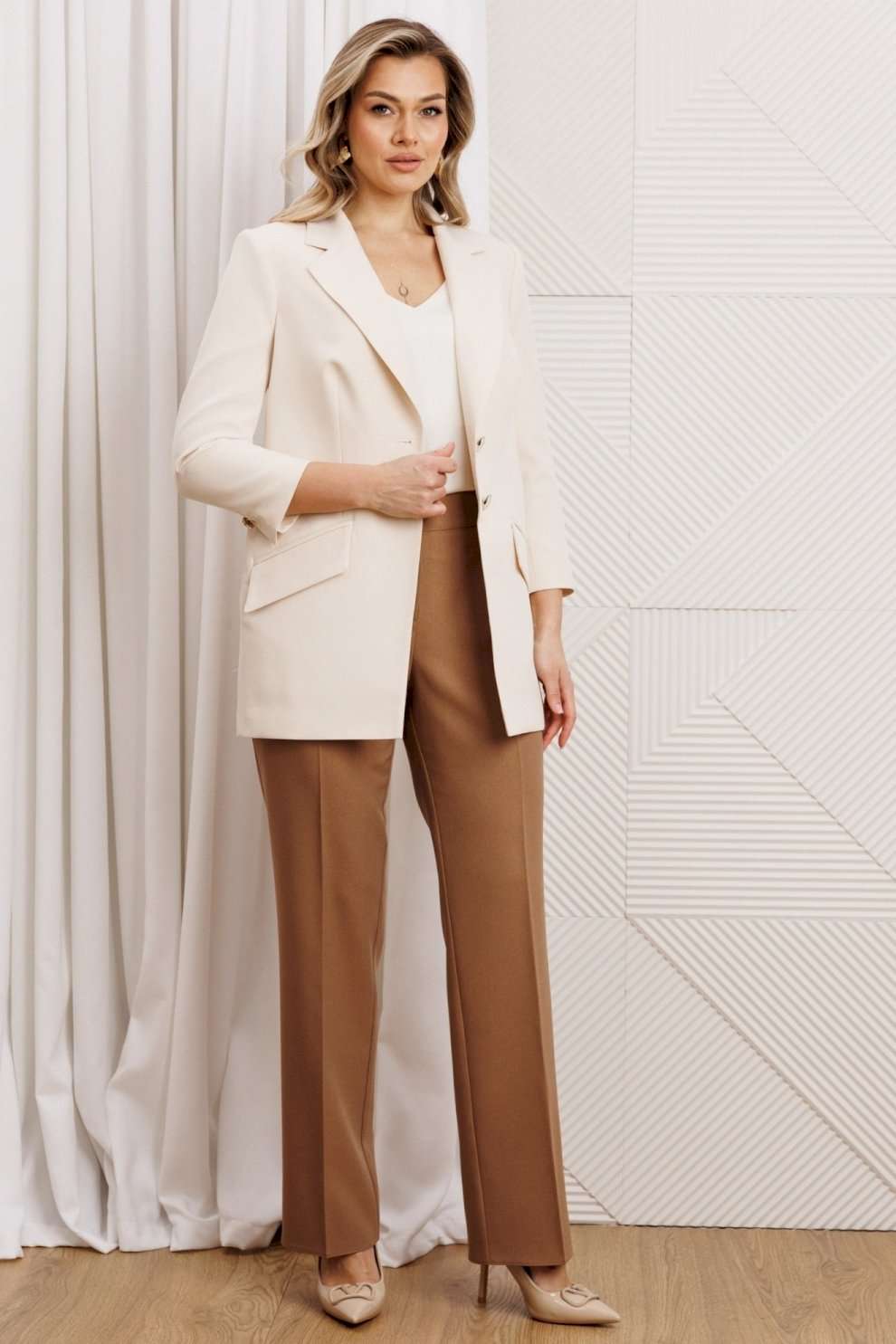 Жакет выполнен в классическом стиле с полуприлегающим силуэтом. Он удлиненный, имеет центральную застежку на одну пуговицу и элегантные детали, такие как спинка с средним швом и шлицей, а также перед с талиевыми вытачками и наклонными карманами с клапанами. Воротник пиджачного типа добавляет строгости, а втачные двухшовные рукава длиной 3/4 со шлицей в локтевом шве и пуговицей придают жакету изысканный вид. Мы собрали все элементы новогодней коллекции в единую капсулу, где каждая вещь - не просто предмет гардероба, а часть большой стилистической головоломки. Собирайте образы как конструктор, меняйтесь в течение вечера и будьте неотразимы в каждой роли!