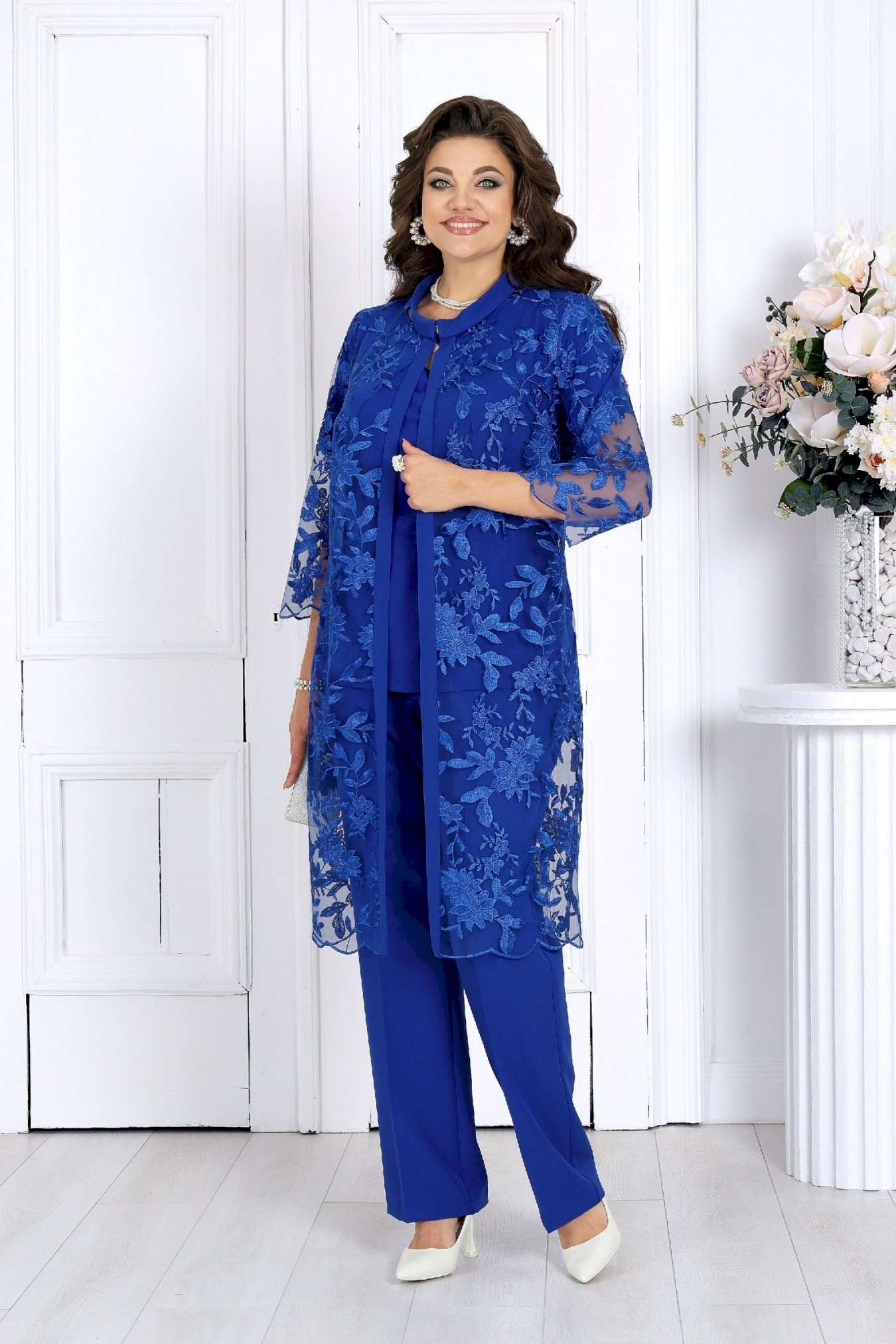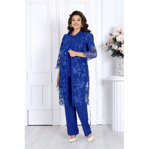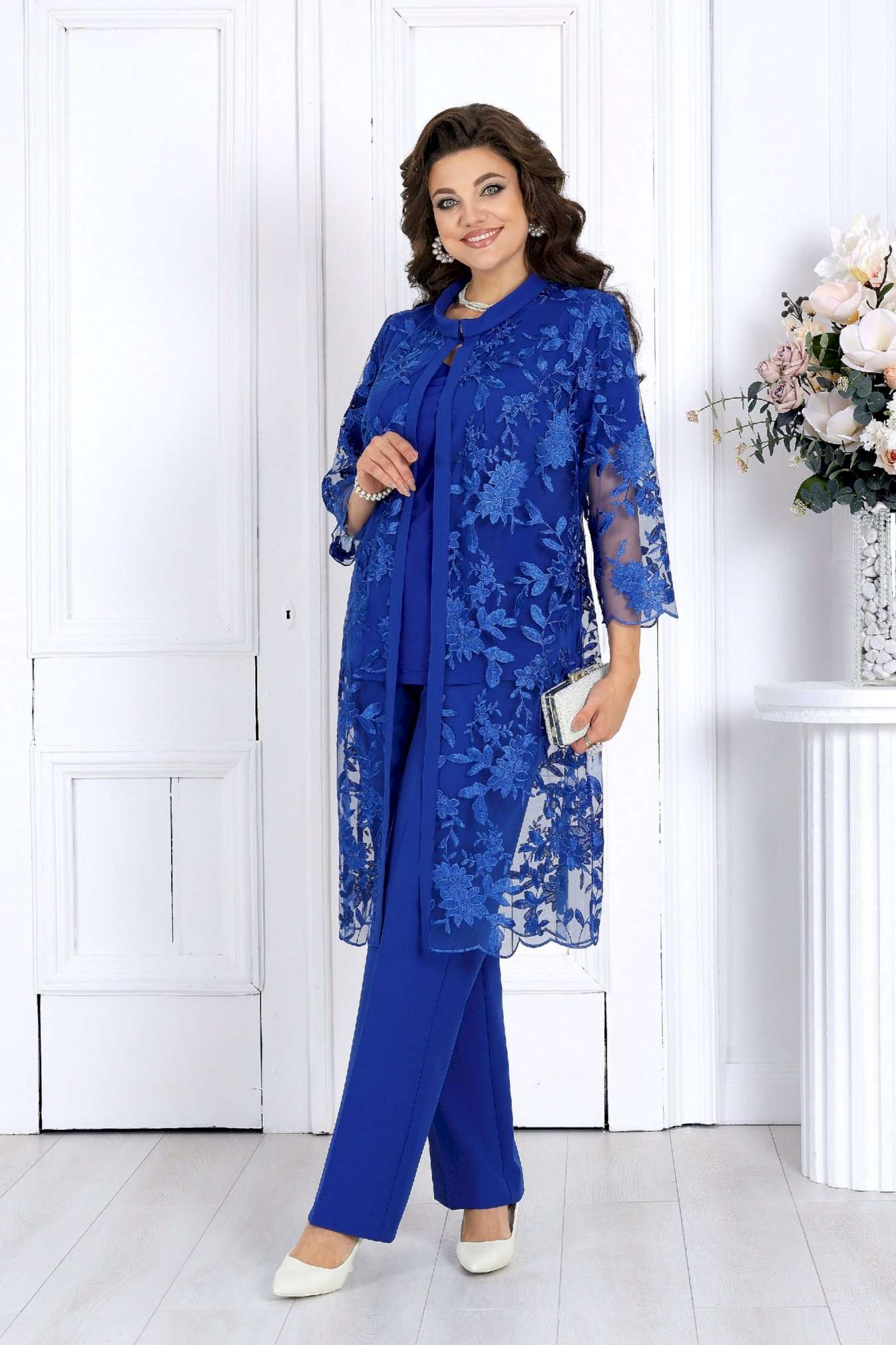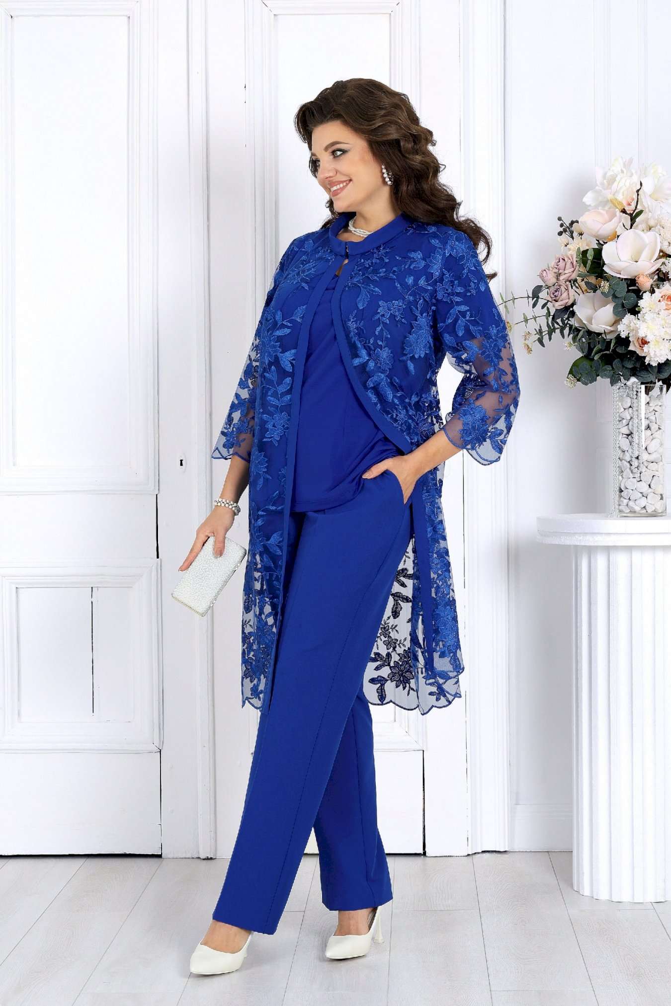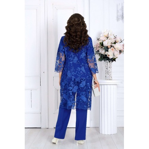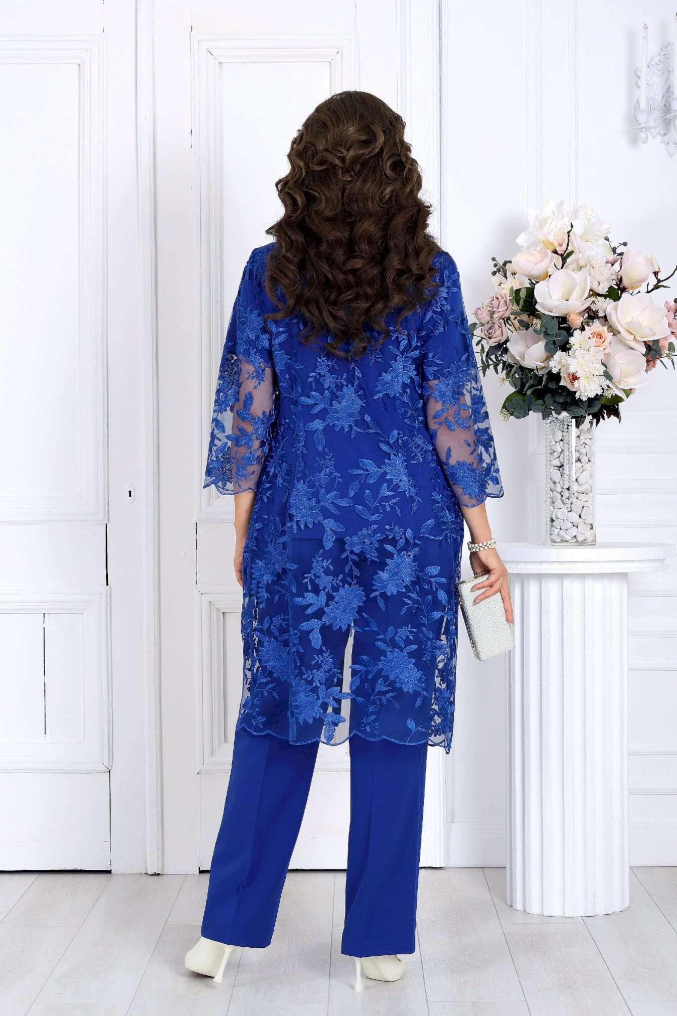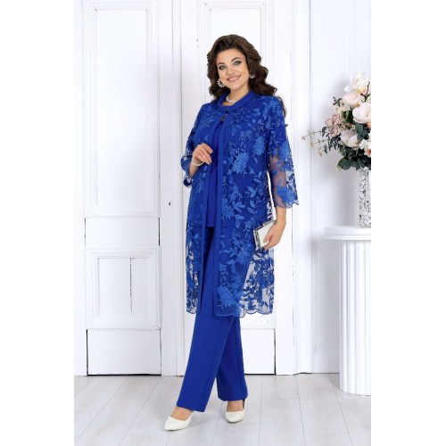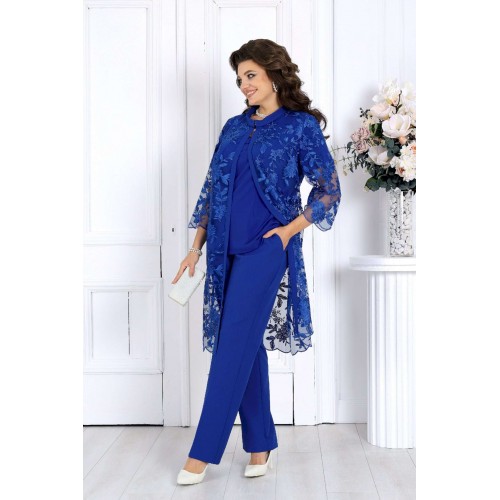 Представляем вашему вниманию изысканный вечерний брючный костюм, созданный для женщин с великолепными формами. Кардиган этого костюма играет ключевую роль в создании правильного силуэта для женщин больших размеров. Мягкие линии и длина кардигана подчеркивают достоинства фигуры, при этом даря ощущение уверенности и гармонии. Эта длина визуально вытягивает силуэт, создавая стройный и изящный образ. Этот вечерний брючный костюм станет прекрасным воплощением вашего стиля и изысканности в праздничных событиях. Комплект брючный 3-х предметный, состоящий из кардигана, выполненного из гипюра, джемпера, выполненного из трикотажного полотна «масло» и брюк, выполненных из костюмно-плательной ткани. Кардиган, полуприлегающего силуэта, длиной по середине спинки 107 см от шва втачивания воротника. Перед с нагрудными вытачками, выходящими из пройм. Борта переда обработаны притачными планками из костюмно-плательной ткани. Спинка с талиевыми вытачками. Низа переда, спинки оформлены фестонами. Горловина спинки и переда округлая, по переду углубленная, с воротником-стойкой. Концы воротника прямоугольной формы. Кардиган с застежкой на декоративный крючок на уровне воротника. Воротник выполнен из костюмно-плательной ткани. Рукава втачные, одношовные. Длина рукавов 51 см. Низа рукавов оформлены фестонами. Джемпер полуприлегающего силуэта, длиной по середине спинки 66 см. Боковые части переда с рельефами от горловины до низа, и центральной частью переда, переходящей в прямоугольный вырез горловины. Горловина переда и спинки округлая, углубленная, окантованная. Спинка с талиевыми вытачками. Рукава втачные, одношовные, длиной 21 см. Брюки классические, с посадкой на талии, на притачном поясе, с застёжкой на тесьму-«молния», расположенную в среднем шве передних половинок, и 1 петлю и 1 пуговицу на поясе. Передние и задние половинки брюк с талиевыми вытачками, идущими от пояса вниз, с заутюженными стрелками, с боковыми наклонными карманами на передних половинках. Для лучшего прилегания брюк в области талии в поясе со стороны спинки вставлена резинка.