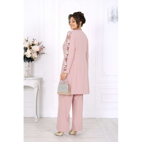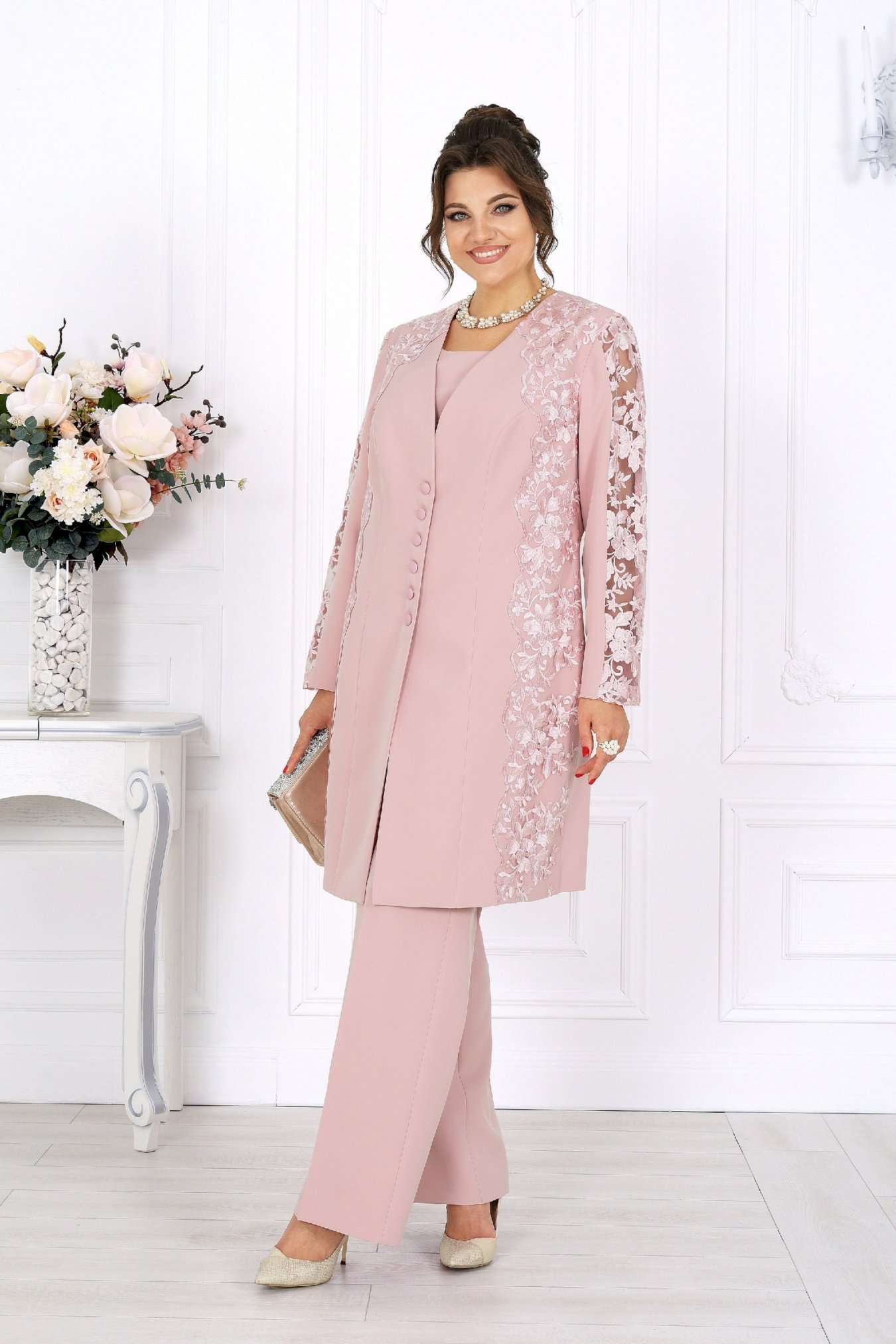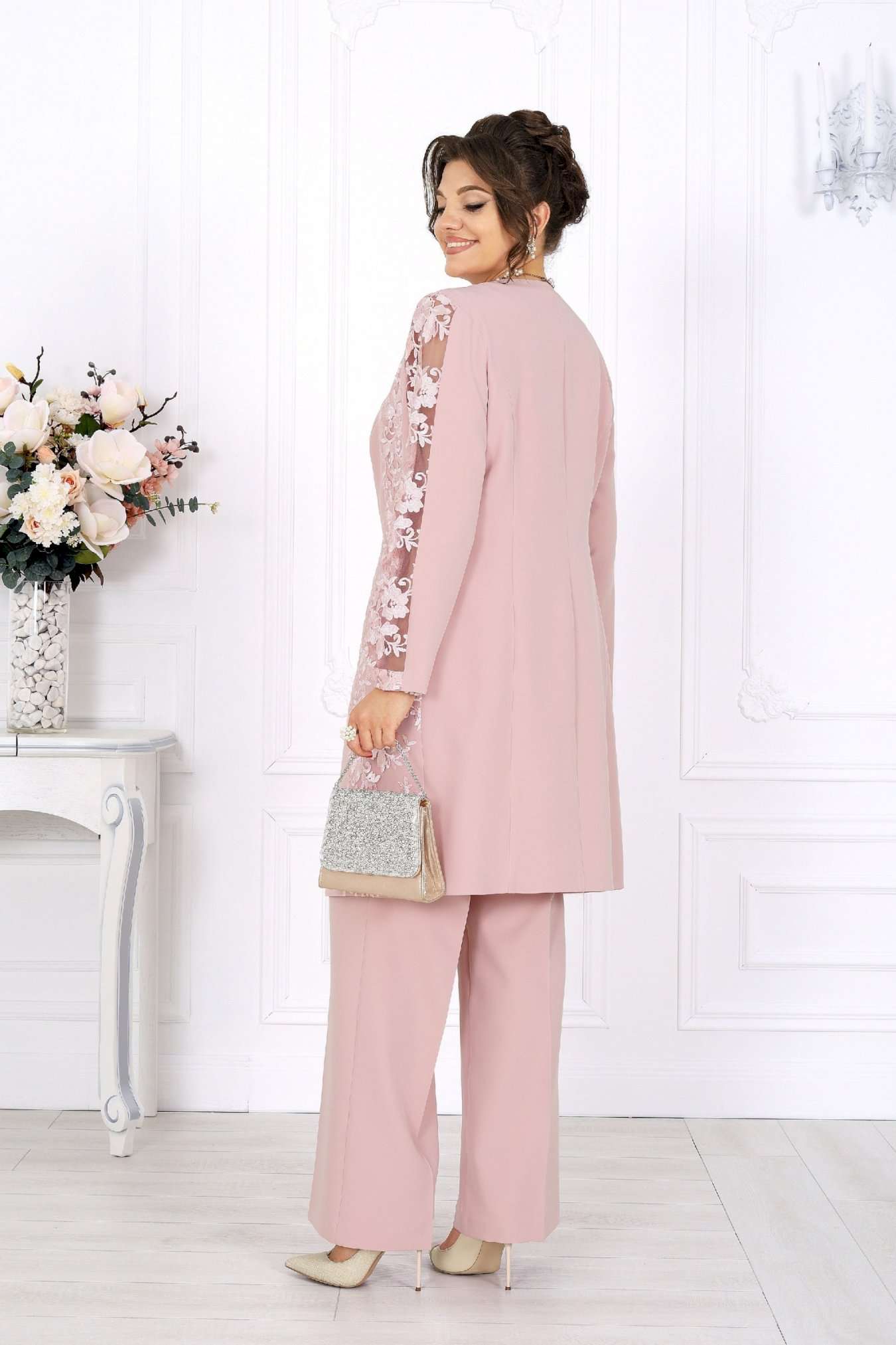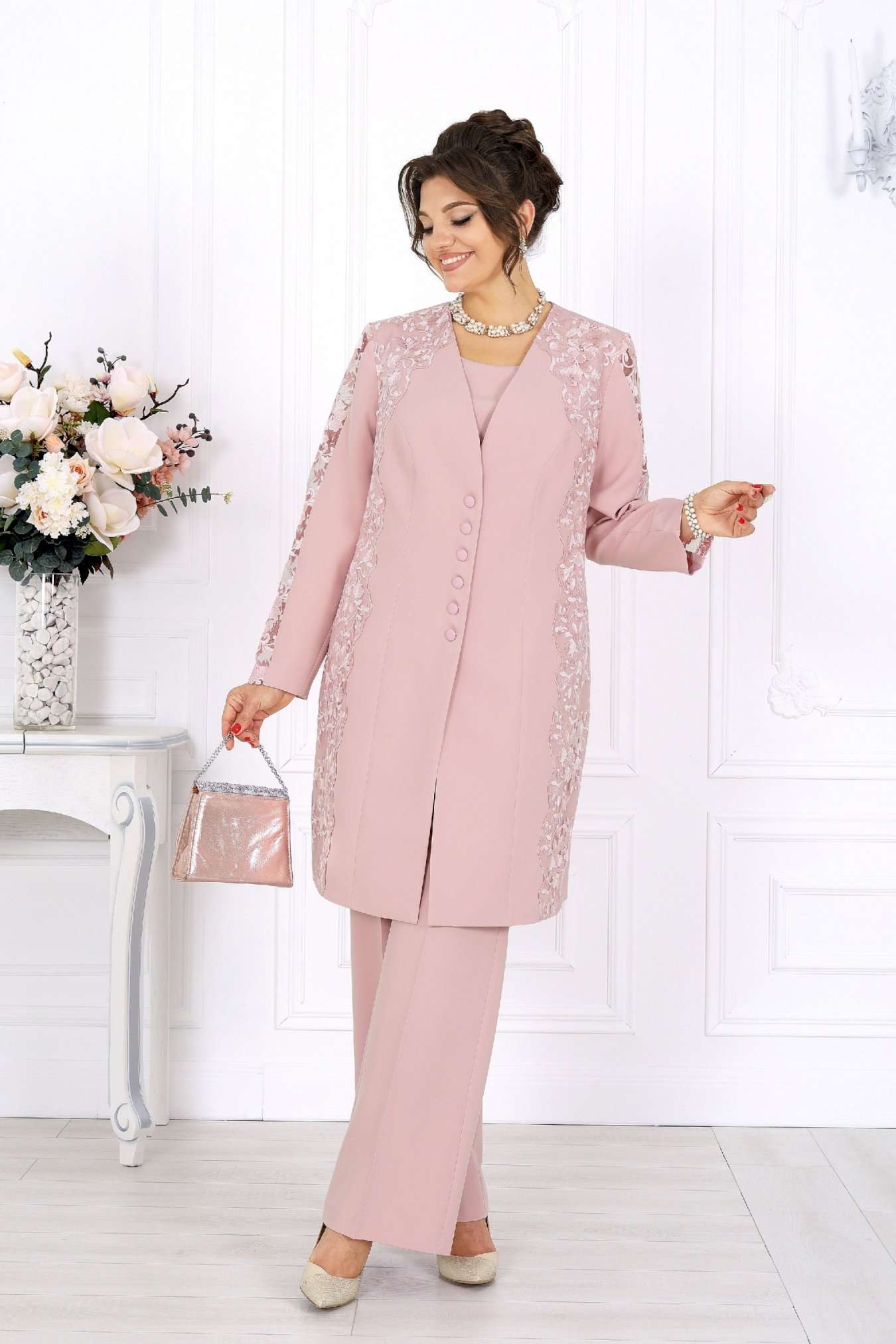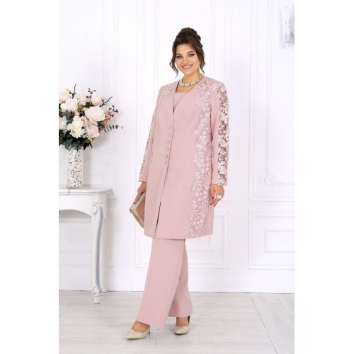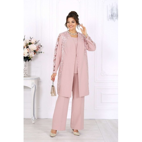 Этот костюм-тройка универсален и вне времени: он одинаково уместен на торжестве, в офисе или на важной встрече. В нём вы будете выглядеть элегантно и уверенно, будь то вечер в театре, семейное событие или праздник, где хочется блистать, сохранив безупречный вкус. Мягкий полуприлегающий силуэт формирует идеальные пропорции, а продуманные линии визуально вытягивают фигуру, создавая ощущение лёгкости и стройности. Выбирая этот наряд, вы выбираете гармонию — между комфортом и красотой, строгостью и женственностью, классикой и современностью. Это не просто костюм — это отражение вашего внутреннего достоинства и стиля. Комплект брючный 3-х предметный, состоящий из кардигана, блузки и брюк. Кардиган полуприлегающего силуэта, выполнен из костюмно-плательной ткани и гипюра. Модель без воротника и плечевых накладок. Перед на подкладке, с рельефными швами, направленными от проймы до низа, и центральной застежкой на 6 прорезных петель и 6 пуговиц. В области горловины, плеча и боковой части переда настрочены декоративные элементы из гипюра с фестонами по краю. Спинка со средним швом и рельефами, направленными от проймы до низа. Горловина округлая по спинке, спереди V-образная, углубленная. Рукав длинный, втачной, со вставкой из гипюра в верхней части. Длина кардигана – 95 см, длина рукава – 60 см. Блузка полуприлегающего силуэта, выполнена из костюмно-плательной ткани. Модель без подкладки, воротника, рукавов и плечевых накладок. Перед с нагрудными вытачками. Спинка с талиевыми вытачками и средним швом, в верхней части которого обработана застежка на потайную тесьму-«молнию» (50 см). Горловина округлая, углубленная спереди. Длина блузки – 65 см. Брюки классические, длинные, с посадкой на талии, выполнены из костюмно- плательной ткани. Модель со стрелками. Передние и задние половинки брюк с талиевыми вытачками, направленными от пояса вниз. Спереди обработаны наклонные боковые карманы и центральная застёжка на тесьму-«молнию». Притачной пояс застегивается на 1 петлю и 1 пуговицу; для лучшего прилегания по линии талии в притачном поясе предусмотрена эластичная лента, вставленная по спинке. Длина брюк по боковому (с поясом) – 107 см (50 – 52 р-р), 108 см (54 – 58 р-р).
