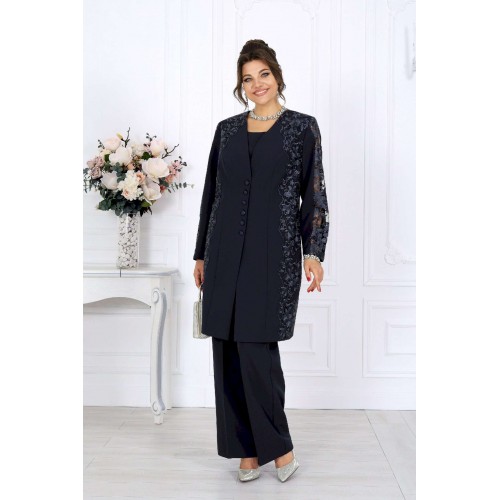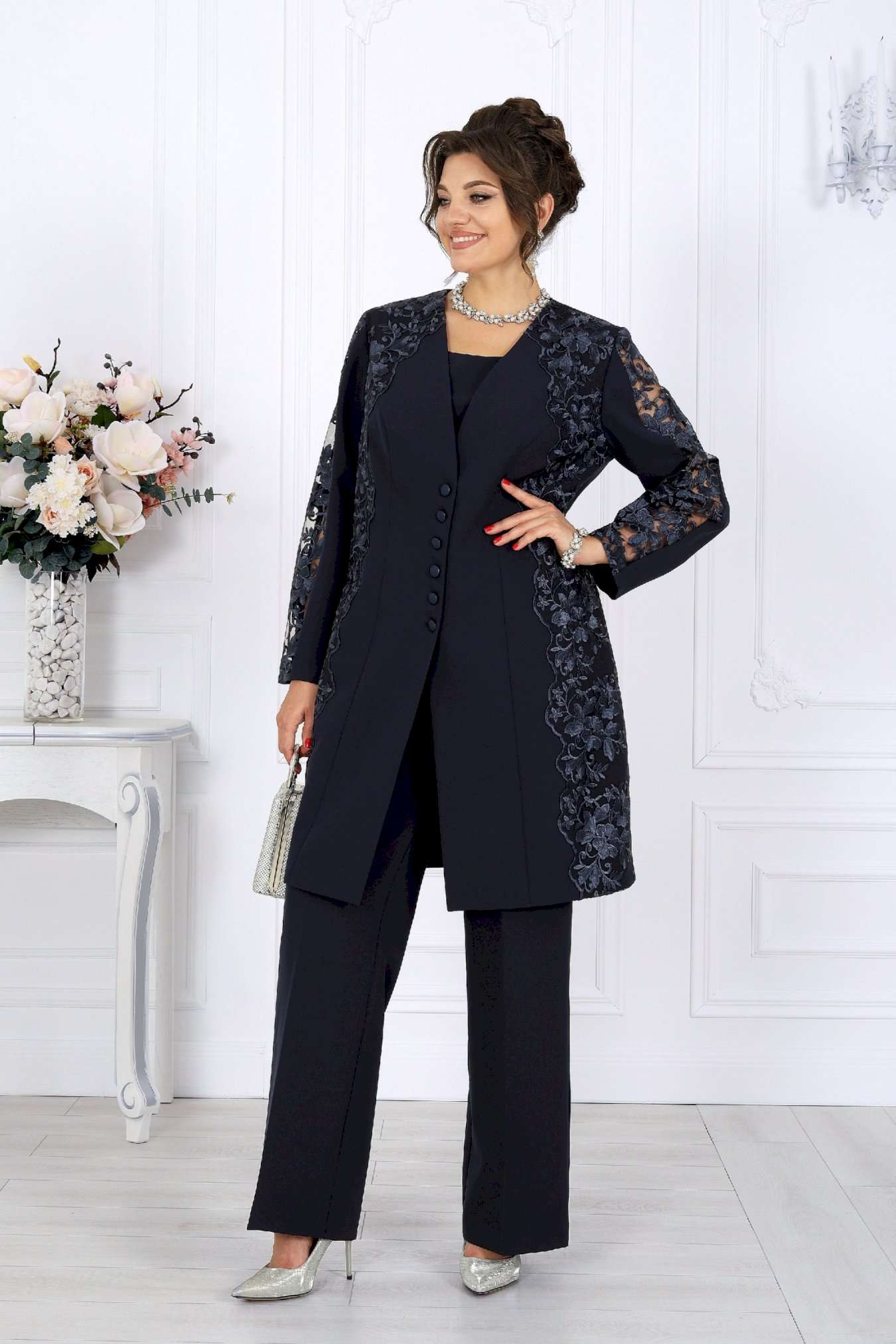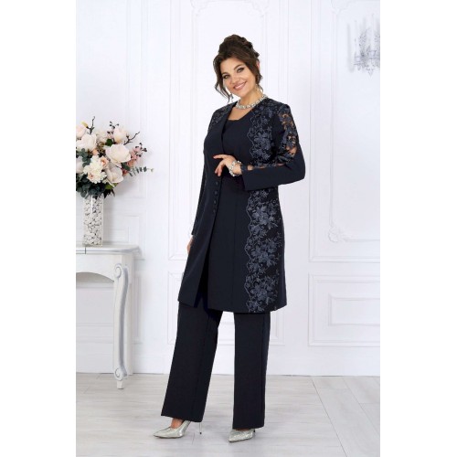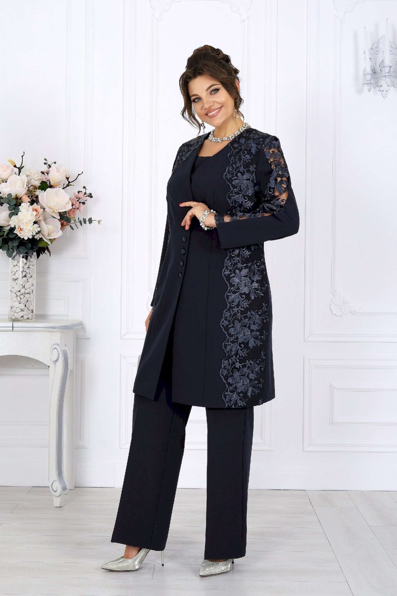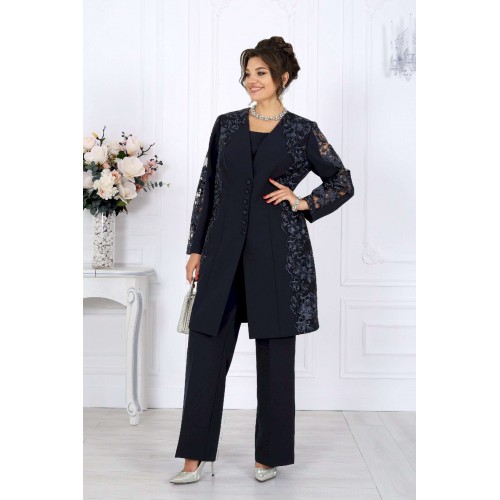 Этот костюм-тройка универсален и вне времени: он одинаково уместен на торжестве, в офисе или на важной встрече. В нём вы будете выглядеть элегантно и уверенно, будь то вечер в театре, семейное событие или праздник, где хочется блистать, сохранив безупречный вкус. Мягкий полуприлегающий силуэт формирует идеальные пропорции, а продуманные линии визуально вытягивают фигуру, создавая ощущение лёгкости и стройности. Выбирая этот наряд, вы выбираете гармонию — между комфортом и красотой, строгостью и женственностью, классикой и современностью. Это не просто костюм — это отражение вашего внутреннего достоинства и стиля. Комплект брючный 3-х предметный, состоящий из кардигана, блузки и брюк. Кардиган полуприлегающего силуэта, выполнен из костюмно-плательной ткани и гипюра. Модель без воротника и плечевых накладок. Перед на подкладке, с рельефными швами, направленными от проймы до низа, и центральной застежкой на 6 прорезных петель и 6 пуговиц. В области горловины, плеча и боковой части переда настрочены декоративные элементы из гипюра с фестонами по краю. Спинка со средним швом и рельефами, направленными от проймы до низа. Горловина округлая по спинке, спереди V-образная, углубленная. Рукав длинный, втачной, со вставкой из гипюра в верхней части. Длина кардигана – 95 см, длина рукава – 60 см. Блузка полуприлегающего силуэта, выполнена из костюмно-плательной ткани. Модель без подкладки, воротника, рукавов и плечевых накладок. Перед с нагрудными вытачками. Спинка с талиевыми вытачками и средним швом, в верхней части которого обработана застежка на потайную тесьму-«молнию» (50 см). Горловина округлая, углубленная спереди. Длина блузки – 65 см. Брюки классические, длинные, с посадкой на талии, выполнены из костюмно- плательной ткани. Модель со стрелками. Передние и задние половинки брюк с талиевыми вытачками, направленными от пояса вниз. Спереди обработаны наклонные боковые карманы и центральная застёжка на тесьму-«молнию». Притачной пояс застегивается на 1 петлю и 1 пуговицу; для лучшего прилегания по линии талии в притачном поясе предусмотрена эластичная лента, вставленная по спинке. Длина брюк по боковому (с поясом) – 107 см (50 – 52 р-р), 108 см (54 – 58 р-р).