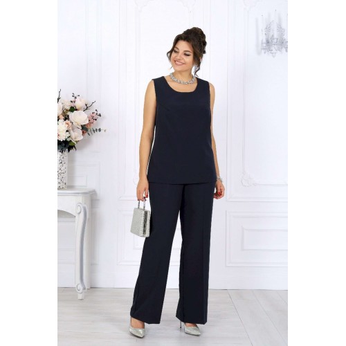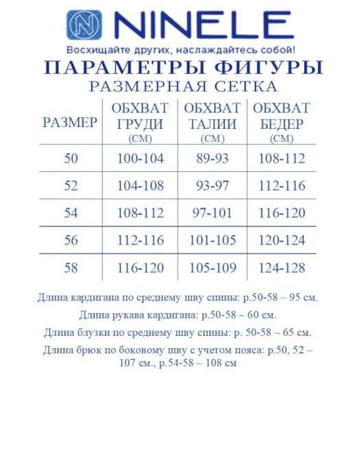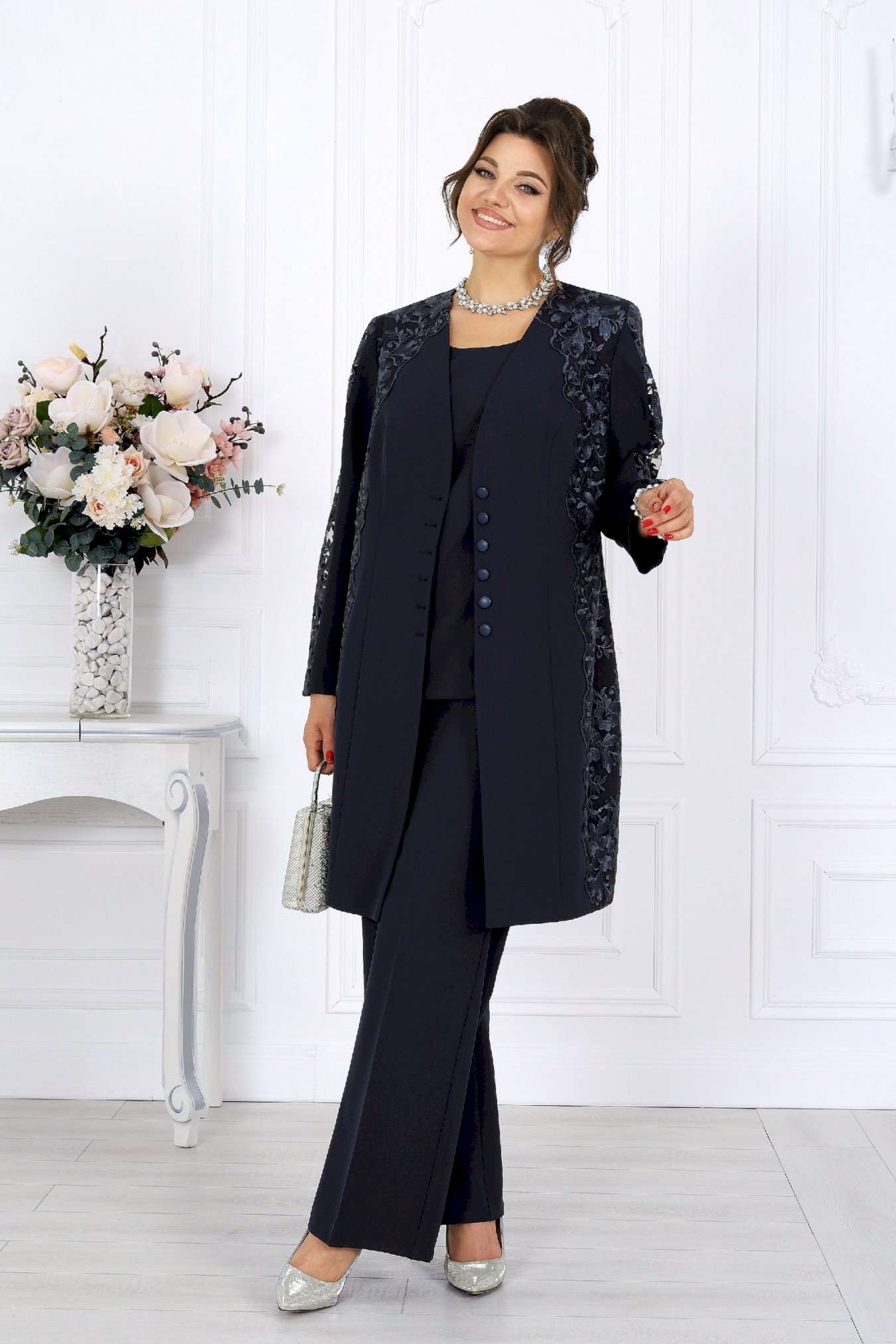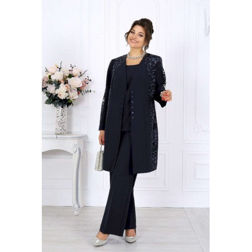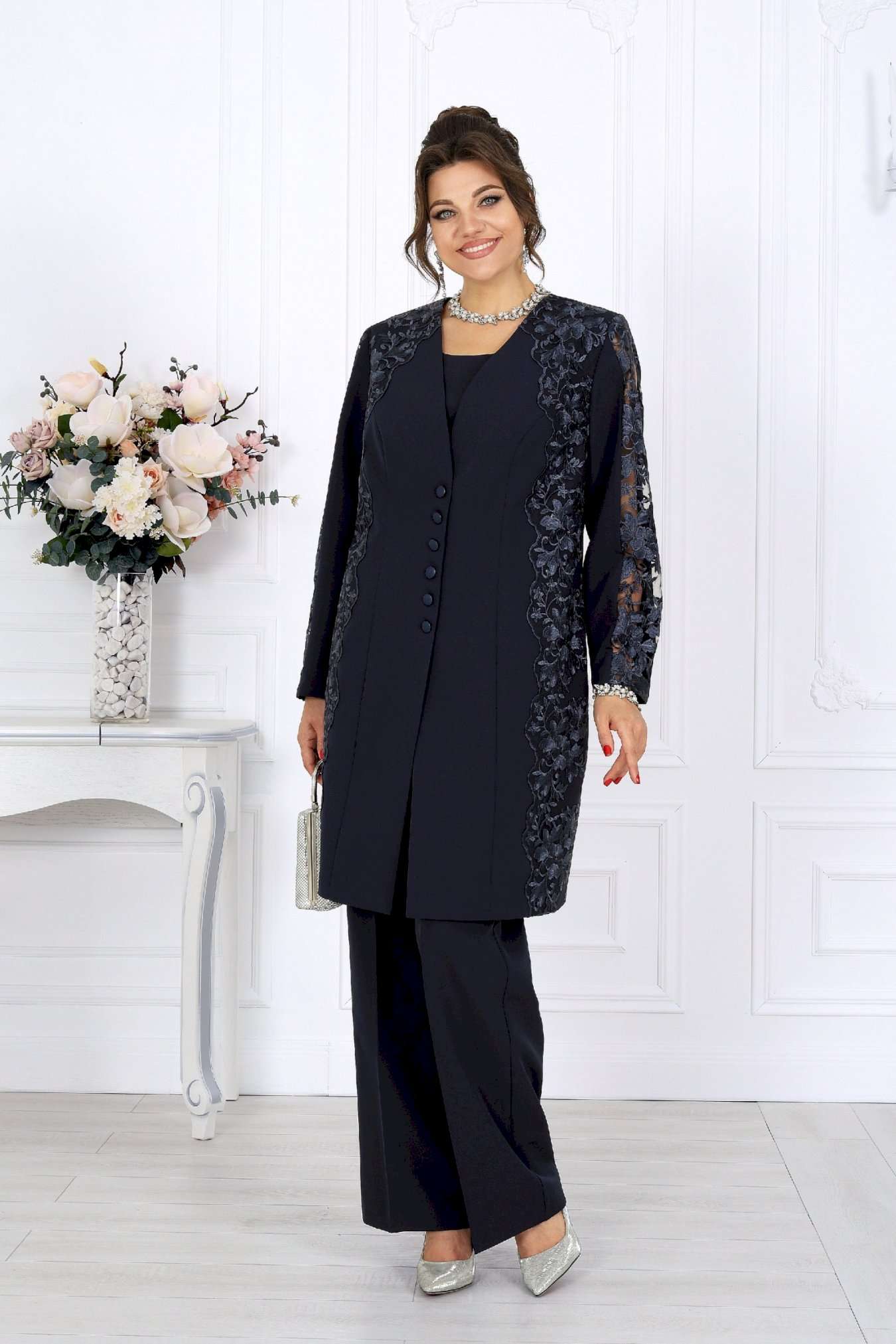 Этот костюм-тройка универсален и вне времени: он одинаково уместен на торжестве, в офисе или на важной встрече. В нём вы будете выглядеть элегантно и уверенно, будь то вечер в театре, семейное событие или праздник, где хочется блистать, сохранив безупречный вкус. Мягкий полуприлегающий силуэт формирует идеальные пропорции, а продуманные линии визуально вытягивают фигуру, создавая ощущение лёгкости и стройности. Выбирая этот наряд, вы выбираете гармонию — между комфортом и красотой, строгостью и женственностью, классикой и современностью. Это не просто костюм — это отражение вашего внутреннего достоинства и стиля. Комплект брючный 3-х предметный, состоящий из кардигана, блузки и брюк. Кардиган полуприлегающего силуэта, выполнен из костюмно-плательной ткани и гипюра. Модель без воротника и плечевых накладок. Перед на подкладке, с рельефными швами, направленными от проймы до низа, и центральной застежкой на 6 прорезных петель и 6 пуговиц. В области горловины, плеча и боковой части переда настрочены декоративные элементы из гипюра с фестонами по краю. Спинка со средним швом и рельефами, направленными от проймы до низа. Горловина округлая по спинке, спереди V-образная, углубленная. Рукав длинный, втачной, со вставкой из гипюра в верхней части. Длина кардигана – 95 см, длина рукава – 60 см. Блузка полуприлегающего силуэта, выполнена из костюмно-плательной ткани. Модель без подкладки, воротника, рукавов и плечевых накладок. Перед с нагрудными вытачками. Спинка с талиевыми вытачками и средним швом, в верхней части которого обработана застежка на потайную тесьму-«молнию» (50 см). Горловина округлая, углубленная спереди. Длина блузки – 65 см. Брюки классические, длинные, с посадкой на талии, выполнены из костюмно- плательной ткани. Модель со стрелками. Передние и задние половинки брюк с талиевыми вытачками, направленными от пояса вниз. Спереди обработаны наклонные боковые карманы и центральная застёжка на тесьму-«молнию». Притачной пояс застегивается на 1 петлю и 1 пуговицу; для лучшего прилегания по линии талии в притачном поясе предусмотрена эластичная лента, вставленная по спинке. Длина брюк по боковому (с поясом) – 107 см (50 – 52 р-р), 108 см (54 – 58 р-р).