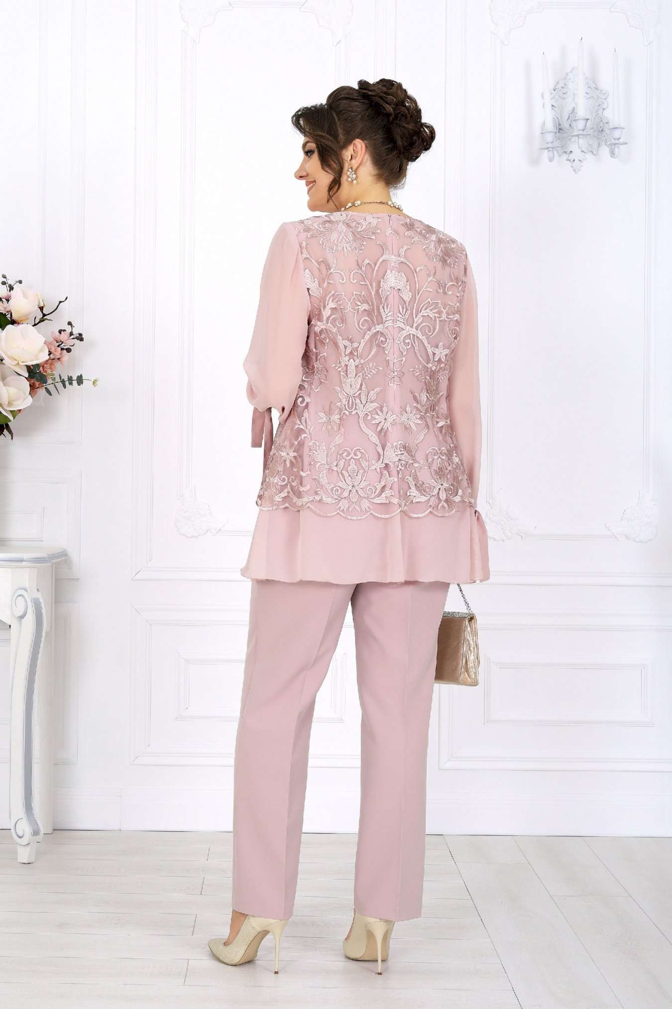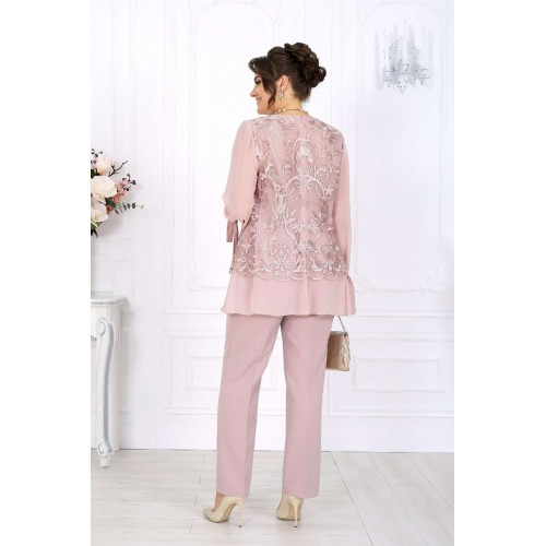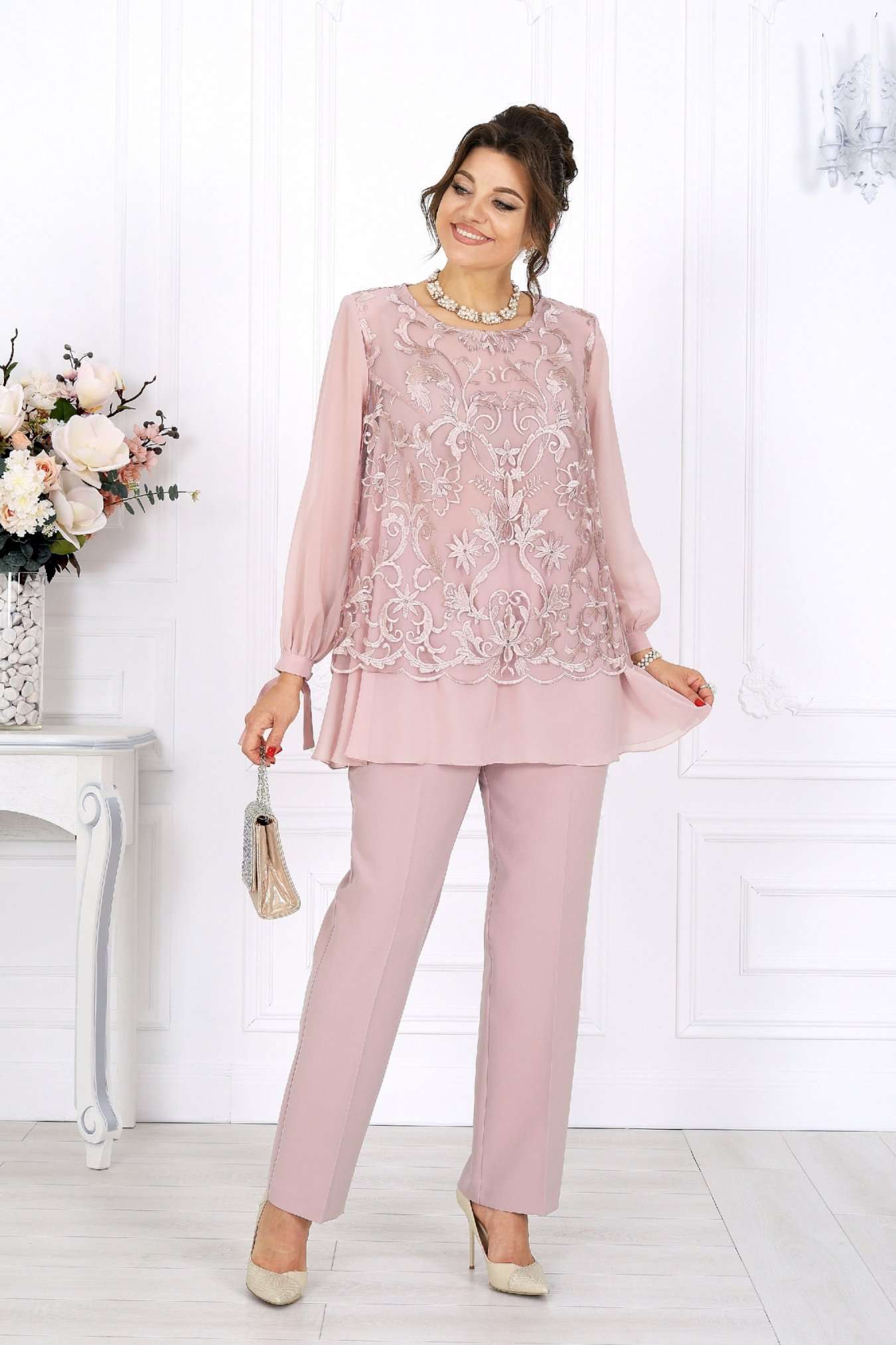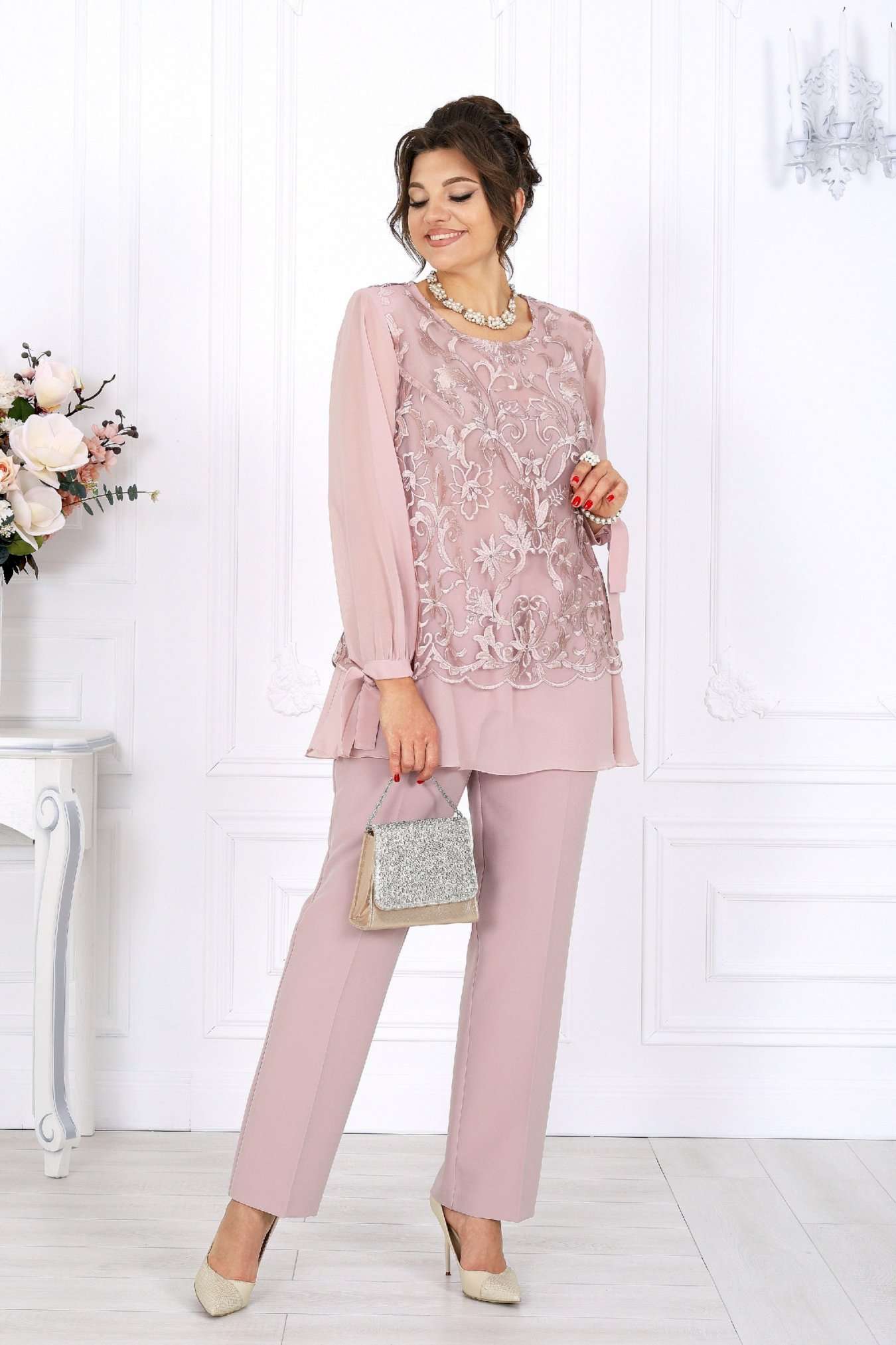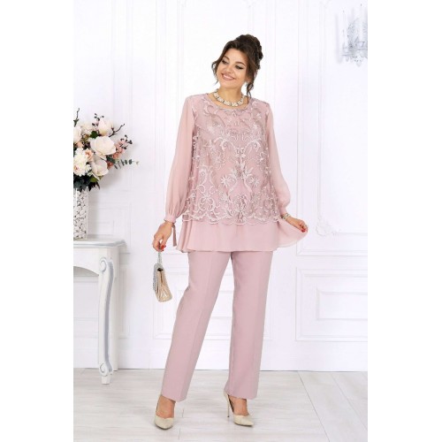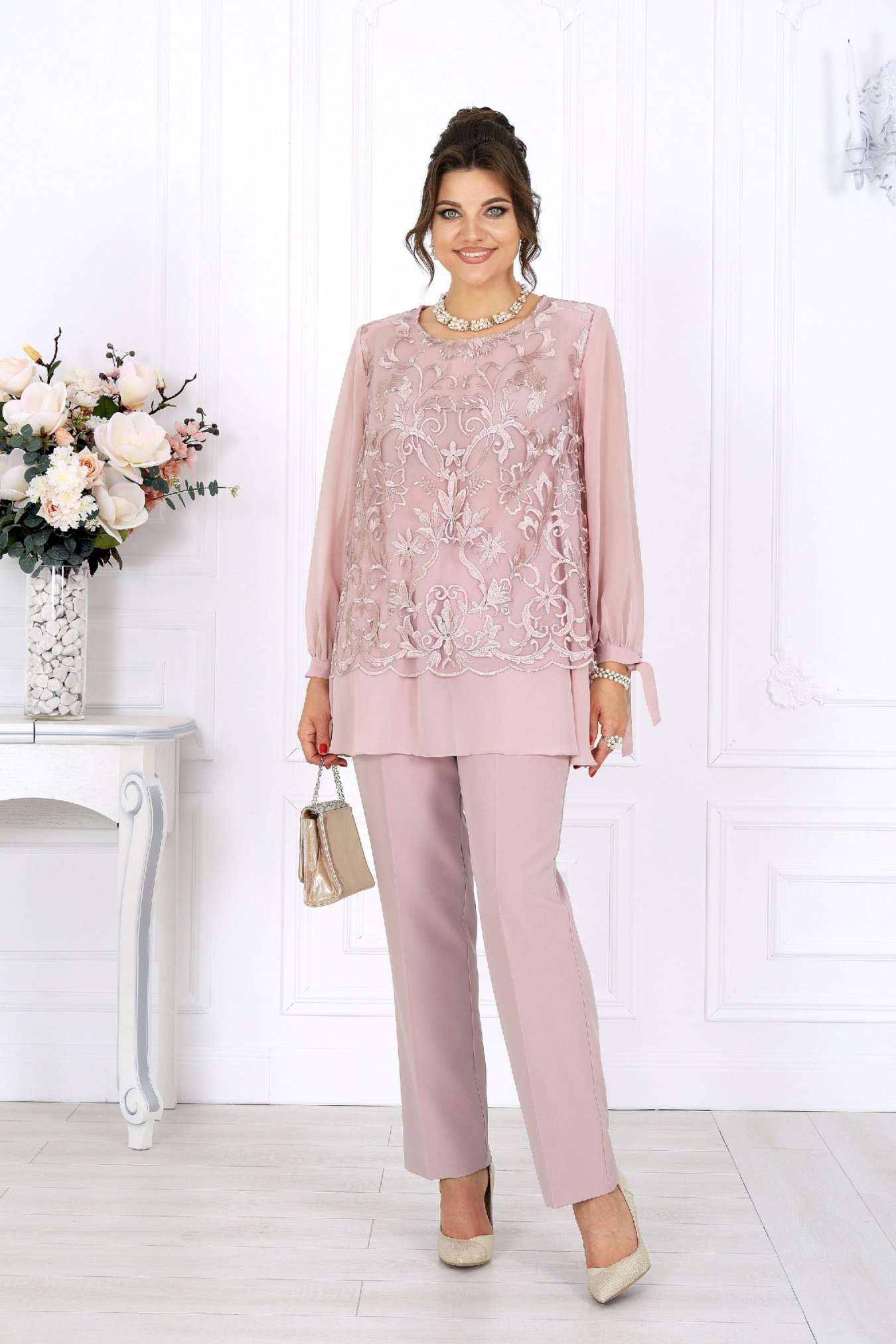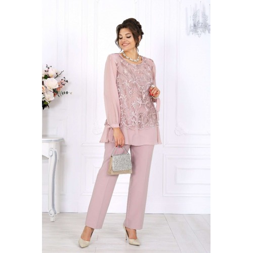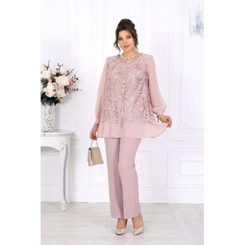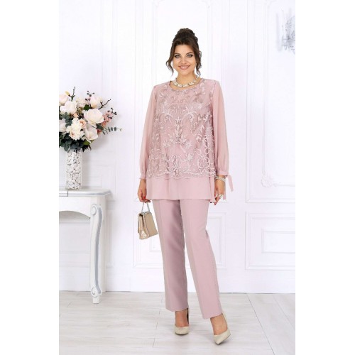 Этот нарядный костюм для полных женщин станет вашим универсальным решением — он уместен и на праздничном вечере, и в офисной обстановке. Модель гармонично сочетает в себе торжественность и лаконичность, поэтому одинаково эффектно смотрится как с лодочками и клатчем, так и с более сдержанными аксессуарами. Блузка прямого силуэта выполнена в двух слоях: верхний — из роскошного гипюра с утончённым растительным узором и фестонами по краю, нижний — из струящегося шифона. Такое сочетание придаёт образу глубину и воздушность, мягко скрывая возможные особенности фигуры. Длинные рукава с манжетами и завязками добавляют изысканности, а округлый вырез горловины подчёркивает линию шеи. Благодаря потайной застёжке по спинке изделие сохраняет идеальную посадку и комфорт в движении. Брюки классического кроя выполнены из качественной костюмно-плательной ткани. Они идеально садятся на талию, вытягивают силуэт и визуально стройнят фигуру. Стрелки формируют чёткие линии, придавая образу деловую собранность, а эластичная вставка на поясе обеспечивает удобство даже при длительном ношении. Комплект брючный 2-х предметный, состоящий из блузки и брюк. Блузка прямого силуэта, комбинированная. Модель двухслойная: верхний слой выполнен из гипюра с фестонами, нижний – из шифона. На верхней детали переда обработаны нагрудные вытачки, на верхней детали спинки – талиевые. В среднем шве спинки предусмотрена застежка на потайную тесьму-«молнию» (50см). Вырез горловины переда и спинки округлый, углубленный спереди. Рукав длинный, втачной, со сборкой по низу и притачной манжетой с завязками. Длина блузки – 74 см, длина рукава (с манжетой) – 59 см. Брюки классические, длинные, с посадкой на талии, выполнены из костюмно- плательной ткани. Модель со стрелками. Передние и задние половинки брюк с талиевыми вытачками, направленными от пояса вниз. Спереди обработаны наклонные боковые карманы и центральная застёжка на тесьму-«молнию». Притачной пояс застегивается на 1 петлю и 1 пуговицу; для лучшего прилегания по линии талии в притачном поясе предусмотрена эластичная лента, вставленная по спинке. Длина брюк по боковому (с поясом) – 104 см (50 – 52 р-р), 105 см (54 – 58 р-р).