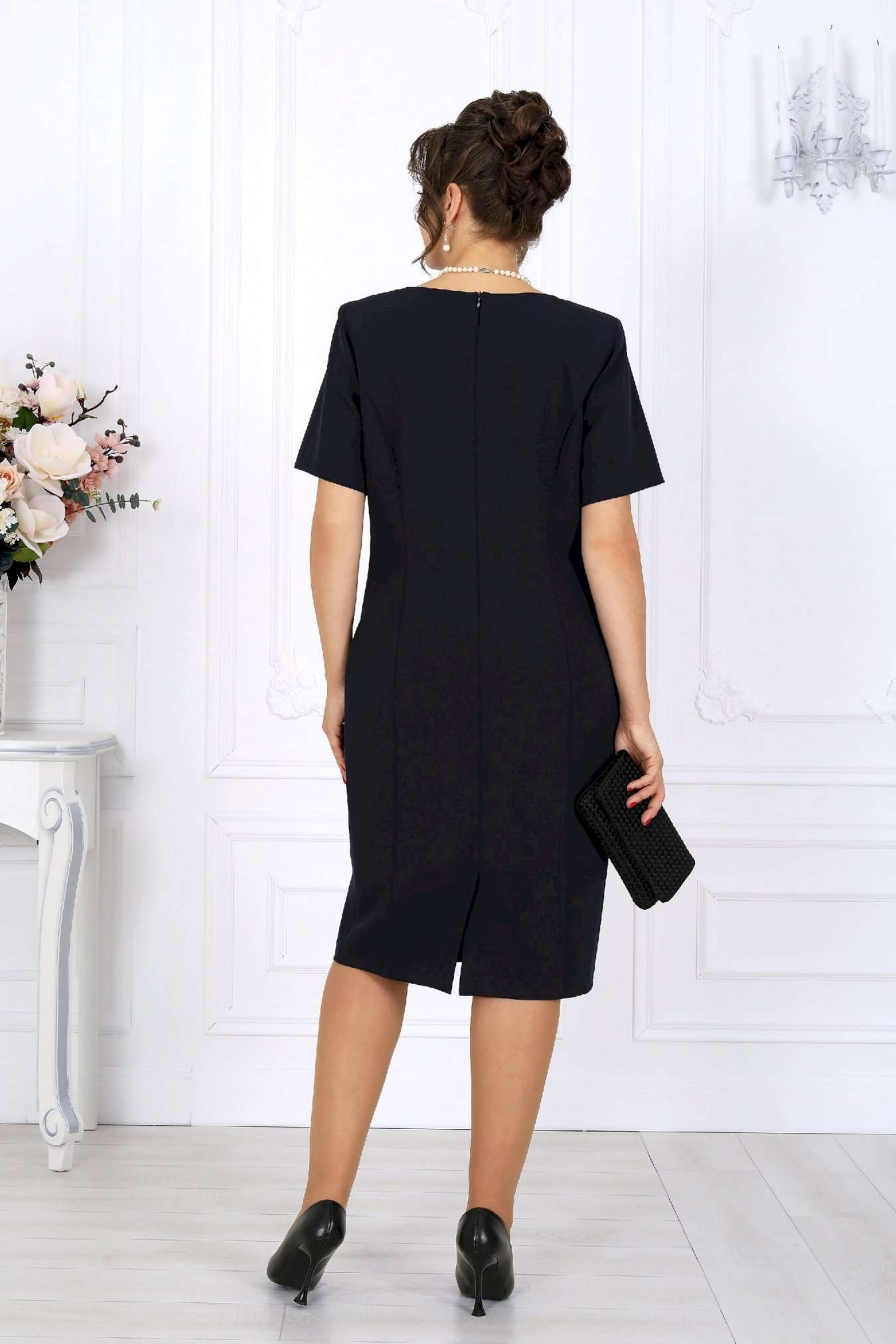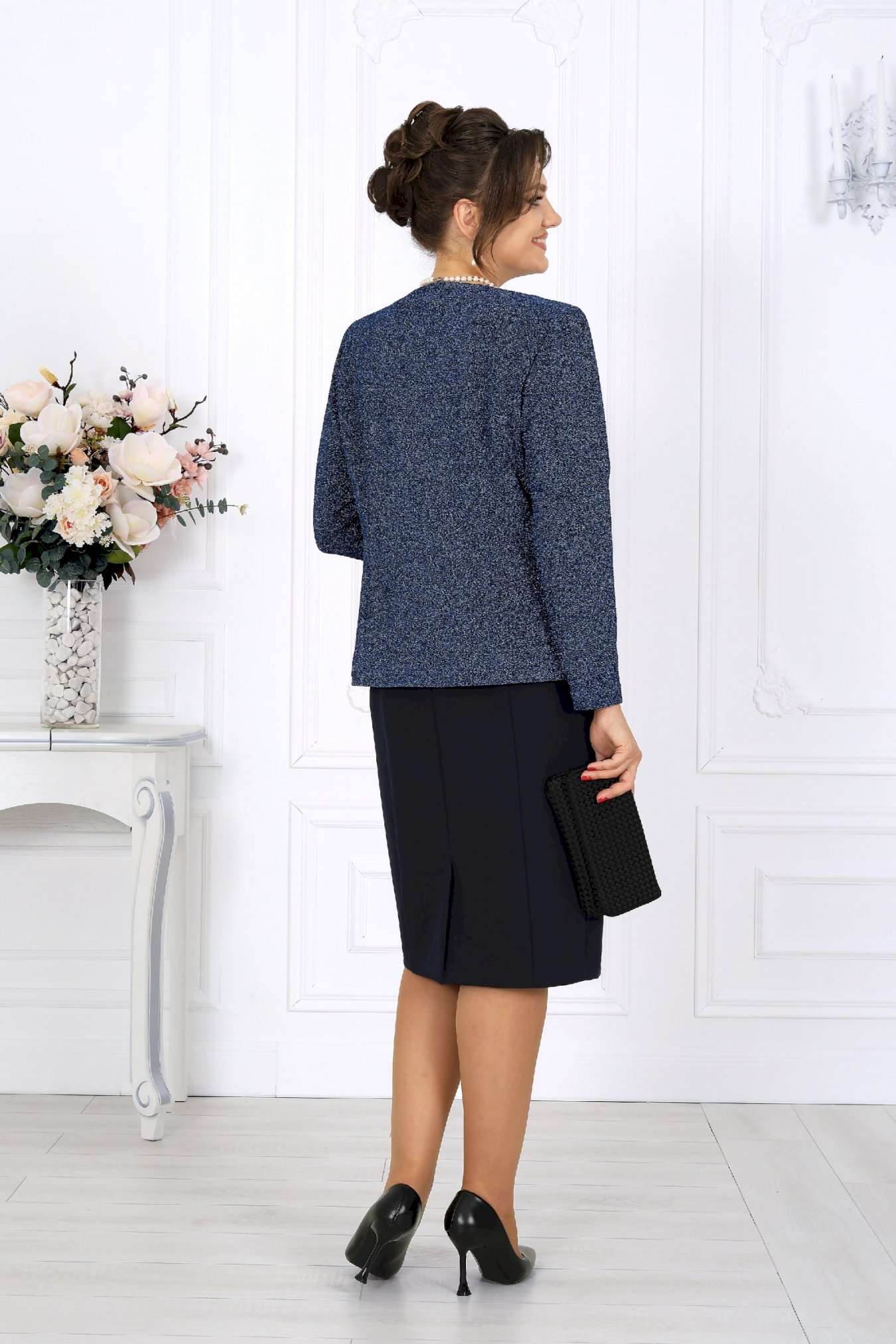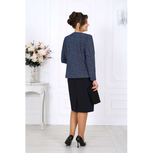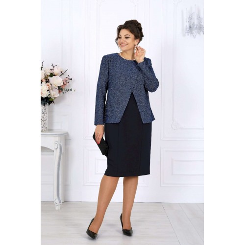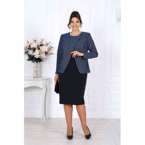 Этот костюм — гармония классики и современности, сдержанная роскошь и продуманная функциональность. Жакет выполнен из трикотажного полотна с благородным мерцанием люрекса - лёгкое свечение ткани придаёт образу торжественность и статусность. Фигурный крой бортов с асимметричной застёжкой визуально вытягивает силуэт, делая талию более выразительной. Подкладка и аккуратные плечевые накладки формируют чёткий, «дорогой» контур, характерный для премиальных моделей. Платье классической длины с утончённой формой выреза придают образу элегантность, а продуманная конструкция со шлицей на спинке гарантирует свободу движений. Этот костюм создан для женщин, которые знают себе цену и выбирают безупречное качество. Он одинаково уместен и в офисе, и на торжестве, и в ресторане — достаточно лишь сменить аксессуары. В нём вы будете чувствовать себя уверенно, женственно и благородно. Комплект женский, 2-х предметный, состоящий из жакета и платья. Жакет полуприлегающего силуэта, выполнен из трикотажного полотна с фактурной лицевой стороной «люрекс». Модель на трикотажной подкладке, с плечевыми накладками. Перед с нагрудными вытачками, направленными от проймы; спинка – с талиевыми. Фигурные борта фиксируются на запах по линии горловины при помощи внутренней застежки на 2 петли и 2 потайные пуговицы и внешней застежки - на 2 петли и 2 декоративные пуговицы, обтянутые основным материалом. Горловина округлой формой, спереди углубленная. Рукав втачной, длинный. Длина жакета – 62 см; длина рукава – 59 см. Платье полуприлегающего силуэта, выполнено из костюмно-плательной ткани. Модель на трикотажной подкладке, с плечевыми накладками. Перед и спинка с рельефными швами, направленными от проймы до низа. В верхней части среднего шва спинки обработана застежка на потайную тесьму-«молнию» (50см); в нижней части шва – шлица. Горловина округлой формы, спереди углубленная. Рукав втачной, короткий. Длина платья – 104 см; длина рукава – 25 см.