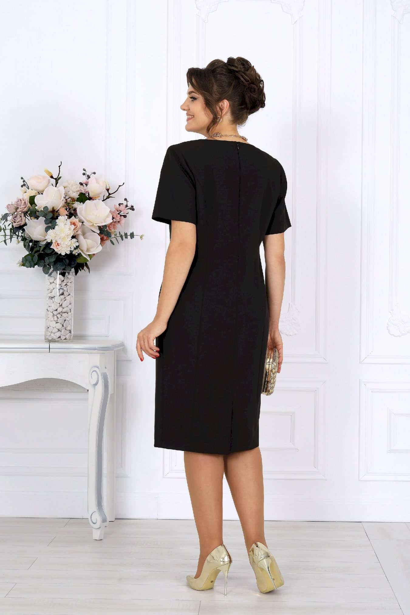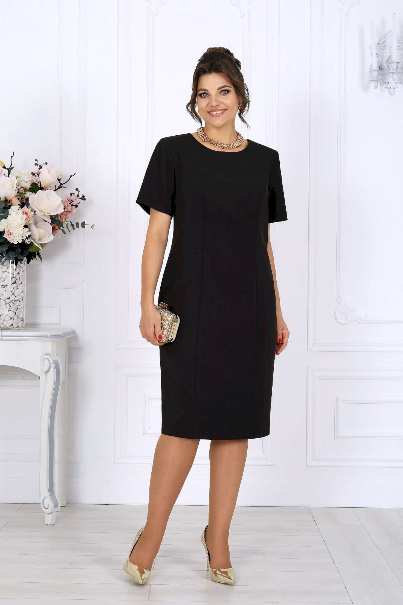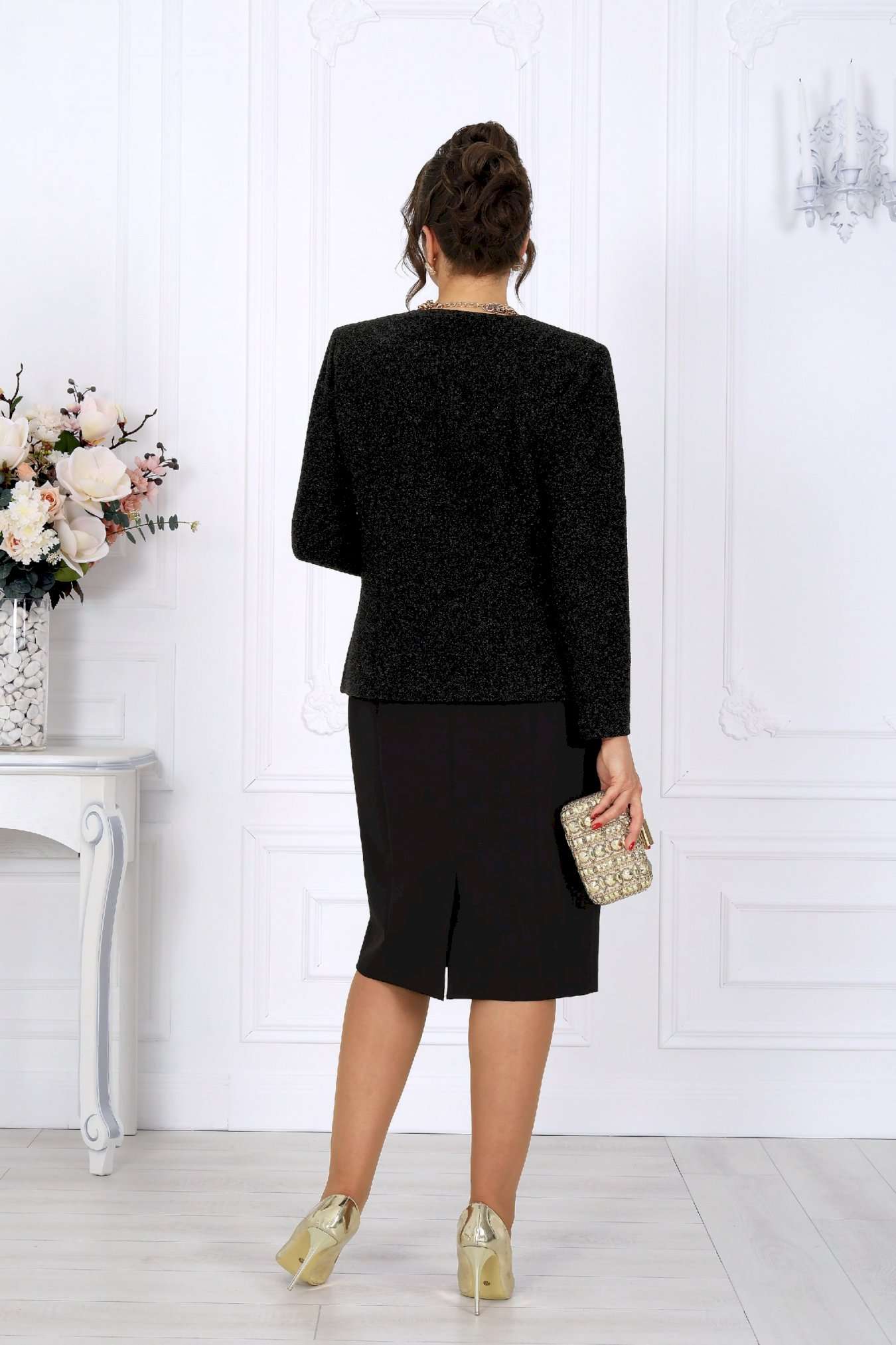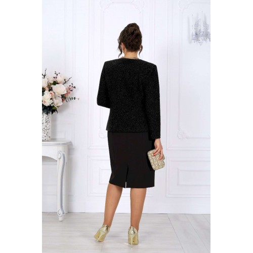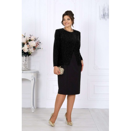 Этот костюм — гармония классики и современности, сдержанная роскошь и продуманная функциональность. Жакет выполнен из трикотажного полотна с благородным мерцанием люрекса - лёгкое свечение ткани придаёт образу торжественность и статусность. Фигурный крой бортов с асимметричной застёжкой визуально вытягивает силуэт, делая талию более выразительной. Подкладка и аккуратные плечевые накладки формируют чёткий, «дорогой» контур, характерный для премиальных моделей. Платье классической длины с утончённой формой выреза придают образу элегантность, а продуманная конструкция со шлицей на спинке гарантирует свободу движений. Этот костюм создан для женщин, которые знают себе цену и выбирают безупречное качество. Он одинаково уместен и в офисе, и на торжестве, и в ресторане — достаточно лишь сменить аксессуары. В нём вы будете чувствовать себя уверенно, женственно и благородно. Комплект женский, 2-х предметный, состоящий из жакета и платья. Жакет полуприлегающего силуэта, выполнен из трикотажного полотна с фактурной лицевой стороной «люрекс». Модель на трикотажной подкладке, с плечевыми накладками. Перед с нагрудными вытачками, направленными от проймы; спинка – с талиевыми. Фигурные борта фиксируются на запах по линии горловины при помощи внутренней застежки на 2 петли и 2 потайные пуговицы и внешней застежки - на 2 петли и 2 декоративные пуговицы, обтянутые основным материалом. Горловина округлой формой, спереди углубленная. Рукав втачной, длинный. Длина жакета – 62 см; длина рукава – 59 см. Платье полуприлегающего силуэта, выполнено из костюмно-плательной ткани. Модель на трикотажной подкладке, с плечевыми накладками. Перед и спинка с рельефными швами, направленными от проймы до низа. В верхней части среднего шва спинки обработана застежка на потайную тесьму-«молнию» (50см); в нижней части шва – шлица. Горловина округлой формы, спереди углубленная. Рукав втачной, короткий. Длина платья – 104 см; длина рукава – 25 см.