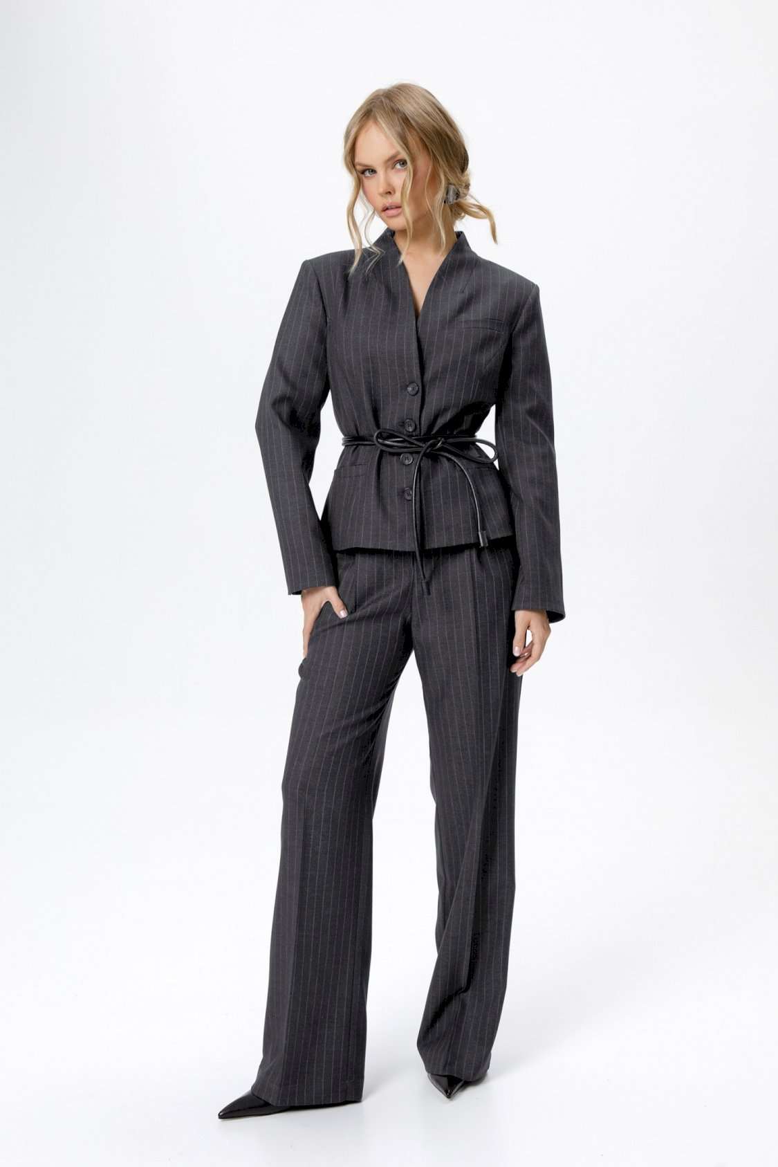 Приталенный жакет со съемным шарфиком. Детали: жакет полуприлегающего силуэта, цельнокроеный воротник-стойка, рельефные швы переда и спинки, функциональные карманы, застежка на петли и пуговицы, на подкладке. В комплекте съемный шарфик. Длина жакета по спинке около 56 см в размерах 40-46 и около 58,5 см в размерах 48-52, длина рукава около 62,5 см.