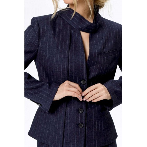 Приталенный жакет со съемным шарфиком. Детали: жакет полуприлегающего силуэта, цельнокроеный воротник-стойка, рельефные швы переда и спинки, функциональные карманы, застежка на петли и пуговицы, на подкладке. В комплекте съемный шарфик. Длина жакета по спинке около 56 см в размерах 40-46 и около 58,5 см в размерах 48-52, длина рукава около 62,5 см.