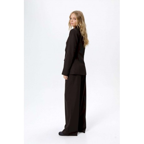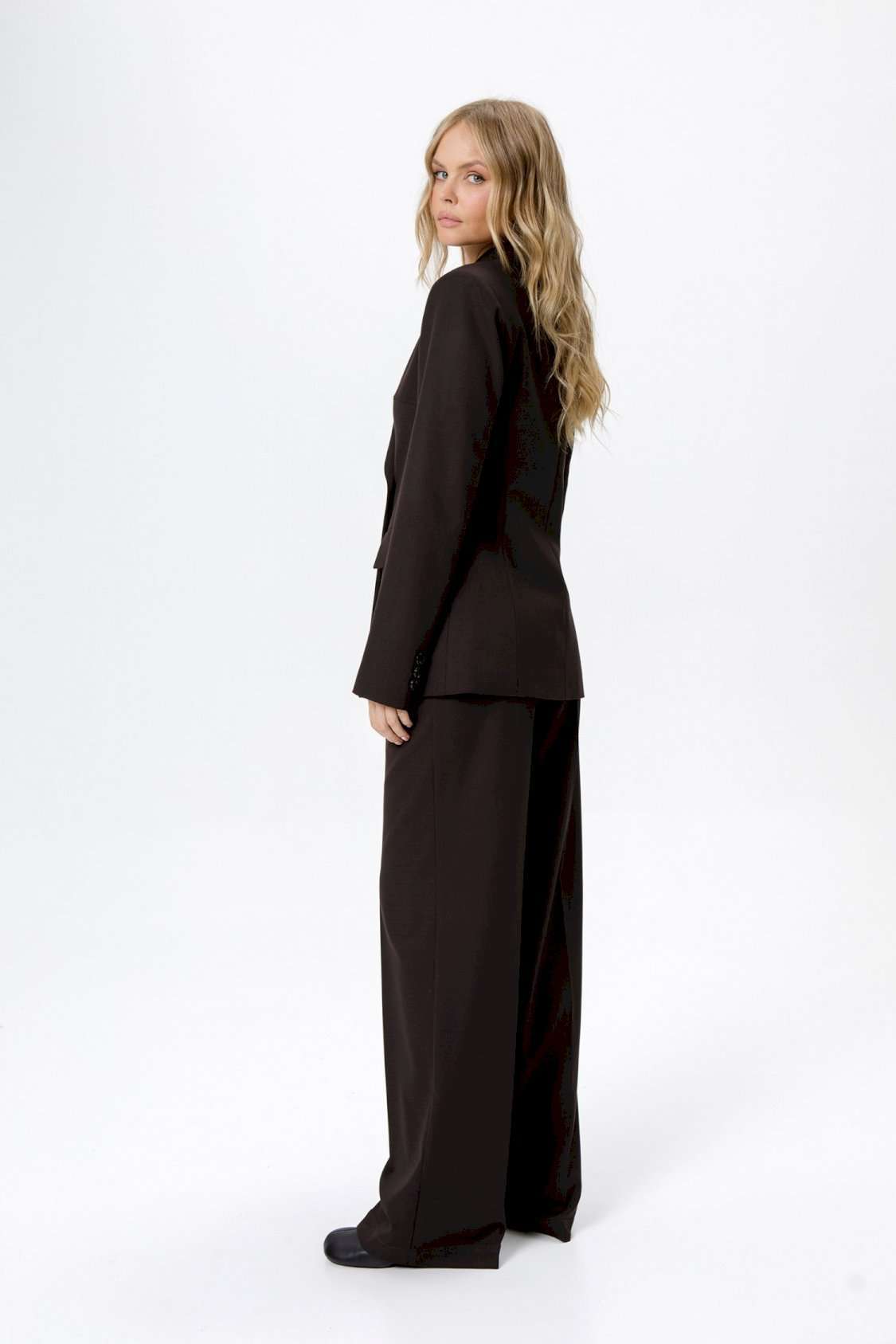 Классический приталенный жакет. Детали: приталенный силуэт, пиджачный воротник, функциональные карманы, двубортная застежка на петли и пуговицы, спинка со средним швом, втачные двухшовные рукава, жакет на подкладке. Длина по спинке около 68 см в размерах 40-46 и около 71 см в размерах 48-52, длина рукавов около 62 см. Длина рукава около 61 см