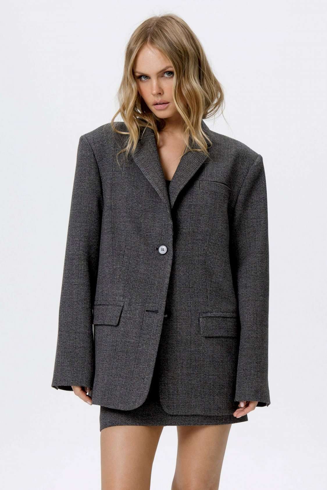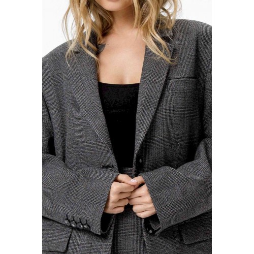 Костюм-двойка из оверсайз жакета и мини-юбки из текстильной ткани в клетку. Детали: жакет прямого силуэта, расширенная линия плеч, пиджачный воротник, перед с функциональными карманами, однобортная застежка на петли и пуговицы, спинка со средним швом и шлицей, рукава втачные двухшовные, жакет на подкладке. Юбка на притачном поясе, застежка сзади на потайную молнию, юбка на подкладке. Длина жакета по спинке около 71 см в размерах 40-46 и около 72 см в размерах 48-52, длина рукавов около 62 см. Длина юбки по боковому шву с поясом около 46 см в размерах 40-46 и около 49 см в размерах 48-52 см