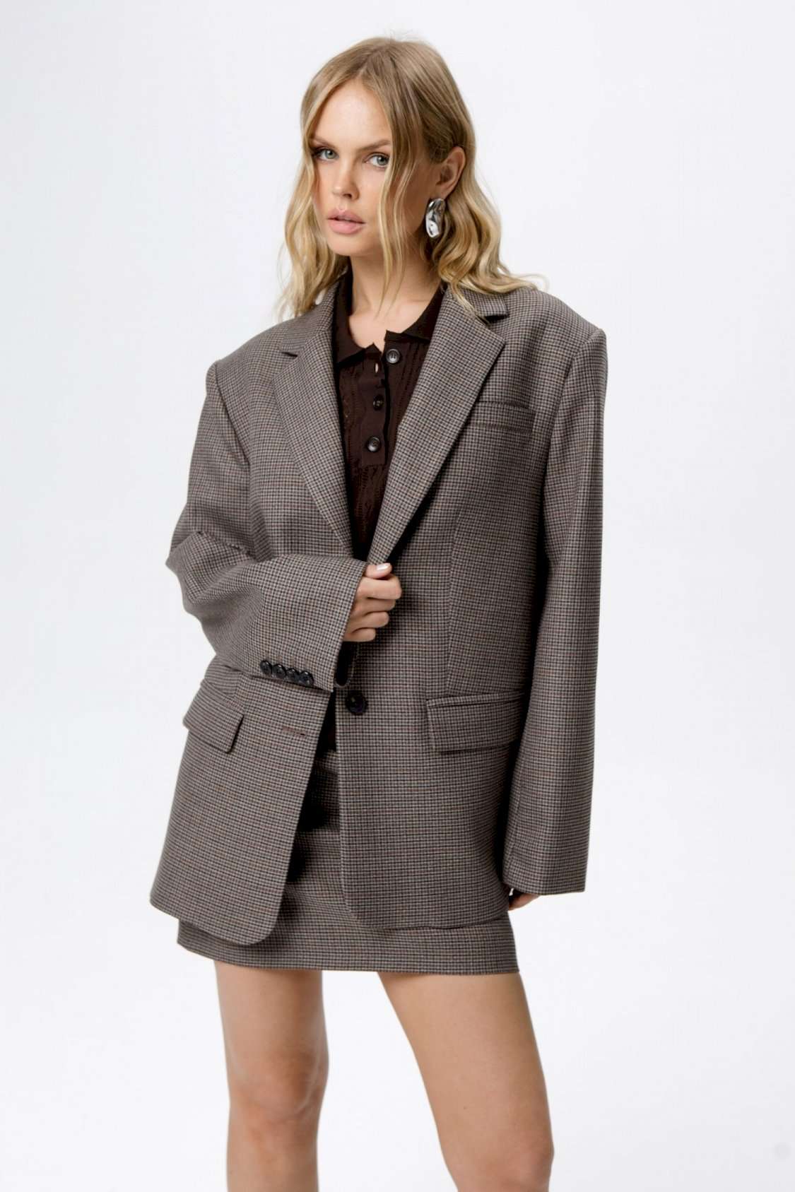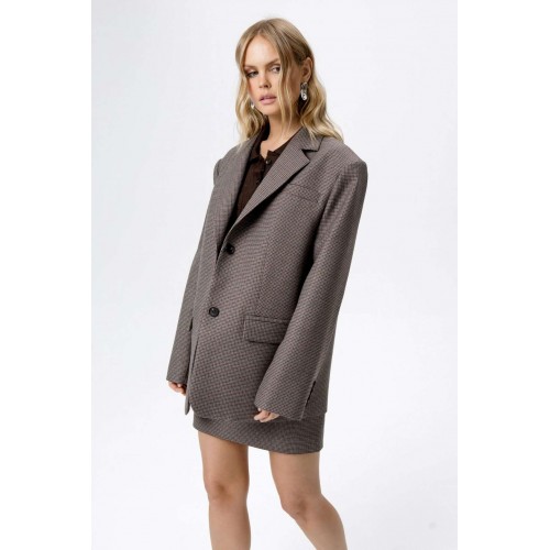Оверсайз жакет в клетку. Детали: жакет прямого силуэта, расширенная линия плеч, пиджачный воротник, перед с функциональными карманами, однобортная застежка на петли и пуговицы, спинка со средним швом и шлицей, рукава втачные двухшовные, жакет на подкладке. Длина по спинке около 71 см в размерах 40-46 и около 72 см в размерах 48-52. Длина рукавов около 62 см.