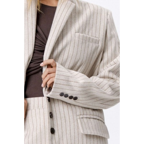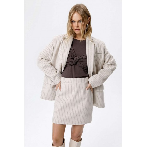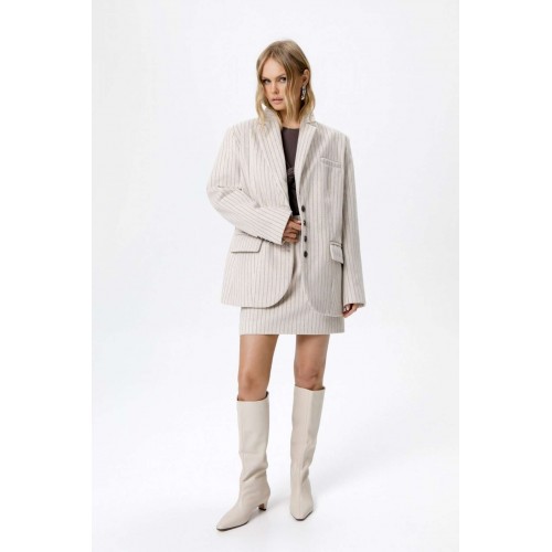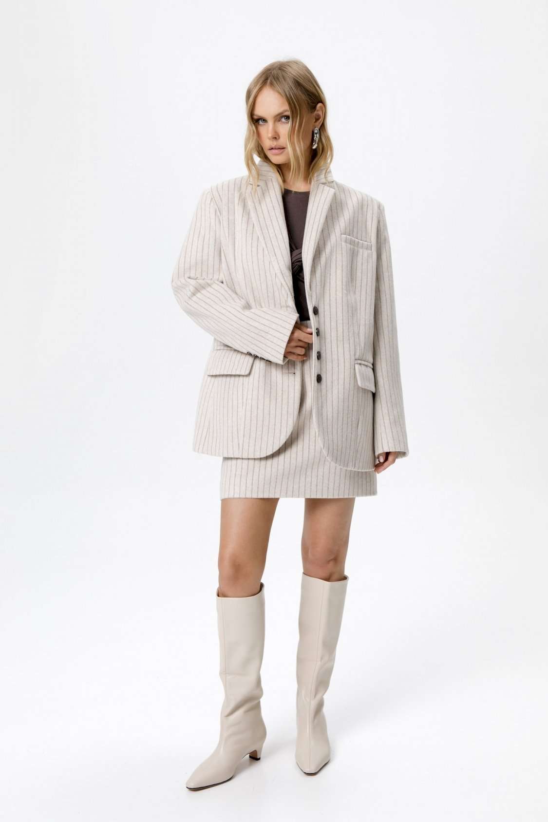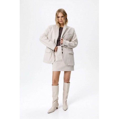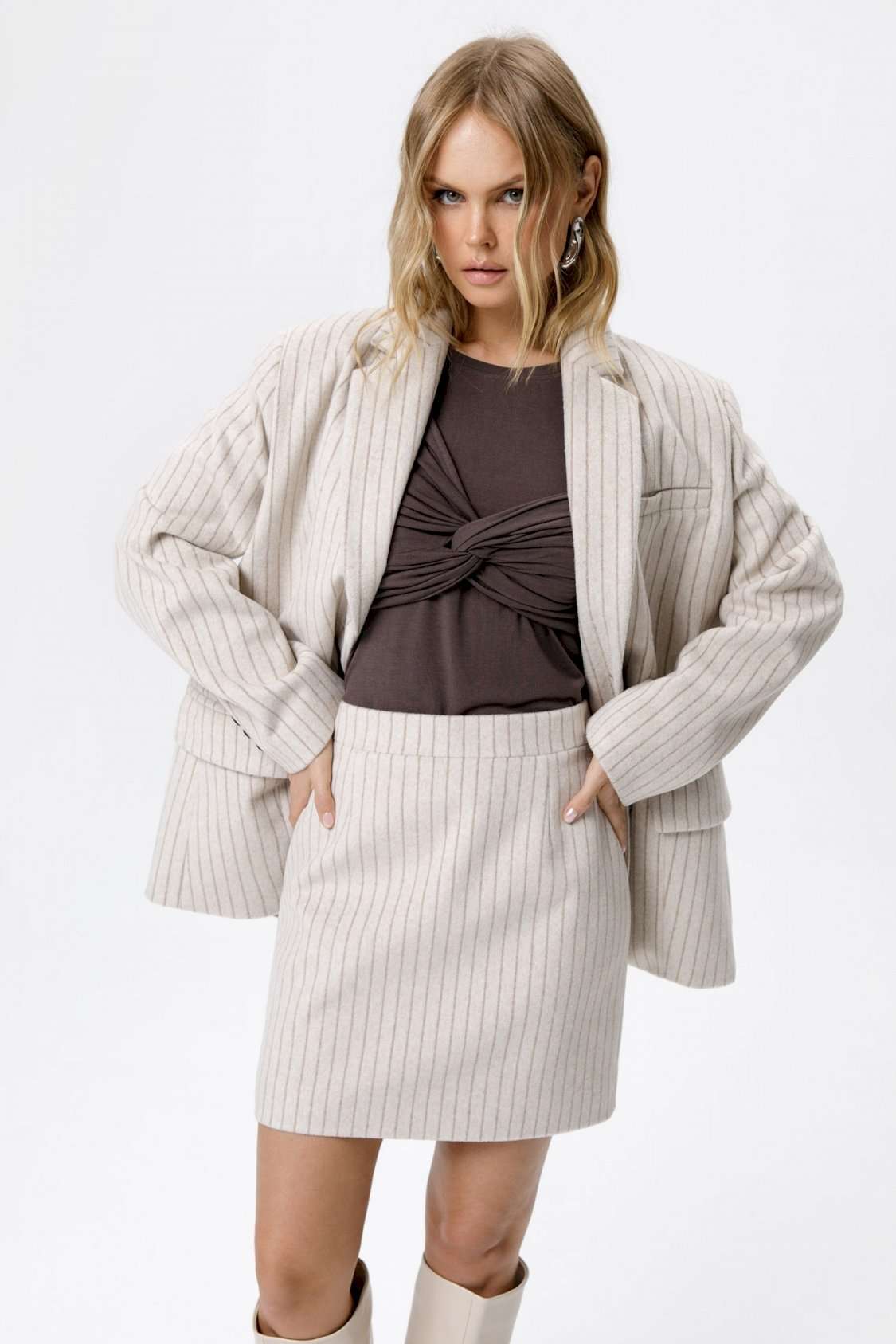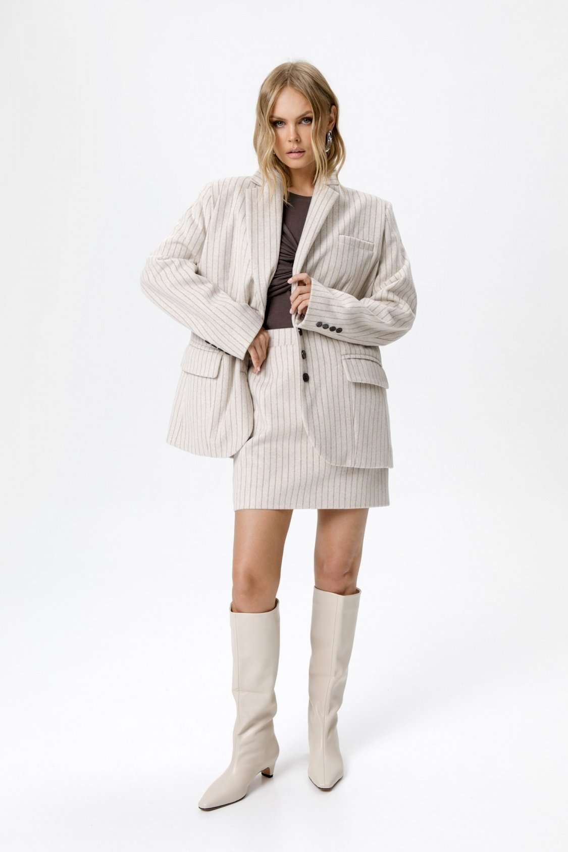 Костюм-двойка из оверсайз жакета и мини-юбки в полоску. Детали: жакет прямого силуэта, расширенная линия плеч, пиджачный воротник, перед с функциональными карманами, однобортная застежка на петли и пуговицы, спинка со средним швом и шлицей, рукава втачные двухшовные, жакет на подкладке. Юбка на притачном поясе, застежка сзади на потайную молнию, юбка на подкладке. Длина жакета по спинке около 69 см в размерах 40-46 и около 72 см в размерах 48-52. Длина рукавов около 62 см. Длина юбки по боковому шву с поясом около 46 см в размерах 40-46 и около 49 см в размерах 48-52 см.