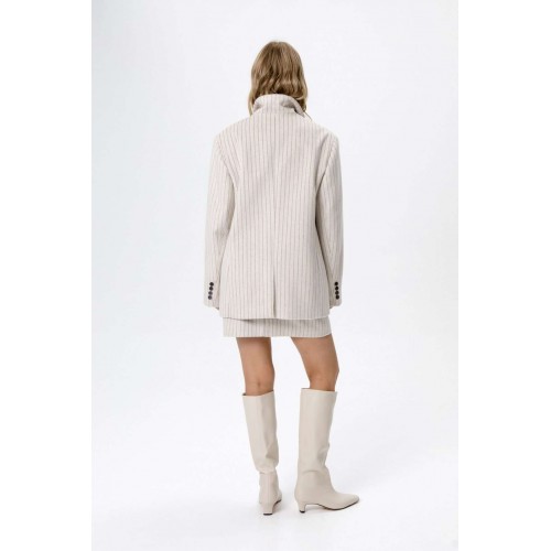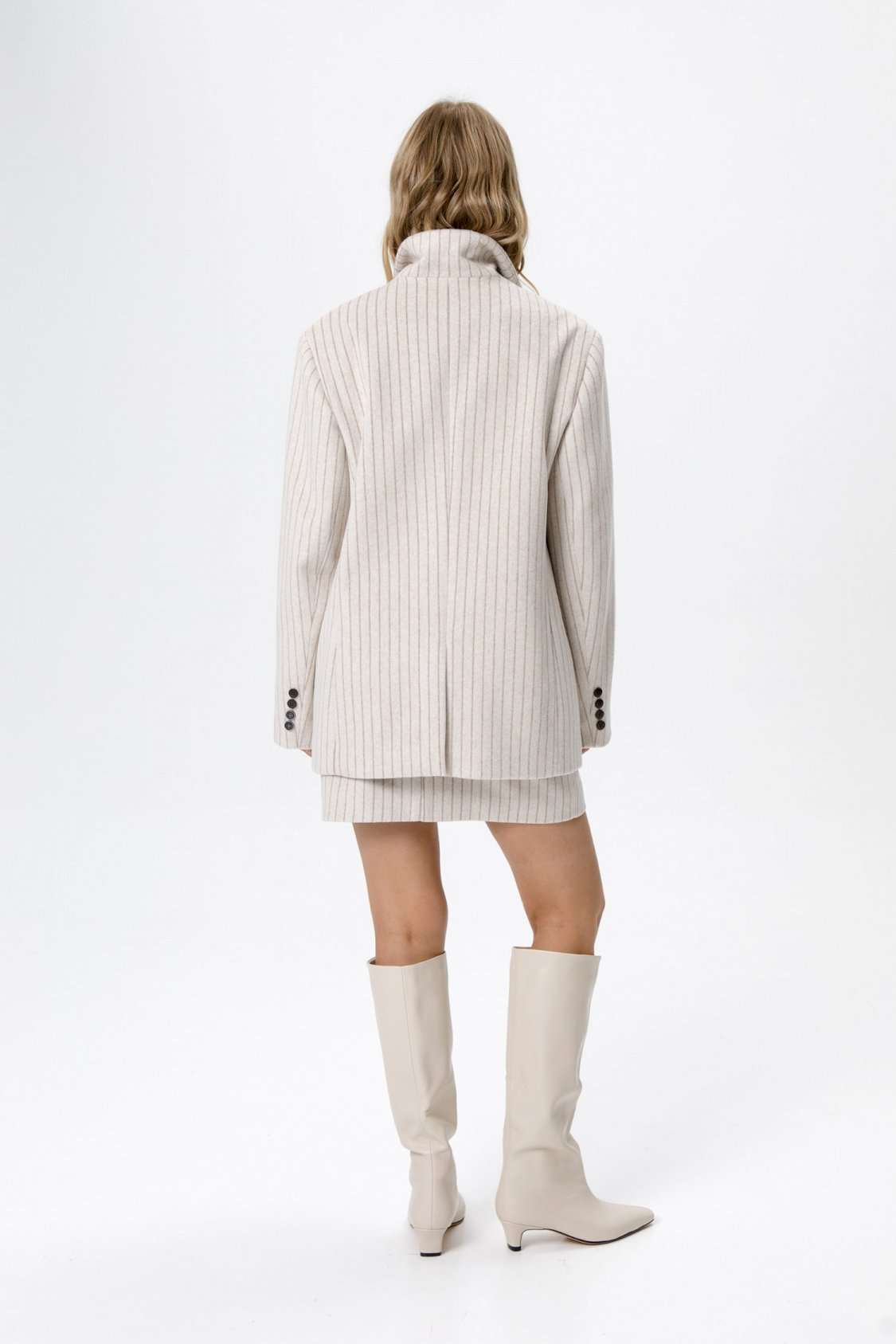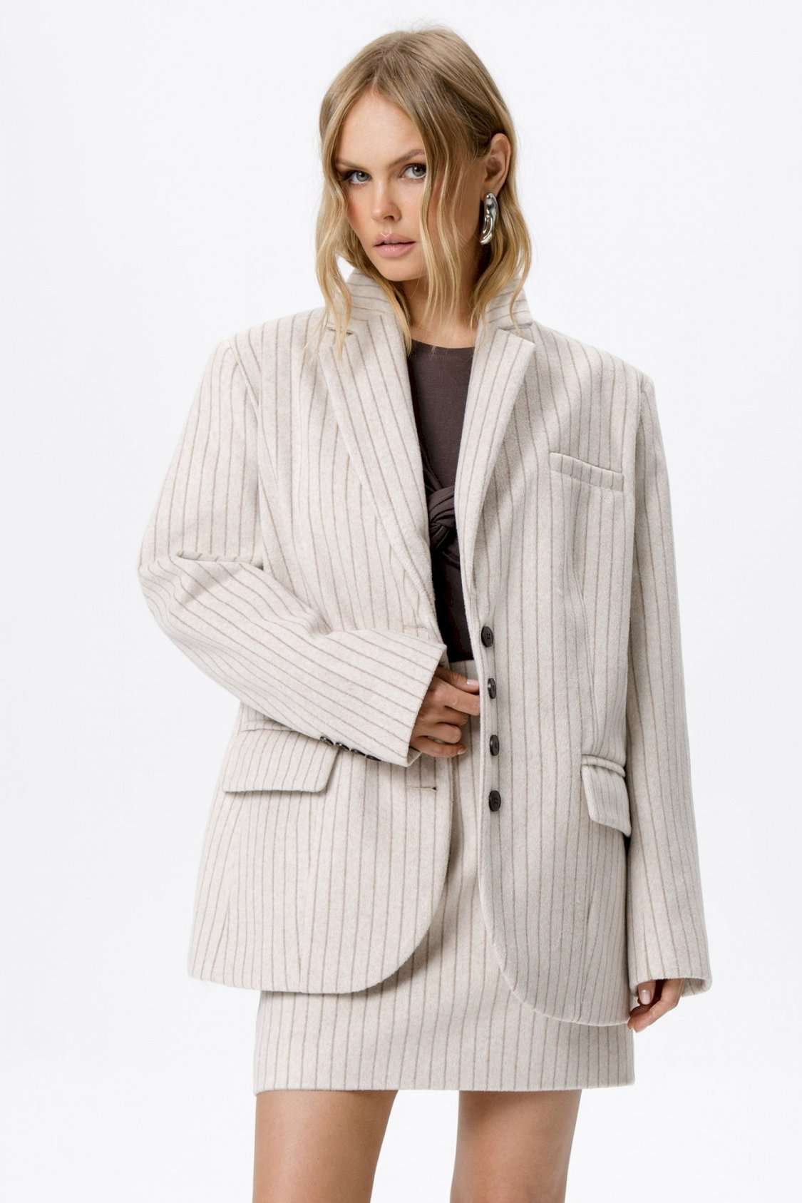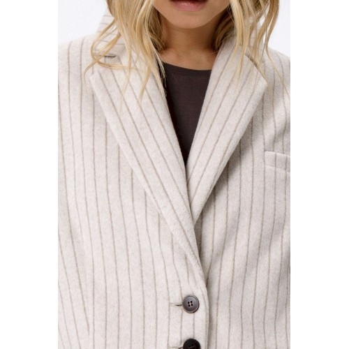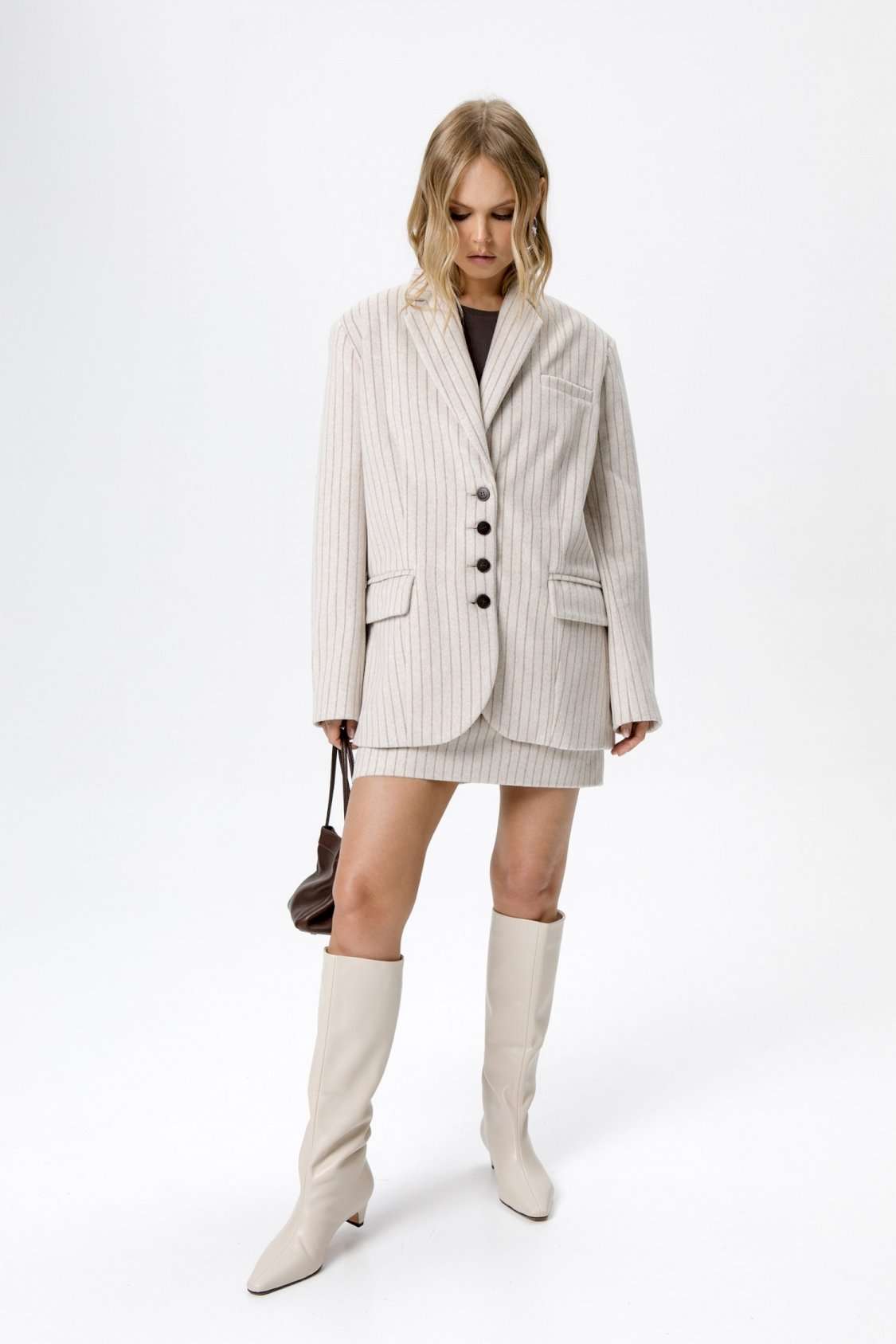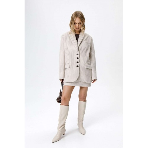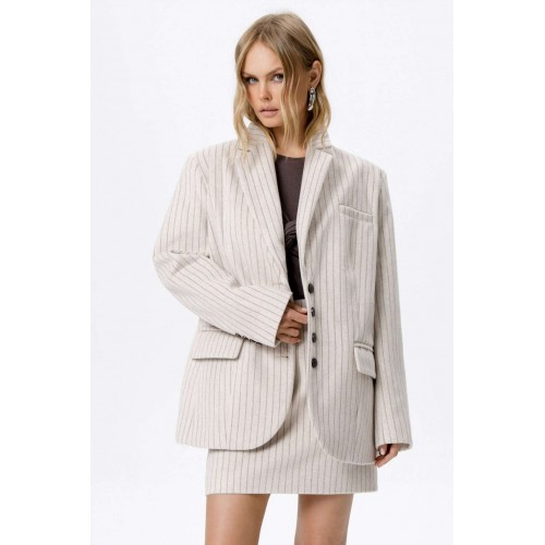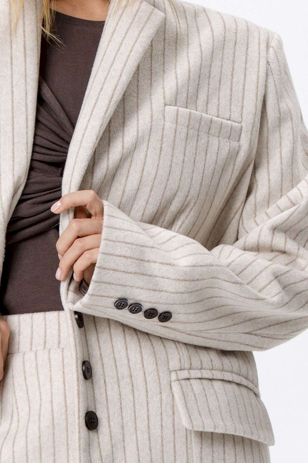 Оверсайз жакет в полоску. Детали: прямой силуэт, расширенная линия плеч, пиджачный воротник, перед с функциональными карманами, однобортная застежка на петли и пуговицы, спинка со средним швом и шлицей, рукава втачные двухшовные, жакет на подкладке. Длина по спинке около 69 см в размерах 40-46 и около 72 см в размерах 48-52. Длина рукавов около 62 см.