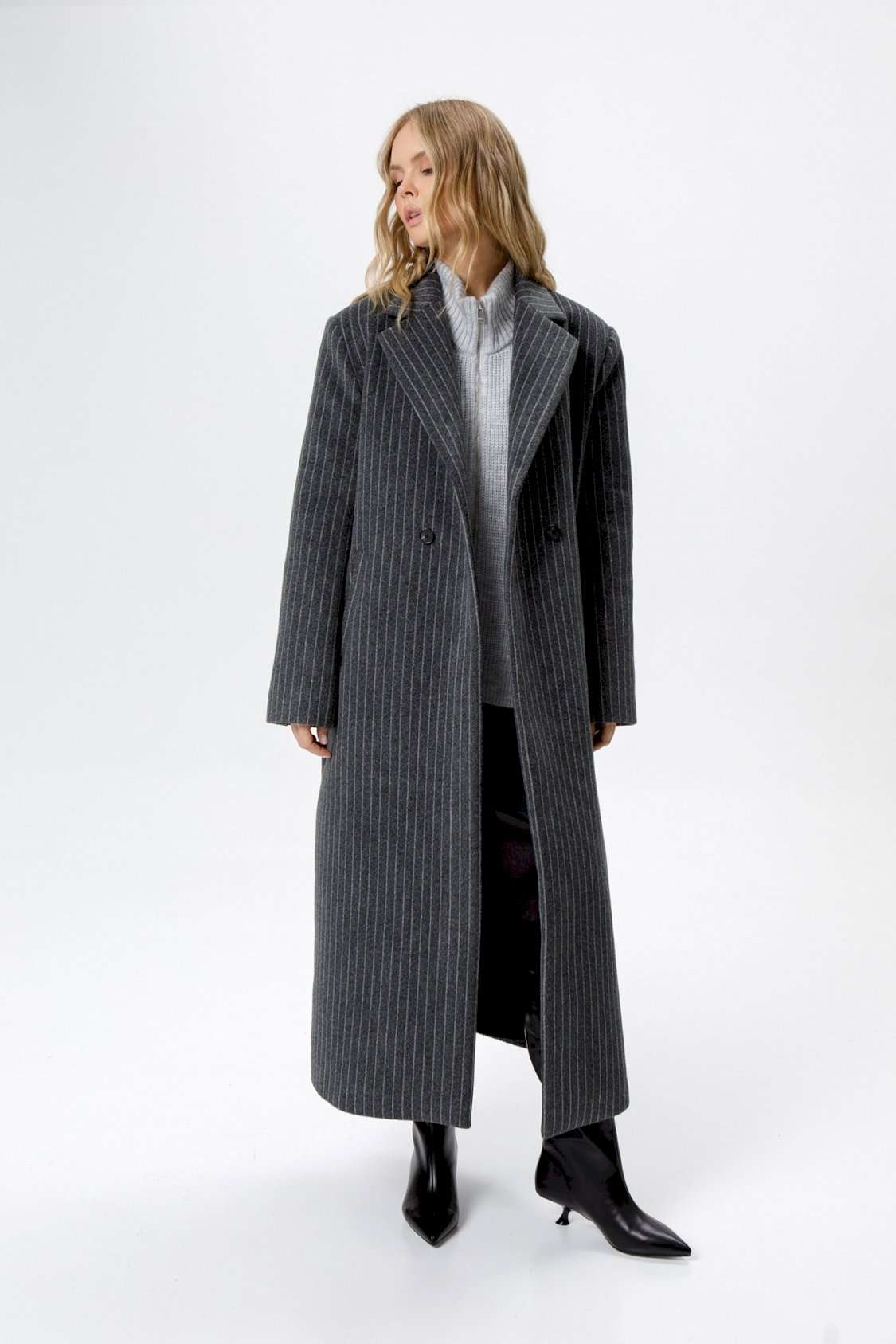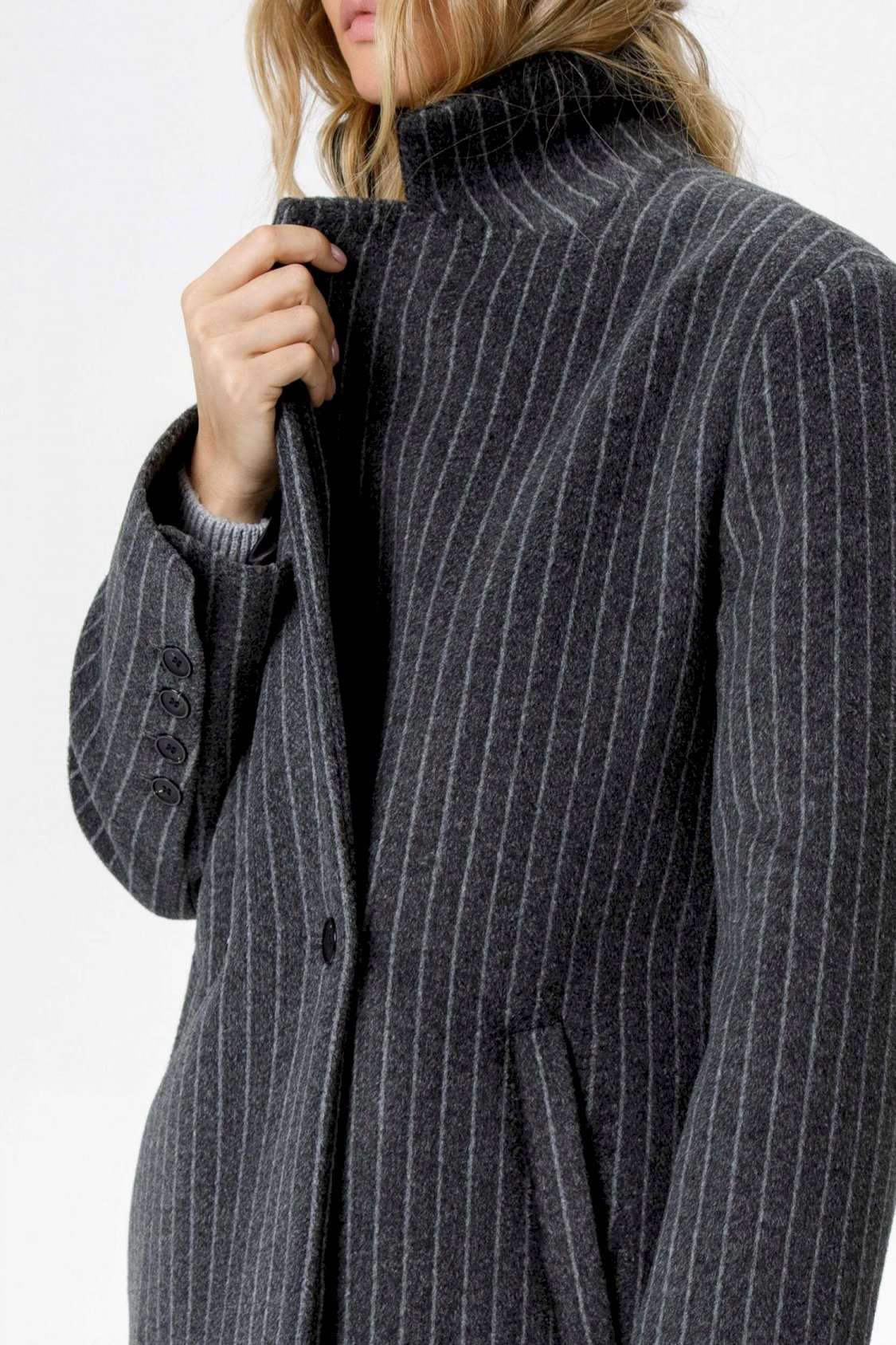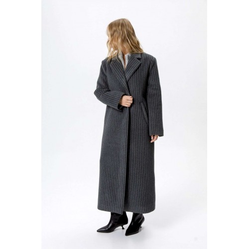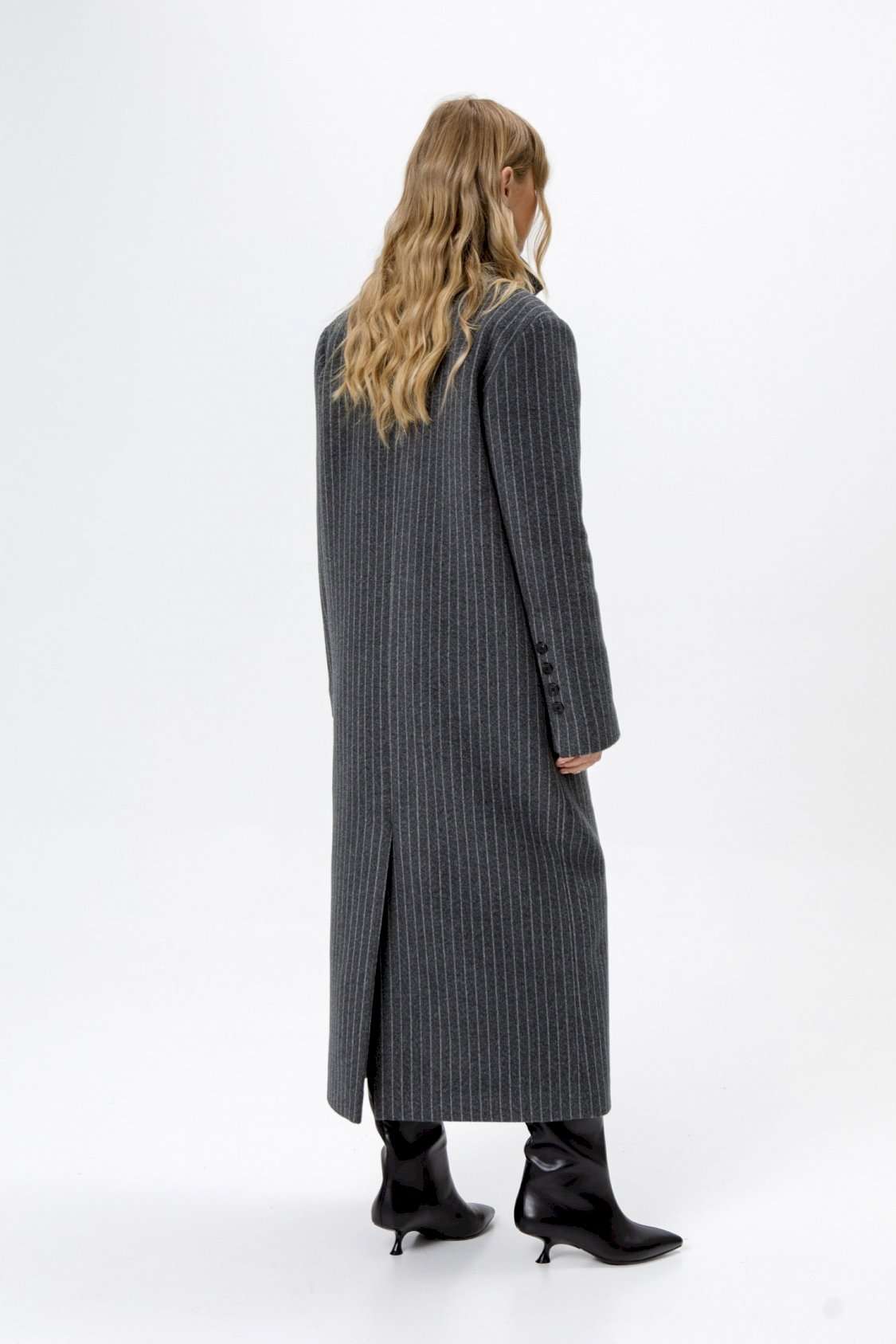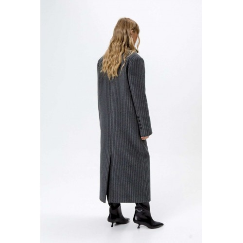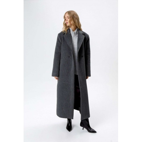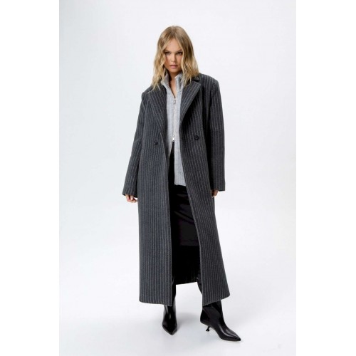 Пальто свободного силуэта из ткани в полоску. Детали: прямой силуэт, свободный покрой, расширенная линия плеч, пиджачный воротник, двубортная застежка на петли и пуговицы, рукава втачные со шлицей, функциональные карманы, спинка со средним швом и высокой шлицей, пальто на подкладке. Длина по спинке около 124,5 см. Длина рукава около 61 см.