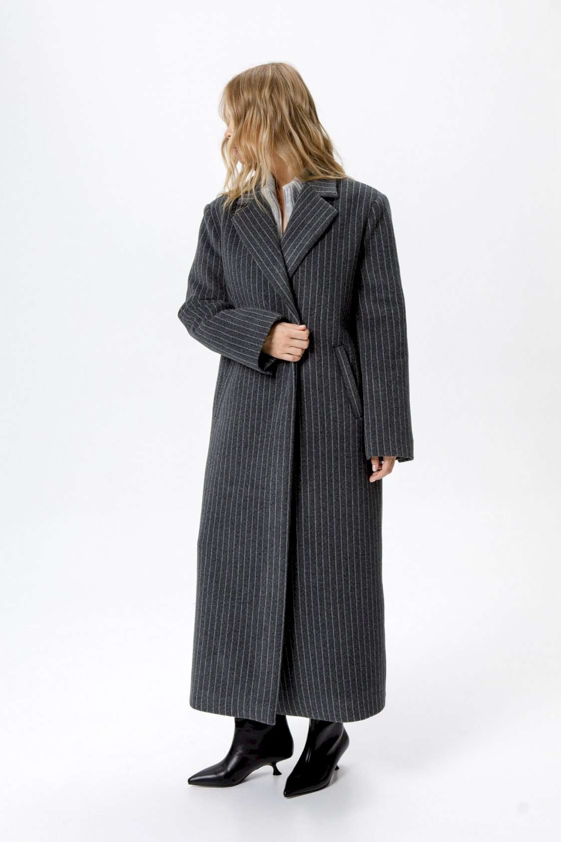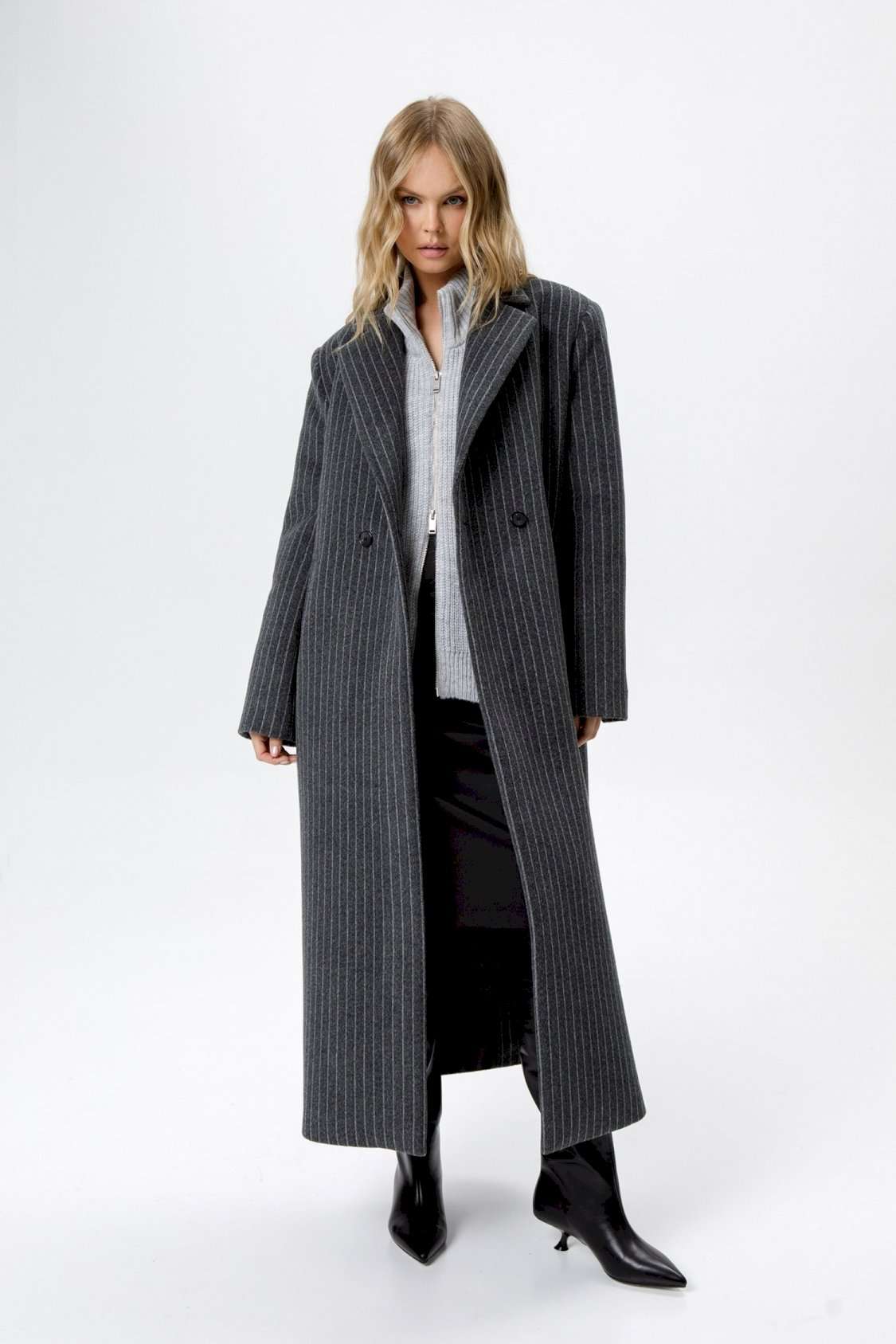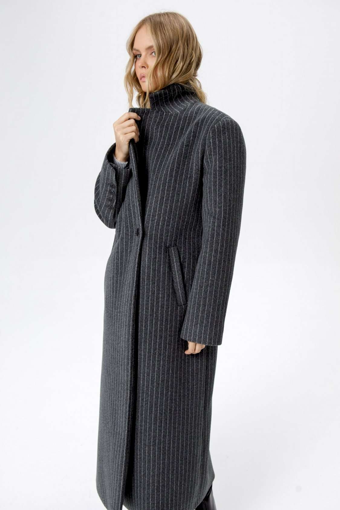 Пальто свободного силуэта из ткани в полоску. Детали: прямой силуэт, свободный покрой, расширенная линия плеч, пиджачный воротник, двубортная застежка на петли и пуговицы, рукава втачные со шлицей, функциональные карманы, спинка со средним швом и высокой шлицей, пальто на подкладке. Длина по спинке около 124,5 см. Длина рукава около 61 см.