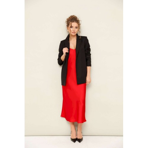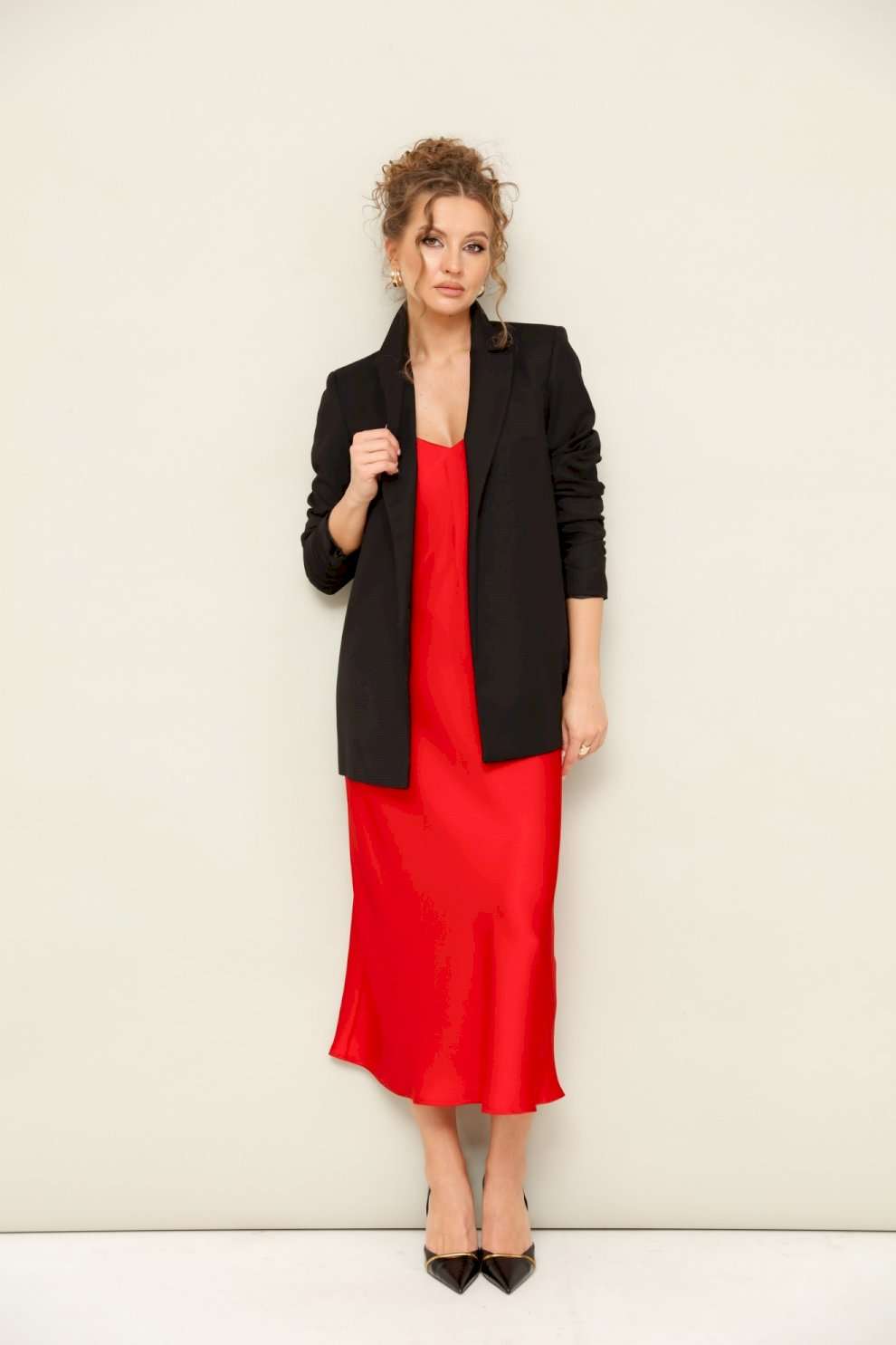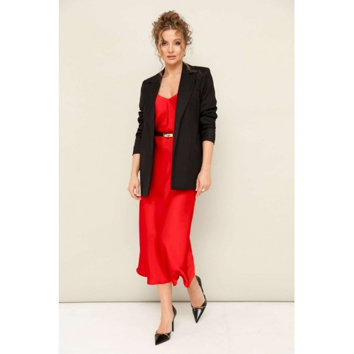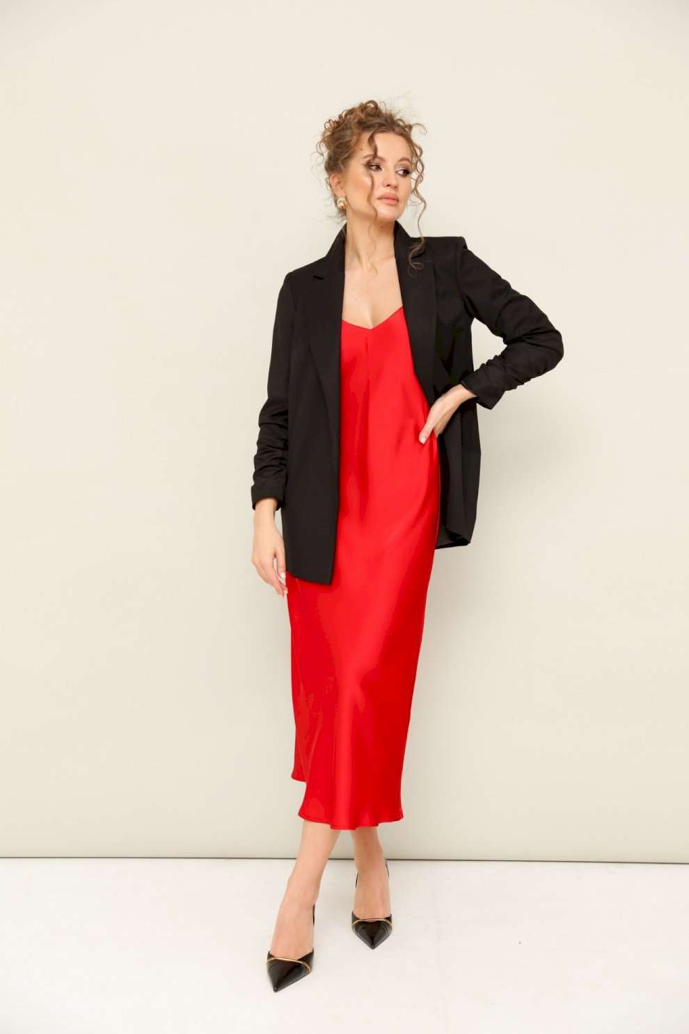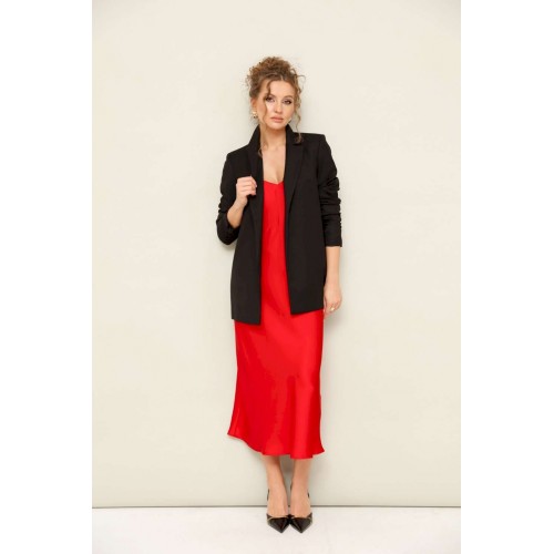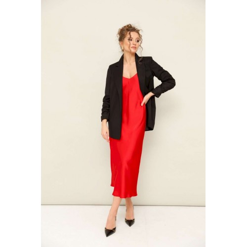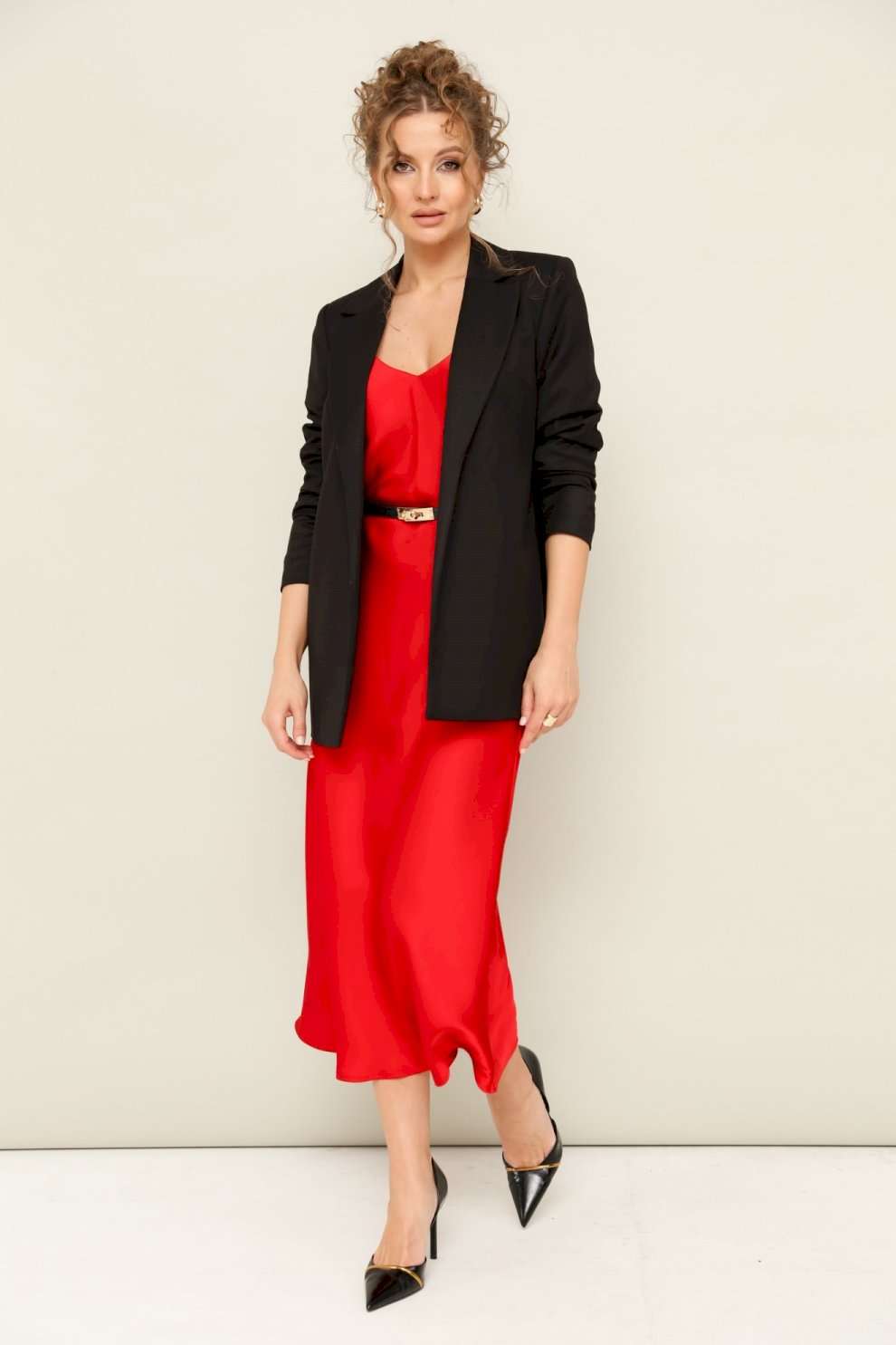 Комплект состоящий из жакета и платья. Платье-комбинация полуприлегающего силуэта, на регулируемых бретелях. Жакет прямого кроя. Ременьв комплекте.