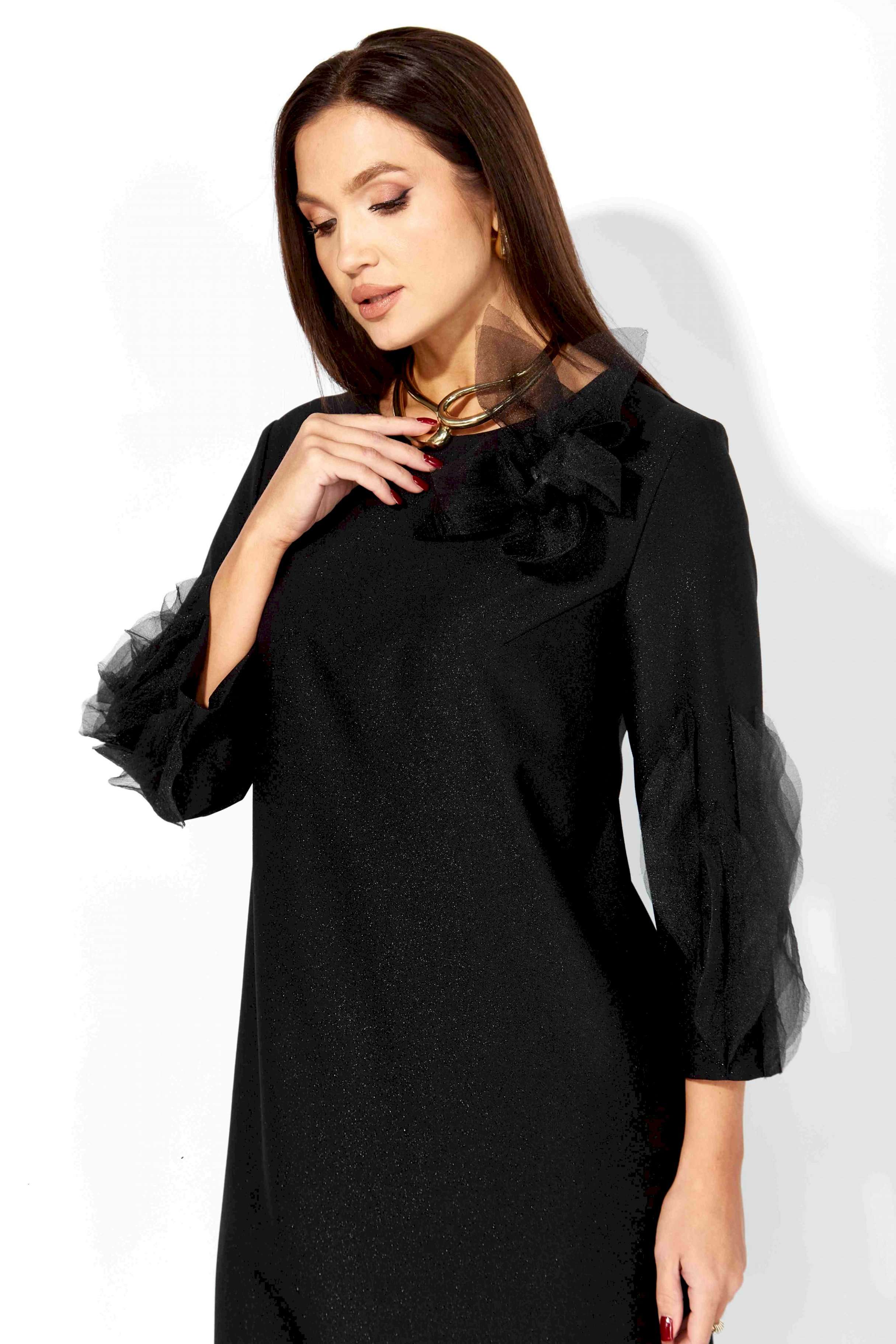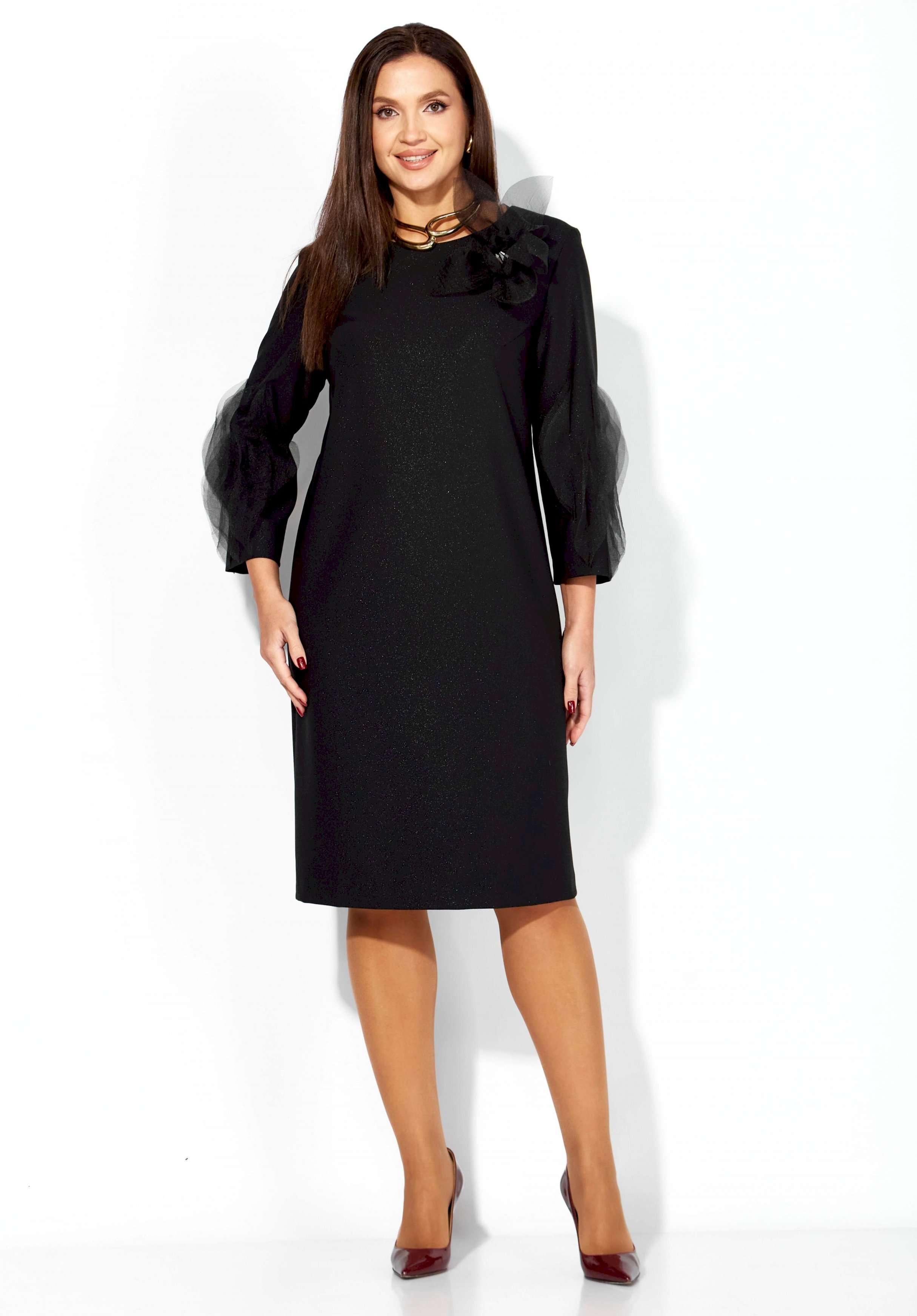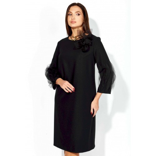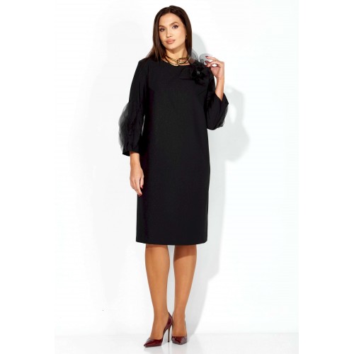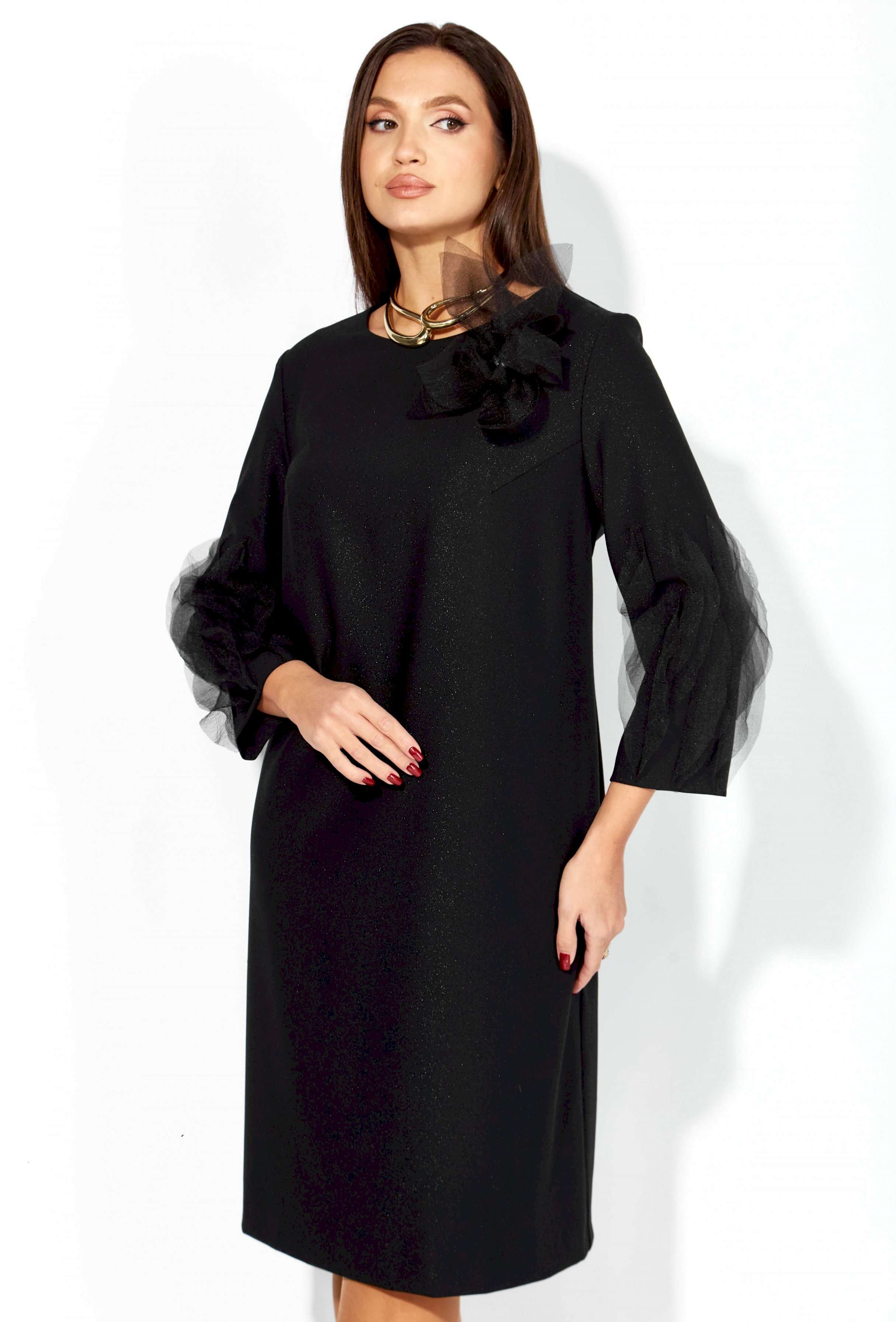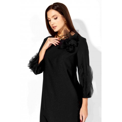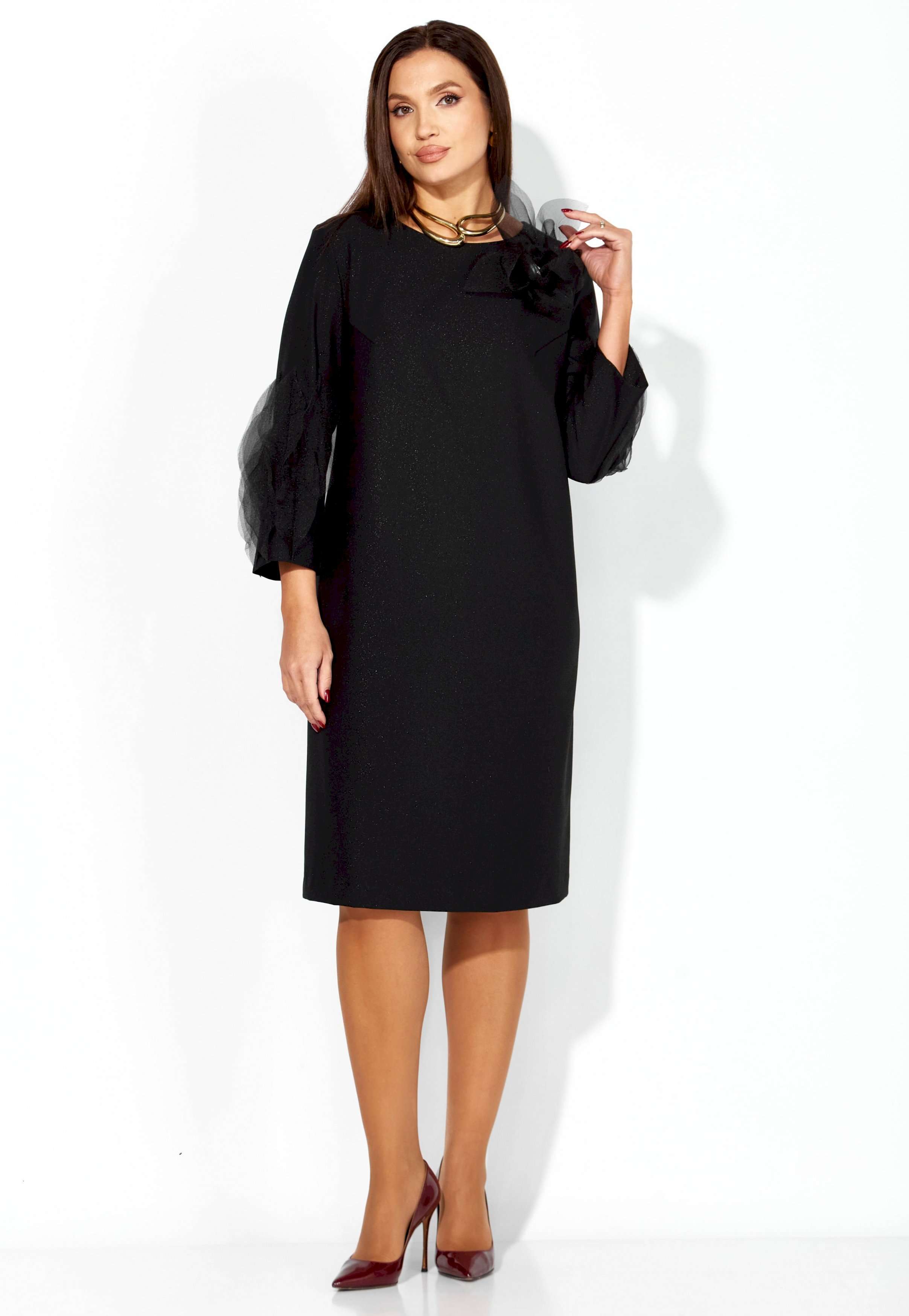 Платье женское, прямого силуэта, выполнено из ткани поливискоза \"SHANE\" со стрейчем. Рукав втачной , длинной 7/8. Нижняя часть рукава задекорирована фантазийными элементами из огранзы. По переду нагрудные вытачки из пройм. Вырез горловины круглой формы. По спинке средний шов и застежка на потайную тесьму \"молния\" Украшение, в виде крупного цветка из органзы, съемное.