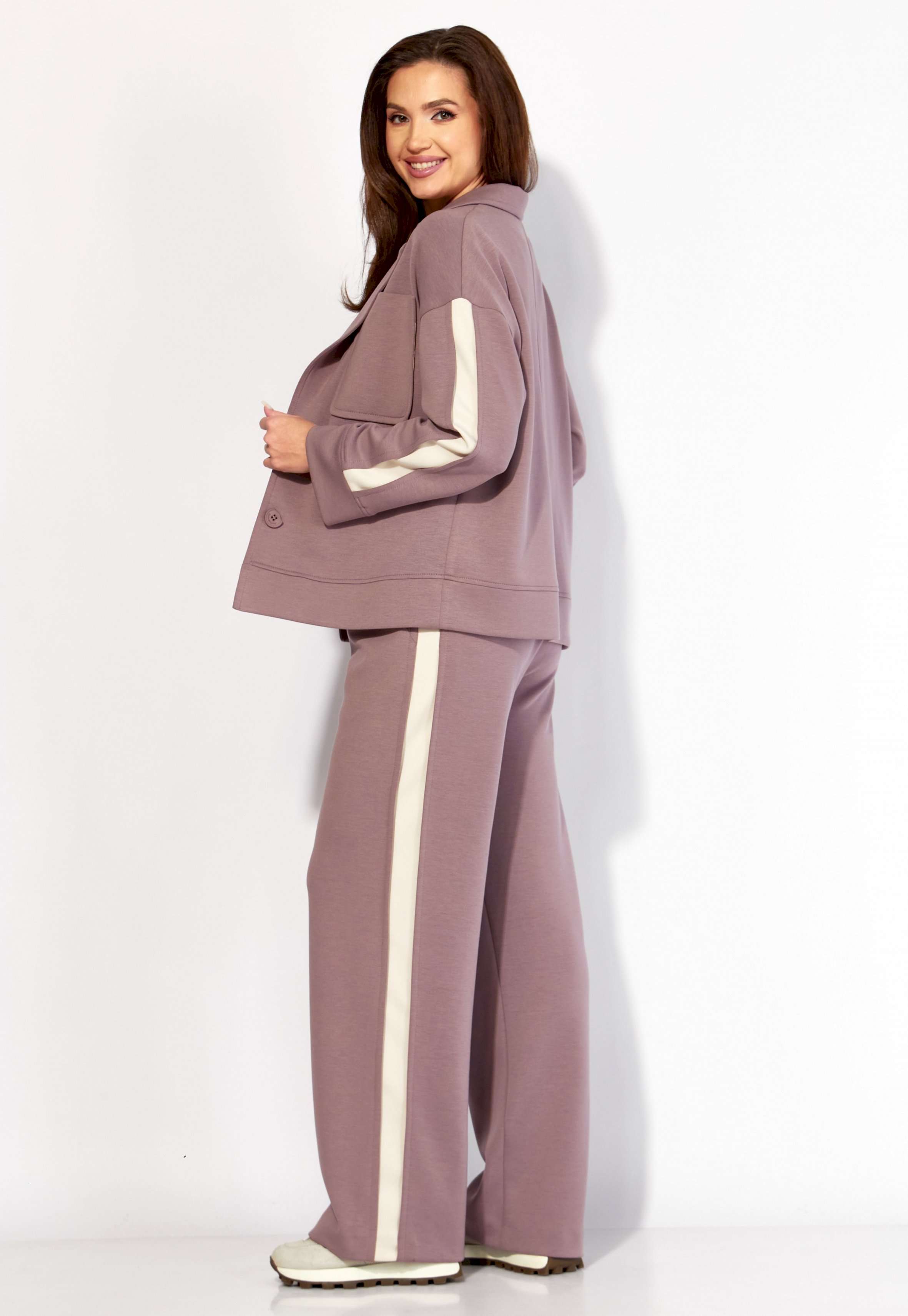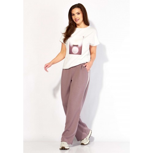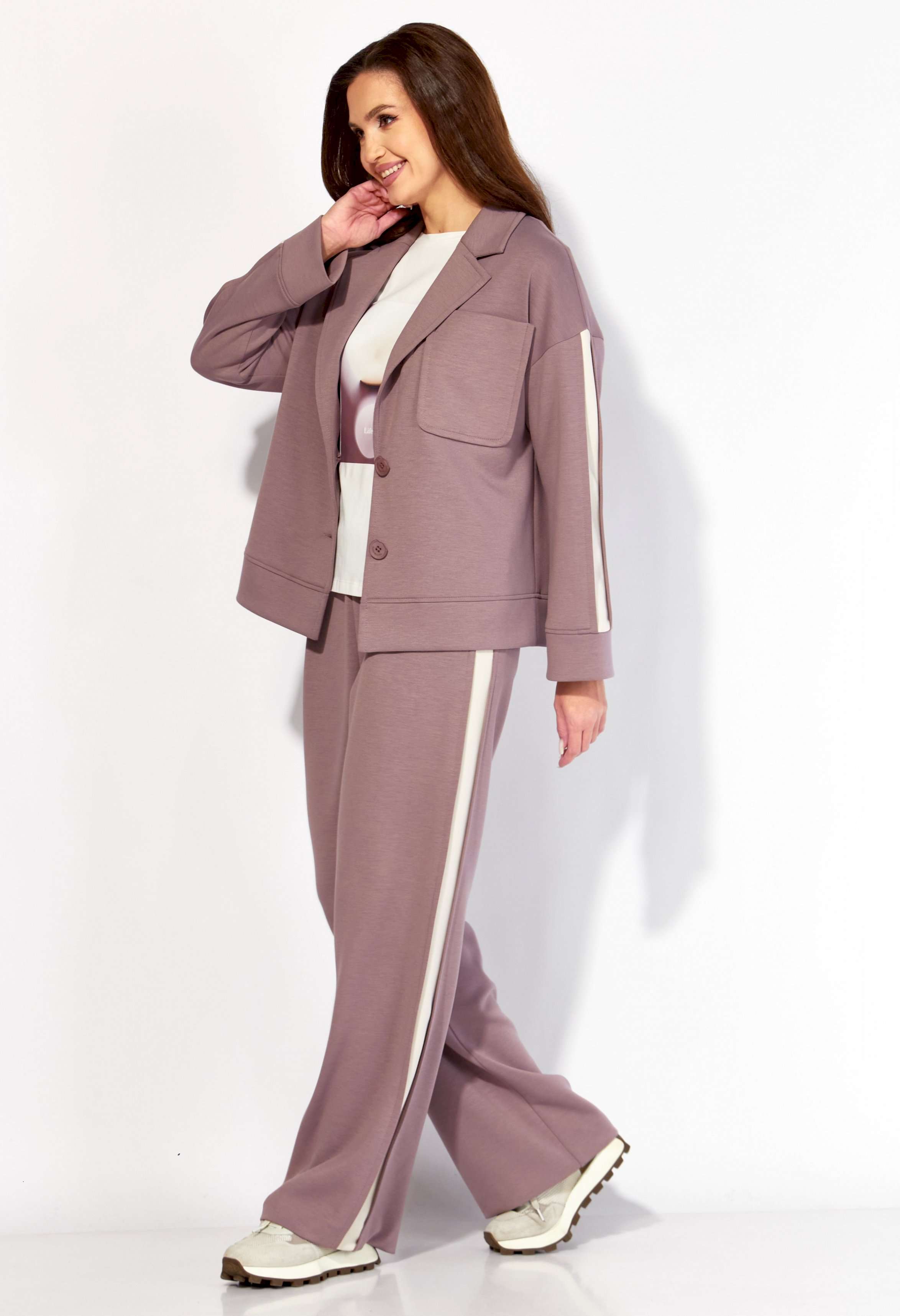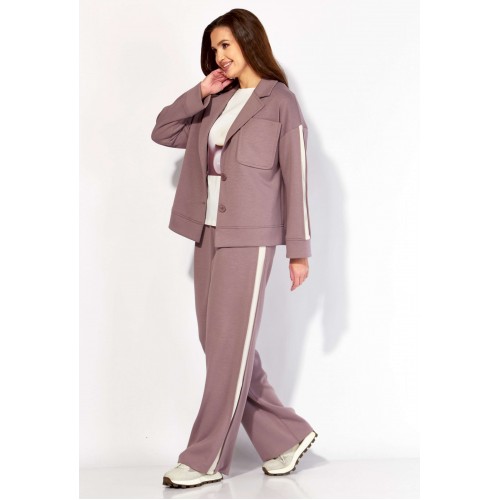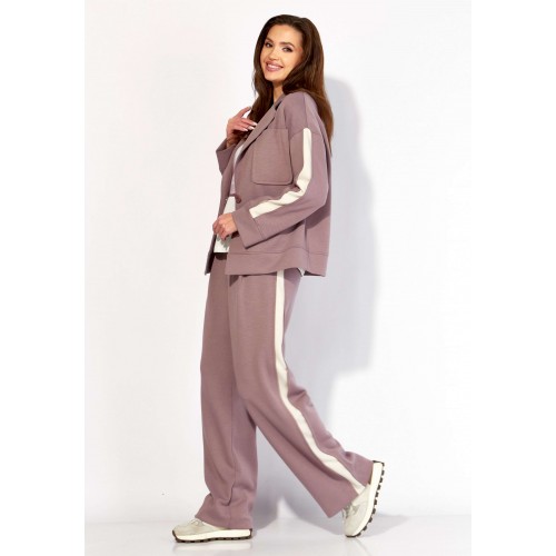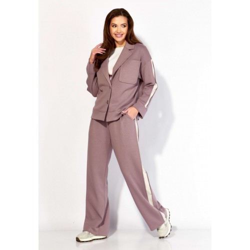 Комплект женский, 3х предметный, состоящий из жакета, топа и брюк. Жакет и брюки выполнены из трикотажного полотна \"TENSEL\", топ-хлопковый трикотаж (кулирка). Жакет прямого силуэта с длинным рукавом. Рукав со спущенной линией плеча, по низу манжета. По рукаву отделочный лампас со складками. Воротник отложной с лацканами. Застежка центральная на петли и пуговицы. На левой полочке накладной карман. По низу жакета отрезная планка. Спинка со средним швом. Брюки прямые, с наклонными карманами спереди и мягкими складками. По боку отделочный лампас со складками. Пояс притачной, с резинкой и гладкой центральной частью. Топ прямого силуэта, с коротким цельнокройным рукавом. Горловина круглая, с отрезной планкой. По переду топа яркий принт.