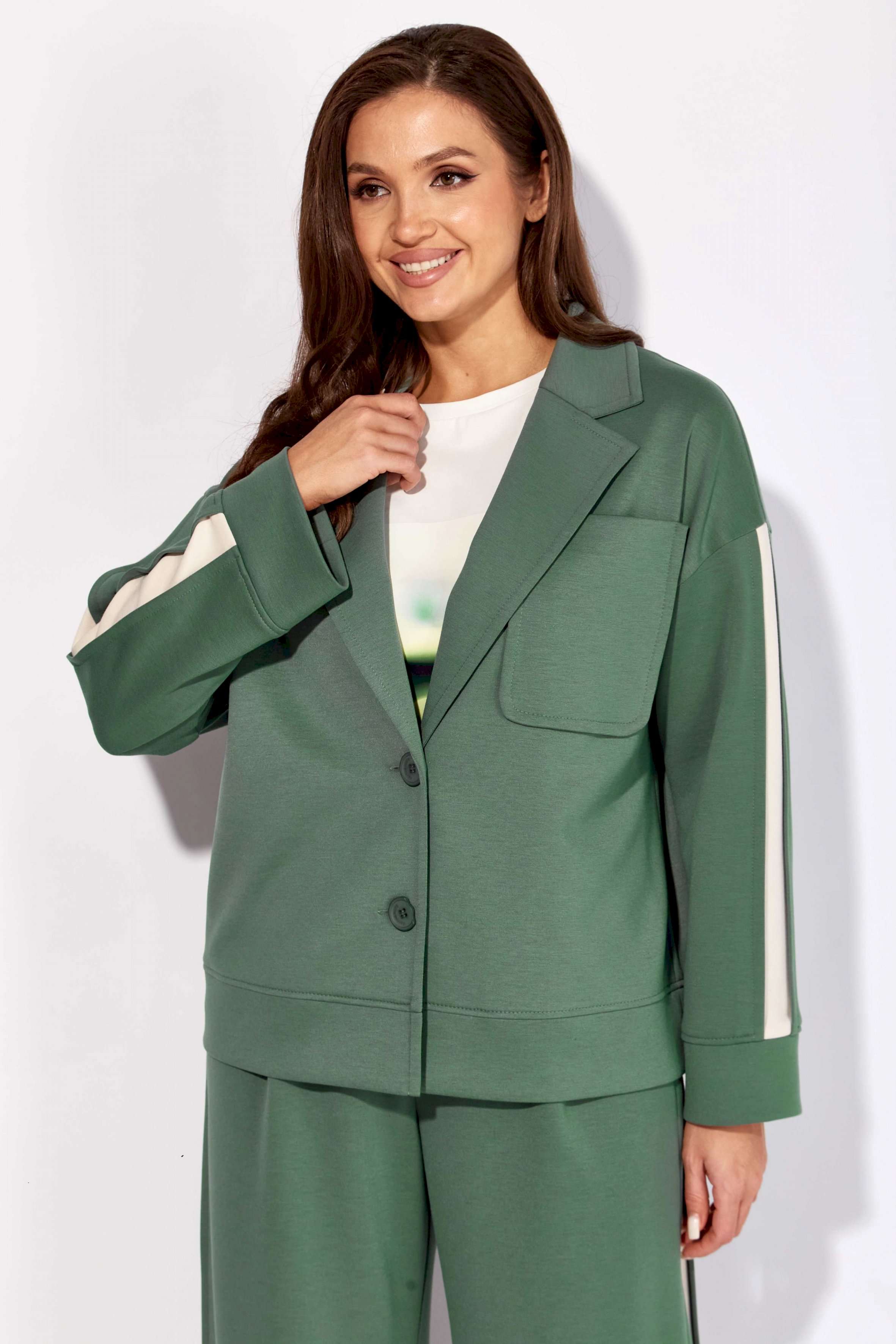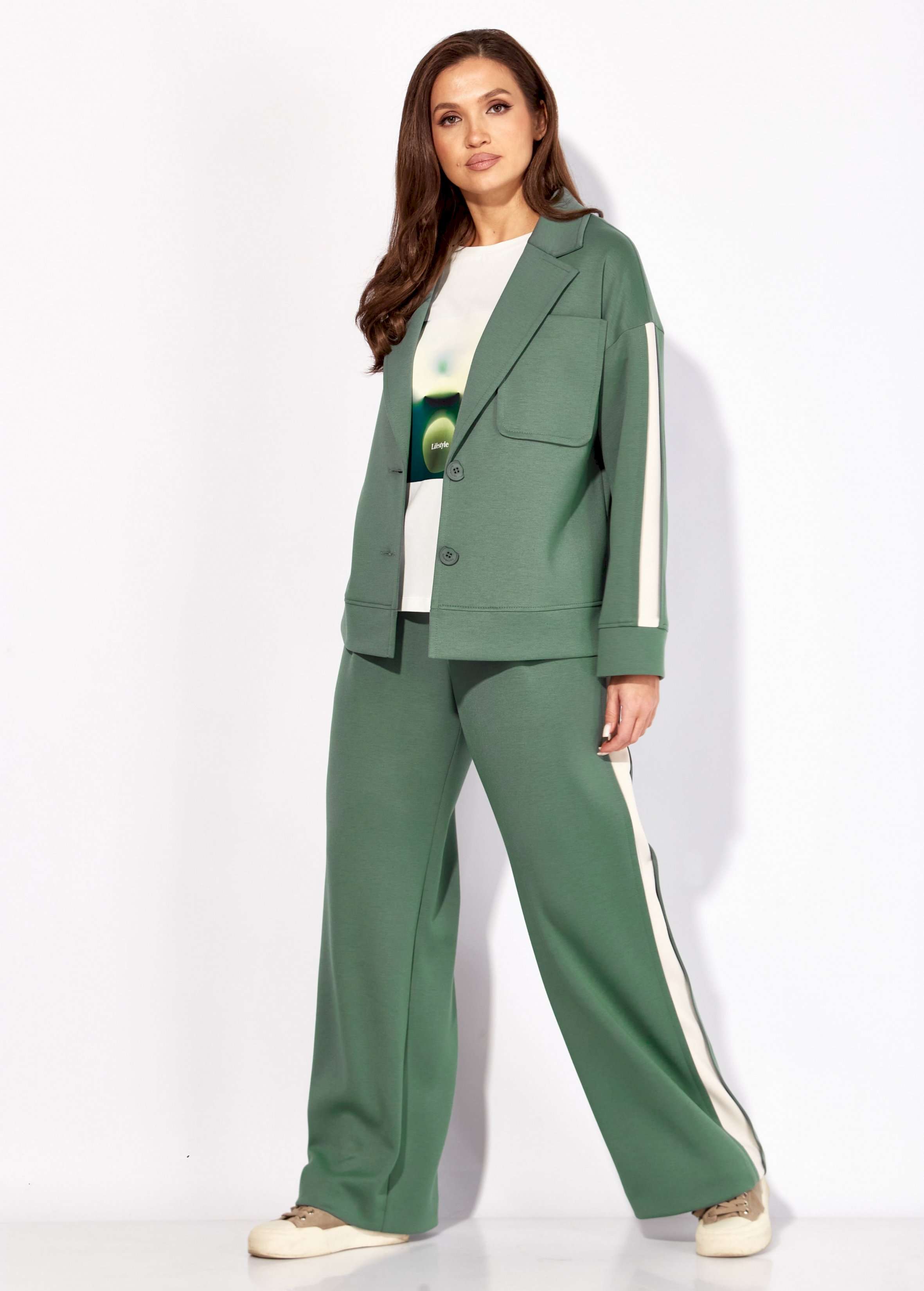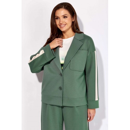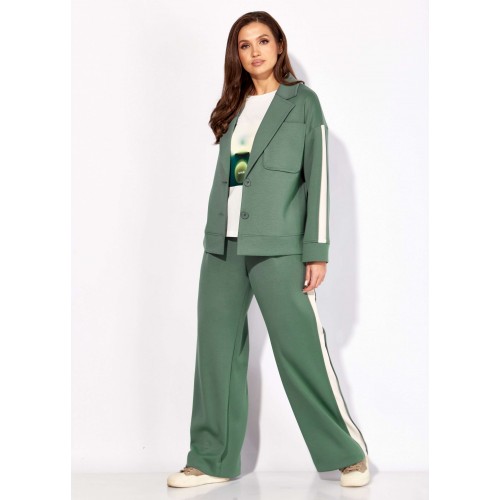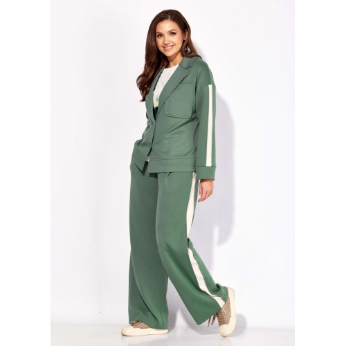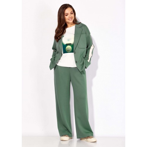 Комплект женский, 3х предметный, состоящий из жакета, топа и брюк. Жакет и брюки выполнены из трикотажного полотна \"TENSEL\", топ-хлопковый трикотаж (кулирка). Жакет прямого силуэта с длинным рукавом. Рукав со спущенной линией плеча, по низу манжета. По рукаву отделочный лампас со складками. Воротник отложной с лацканами. Застежка центральная на петли и пуговицы. На левой полочке накладной карман. По низу жакета отрезная планка. Спинка со средним швом. Брюки прямые, с наклонными карманами спереди и мягкими складками. По боку отделочный лампас со складками. Пояс притачной, с резинкой и гладкой центральной частью. Топ прямого силуэта, с коротким цельнокройным рукавом. Горловина круглая, с отрезной планкой. По переду топа яркий принт.