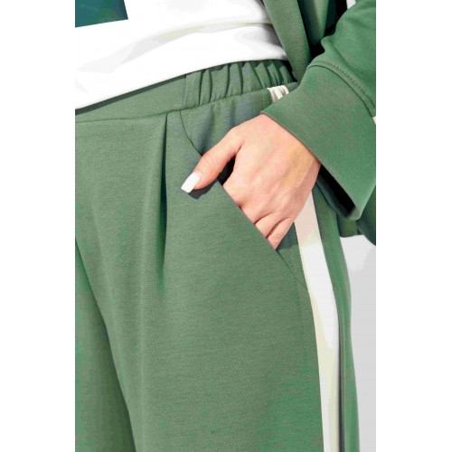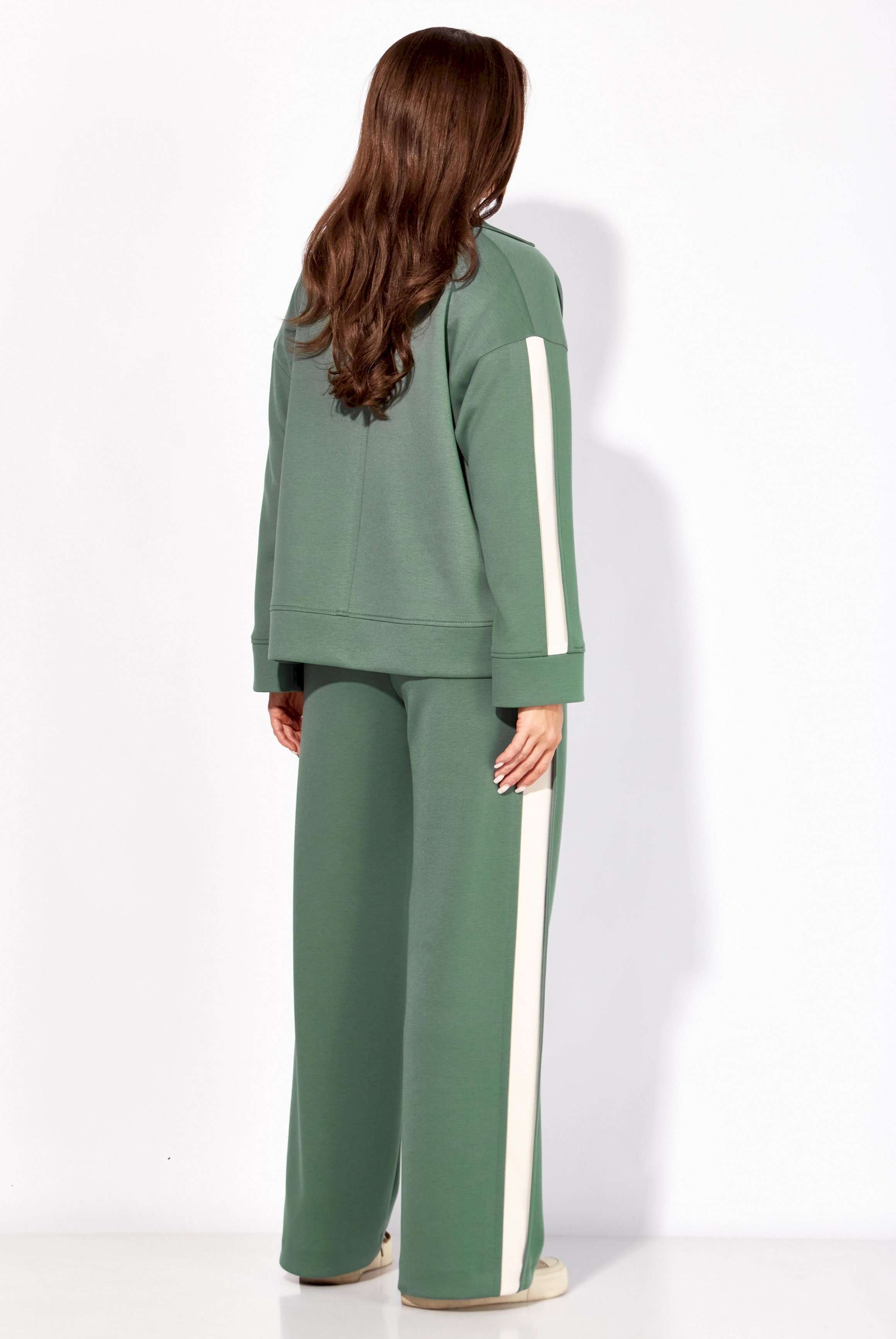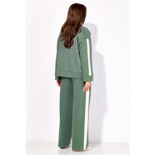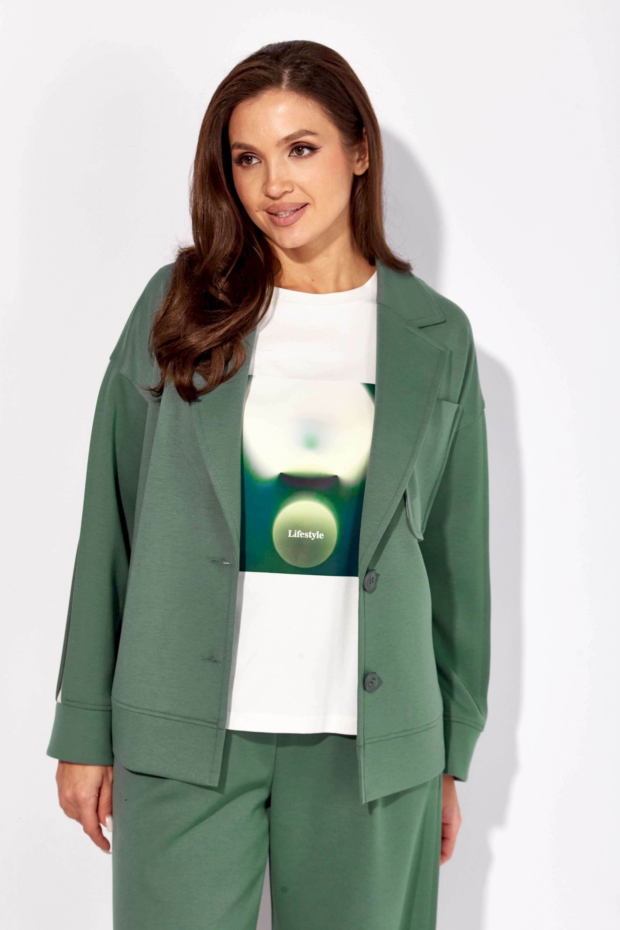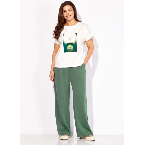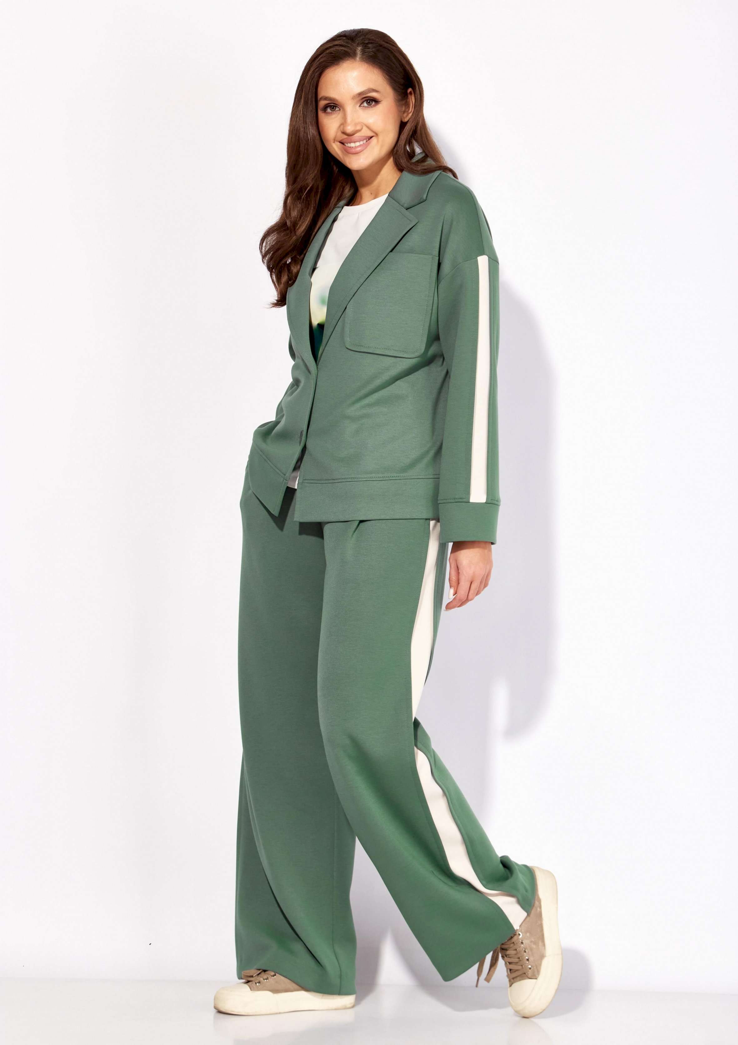 Комплект женский, 3х предметный, состоящий из жакета, топа и брюк. Жакет и брюки выполнены из трикотажного полотна \"TENSEL\", топ-хлопковый трикотаж (кулирка). Жакет прямого силуэта с длинным рукавом. Рукав со спущенной линией плеча, по низу манжета. По рукаву отделочный лампас со складками. Воротник отложной с лацканами. Застежка центральная на петли и пуговицы. На левой полочке накладной карман. По низу жакета отрезная планка. Спинка со средним швом. Брюки прямые, с наклонными карманами спереди и мягкими складками. По боку отделочный лампас со складками. Пояс притачной, с резинкой и гладкой центральной частью. Топ прямого силуэта, с коротким цельнокройным рукавом. Горловина круглая, с отрезной планкой. По переду топа яркий принт.