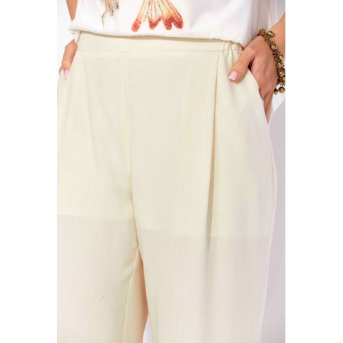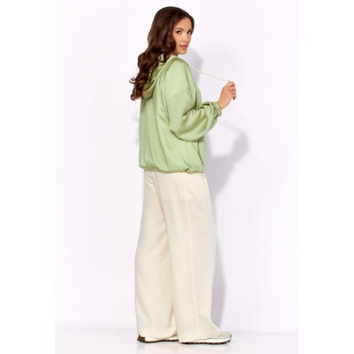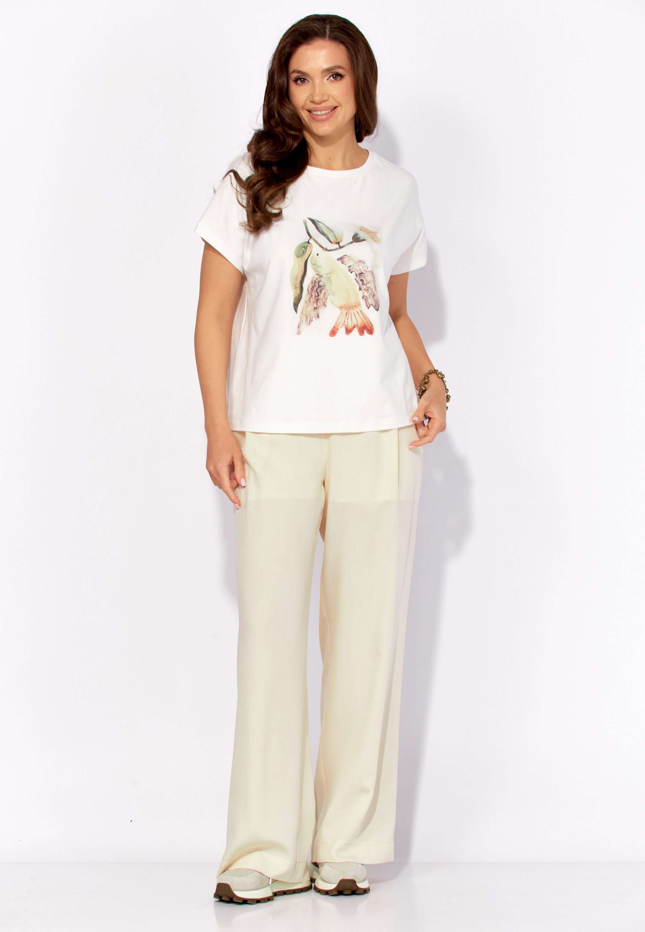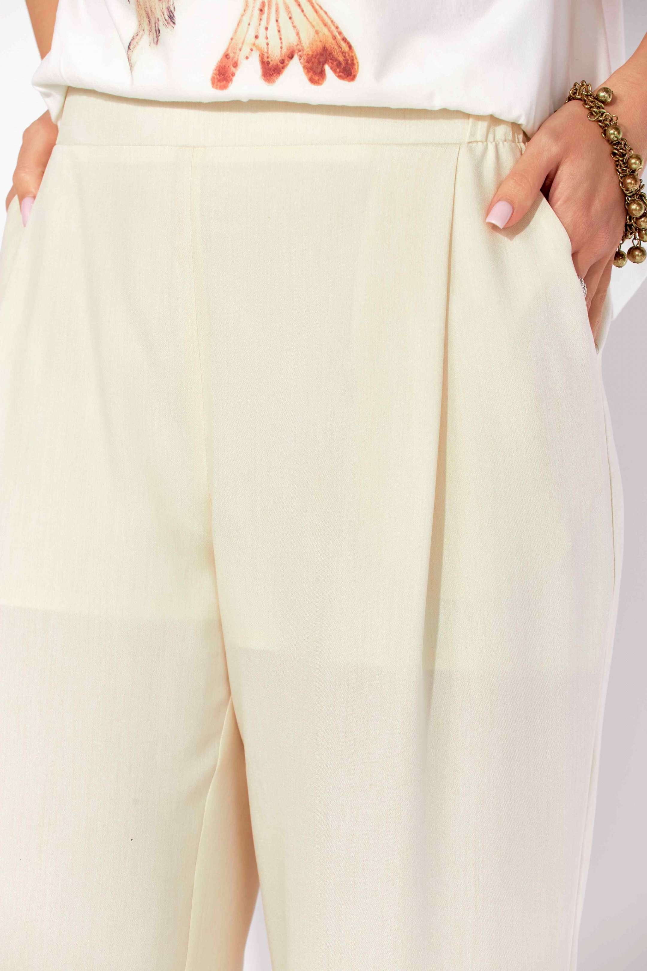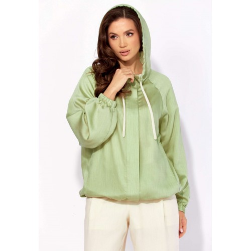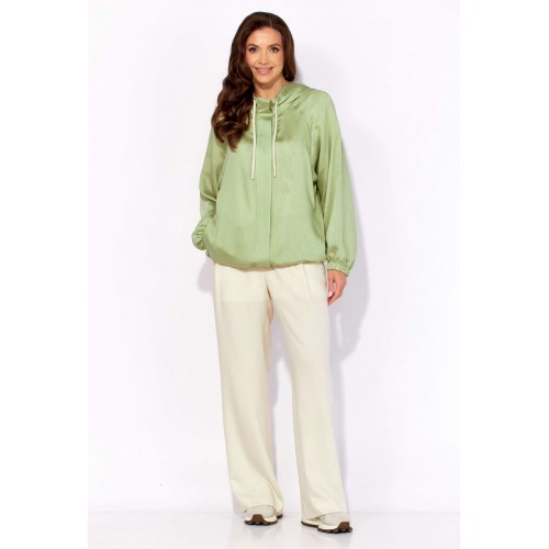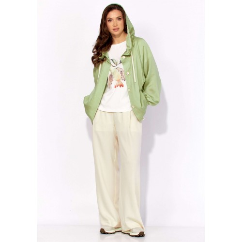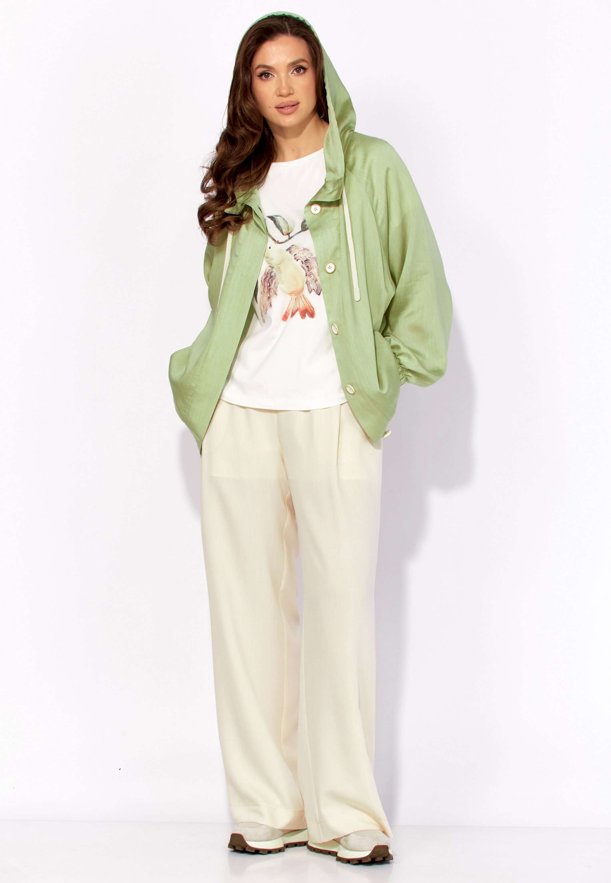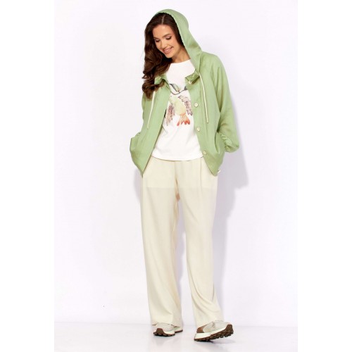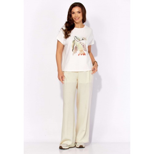 Комплект женский, 3х предметный, состоящий из куртки брюк и топа. Куртка-парка, облегченная, без подкладки, прямого силуэта. Рукав реглан, длинный, по низу на резинке. Горловина оформлена капюшоном с кулисой. По переду карманы в рельефах. Застежка центральная, потайная, на петли и пуговицы. Низ куртки регулируется кулисой с фиксатором по бокам. Спинка без особенностей. Топ из трикотажного хлопкового полотна, прямого силуэта с коротким цельнокройным рукавом. Горловина круглая, с подрезной планкой. Перед задекорирован принтом. Брюки прямые, широкие. По переду наклонные карманы и ягкие складки. Пояс притачной, по центру гладкий, дальше с резиной. В брюках подкладка (шорты).