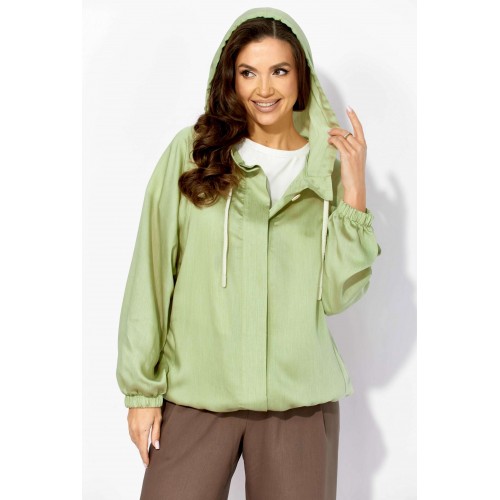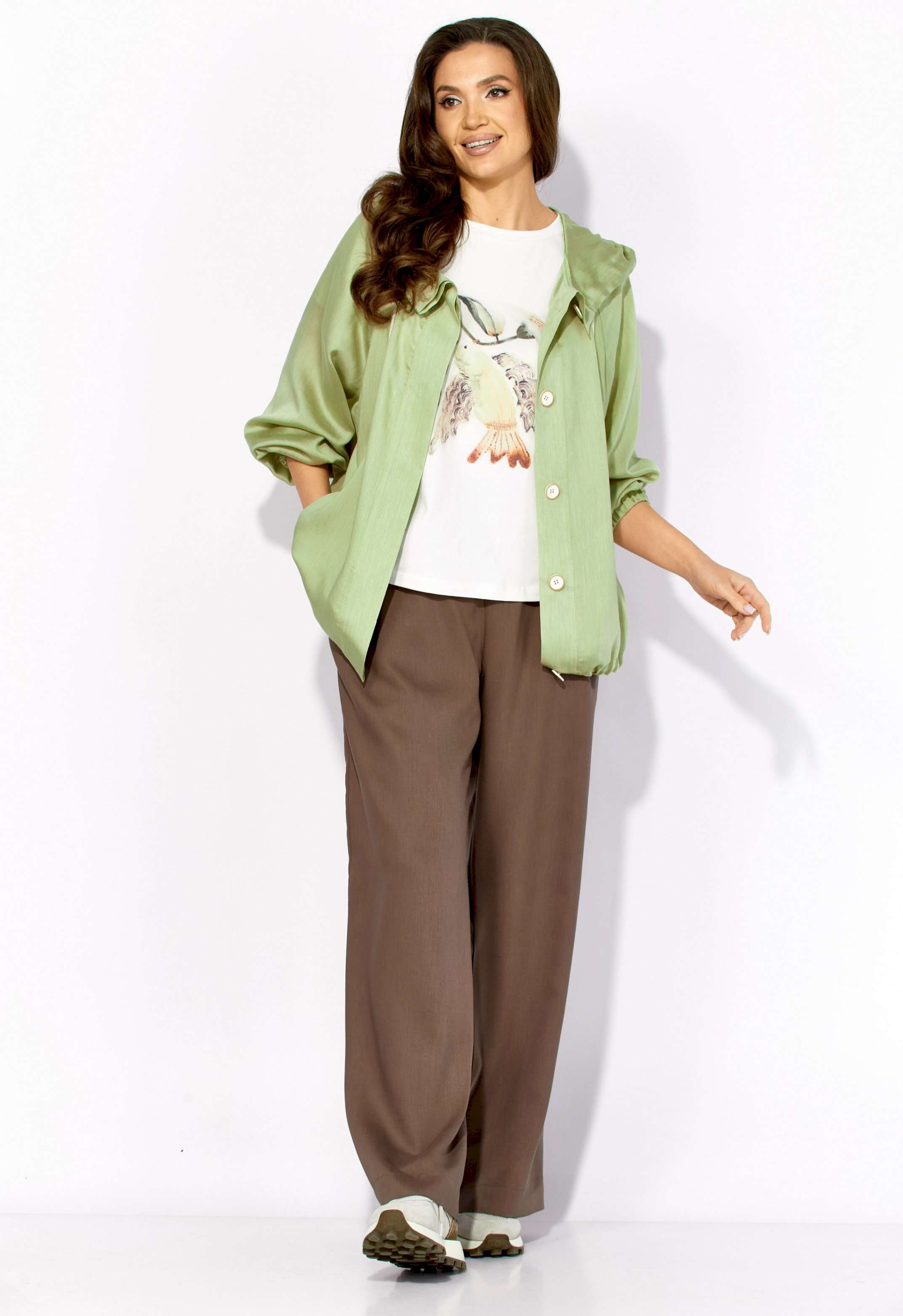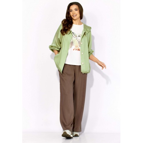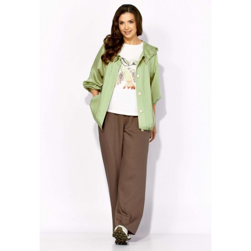 Комплект женский, 3х предметный, состоящий из куртки брюк и топа. Куртка-парка, облегченная, без подкладки, прямого силуэта. Рукав реглан, длинный, по низу на резинке. Горловина оформлена капюшоном с кулисой. По переду карманы в рельефах. Застежка центральная, потайная, на петли и пуговицы. Низ куртки регулируется кулисой с фиксатором по бокам. Спинка без особенностей. Топ из трикотажного хлопкового полотна, прямого силуэта с коротким цельнокройным рукавом. Горловина круглая, с подрезной планкой. Перед задекорирован принтом. Брюки прямые, широкие. По переду наклонные карманы и ягкие складки. Пояс притачной, по центру гладкий, дальше с резиной. В брюках подкладка (шорты).