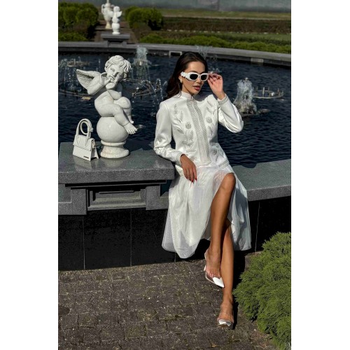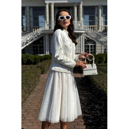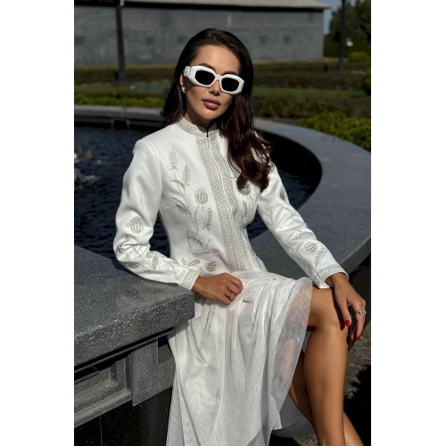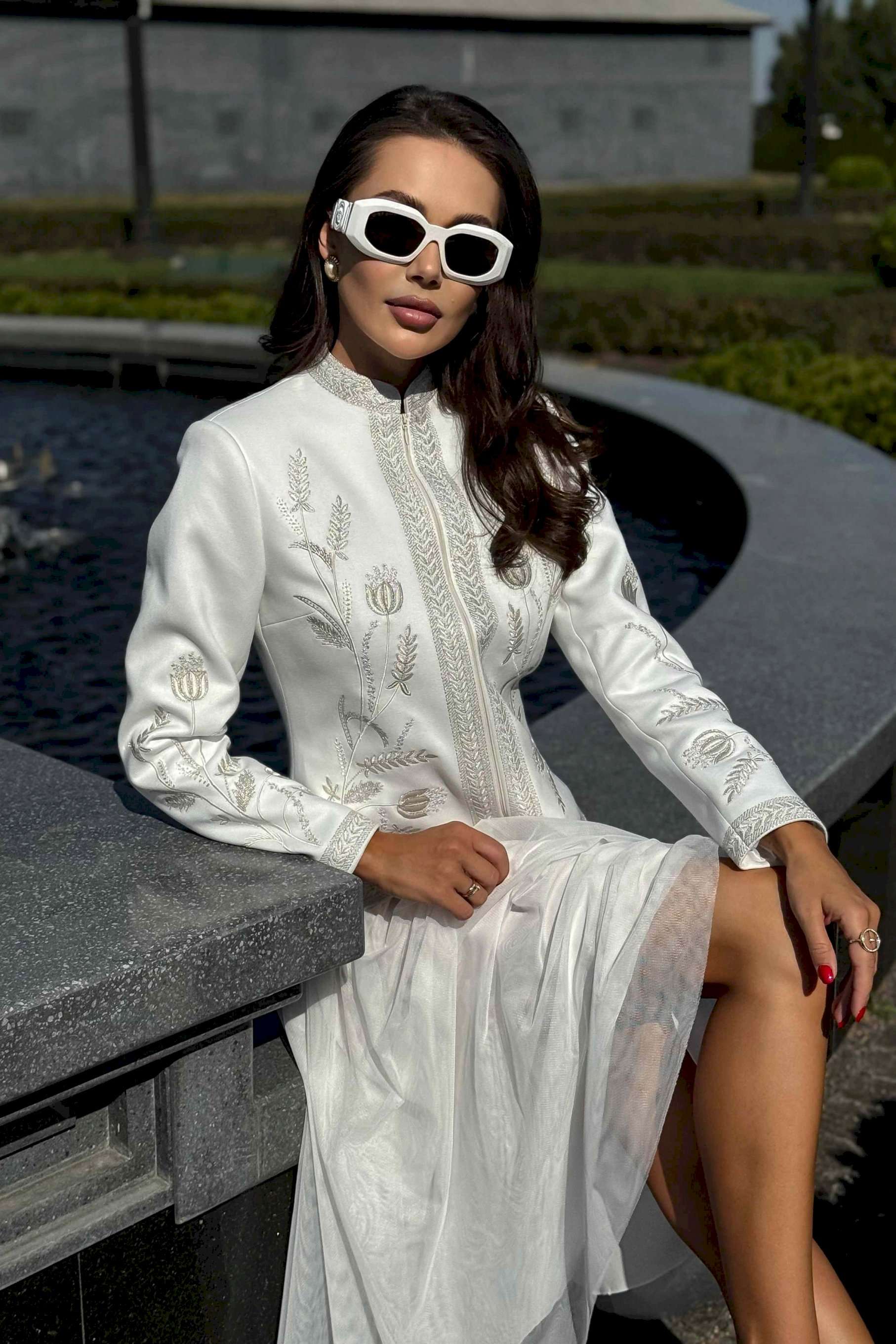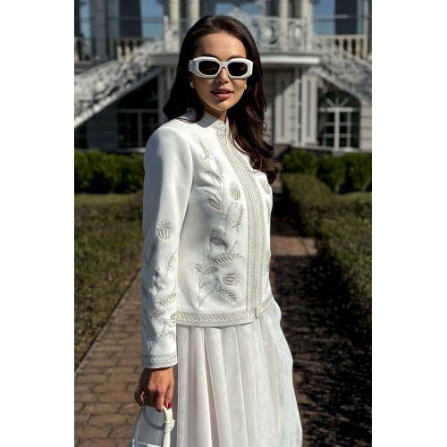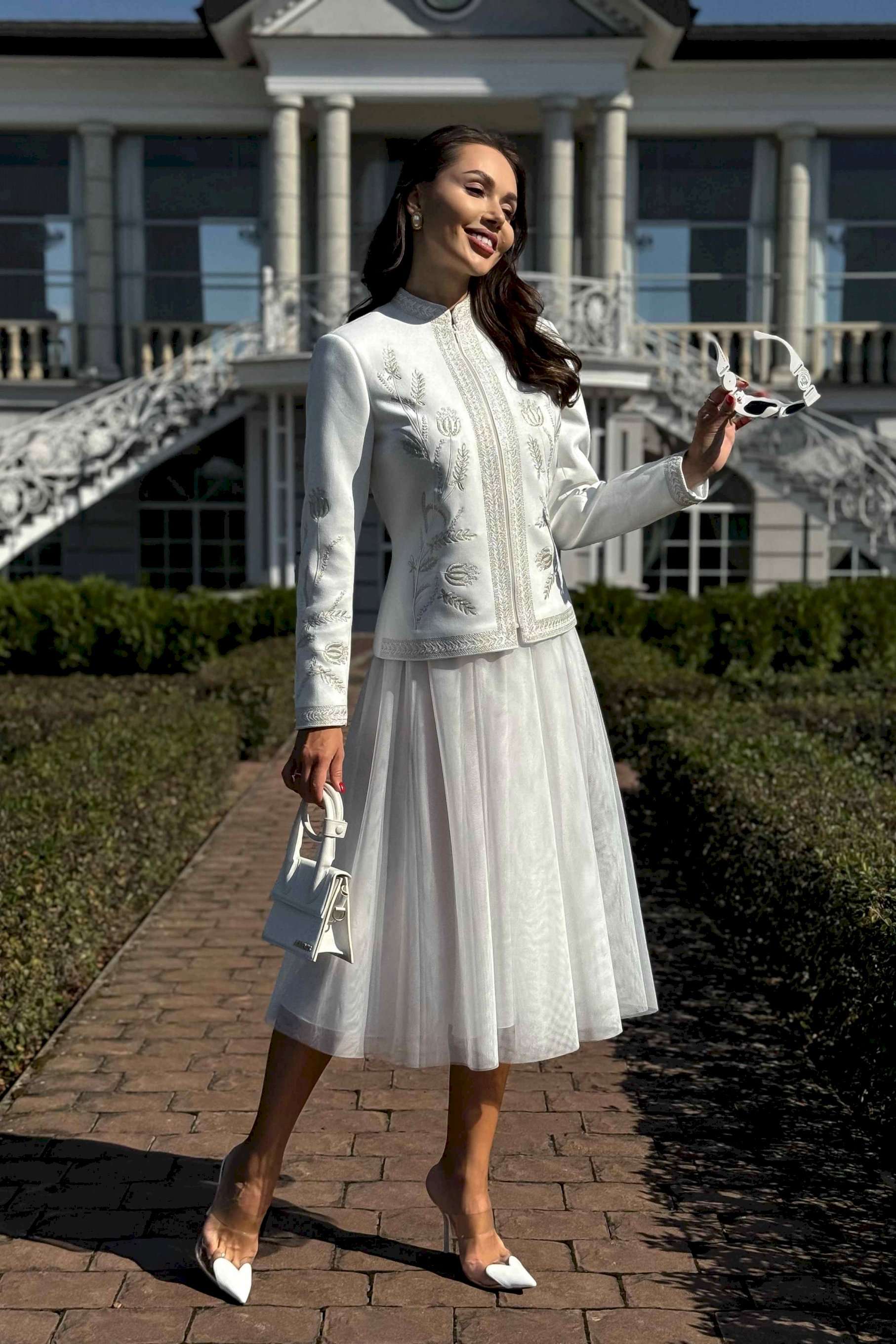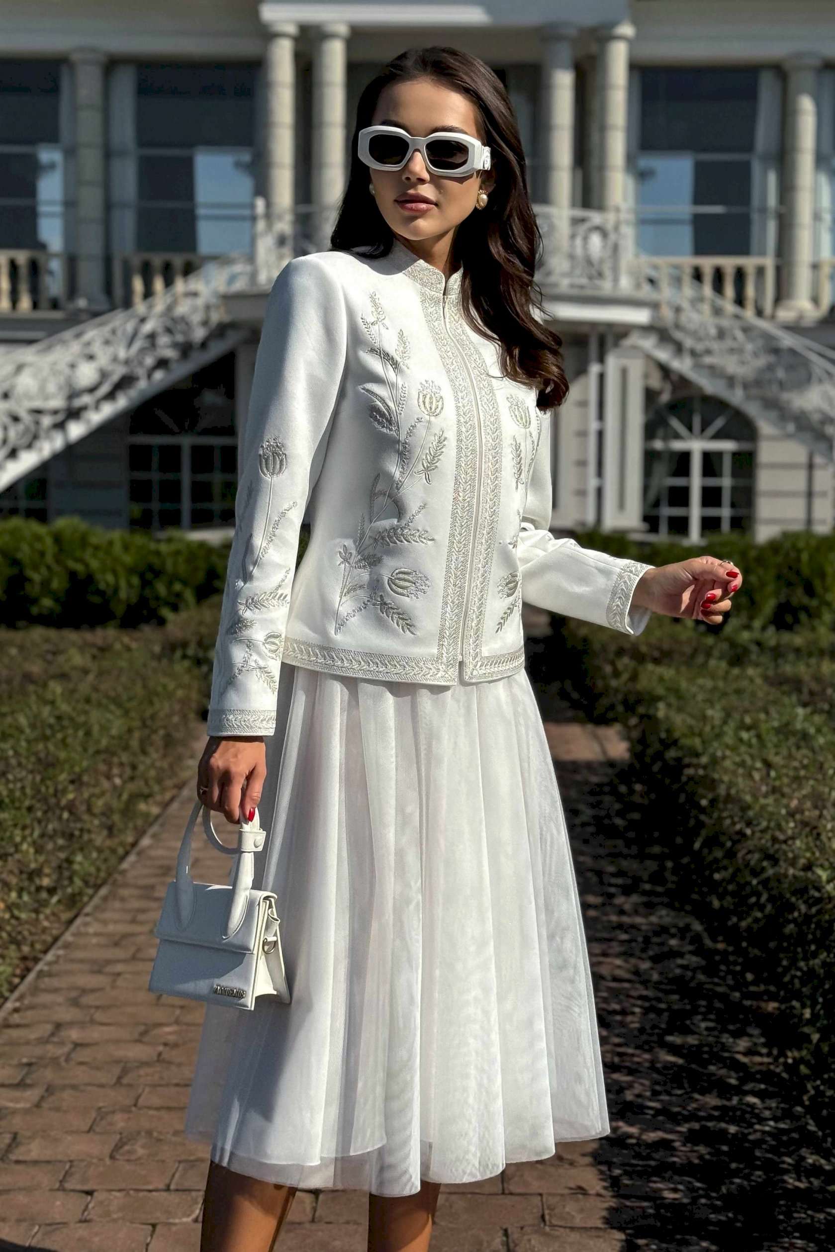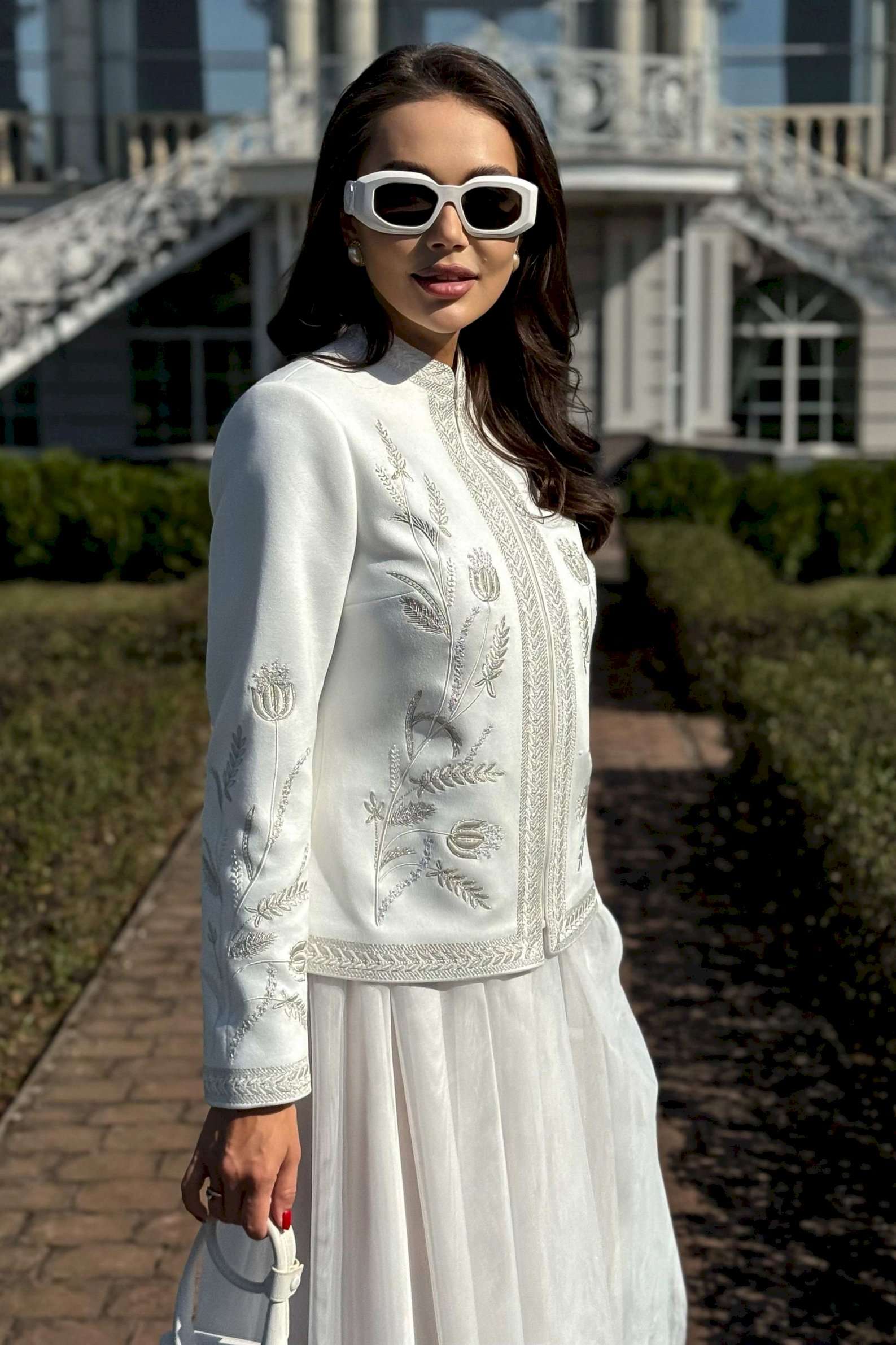 Жакет, украшенный вышивкой, приобретают некую уникальность. Растительные узоры эффектно дополняют благородную ткань. Благодаря вышивке жакет становятся более женственным и изысканным. Жакет женский из мягкой искусственной замши на трикотажной основе полуприлегающего силуэта с художественной вышивкой, на подкладке, однобортный, с центральной застежкой до верха на молнии. На полочке нагрудная вытачка, выходящая из бокового шва (и талиевая вытачка, отнесенная к боковому шву в 44-48 размерах). Полочка с вышивкой заполняющей практически всю центральную часть жакета. Край борта и низ переда жакета оформлены вышитой каймой с орнаментом, повторяющимся по воротнику и низу рукава. Спинка со средним швом и рельефами, выходящими из проймы. Рукава втачные двухшовные с вышивкой в нижней части, длинные. Горловина обработана воротником-стойкой с вышивкой. Этот жакет прекрасно сочетается с платьем 22-978-1, 22-978-6 и 22-978-3. Средняя длина жакета по среднему шву - 53,0 см (±3,0 см), Длина рукава жакета - 60,0 см (±1,5 см). 44:длина жакета по среднему шву спинки – 53,5 см (±2,0 см), ширина на уровне проймы – 47,0 см (±1,0 см), ширина на уровне линии талии – 39,5 см (±1,0 см), ширина жакета по низу – 48,0 см (±1,0 см), длина рукава жакета – 60,5 см (±1,0 см), ширина рукава жакета вверху – 17,5 см (±1,0 см), ширина рукава внизу – 12,0 см (±0,5 см), длина плеча жакета – 12,0 см (±0,5 см). 46:длина жакета по среднему шву спинки – 54,5 см (±2,0 см), ширина на уровне проймы – 49,0 см (±1,0 см), ширина на уровне линии талии – 41,5 см (±1,0 см), ширина жакета по низу – 50,0 см (±1,0 см), длина рукава жакета – 60,5 см (±1,0 см), ширина рукава жакета вверху – 18,0 см (±1,0 см), ширина рукава внизу – 12,5 см (±0,5 см), длина плеча жакета – 12,5 см (±0,5 см). 48:Длина жакета по среднему шву спинки – 54,5 см (±2,0 см), ширина на уровне проймы – 51,0 см (±1,0 см), ширина на уровне линии талии – 43,5 см (±1,0 см), ширина жакета по низу – 52,0 см (±1,0 см), длина рукава жакета – 60,5 см (±1,0 см), ширина рукава жакета вверху – 19,0 см (±1,0 см), ширина рукава внизу – 12,5 см (±0,5 см), длина плеча жакета – 12,5 см (±0,5 см). 50:Длина жакета по среднему шву спинки – 55,5 см (±2,0 см), ширина на уровне проймы – 52,0 см (±1,0 см), ширина на уровне линии талии – 45,5 см (±1,0 см), ширина жакета по низу – 54,0 см (±1,0 см), длина рукава жакета – 60,5 см (±1,0 см), ширина рукава жакета вверху – 19,2 см (±1,0 см), ширина рукава внизу – 12,5 см (±0,5 см), длина плеча жакета – 12,8 см (±0,5 см). 52:Длина жакета по среднему шву спинки – 55,5 см (±2,0 см), ширина на уровне проймы – 54,0 см (±1,0 см), ширина на уровне линии талии – 47,5 см (±1,0 см), ширина жакета по низу – 56,0 см (±1,0 см), длина рукава жакета – 61,5 см (±1,0 см), ширина рукава жакета вверху – 20,2 см (±1,0 см), ширина рукава внизу – 12,5 см (±0,5 см), длина плеча жакета – 12,8 см (±0,5 см). 54:длина жакета по среднему шву спинки – 55,5 см (±2,0 см), Ширина на уровне проймы – 56,0 см (±1,0 см), Ширина на уровне линии талии – 51,0 см (±1,0 см), Ширина жакета по низу – 59,0 см (±1,0 см), Длина рукава жакета – 61,5 см (±1,0 см), Ширина рукава жакета вверху – 21,2 см (±1,0 см), Ширина рукава внизу – 12,5 см (±0,5 см), Длина плеча жакета – 12,8 см (±0,5 см). 56:длина жакета по среднему шву спинки – 55,5 см (±2,0 см), Ширина на уровне проймы – 61,0 см (±1,0 см), Ширина на уровне линии талии – 57,0 см (±1,0 см), Ширина жакета по низу – 63,0 см (±1,0 см), Длина рукава жакета – 60,0 см (±1,0 см), Ширина рукава жакета вверху – 21,5 см (±1,0 см), Ширина рукава внизу – 13,5 см (±0,5 см), Длина плеча жакета – 12,8 см (±0,5 см). 58:длина жакета по