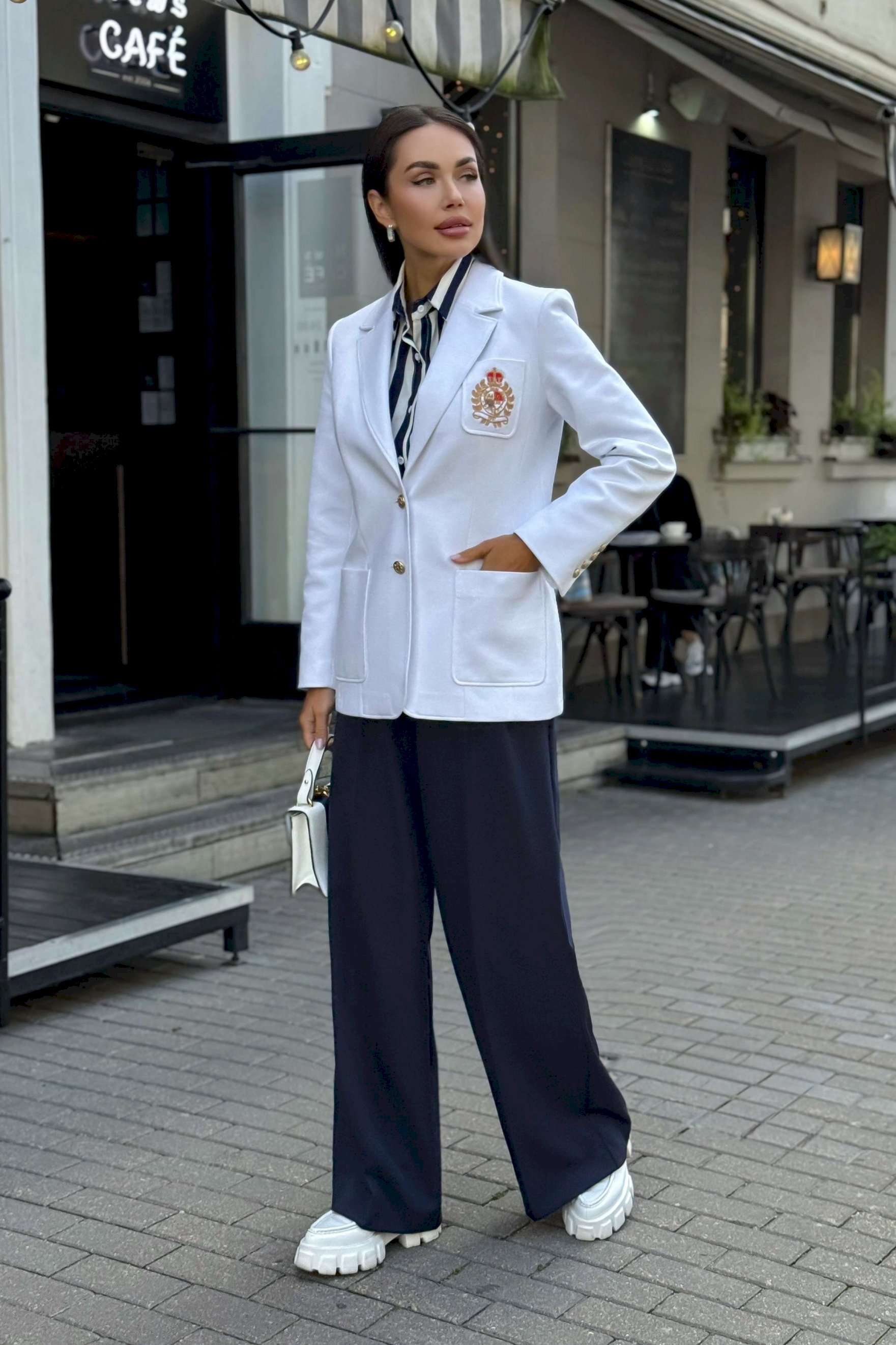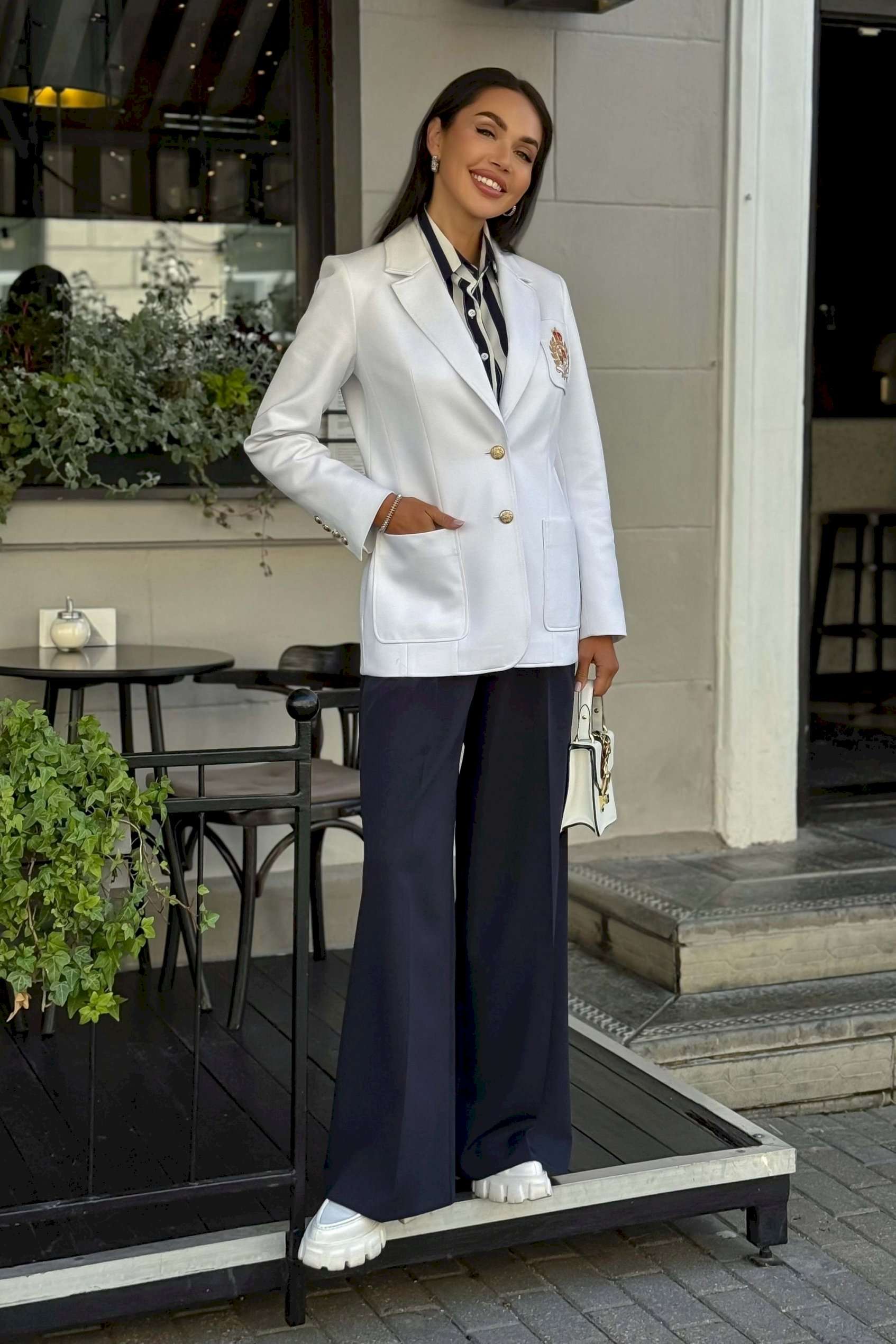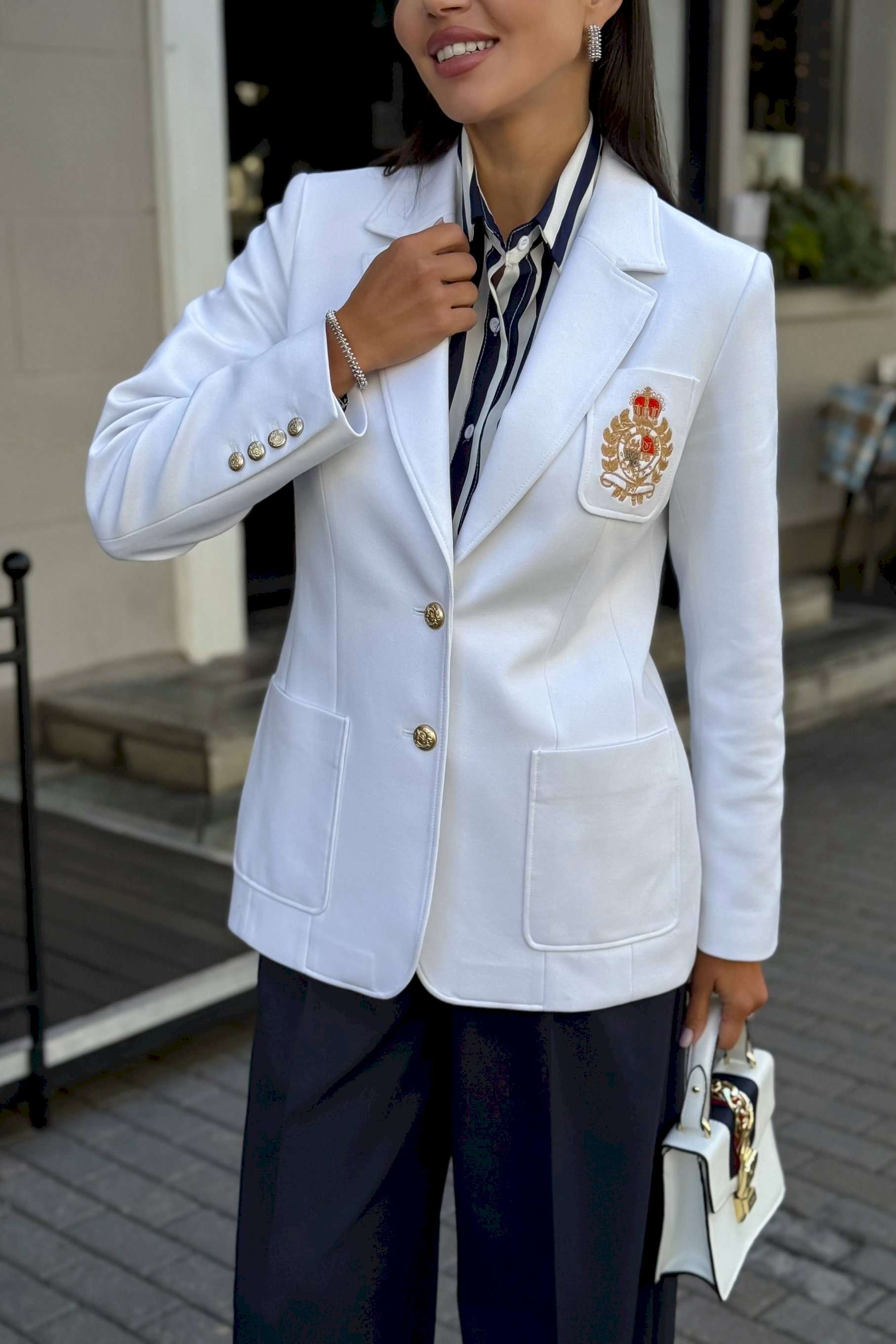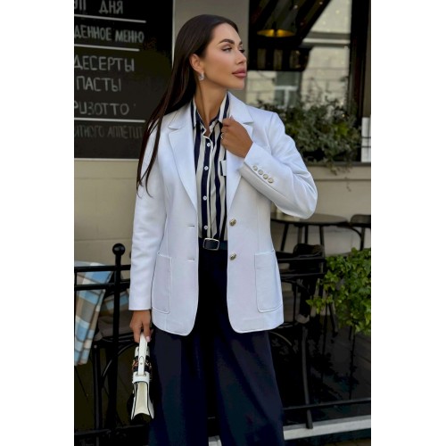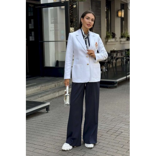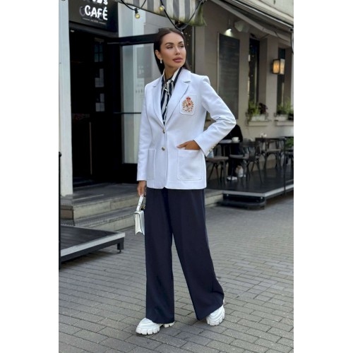 Женский жакет с вышивкой подойдет всем женщинам. С помощью такого предмета в гардеробе можно создать интересные образы, сочетая его с брюками, юбками, рубашками и другими вещами, которые обязательно найдутся у каждой девушки. В этом жакете вы будете выглядеть элегантно и престижно. Жакет женский полуприлегающего силуэта с центральной бортовой застежкой на 2 петли и пуговицы, на подкладке. В нижней части переда настрочены 2 накладных карман, ширина шва настрачивания кармана - 0,5 см. На левой половинке переда настрочен нагрудный карман с эксклюзивной вышивкой, ширина шва настрачивания кармана - 0,5 см. Углы карман - скругленные. Спинка с рельефными швами, выходящими из проймы до низа и средним швом завершающийся шлицей. Горловина обработана отложным воротником пиджачного типа. По краю воротника, лацканам и борту проложена отделочная строчка на 0,5 см от края. Линия борта внизу закругленная. Рукава втачные двухшовные, длинные. В нижней части локтевого шва обработана отлетная закрытая шлица, застегивается на 4 петли и пуговицы. Плечевой пояс жакета оформлен плечевыми накладками. Длина жакета по среднему шву спинки – 69,0 см (±3,0 см), Длина рукава жакета – 62,0 см (±2,0 см) 44 размер Длина жакета по среднему шву спинки – 69,5 см (±2,0 см), Ширина жакета на уровне глубины проймы – 46,0 см (±1,0 см), Ширина жакета на уровне линии талии – 42,0 см (±1,0 см), Ширина жакета на уровне линии бедра – 50,0 см (±1,0 см), Длина рукава жакета – 60,0 см (±1,0 см), Ширина рукава жакета вверху – 17,0 см (±1,0 см), Ширина рукава внизу - 12,0 см (±0,5 см), Длина плеча жакета – 11,5 см (±0,5 см). 46 размер Длина жакета по среднему шву спинки – 69,5 см (±2,0 см), Ширина жакета на уровне глубины проймы – 48,0 см (±1,0 см), Ширина жакета на уровне линии талии – 44,0 см (±1,0 см), Ширина жакета на уровне линии бедра – 52,0 см (±1,0 см), Длина рукава жакета – 60,0 см (±1,0 см), Ширина рукава жакета вверху – 17,5 см (±1,0 см), Ширина рукава внизу - 12,0 см (±0,5 см), Длина плеча жакета – 11,5 см (±0,5 см). 48 размер Длина жакета по среднему шву спинки – 69,5 см (±2,0 см), Ширина жакета на уровне глубины проймы – 50,0 см (±1,0 см), Ширина жакета на уровне линии талии – 46,0 см (±1,0 см), Ширина жакета на уровне линии бедра – 54,0 см (±1,0 см), Длина рукава жакета – 60,0 см (±1,0 см), Ширина рукава жакета вверху – 18,0 см (±1,0 см), Ширина рукава внизу - 12,0 см (±0,5 см), Длина плеча жакета – 11,5 см (±0,5 см). 50 размер Длина жакета по среднему шву спинки – 71,5 см (±2,0 см), Ширина жакета на уровне глубины проймы – 51,0 см (±1,0 см), Ширина жакета на уровне линии талии – 48,0 см (±1,0 см), Ширина жакета на уровне линии бедра – 56,0 см (±1,0 см), Длина рукава жакета – 60,0 см (±1,0 см), Ширина рукава жакета вверху – 19,0 см (±1,0 см), Ширина рукава внизу - 13,0 см (±0,5 см), Длина плеча жакета – 12,0 см (±0,5 см). 52 размер Длина жакета по среднему шву спинки – 71,5 см (±2,0 см), Ширина жакета на уровне глубины проймы – 53,0 см (±1,0 см), Ширина жакета на уровне линии талии – 50,0 см (±1,0 см), Ширина жакета на уровне линии бедра – 58,0 см (±1,0 см), Длина рукава жакета – 60,0 см (±1,0 см), Ширина рукава жакета вверху – 19,5 см (±1,0 см), Ширина рукава внизу - 13,0 см (±0,5 см), Длина плеча жакета – 12,0 см (±0,5 см). 54 размер Длина жакета по среднему шву спинки – 71,5 см (±2,0 см), Ширина жакета на уровне глубины проймы – 55,0 см (±1,0 см), Ширина жакета на уровне линии талии – 52,0 см (±1,0 см), Ширина жакета на уровне линии бедра – 60,0 см (±1,0 см), Длина рукава жакета – 60,0 см (±1,0 см), Ширина рукава жакета вв