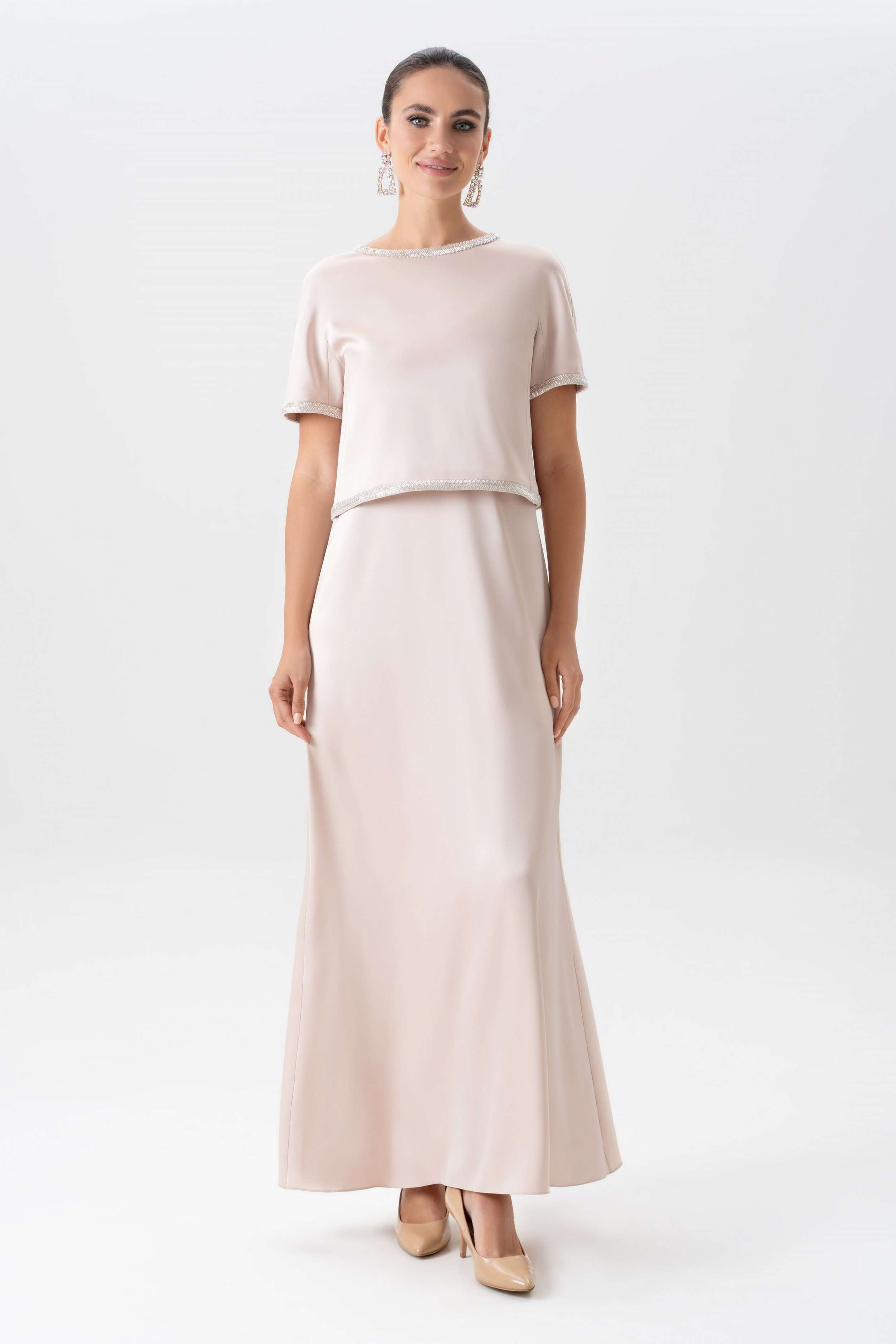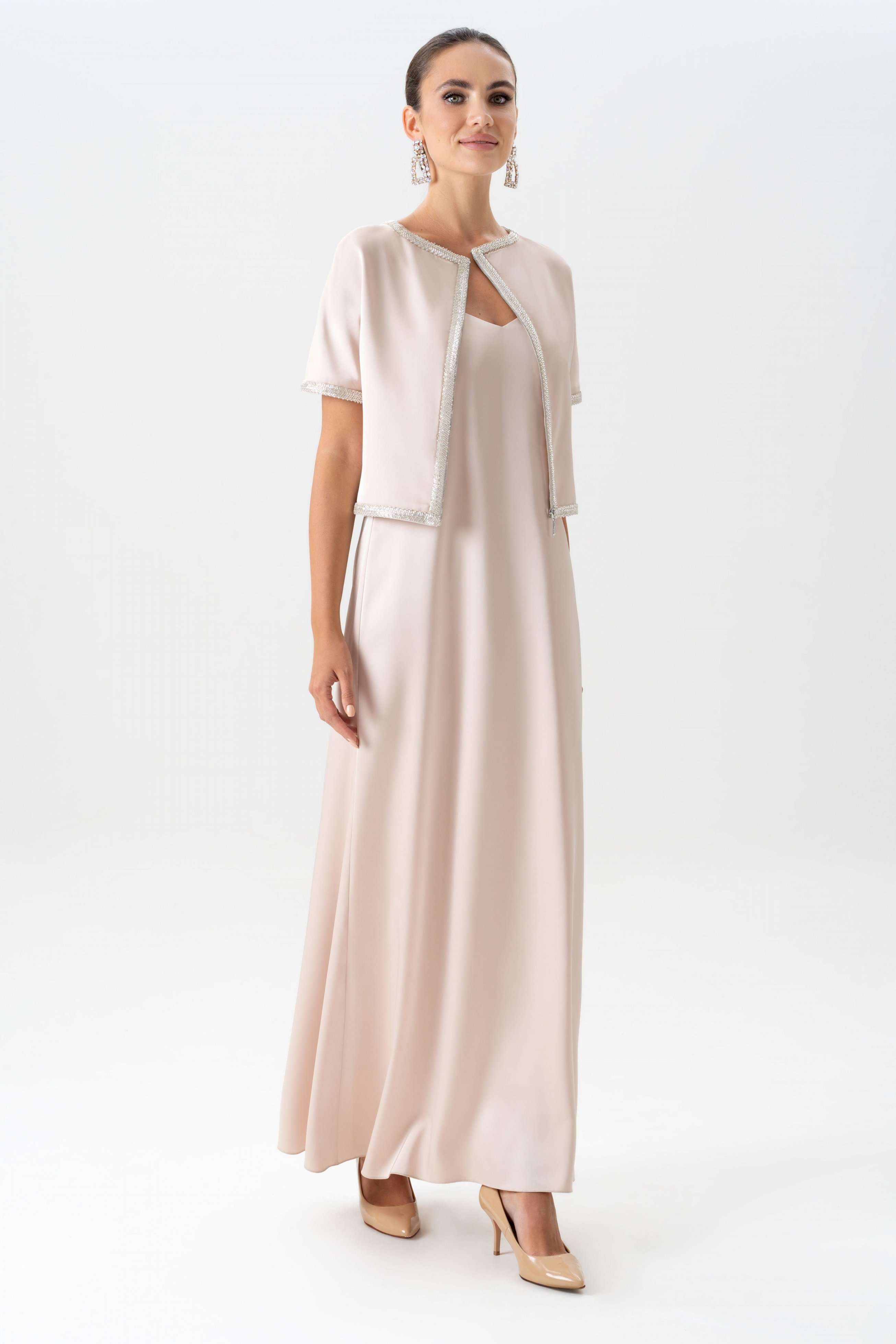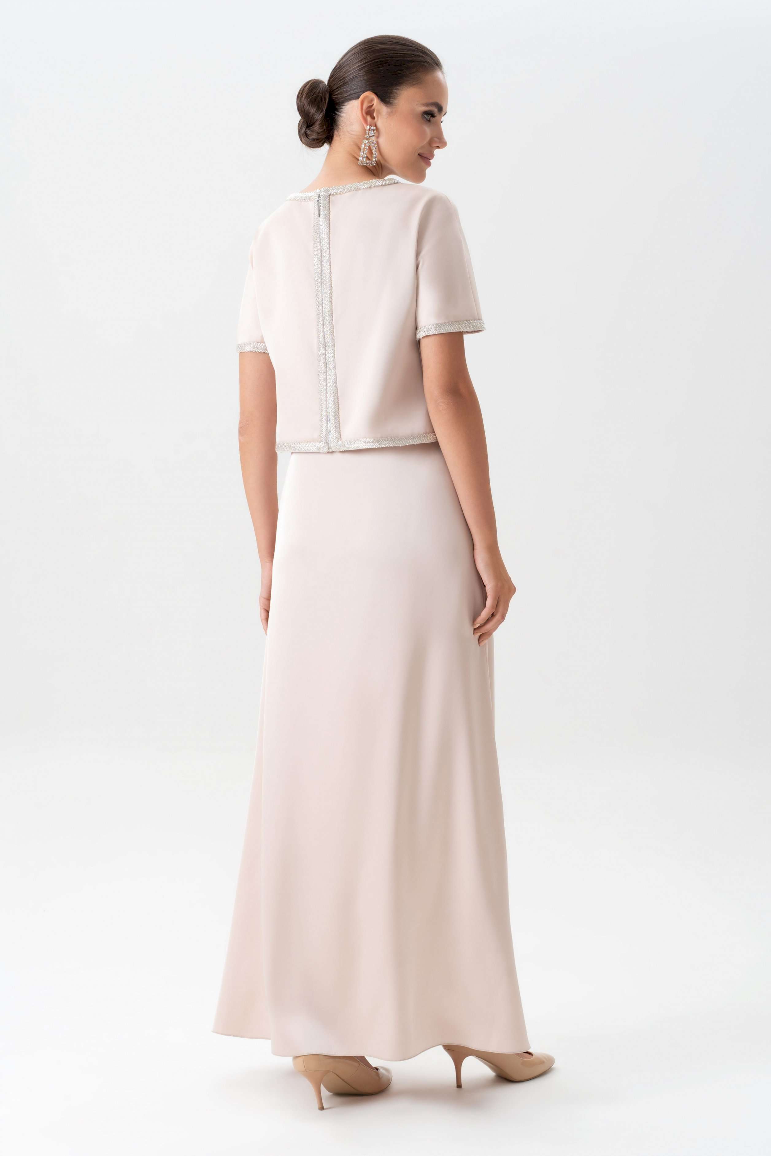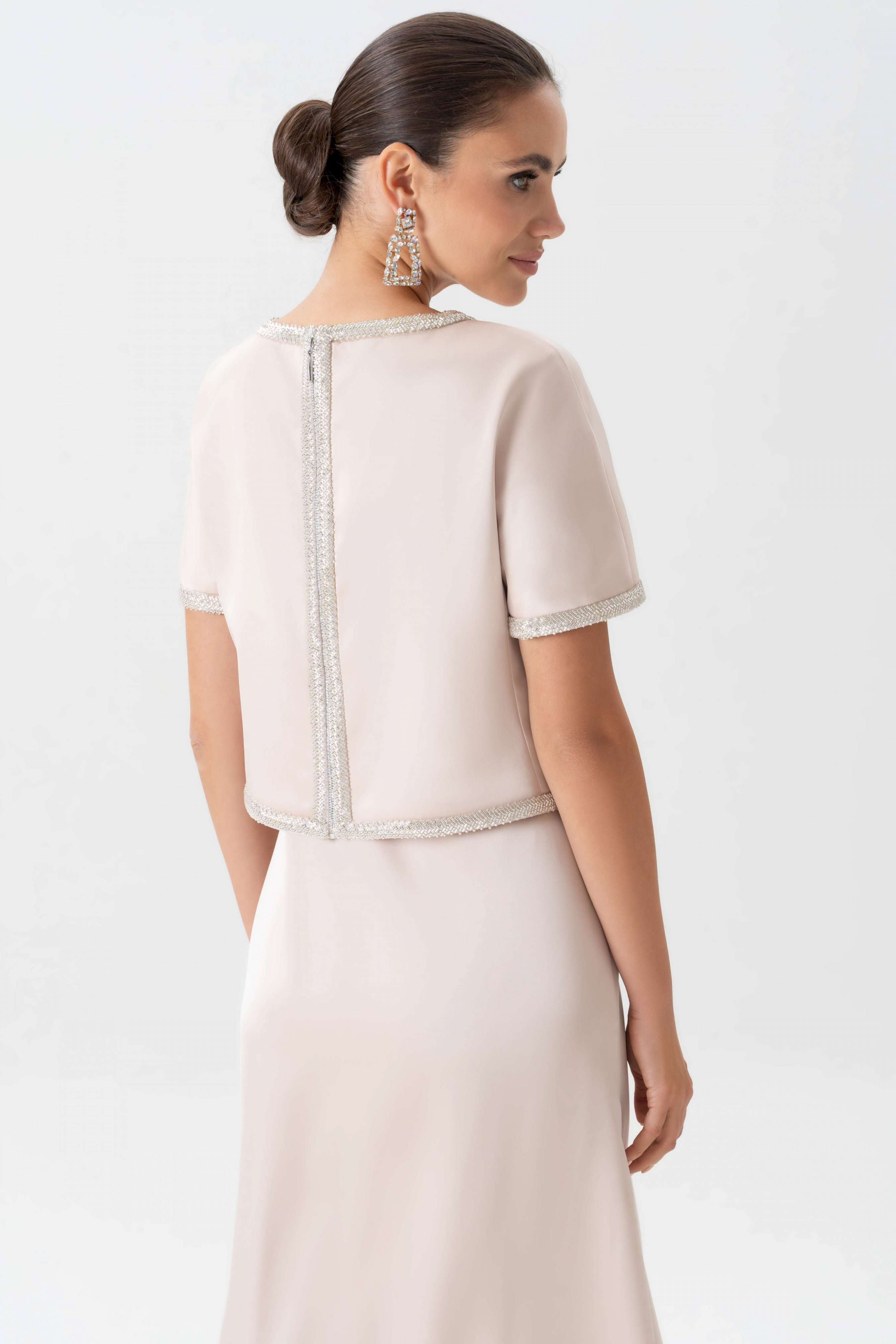 Нарядный женский костюм с платьем от брендов URS — это утончённый праздничный комплект, созданный для тех, кто выбирает изысканность, благородство и проверенную временем классику. Такой вечерний костюм прекрасно вписывается в атмосферу торжества, подчеркивает женственность и обеспечивает комфорт на протяжении всего события. Костюм женский, состоящий из блузона и платья, выполненных из плательной атласной ткани, нарядный. Блузон прямого силуэта, укороченный, с цельнокроеными короткими рукавами, с застежкой по спинке до верха на разъёмную тесьму-молнию с металлическими звеньями. Блузон также можно одевать застежкой на перед. Перед и спинка с цельнокроеным бочком. Рукава цельнокроеные короткие, с притачной нижней частью. Горловина блузона - круглая лодочка, застегивающаяся по спинке на пришивной потайной крючок. Низ переда, спинки и рукавов, горловина, застежка спинки вдоль молнии декорированы отделочной тесьмой из сетки с нашивными бусинами (размер и цвет фурнитуры может незначительно отличаться от фото). Перед, спинка и рукава на подкладке. Платье полуприлегающего силуэта, на бретелях, слегка расклешенное к низу, длинное, на отлетной по низу подкладке. Перед с нагрудными вытачками, выходящими из боковых швов. Верхняя часть переда ˅- образная, углубленная. Средняя длина блузона по середине спинки 44,0 см, (±2,0 см); Средняя длина рукава блузона от горловины до низа рукава - 33,0 см (±2,0 см); Средняя длина платья по боковому шву (от проймы до низа) 126,0 см (±3,0 см)