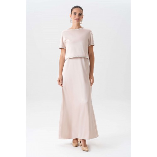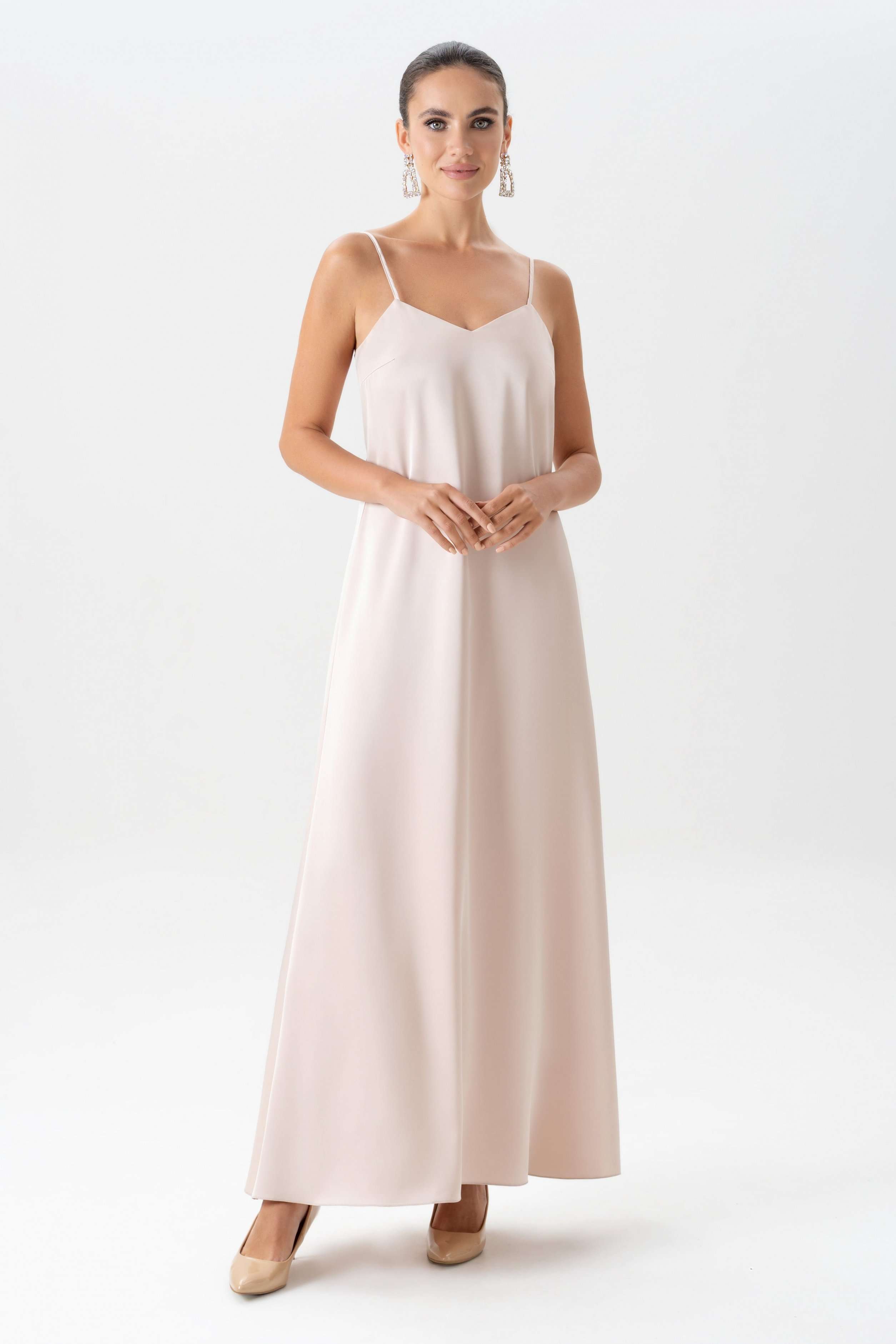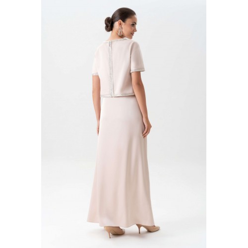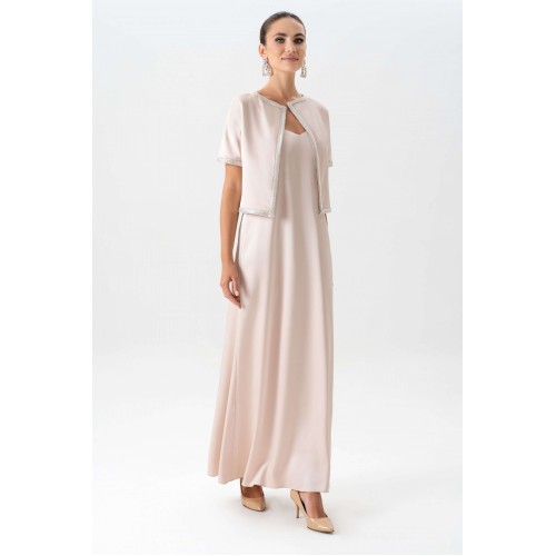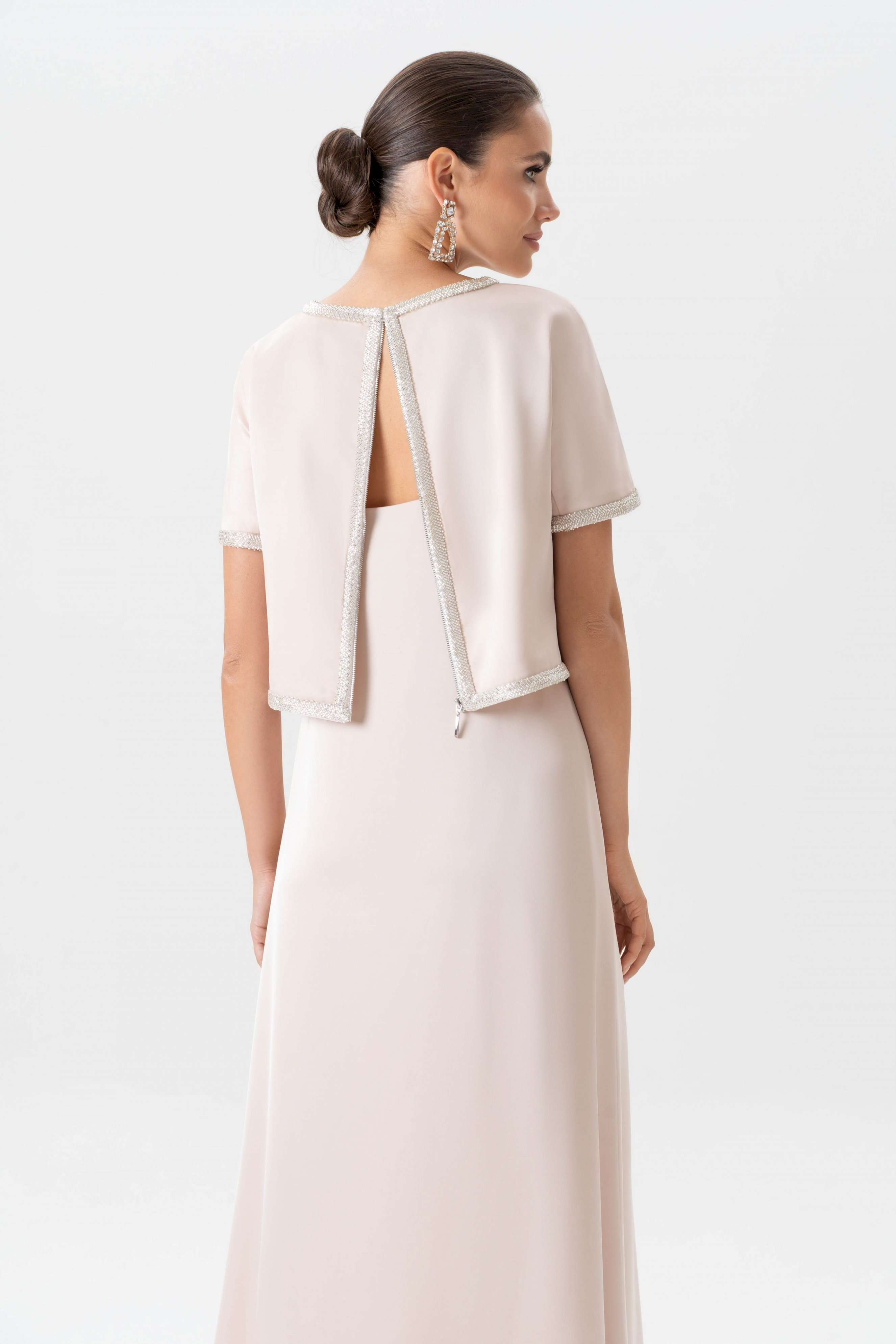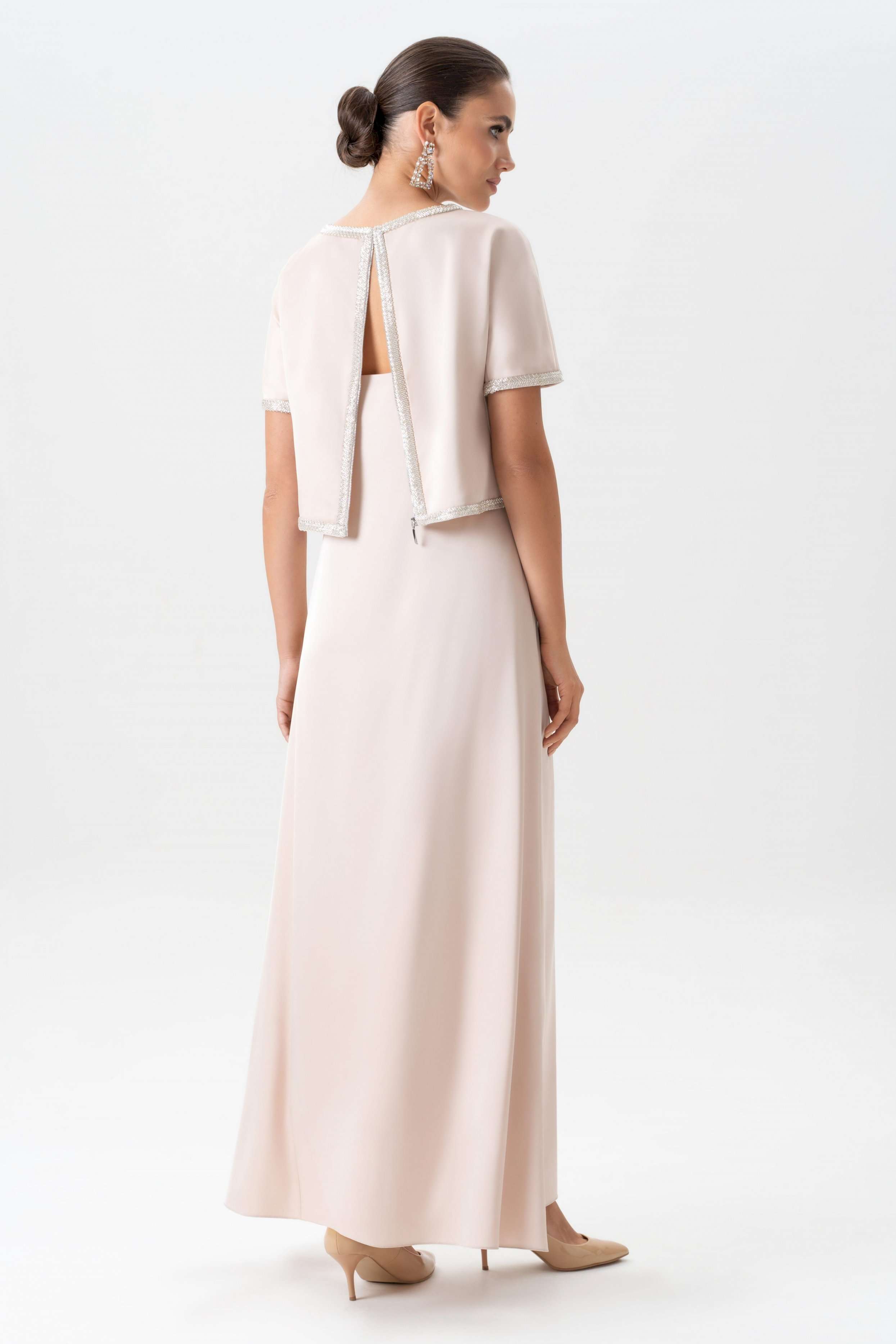 Нарядный женский костюм с платьем от брендов URS — это утончённый праздничный комплект, созданный для тех, кто выбирает изысканность, благородство и проверенную временем классику. Такой вечерний костюм прекрасно вписывается в атмосферу торжества, подчеркивает женственность и обеспечивает комфорт на протяжении всего события. Костюм женский, состоящий из блузона и платья, выполненных из плательной атласной ткани, нарядный. Блузон прямого силуэта, укороченный, с цельнокроеными короткими рукавами, с застежкой по спинке до верха на разъёмную тесьму-молнию с металлическими звеньями. Блузон также можно одевать застежкой на перед. Перед и спинка с цельнокроеным бочком. Рукава цельнокроеные короткие, с притачной нижней частью. Горловина блузона - круглая лодочка, застегивающаяся по спинке на пришивной потайной крючок. Низ переда, спинки и рукавов, горловина, застежка спинки вдоль молнии декорированы отделочной тесьмой из сетки с нашивными бусинами (размер и цвет фурнитуры может незначительно отличаться от фото). Перед, спинка и рукава на подкладке. Платье полуприлегающего силуэта, на бретелях, слегка расклешенное к низу, длинное, на отлетной по низу подкладке. Перед с нагрудными вытачками, выходящими из боковых швов. Верхняя часть переда ˅- образная, углубленная. Средняя длина блузона по середине спинки 44,0 см, (±2,0 см); Средняя длина рукава блузона от горловины до низа рукава - 33,0 см (±2,0 см); Средняя длина платья по боковому шву (от проймы до низа) 126,0 см (±3,0 см)