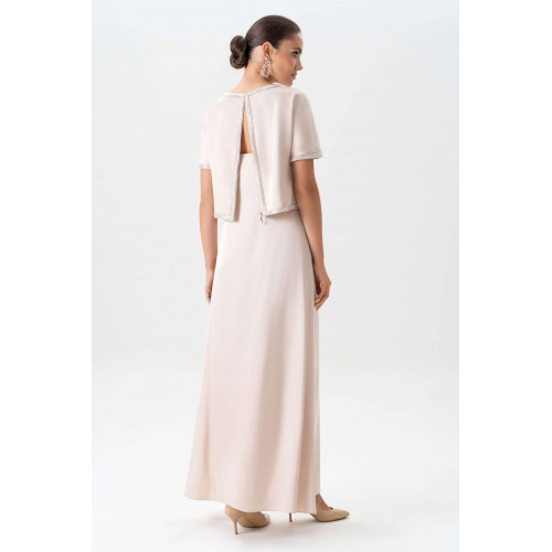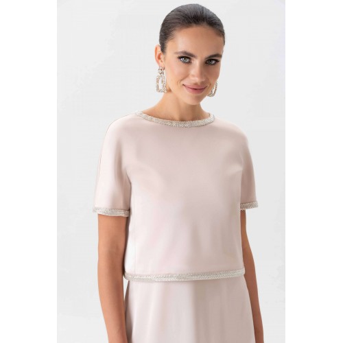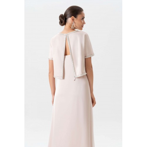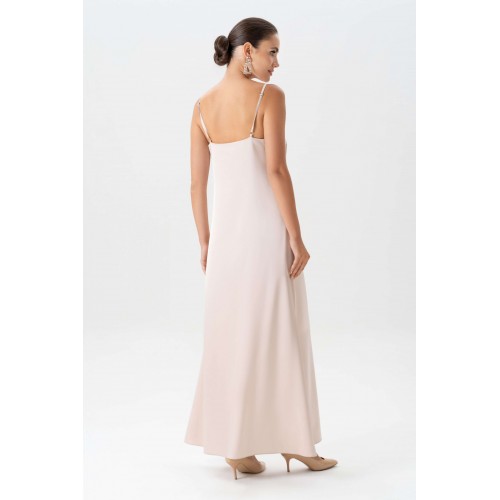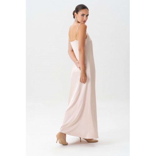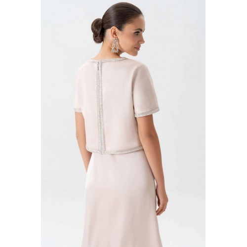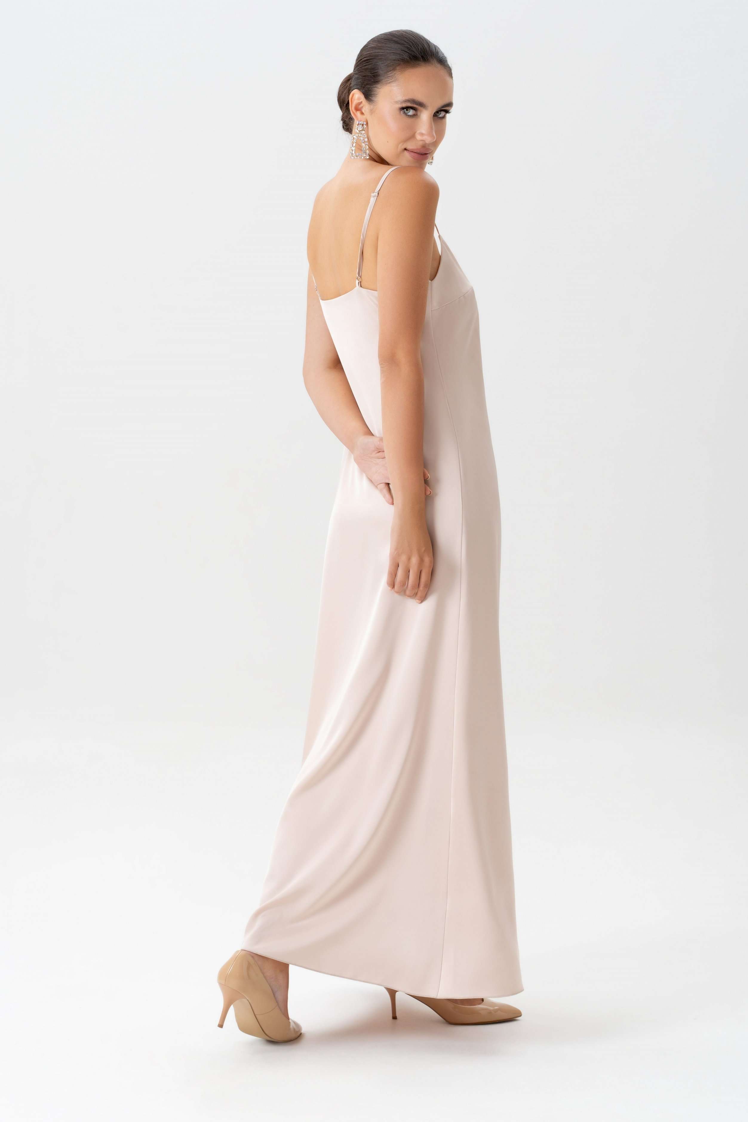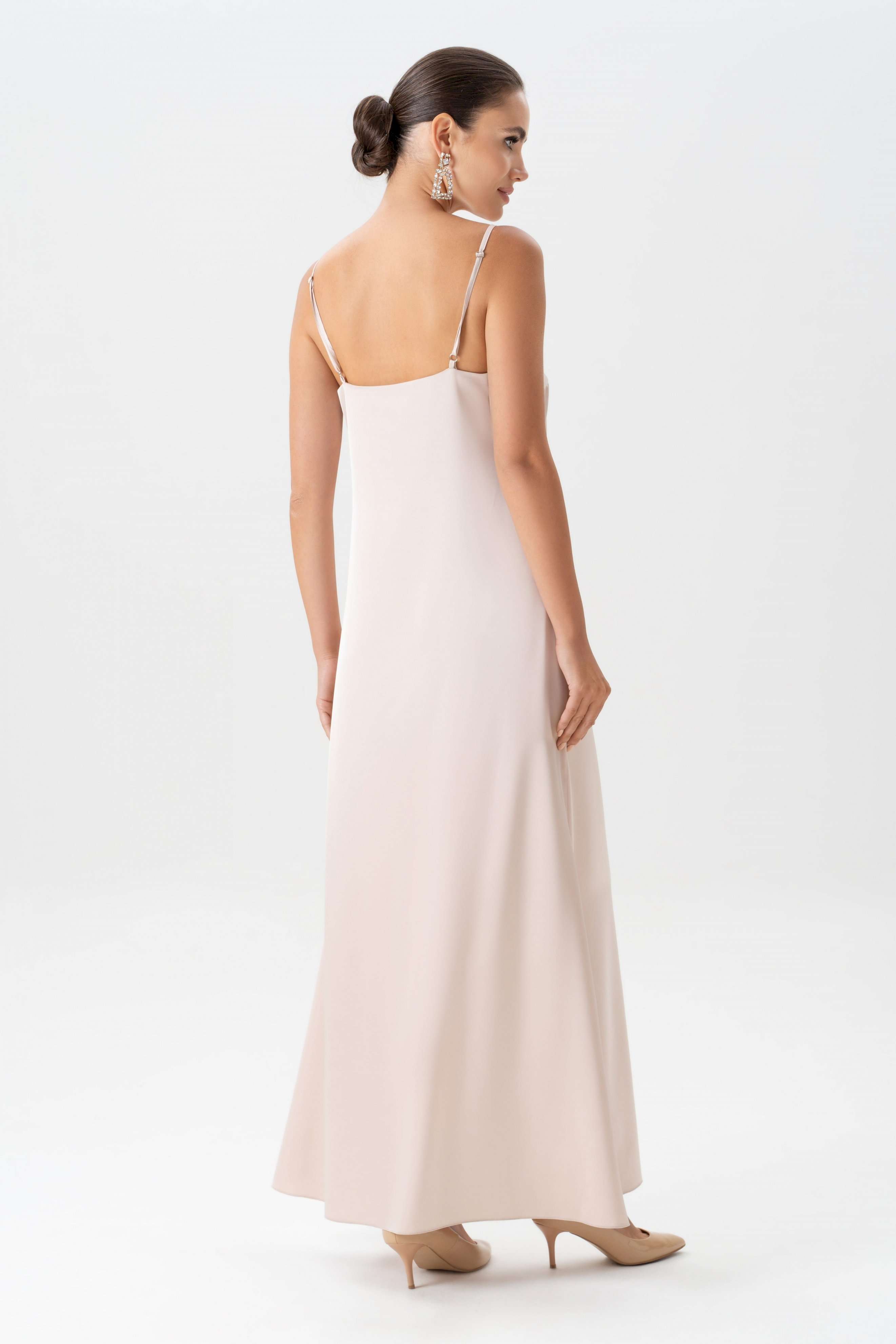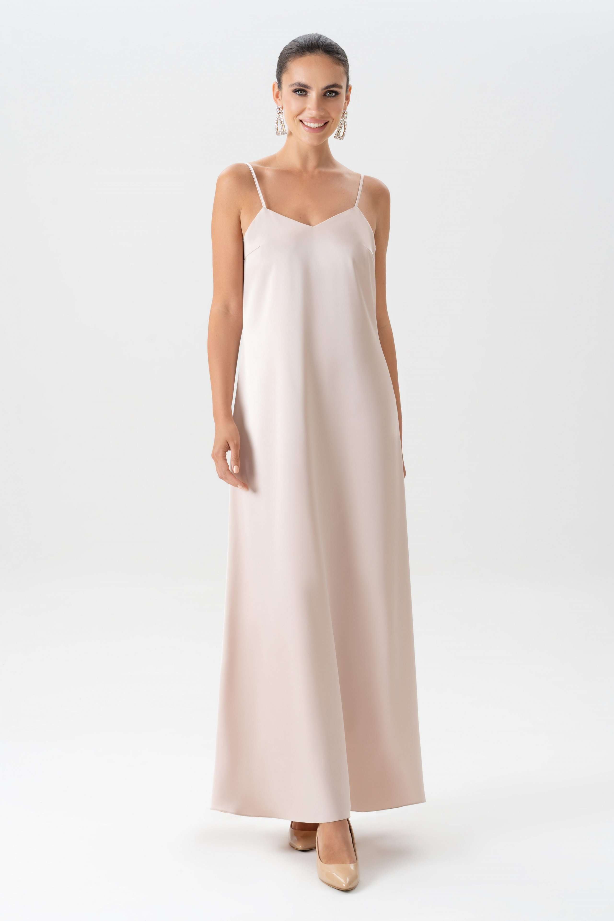 Нарядный женский костюм с платьем от брендов URS — это утончённый праздничный комплект, созданный для тех, кто выбирает изысканность, благородство и проверенную временем классику. Такой вечерний костюм прекрасно вписывается в атмосферу торжества, подчеркивает женственность и обеспечивает комфорт на протяжении всего события. Костюм женский, состоящий из блузона и платья, выполненных из плательной атласной ткани, нарядный. Блузон прямого силуэта, укороченный, с цельнокроеными короткими рукавами, с застежкой по спинке до верха на разъёмную тесьму-молнию с металлическими звеньями. Блузон также можно одевать застежкой на перед. Перед и спинка с цельнокроеным бочком. Рукава цельнокроеные короткие, с притачной нижней частью. Горловина блузона - круглая лодочка, застегивающаяся по спинке на пришивной потайной крючок. Низ переда, спинки и рукавов, горловина, застежка спинки вдоль молнии декорированы отделочной тесьмой из сетки с нашивными бусинами (размер и цвет фурнитуры может незначительно отличаться от фото). Перед, спинка и рукава на подкладке. Платье полуприлегающего силуэта, на бретелях, слегка расклешенное к низу, длинное, на отлетной по низу подкладке. Перед с нагрудными вытачками, выходящими из боковых швов. Верхняя часть переда ˅- образная, углубленная. Средняя длина блузона по середине спинки 44,0 см, (±2,0 см); Средняя длина рукава блузона от горловины до низа рукава - 33,0 см (±2,0 см); Средняя длина платья по боковому шву (от проймы до низа) 126,0 см (±3,0 см)