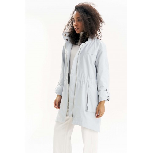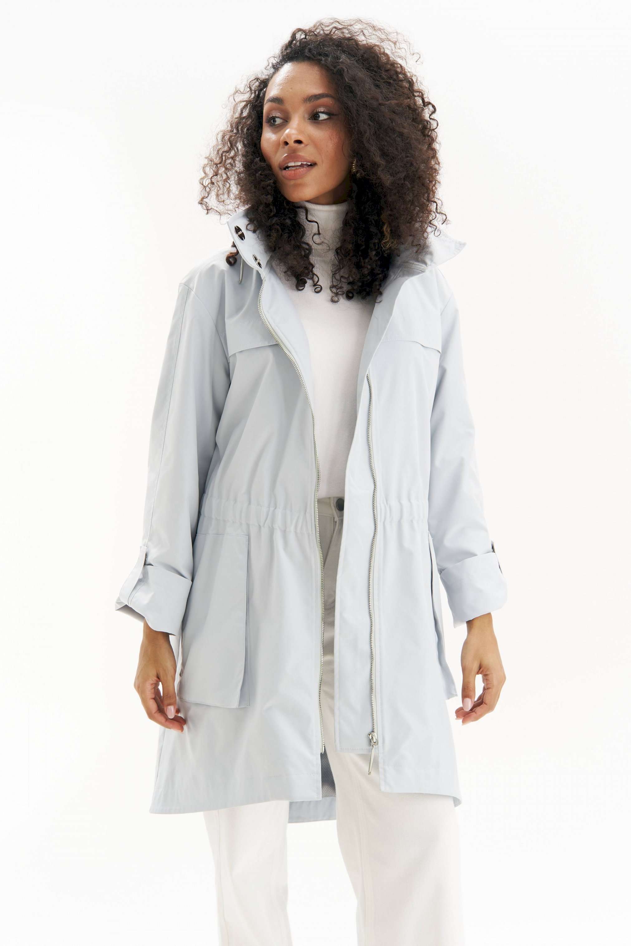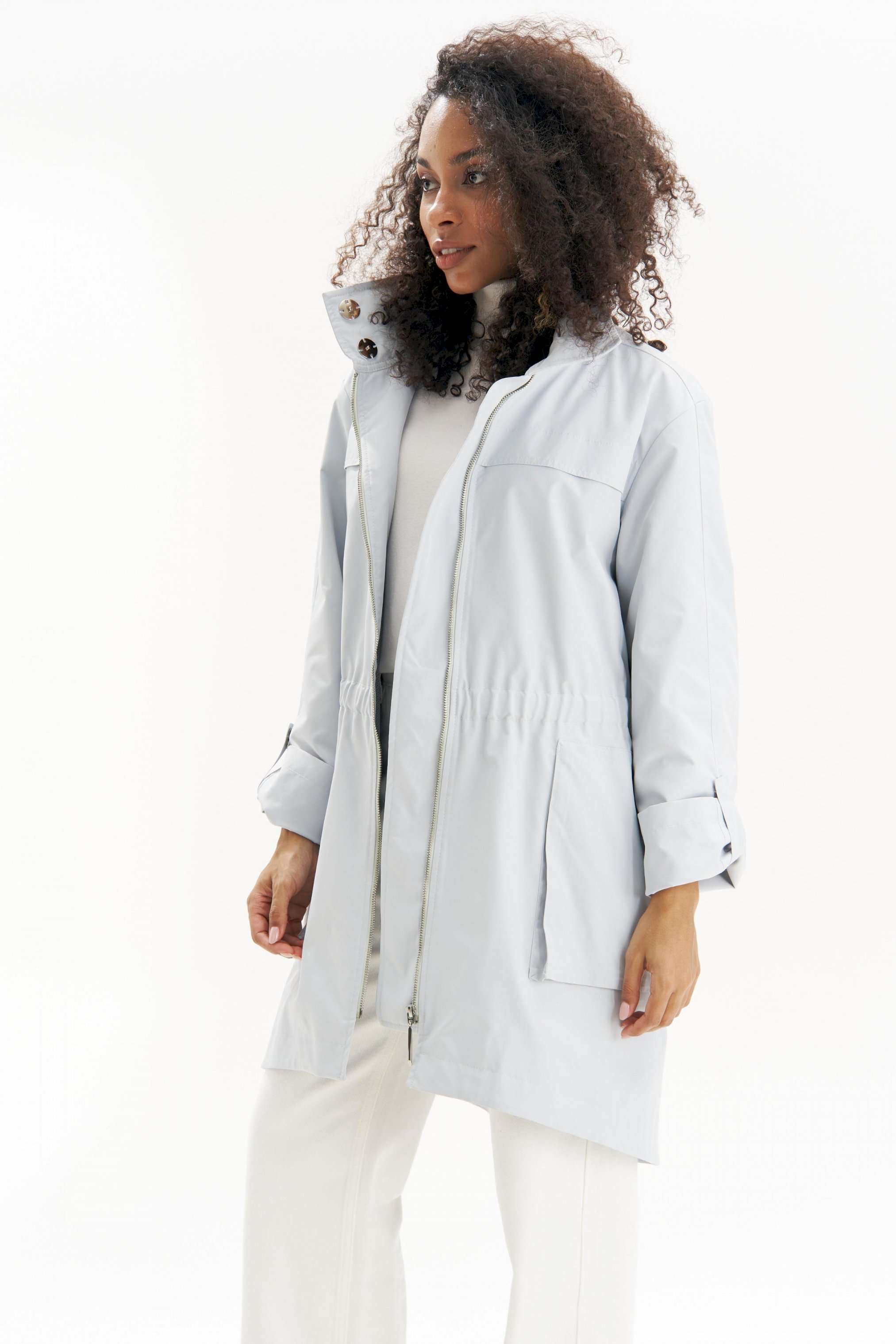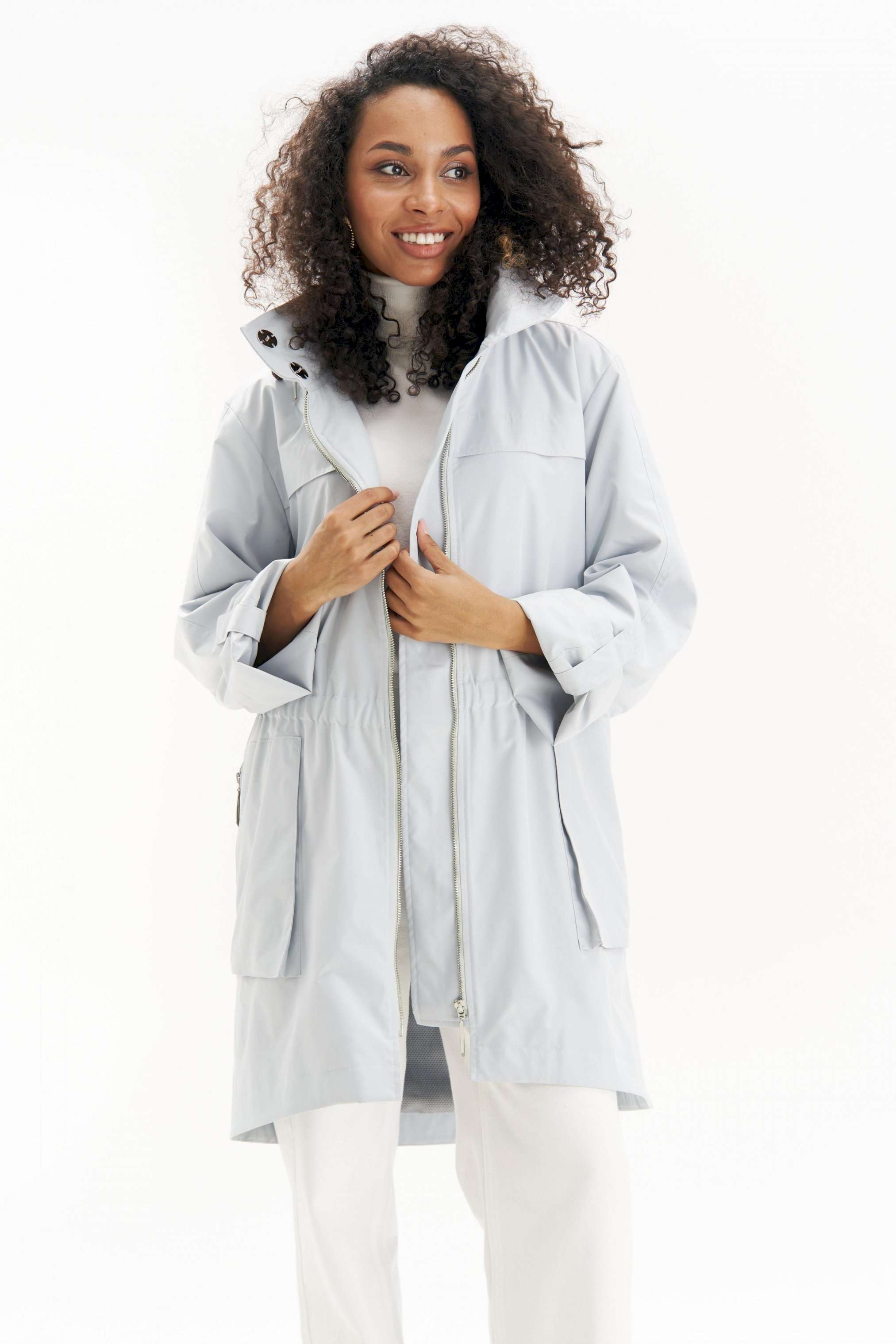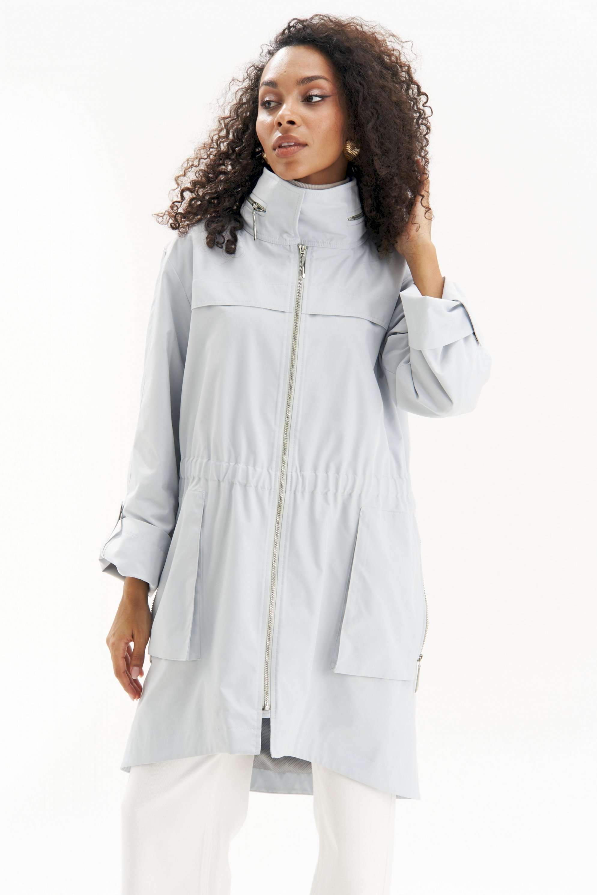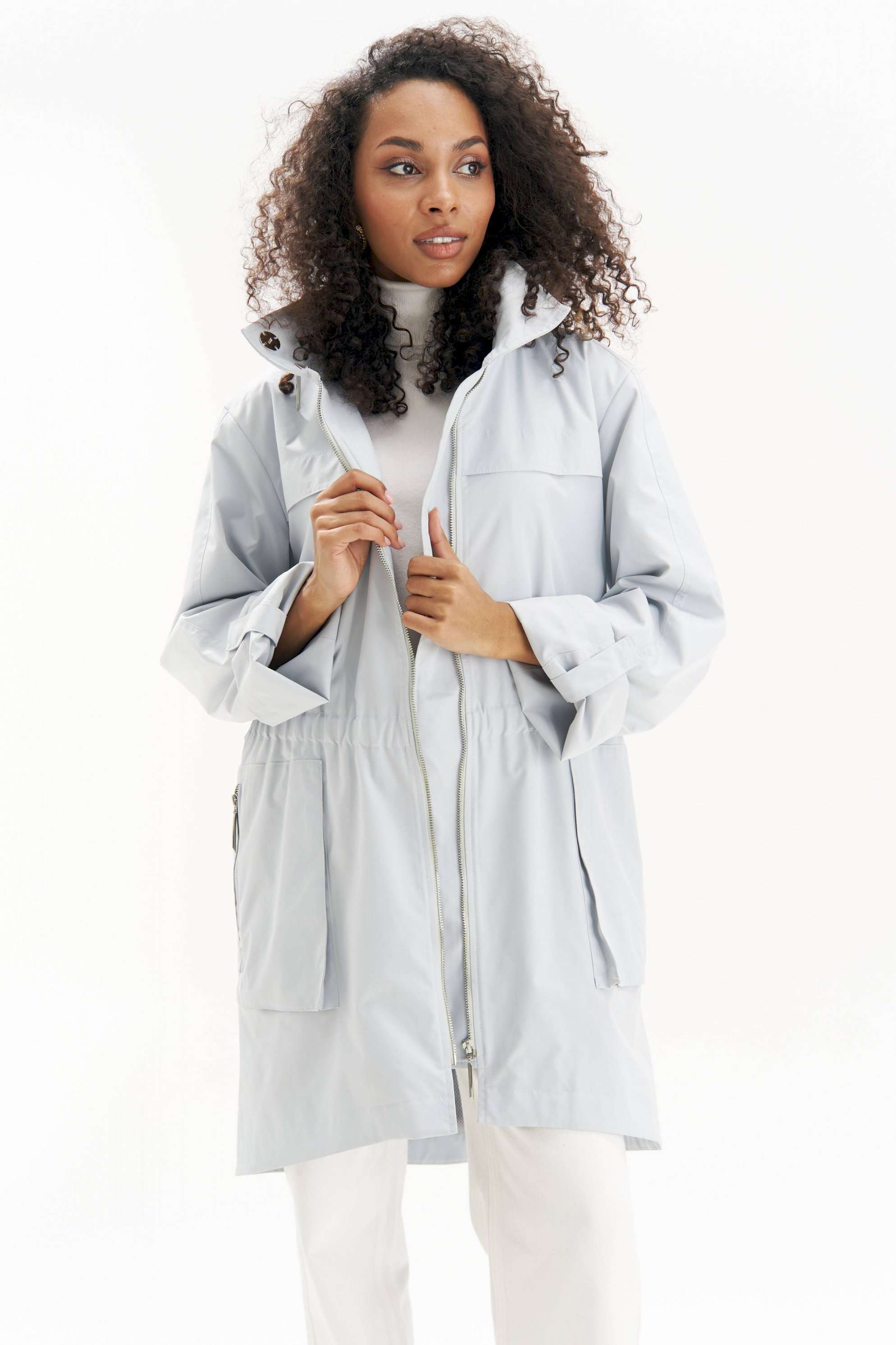 Легкая, аккуратная и очень городская ветровка женская в серо-голубом оттенке URS - тот самый вариант на весна-осень, когда хочется выглядеть собранно и чувствовать себя комфортно. Эта куртка ветровка женская от URS помогает пережить переменчивую погоду без лишней суеты и без компромиссов по стилю. Куртка женская ЮРС прямого силуэта, из плащевой ткани, на подкладке, с центральной бортовой застежкой на металлическую тесьму - «молнию» (размер и цвет фурнитуры может незначительно отличаться от фото), для повседневной носки. Перед с настрочной с изнанки кулисой с резинкой на уровне талии. На нижней части переда настрочены накладные объёмные карманы, застегивающиеся на металлическую тесьму - «молнию». На верхней части переда и спинки обработаны отлетные горизонтальные отлетные планки шириной 4,0 см. Левая часть переда с внутренней ветрозащитной планкой. Рукава втачные, двухшовные, длинные. Верхний шов рукава с пришивной кнопкой. Низ рукава может застёгиваться на хлястик с пришивной потайной кнопкой, тем самым укорачивается длина рукава до 7/8. Горловина обработана широким воротником стойкой, со смещённой относительно центра переда застёжкой на 2 потайные пришивные кнопки. Так же на верхнем воротнике обработан карман, застёгивающийся на металлическую тесьму - «молнию», в котором прячется капюшон. Низ куртки обтачной, перед незначительно короче спинки. По низу куртки прострочена отделочная строчка шириной 3,5см. 46 размер Длина по середине спинки - 92,5 см (±2,0 см), Ширина на уровне глубины проймы - 57,0 см (±1,0 см), Ширина на уровне линии талии - 52,0 см (±1,0 см), Ширина на уровне линии бедер - 61,0 см (±1,0 см), Длина рукава - 58,5 см (±1,0 см), Ширина рукава вверху - 19,5 см (±1,0 см), Ширина рукава внизу - 18,5 см (±0,5 см), Длина плеча - 12,7 см (±0,5 см). 48 размер Длина по середине спинки - 92,5 см (±2,0 см), Ширина на уровне глубины проймы - 59,0 см (±1,0 см), Ширина на уровне линии талии - 54,0 см (±1,0 см), Ширина на уровне линии бедер - 63,0 см (±1,0 см), Длина рукава - 58,5 см (±1,0 см), Ширина рукава вверху - 20,5 см (±1,0 см), Ширина рукава внизу - 19,0 см (±0,5 см), Длина плеча - 12,7 см (±0,5 см). 50 размер Длина по середине спинки - 92,5 см (±2,0 см), Ширина на уровне глубины проймы - 61,0 см (±1,0 см), Ширина на уровне линии талии - 56,0 см (±1,0 см), Ширина на уровне линии бедер - 65,0 см (±1,0 см), Длина рукава - 58,5 см (±1,0 см), Ширина рукава вверху - 21,5 см (±1,0 см), Ширина рукава внизу - 19,5 см (±0,5 см), Длина плеча - 12,7 см (±0,5 см). 52 размер Длина по середине спинки - 94,0 см (±2,0 см), Ширина на уровне глубины проймы - 63,0 см (±1,0 см), Ширина на уровне линии талии - 59,0 см (±1,0 см), Ширина на уровне линии бедер - 67,0 см (±1,0 см), Длина рукава - 59,5 см (±1,0 см), Ширина рукава вверху - 21,0 см (±1,0 см), Ширина рукава внизу - 19,0 см (±0,5 см), Длина плеча - 13,0 см (±0,5 см). 54 размер Длина по середине спинки - 94,0 см (±2,0 см), Ширина на уровне глубины проймы - 64,5 см (±1,0 см), Ширина на уровне линии талии - 61,0 см (±1,0 см), Ширина на уровне линии бедер - 69,0 см (±1,0 см), Длина рукава - 59,5 см (±1,0 см), Ширина рукава вверху - 22,0 см (±1,0 см), Ширина рукава внизу - 19,5 см (±0,5 см), Длина плеча - 13,0 см (±0,5 см). 56 размер Длина по середине спинки - 94,0 см (±2,0 см), Ширина на уровне глубины проймы - 66,0 см (±1,0 см), Ширина на уровне линии талии - 63,0 см (±1,0 см), Ширина на уровне линии бедер - 71,0 см (±1,0 см), Длина рукава - 59,5 см (±1,0 см), Ширина рукава вверху - 23,0 см (±1,0 см), Ширина рукава внизу - 20,0 см (±0,5 см), Длина плеча - 13,0 см (±0,5 см).