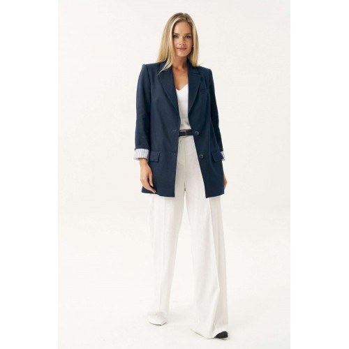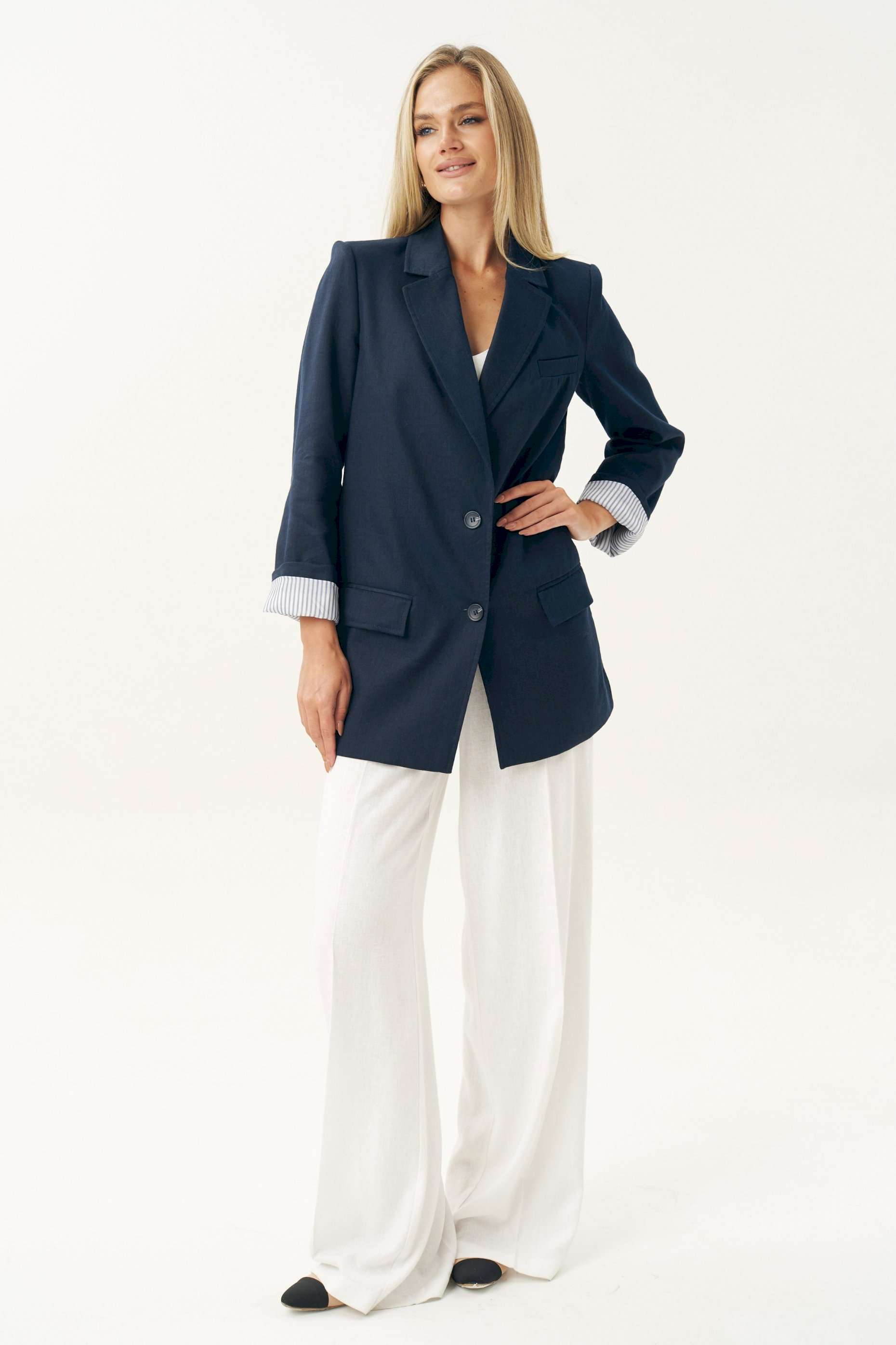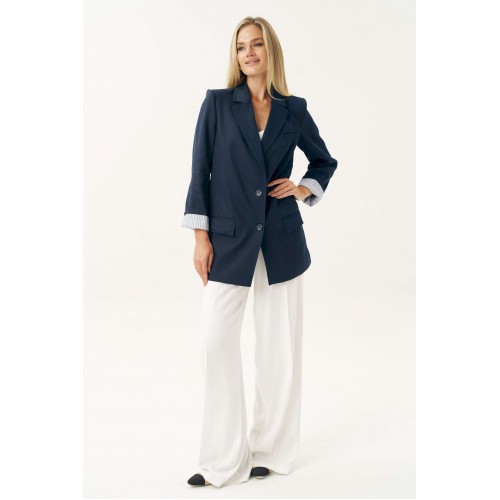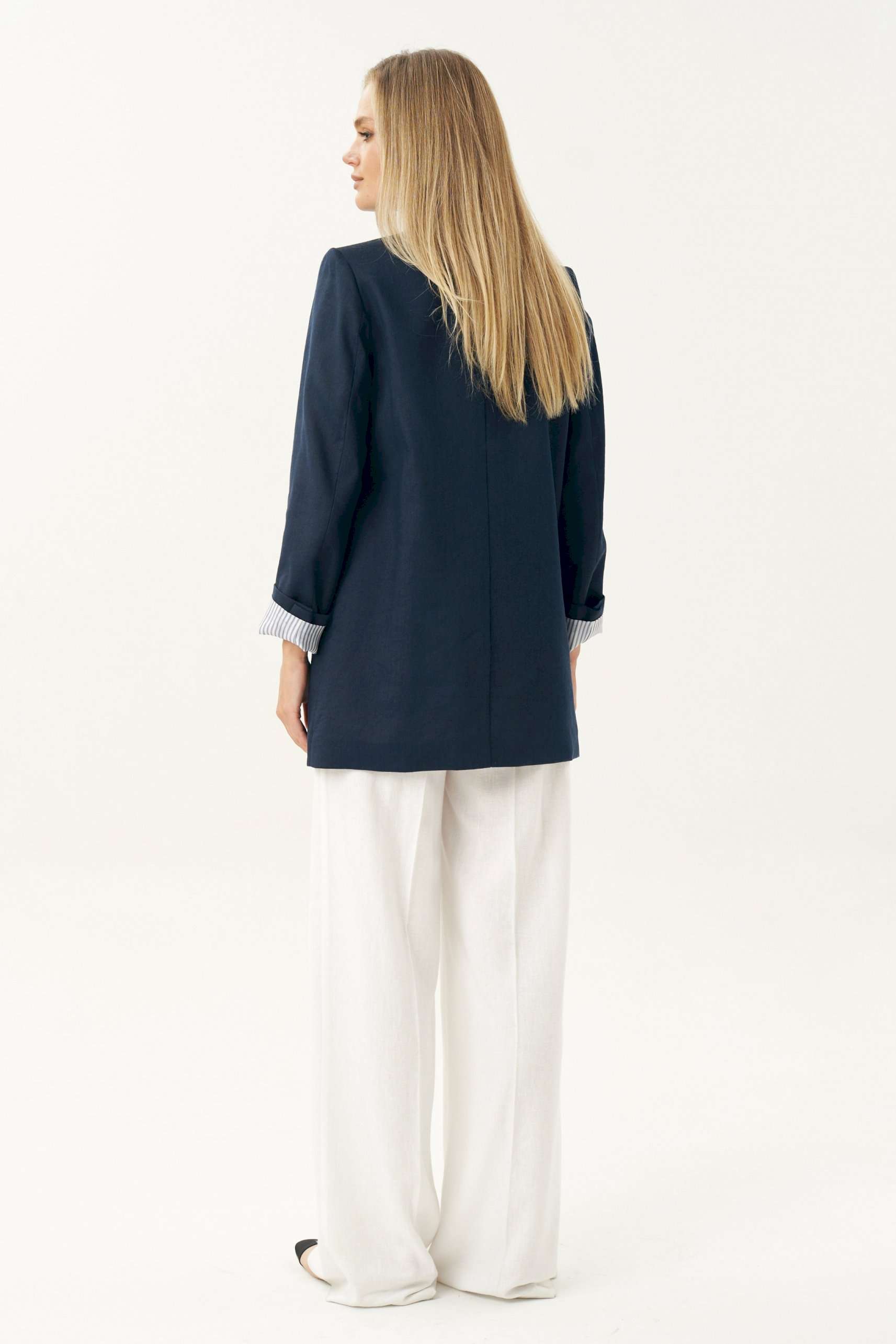 Женский льняной жакет синего цвета — это универсальный элемент гардероба, который легко вписывается в любой стиль: от классического до повседневного. Жакет женский, свободного силуэта, из костюмно-плательной льняной ткани, на подкладке, с центральной бортовой застежкой на 2 петли и пуговицы (размер и цвет фурнитуры может незначительно отличаться от фото), для повседневной носки. Перед в нижней части с прорезными карманами с клапанами и двумя обтачками, с вытачками, от горловины вниз. Левая верхняя часть переда с имитацией прорезного кармана с листочкой с втачными концами. Спинка со средним швом. Рукава втачные, двухшовные, длинные. В локтевом шве по низу с отлетной шлицей с 3-мя петлями и пуговицами. Нижняя часть подкладки рукава выполнена из контрастной по цвету в полоску подкладки, что дает возможность завернуть рукав наверх на манжету. Горловина оформлена воротником пиджачного типа. Жакет с плечевыми накладками. Средняя длина жакета по среднему шву спинки - 79,0 см (±2,0 см); Средняя длина рукава - 63,0 см (±1,5 см); Средняя длина рукава завернутого на манжету 55,0 см (±1,5 см); Жакет с плечевыми накладками. 46 размер Длина по среднему шву спинки - 80,0 см (±2,0 см), Ширина на уровне глубины проймы - 54,0 см (±1,0 см), Ширина на уровне линии талии - 58,0 см (±1,0 см), Ширина на уровне линии бедер - 65,0 см (±1,0 см), Длина рукава - 63,0 см (±1,0 см), Ширина рукава вверху - 18,0 см (±1,0 см), Ширина рукава по низу - 16,0 см (±0,5 см), Длина плеча - 13,5 см (±0,5 см). 48 размер Длина по среднему шву спинки - 80,0 см (±2,0 см), Ширина на уровне глубины проймы - 56,0 см (±1,0 см), Ширина на уровне линии талии - 60,0 см (±1,0 см), Ширина на уровне линии бедер - 67,0 см (±1,0 см), Длина рукава - 63,0 см (±1,0 см), Ширина рукава вверху - 19,0 см (±1,0 см), Ширина рукава по низу - 16,0 см (±0,5 см), Длина плеча - 13,5 см (±0,5 см). 50 размер Длина по среднему шву спинки - 80,0 см (±2,0 см), Ширина на уровне глубины проймы - 58,0 см (±1,0 см), Ширина на уровне линии талии - 62,0 см (±1,0 см), Ширина на уровне линии бедер - 69,0 см (±1,0 см), Длина рукава - 63,0 см (±1,0 см), Ширина рукава вверху - 20,0 см (±1,0 см), Ширина рукава по низу - 16,0 см (±0,5 см), Длина плеча - 13,5 см (±0,5 см). 52 размер Длина по среднему шву спинки - 82,0 см (±2,0 см), Ширина на уровне глубины проймы - 61,0 см (±1,0 см), Ширина на уровне линии талии - 65,5 см (±1,0 см), Ширина на уровне линии бедер - 70,5 см (±1,0 см), Длина рукава - 63,0 см (±1,0 см), Ширина рукава вверху - 20,5 см (±1,0 см), Ширина рукава по низу - 17,0 см (±0,5 см), Длина плеча - 13,7 см (±0,5 см). 54 размер Длина по среднему шву спинки - 82,0 см (±2,0 см), Ширина на уровне глубины проймы - 63,0 см (±1,0 см), Ширина на уровне линии талии - 66,5 см (±1,0 см), Ширина на уровне линии бедер - 72,5 см (±1,0 см), Длина рукава - 63,0 см (±1,0 см), Ширина рукава вверху - 21,5 см (±1,0 см), Ширина рукава по низу - 17,0 см (±0,5 см), Длина плеча - 13,7 см (±0,5 см). 56 размер Длина по среднему шву спинки - 82,0 см (±2,0 см), Ширина на уровне глубины проймы - 65,0 см (±1,0 см), Ширина на уровне линии талии - 67,5 см (±1,0 см), Ширина на уровне линии бедер - 74,5 см (±1,0 см), Длина рукава - 63,0 см (±1,0 см), Ширина рукава вверху - 22,5 см (±1,0 см), Ширина рукава по низу - 17,0 см (±0,5 см), Длина плеча - 13,7 см (±0,5 см).
