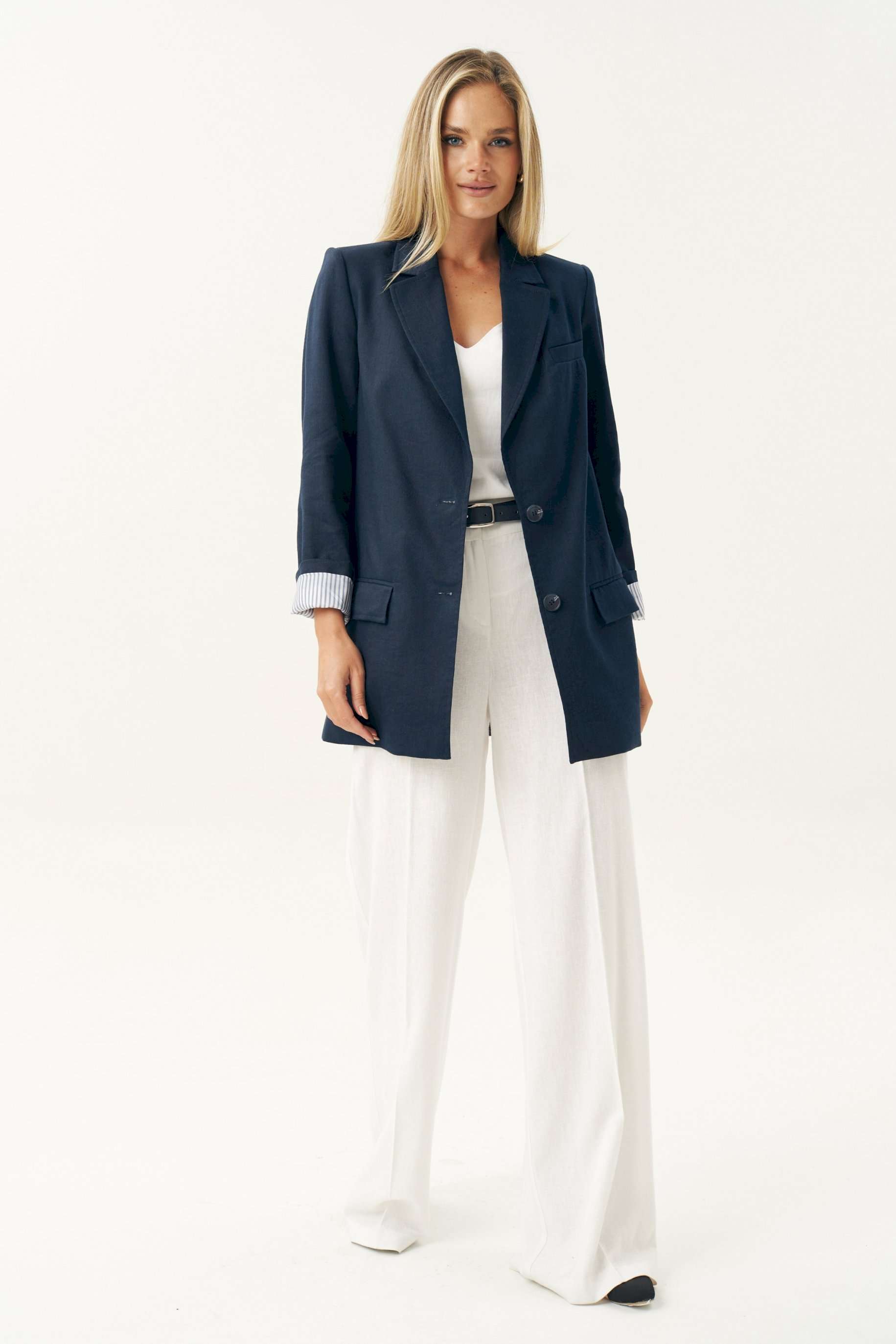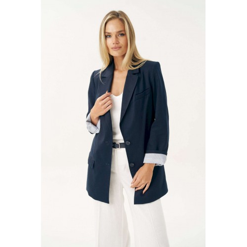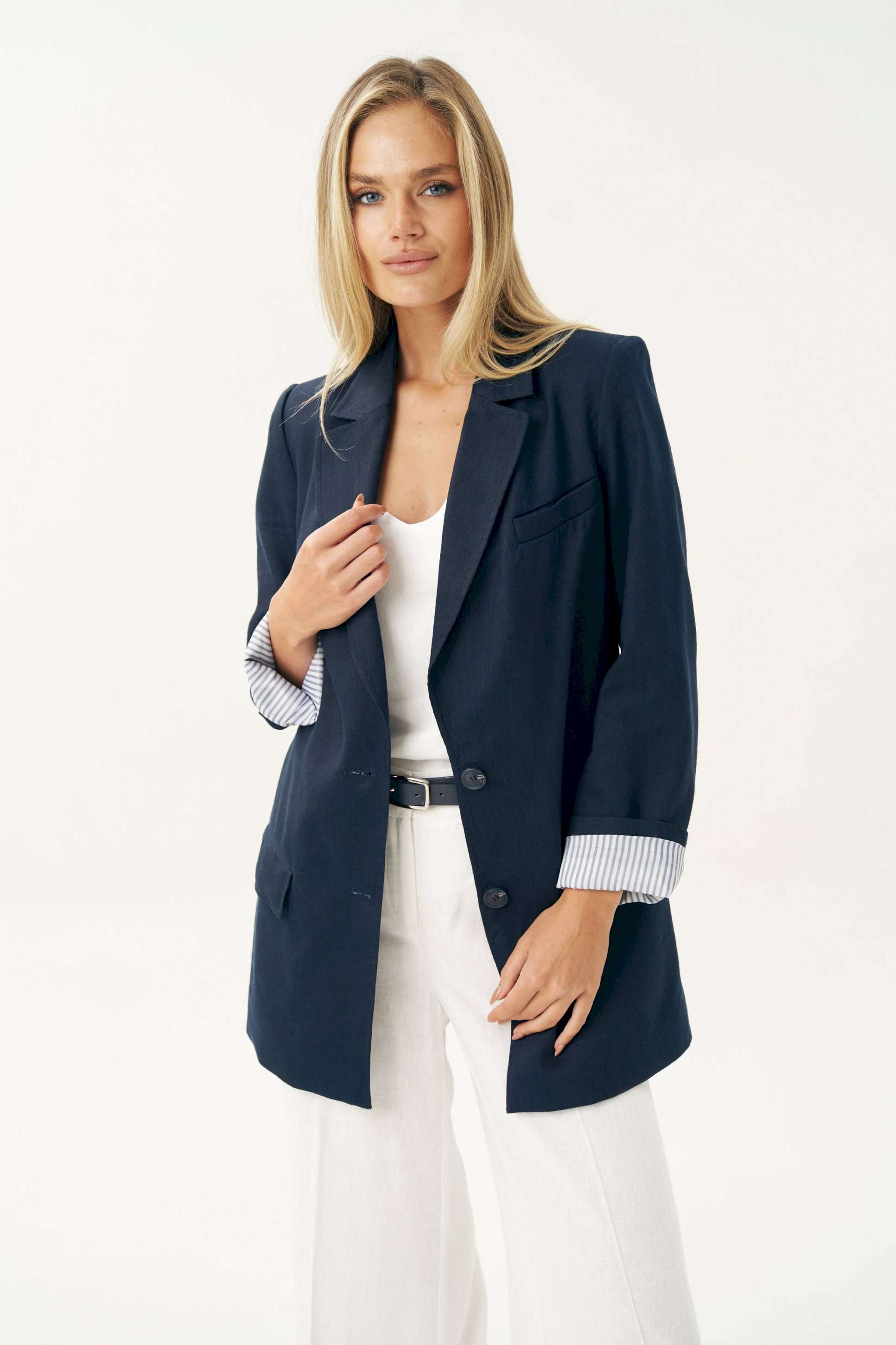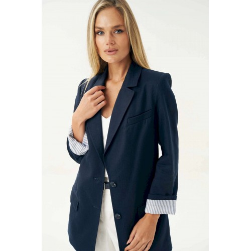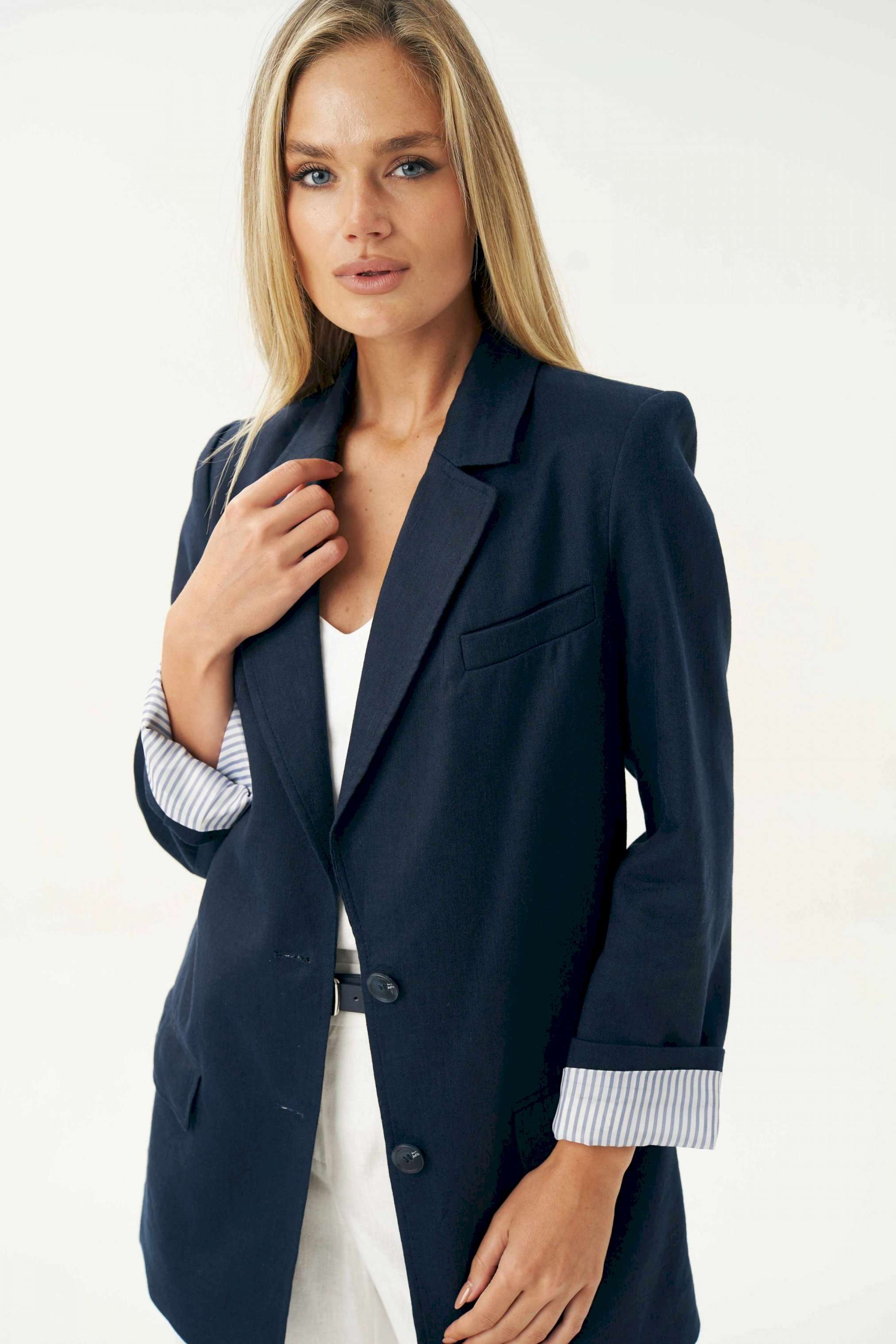 Женский льняной жакет синего цвета — это универсальный элемент гардероба, который легко вписывается в любой стиль: от классического до повседневного. Жакет женский, свободного силуэта, из костюмно-плательной льняной ткани, на подкладке, с центральной бортовой застежкой на 2 петли и пуговицы (размер и цвет фурнитуры может незначительно отличаться от фото), для повседневной носки. Перед в нижней части с прорезными карманами с клапанами и двумя обтачками, с вытачками, от горловины вниз. Левая верхняя часть переда с имитацией прорезного кармана с листочкой с втачными концами. Спинка со средним швом. Рукава втачные, двухшовные, длинные. В локтевом шве по низу с отлетной шлицей с 3-мя петлями и пуговицами. Нижняя часть подкладки рукава выполнена из контрастной по цвету в полоску подкладки, что дает возможность завернуть рукав наверх на манжету. Горловина оформлена воротником пиджачного типа. Жакет с плечевыми накладками. Средняя длина жакета по среднему шву спинки - 79,0 см (±2,0 см); Средняя длина рукава - 63,0 см (±1,5 см); Средняя длина рукава завернутого на манжету 55,0 см (±1,5 см); Жакет с плечевыми накладками. 46 размер Длина по среднему шву спинки - 80,0 см (±2,0 см), Ширина на уровне глубины проймы - 54,0 см (±1,0 см), Ширина на уровне линии талии - 58,0 см (±1,0 см), Ширина на уровне линии бедер - 65,0 см (±1,0 см), Длина рукава - 63,0 см (±1,0 см), Ширина рукава вверху - 18,0 см (±1,0 см), Ширина рукава по низу - 16,0 см (±0,5 см), Длина плеча - 13,5 см (±0,5 см). 48 размер Длина по среднему шву спинки - 80,0 см (±2,0 см), Ширина на уровне глубины проймы - 56,0 см (±1,0 см), Ширина на уровне линии талии - 60,0 см (±1,0 см), Ширина на уровне линии бедер - 67,0 см (±1,0 см), Длина рукава - 63,0 см (±1,0 см), Ширина рукава вверху - 19,0 см (±1,0 см), Ширина рукава по низу - 16,0 см (±0,5 см), Длина плеча - 13,5 см (±0,5 см). 50 размер Длина по среднему шву спинки - 80,0 см (±2,0 см), Ширина на уровне глубины проймы - 58,0 см (±1,0 см), Ширина на уровне линии талии - 62,0 см (±1,0 см), Ширина на уровне линии бедер - 69,0 см (±1,0 см), Длина рукава - 63,0 см (±1,0 см), Ширина рукава вверху - 20,0 см (±1,0 см), Ширина рукава по низу - 16,0 см (±0,5 см), Длина плеча - 13,5 см (±0,5 см). 52 размер Длина по среднему шву спинки - 82,0 см (±2,0 см), Ширина на уровне глубины проймы - 61,0 см (±1,0 см), Ширина на уровне линии талии - 65,5 см (±1,0 см), Ширина на уровне линии бедер - 70,5 см (±1,0 см), Длина рукава - 63,0 см (±1,0 см), Ширина рукава вверху - 20,5 см (±1,0 см), Ширина рукава по низу - 17,0 см (±0,5 см), Длина плеча - 13,7 см (±0,5 см). 54 размер Длина по среднему шву спинки - 82,0 см (±2,0 см), Ширина на уровне глубины проймы - 63,0 см (±1,0 см), Ширина на уровне линии талии - 66,5 см (±1,0 см), Ширина на уровне линии бедер - 72,5 см (±1,0 см), Длина рукава - 63,0 см (±1,0 см), Ширина рукава вверху - 21,5 см (±1,0 см), Ширина рукава по низу - 17,0 см (±0,5 см), Длина плеча - 13,7 см (±0,5 см). 56 размер Длина по среднему шву спинки - 82,0 см (±2,0 см), Ширина на уровне глубины проймы - 65,0 см (±1,0 см), Ширина на уровне линии талии - 67,5 см (±1,0 см), Ширина на уровне линии бедер - 74,5 см (±1,0 см), Длина рукава - 63,0 см (±1,0 см), Ширина рукава вверху - 22,5 см (±1,0 см), Ширина рукава по низу - 17,0 см (±0,5 см), Длина плеча - 13,7 см (±0,5 см).