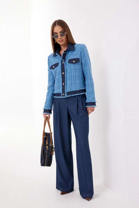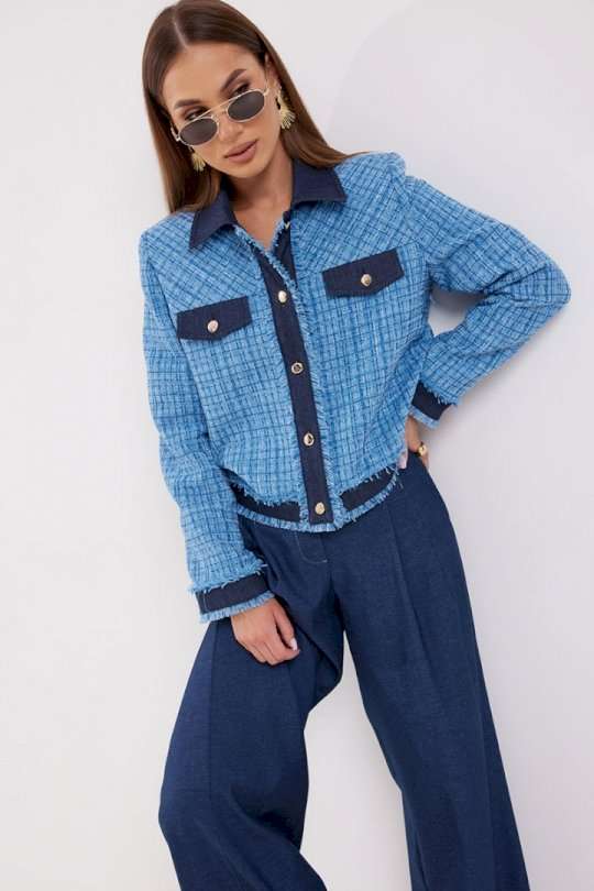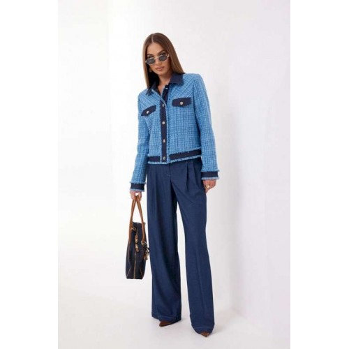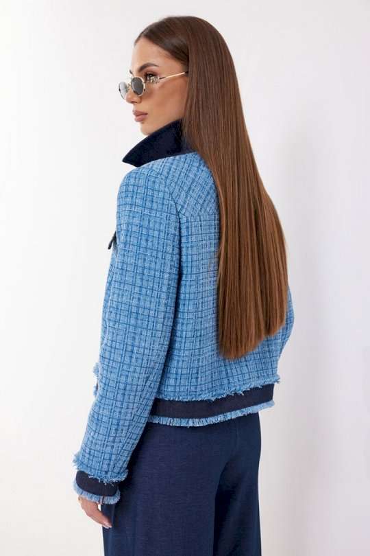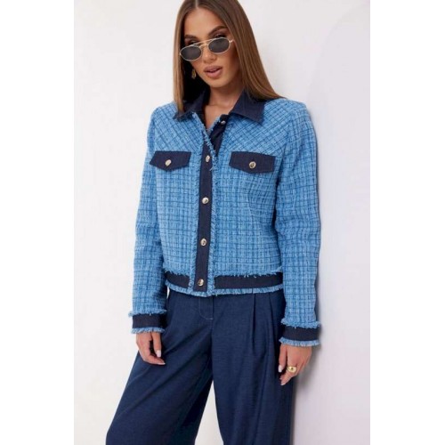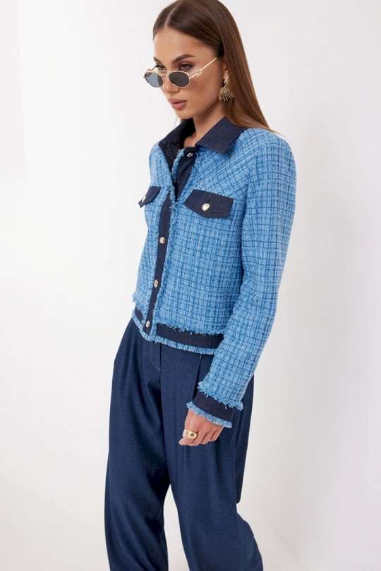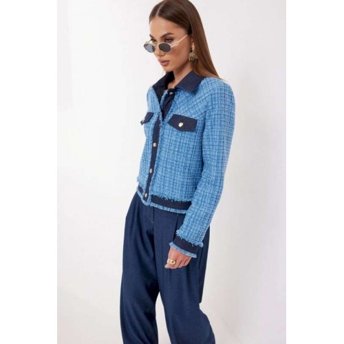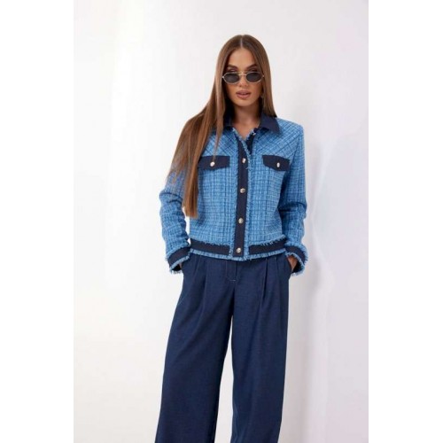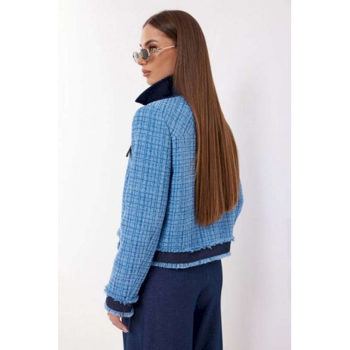 Жакет женский в стиле «шанель» прямого силуэта, длиной выше линии бедер, на подкладке, застежка центральная на планку с петлями и пуговицами. По спинке и переду кокетки, выкроенные по косой, в швах кокеток клапаны из отделочной ткани. Воротник стояче-отложной. Рукав втачной двухшовный с притачными манжетами из отделочной ткани. Воротник, планки, клапаны, манжеты и планка по низу жакета - из отделочной ткани. По швам притачивания планок и манжет декоративная бахрома из основной ткани.