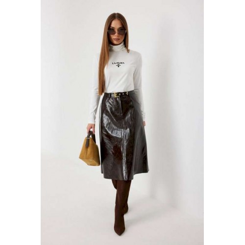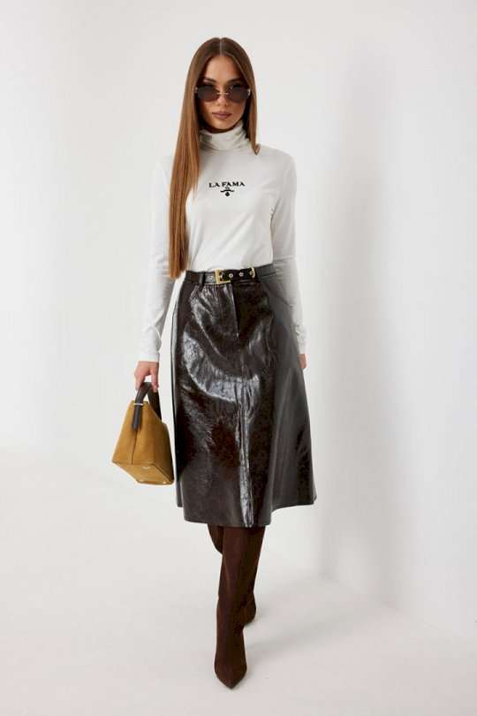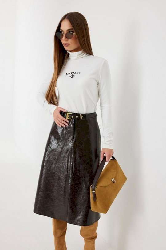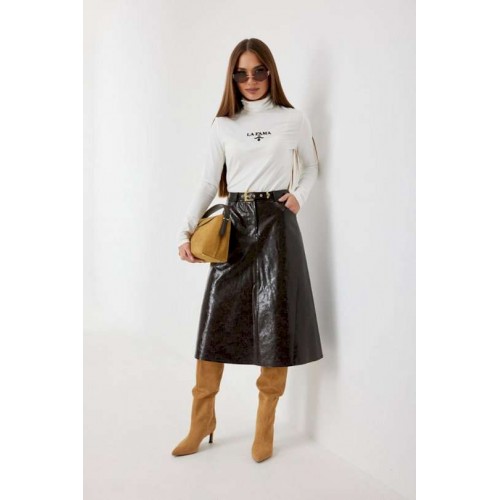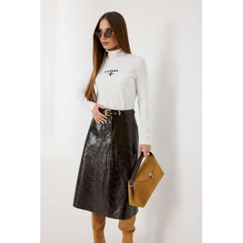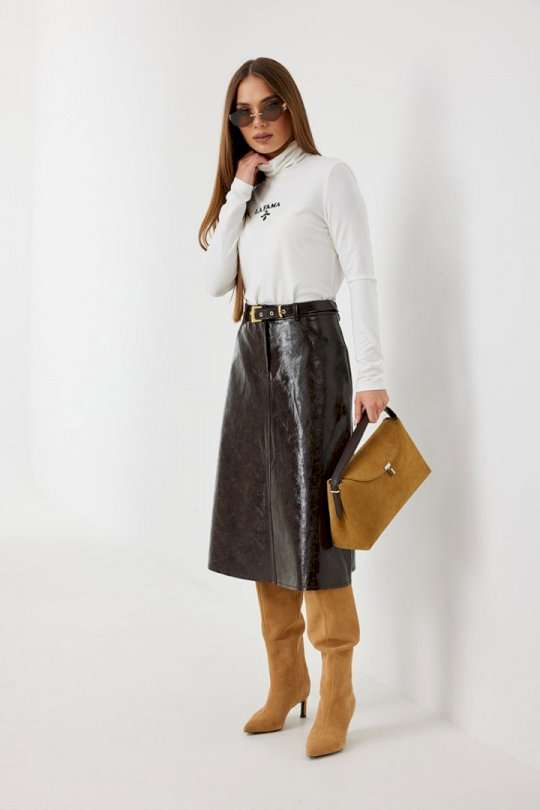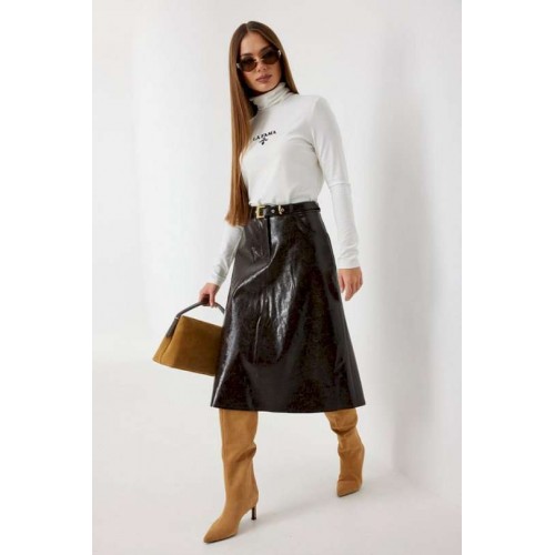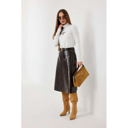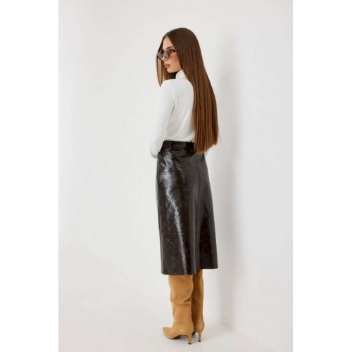Юбка женская из трендовой фактурной экокожи на подкладке, длиной чуть ниже колена, пояс притачной, спереди застежка на молнию и кнопку и боковые карманы, в комплекте ремень из оригинальной ткани с декоративной пряжкой. Вертикальные швы, карманы и низ юбки обработаны «открытым» швом.