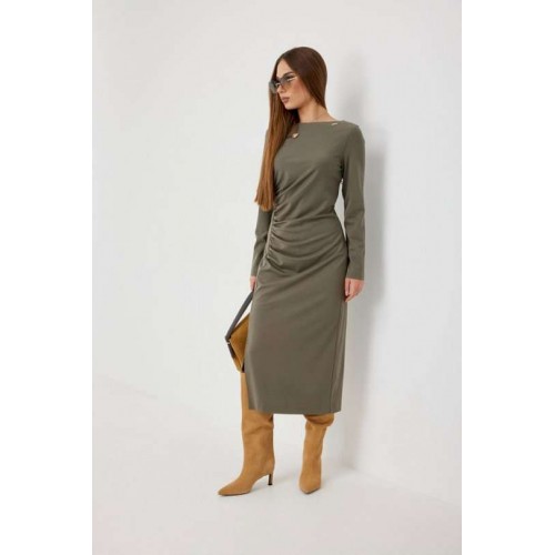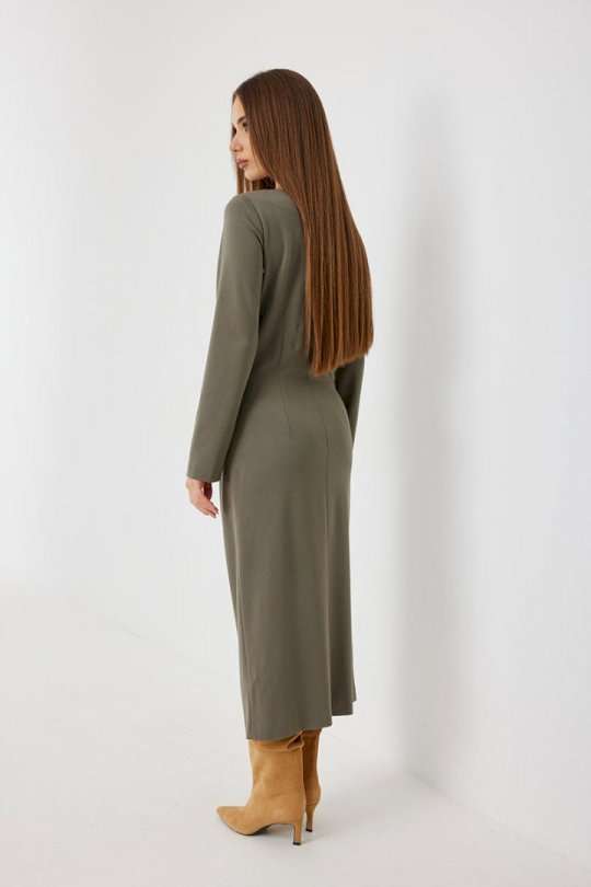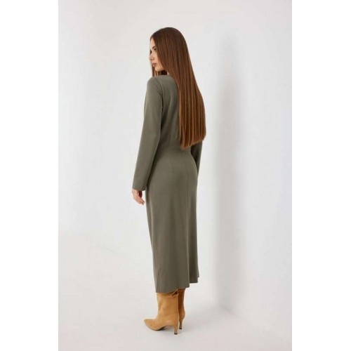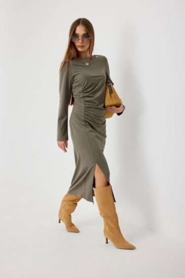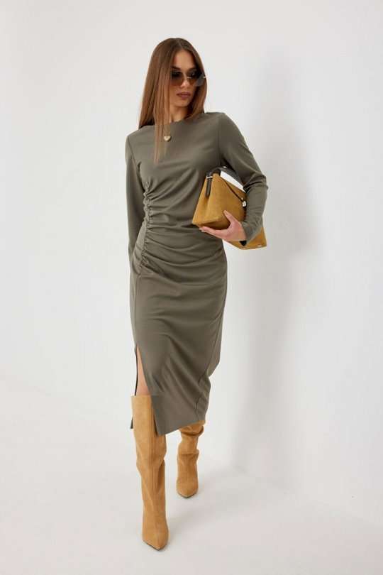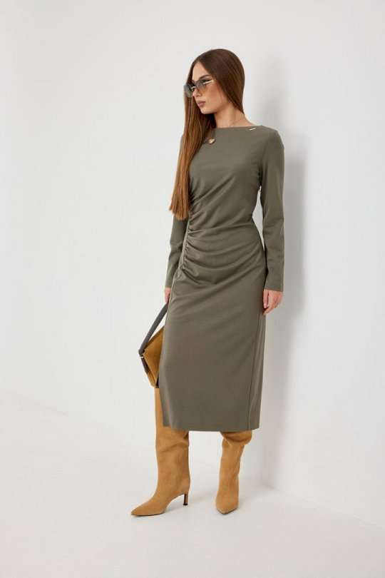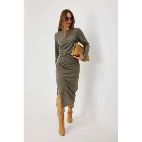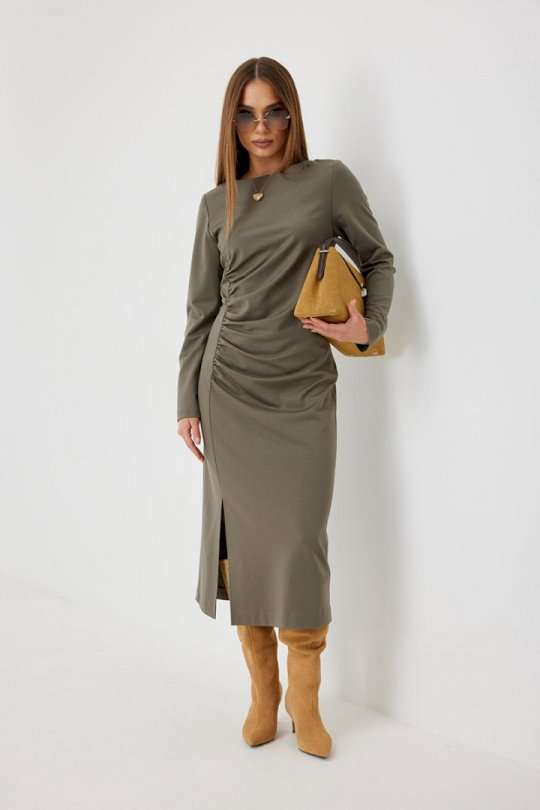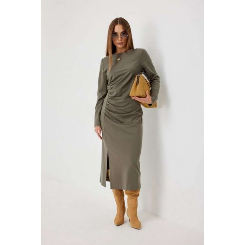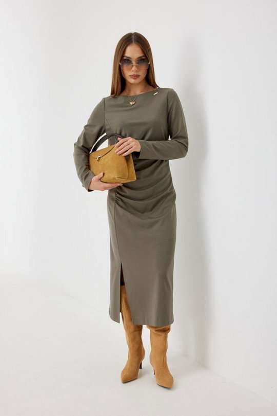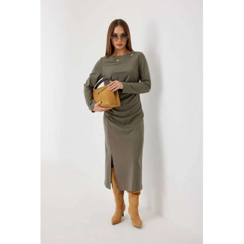Платье женское из приятной трикотажной ткани на подкладке. Рукав длинный, одношовный. По спинке средний шов и талевые вытачки, что создает приталенный силуэт. Драпировка и сборка на животе корректирует фигуру подчеркивая женственность. Разрез по ноге добавляет игривости, делая образ более динамичным. Длина рукава 62 см. 44 р-р: ОГ - 94 см., ОТ - 80 см., ОБ - 98 см. 46 р-р: ОГ - 98 см., ОТ - 84 см., ОБ - 102 см. 48 р-р: ОГ - 102 см., ОТ - 88 см., ОБ - 106 см. 50 р-р: ОГ - 106 см., ОТ - 92 см., ОБ - 110 см. 52 р-р: ОГ - 110 см., ОТ - 96 см., ОБ - 114 см.