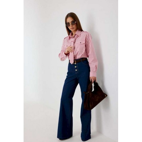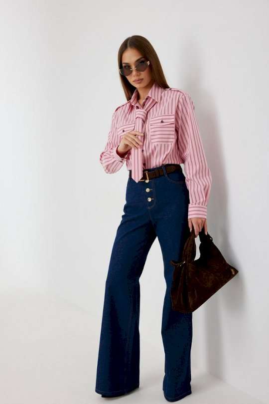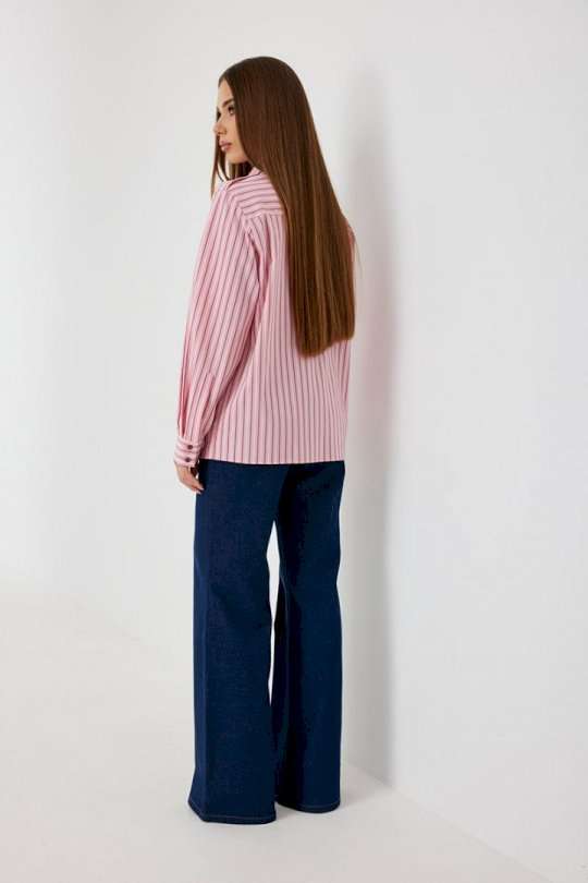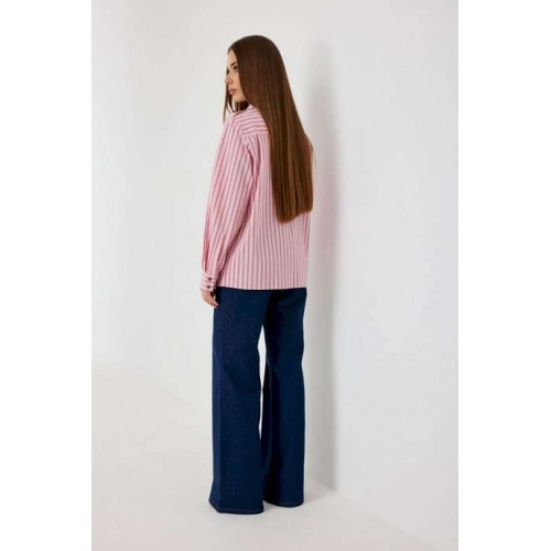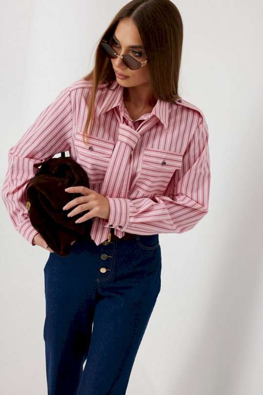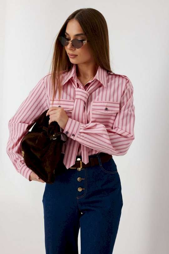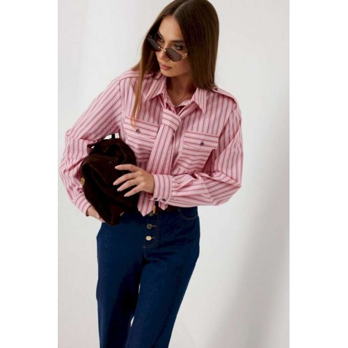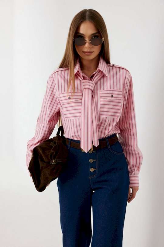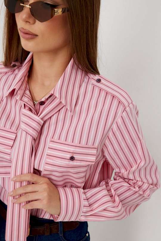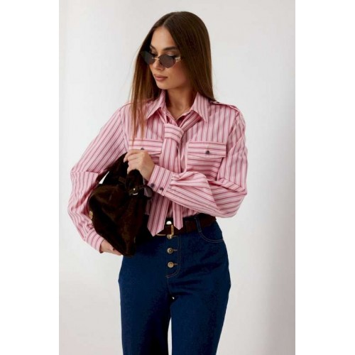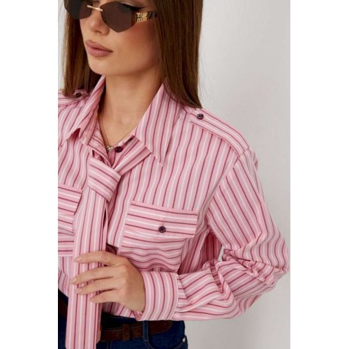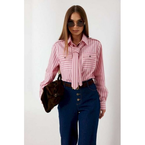 Блузка женская свободного силуэта, из рубашечной ткани в полоску. Спинка с кокеткой. Застежка на петли и пуговицы, по переду накладные карманы с клапанами, по плечевым швам погоны, фиксирующиеся пуговицей, рукав свободный, по низу манжета с пуговицами. В комплекте с блузкой декоративная деталь, завязывающаяся в виде галстука. Воротник рубашечный со стойкой. Длина рукава с манжетой 62 см. 44 р-р: ОГ - 106 см., ОТ - 106 см., ОБ - 108 см. 46 р-р: ОГ - 110 см., ОТ - 110 см., ОБ - 112 см. 48 р-р: ОГ - 114 см., ОТ - 114 см., ОБ - 116 см. 50 р-р: ОГ - 118 см., ОТ - 118 см., ОБ - 118 см. 52 р-р: ОГ - 122 см., ОТ - 122 см., ОБ - 122 см.