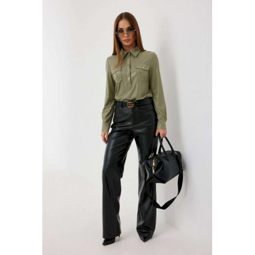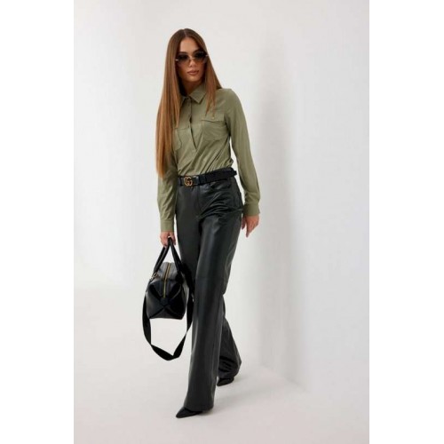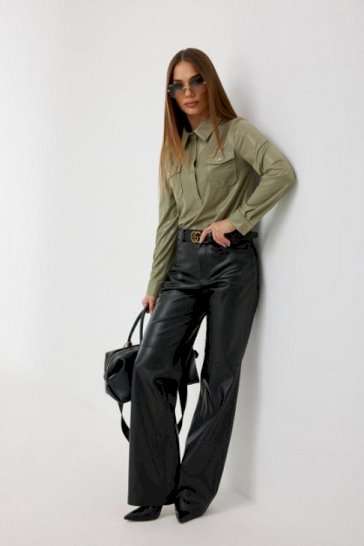 Брюки прямого силуэта из экокожи. Застёжка по переду на молнию и кнопку на поясе. Пояс притачной со шлёвками. По переду боковые карманы. Сзади накладные карманы. На брюках выполнен декоративный подрез. 44 р-р: ОТ - 76 см., ОБ - 96 см. 46 р-р: ОТ - 80 см., ОБ - 100 см. 48 р-р: ОТ - 84 см., ОБ - 104 см. 50 р-р: ОТ - 88 см., ОБ - 108 см. 52 р-р: ОТ - 92 см., ОБ - 112 см.