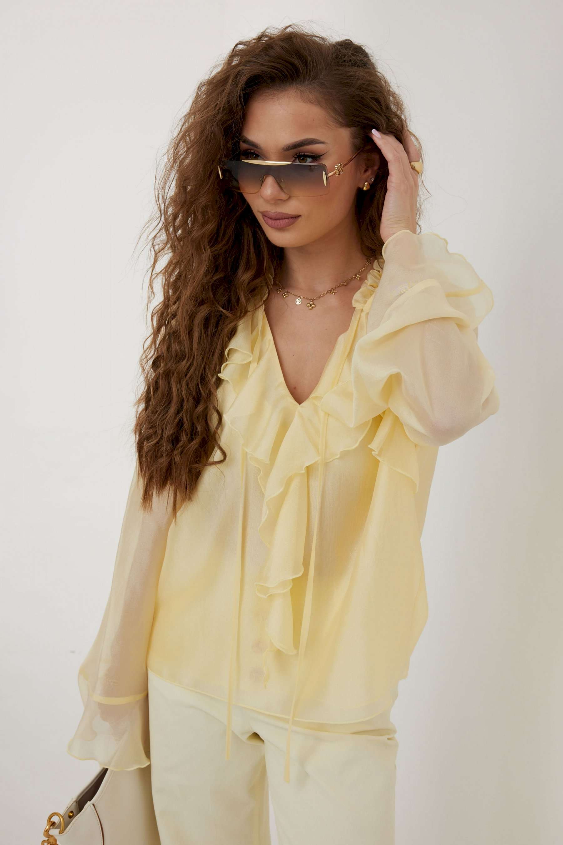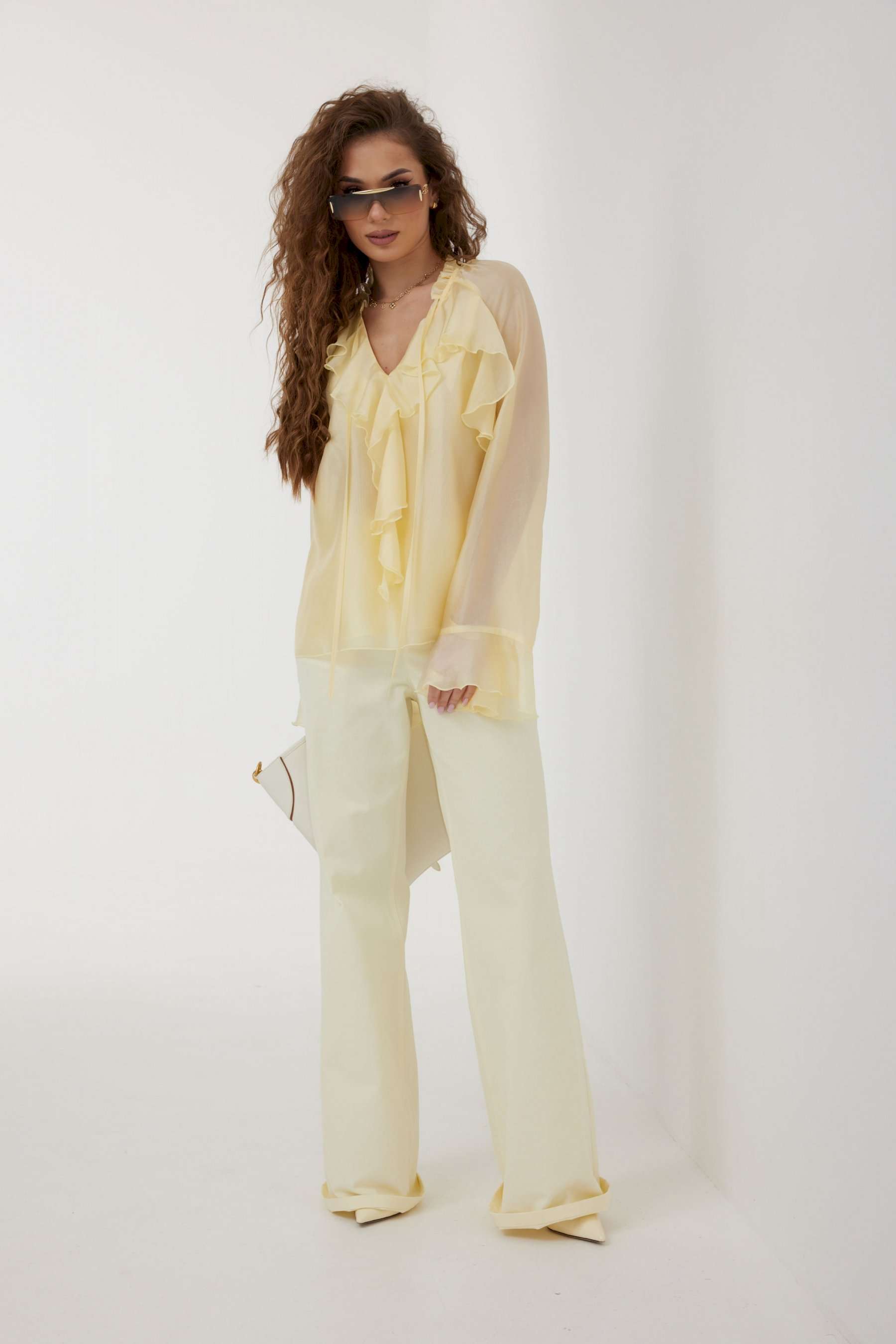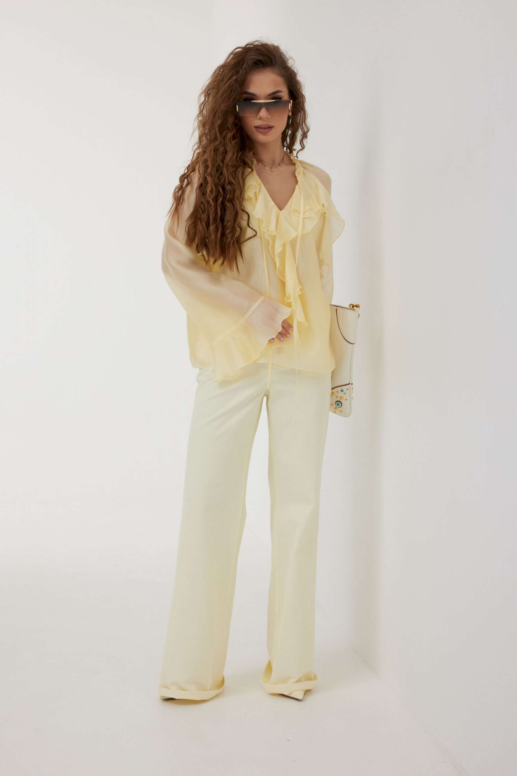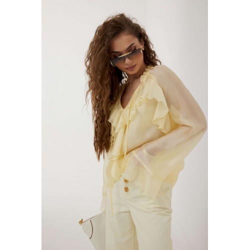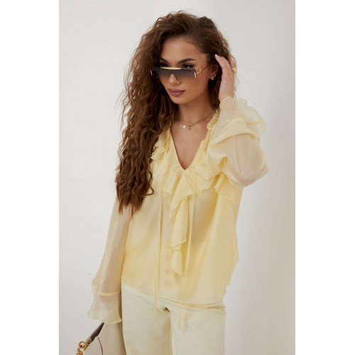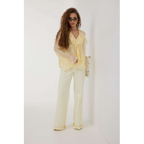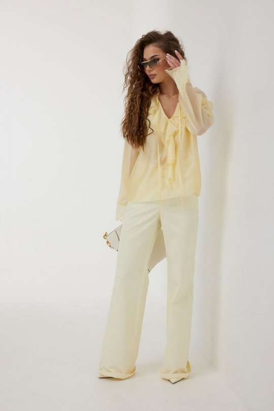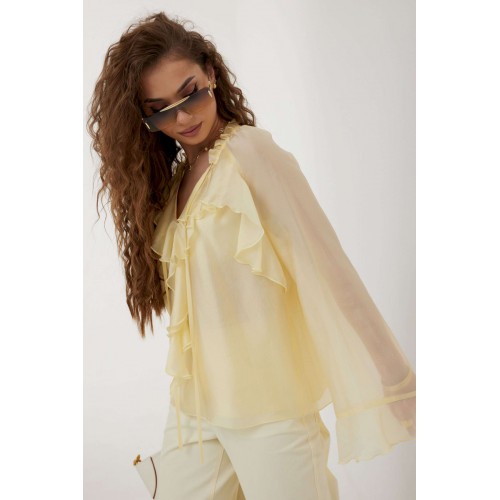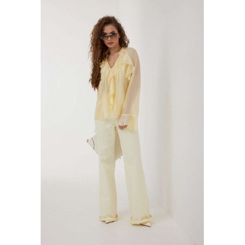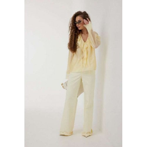 Блузка прямого силуэта из полупрозрачной ткани «органза». Рукав реглан расширенный, по низу волан. По переду горловина V-образной формы с рюшей и завязками. Перед с декоративным воланом. Перед и спинка двойные. Длина рукава 77 см 44 р-р: ОГ - 106 см., ОТ - 104 см., ОБ - 108 см. 46 р-р: ОГ - 110 см., ОТ - 108 см., ОБ - 112 см. 48 р-р: ОГ - 114 см., ОТ - 112 см., ОБ - 116 см. 50 р-р: ОГ - 118 см., ОТ - 116 см., ОБ - 120 см. 52 р-р: ОГ - 122 см., ОТ - 120 см., ОБ - 124 см.